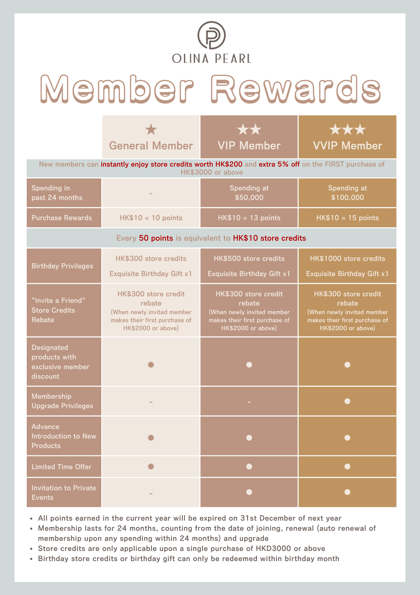 Terms and conditions for redemption of Olina Pearl's member points and store credits: