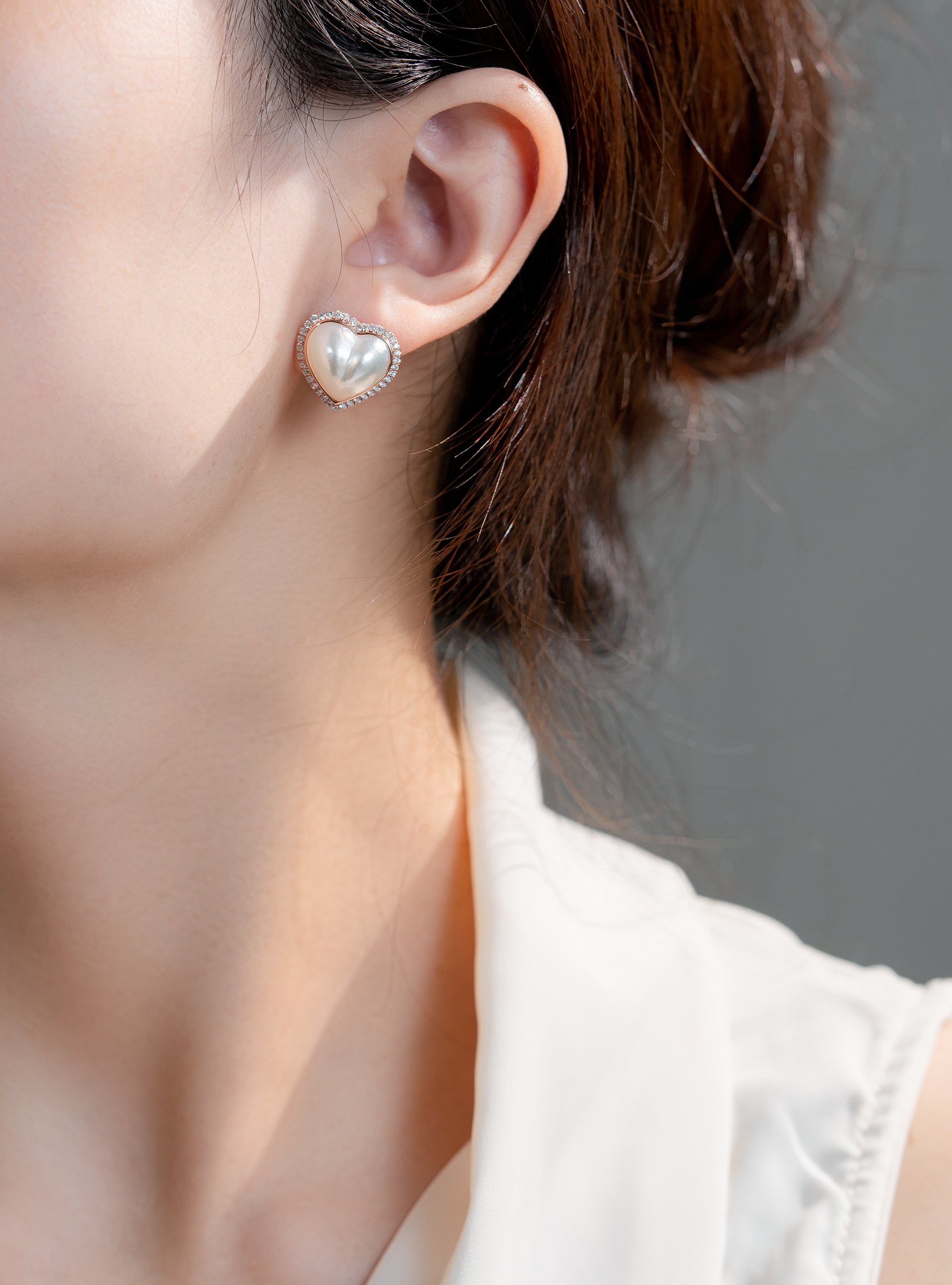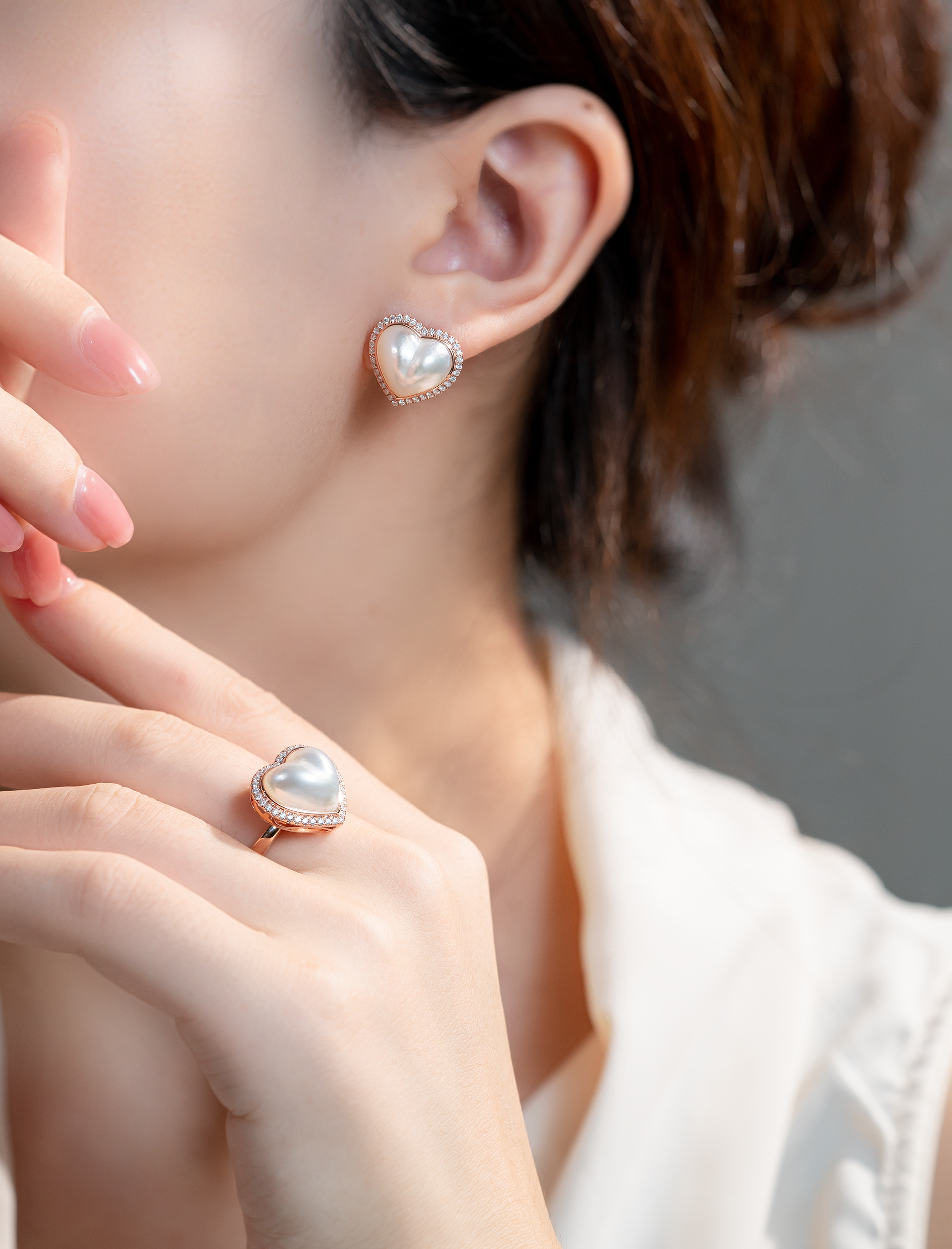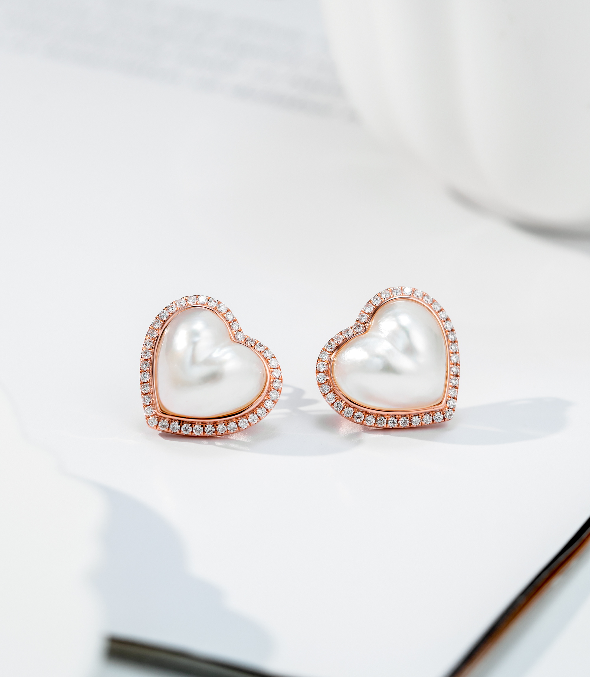 A white mabe pearl with top quality is radiant-looking with mesmerizing luster. Embraced with a halo of diamonds, the Mabe Pearl earrings become brighter and more alluring. Featuring two 11-12mm heart shaped Mabe pearls, 18K rose gold and diamonds, this pair of earrings is super charismatic.
