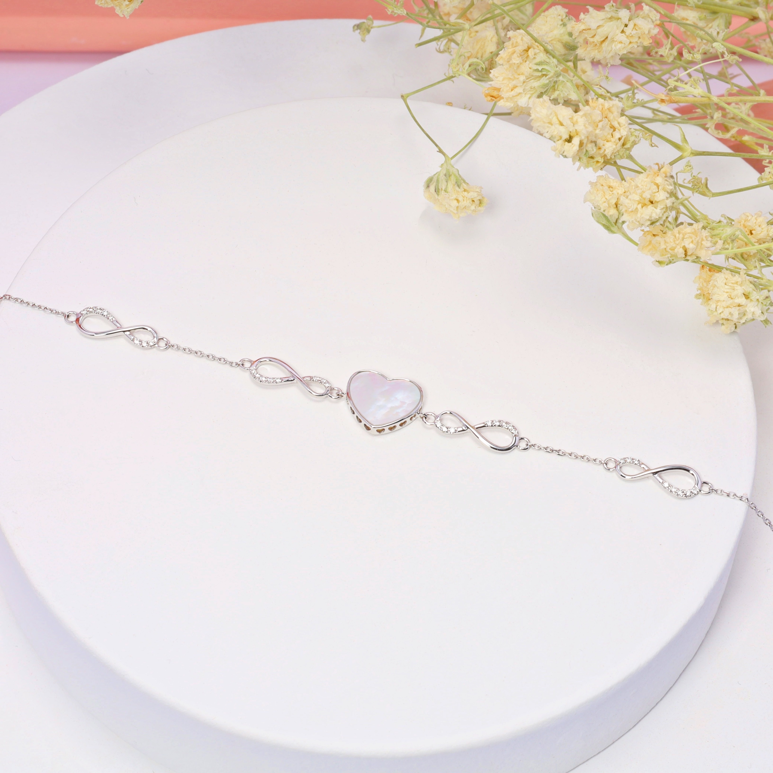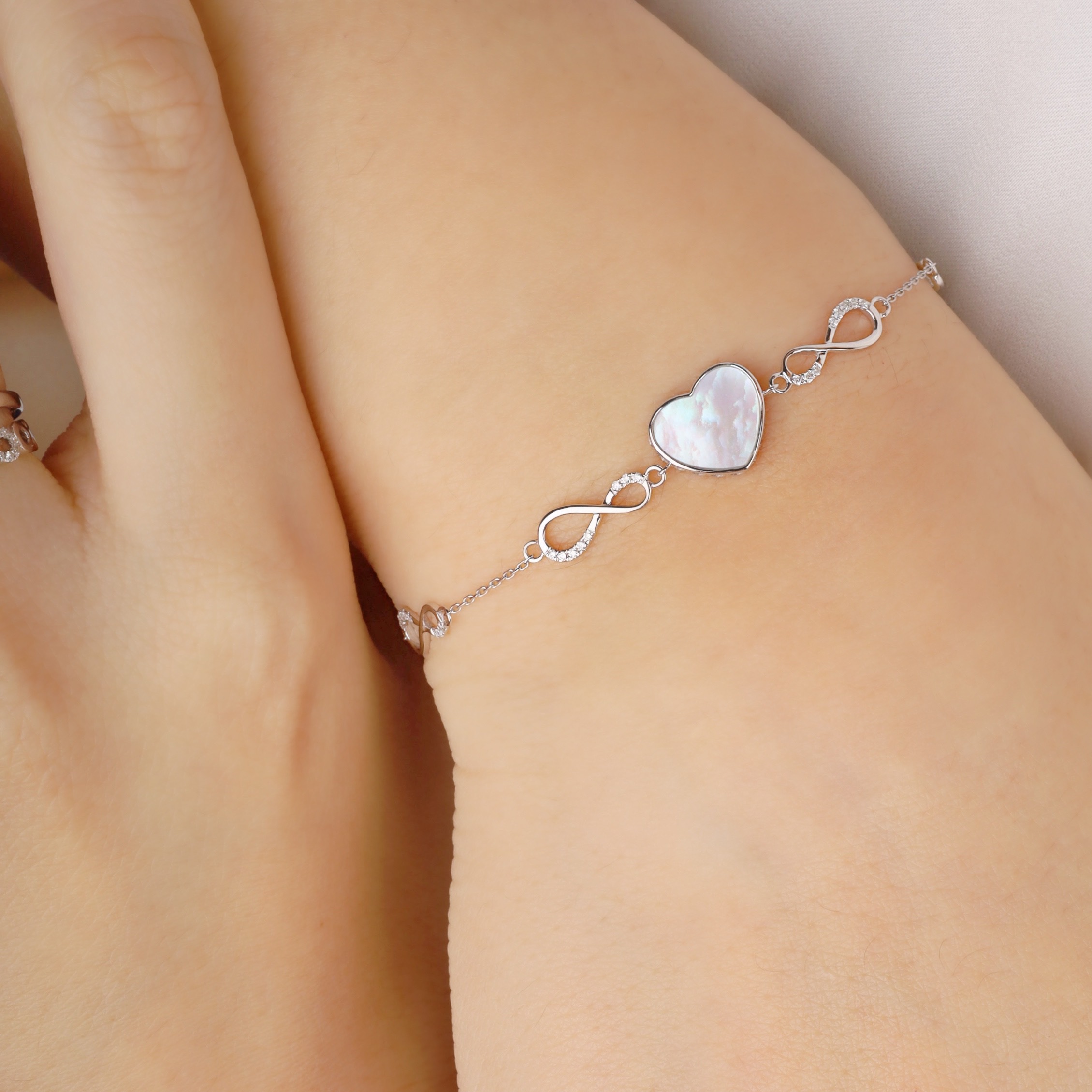 Combines heart shaped Mother of pearl with the timeless Infinity symbol, gently wrapping endless love and heartfelt wishes around your wrist. Crafted from 18K gold and accented with sparkling diamonds. It’s a warm token of love, making it a meaningful gift or a cherished keepsake for yourself.