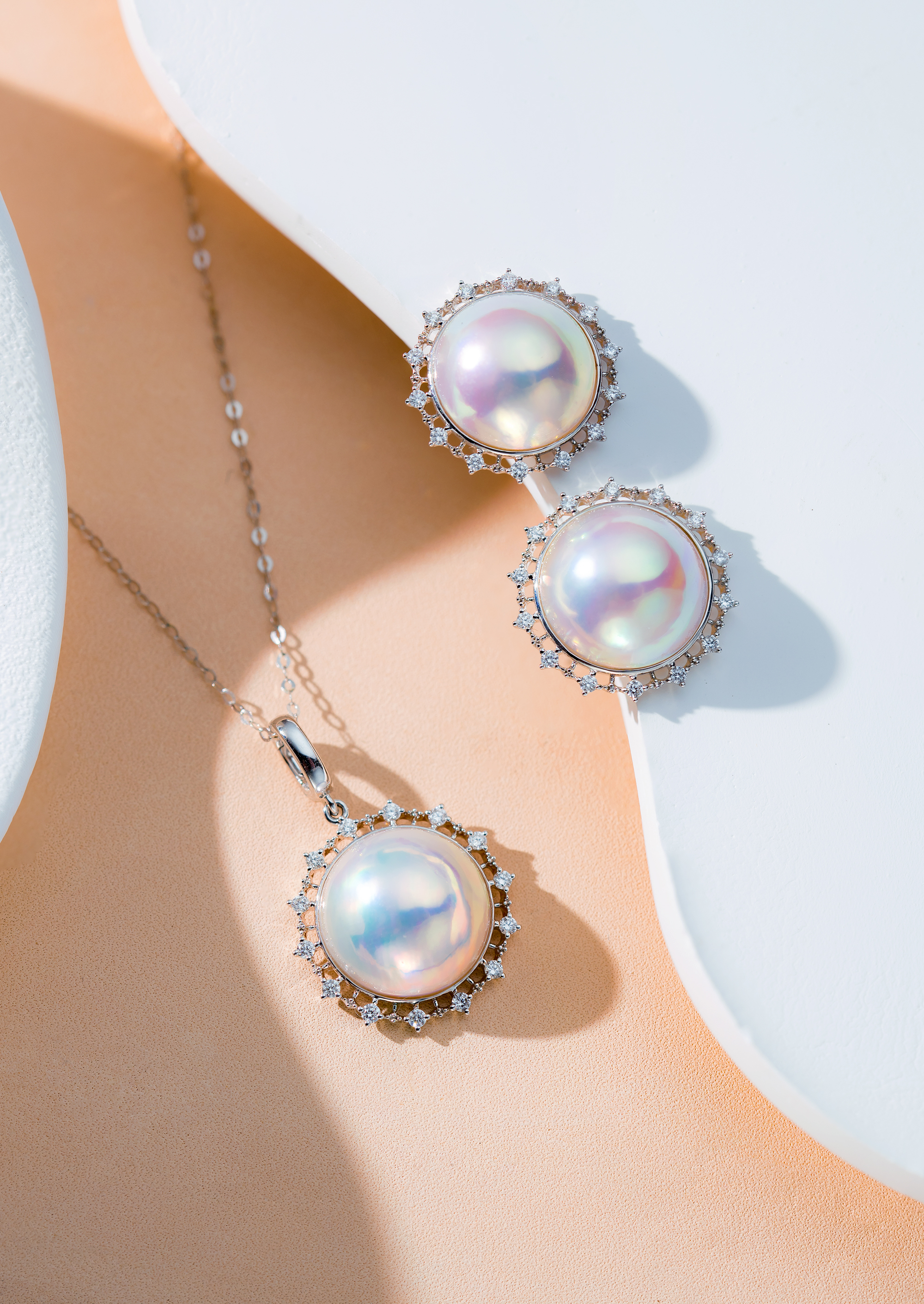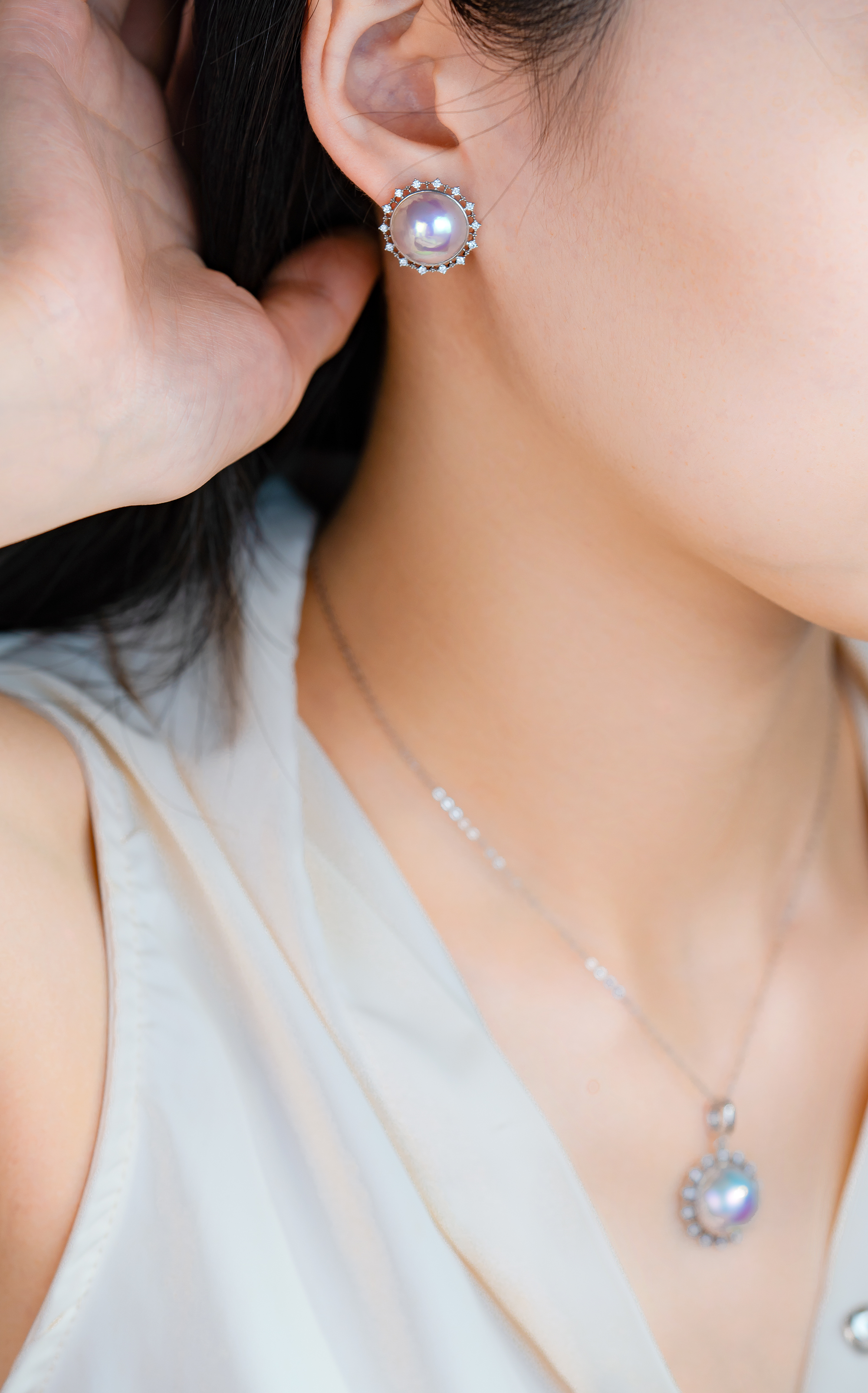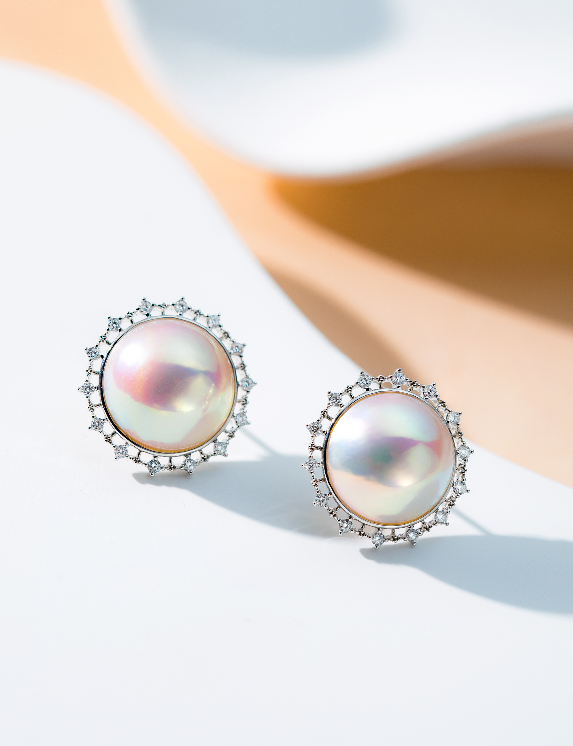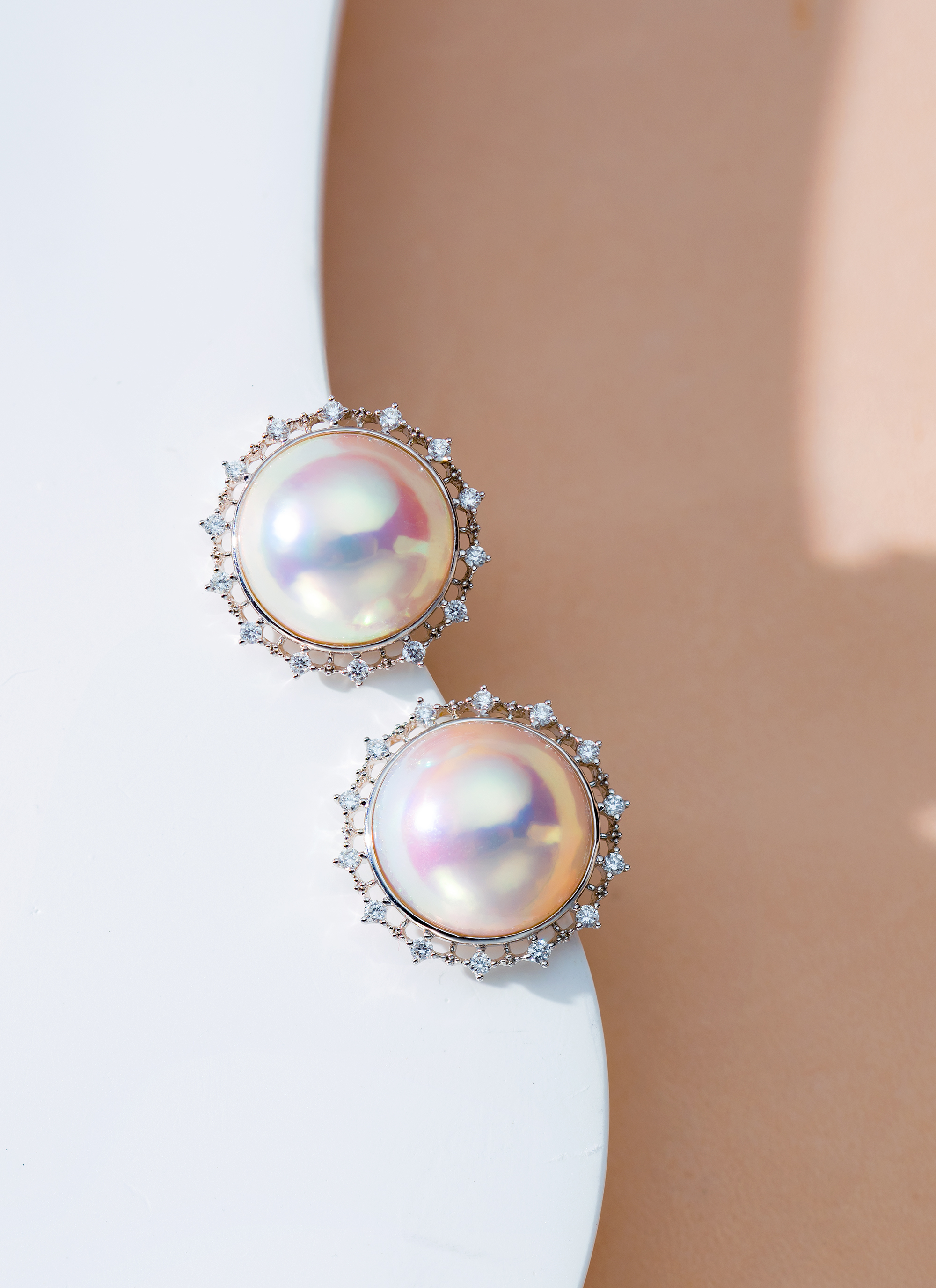 These earrings beautifully blend elegance with modern design. Mabe pearl at the centre, glowing like moonlight on the ocean. Surrounding the pearl are brilliant diamonds that sparkle like stars, creating an enchanting aura. Perfect for both everyday wear and special occasions.