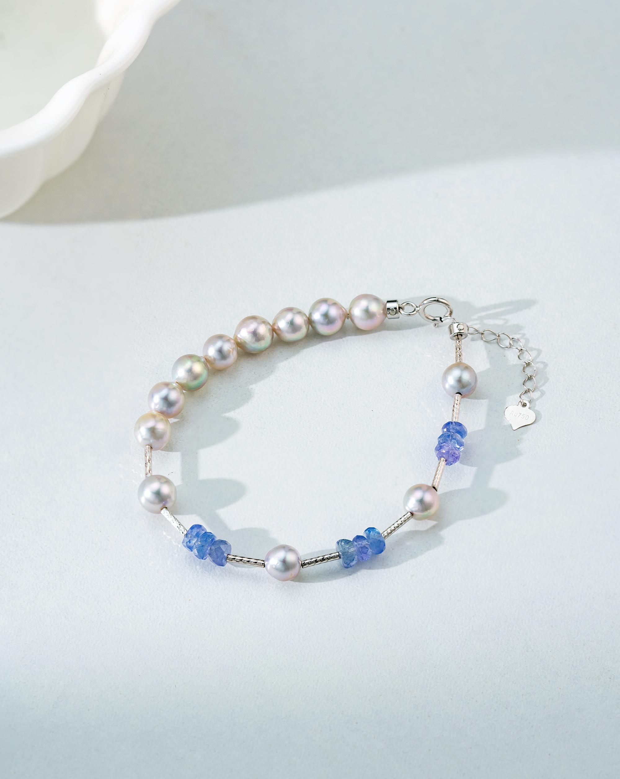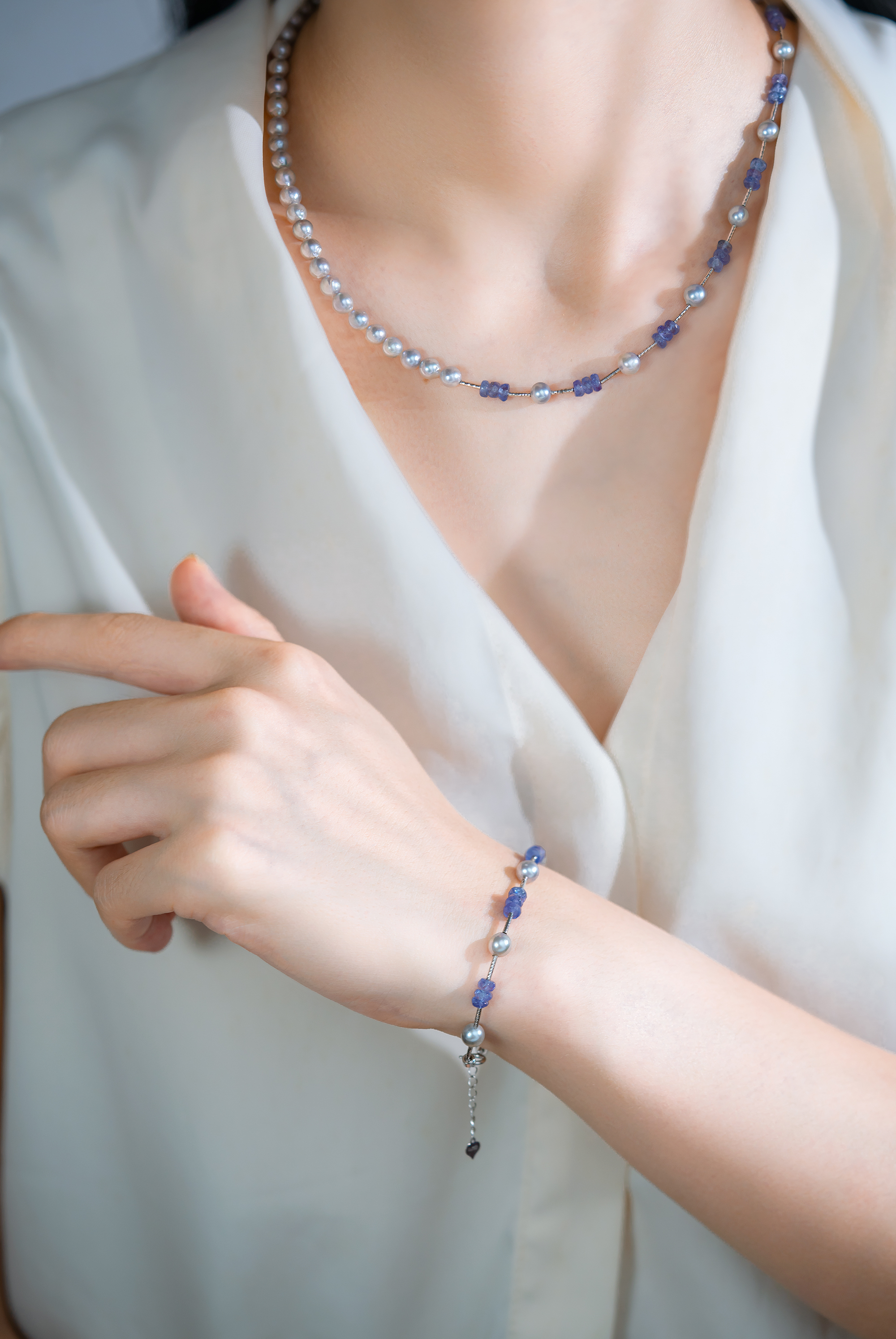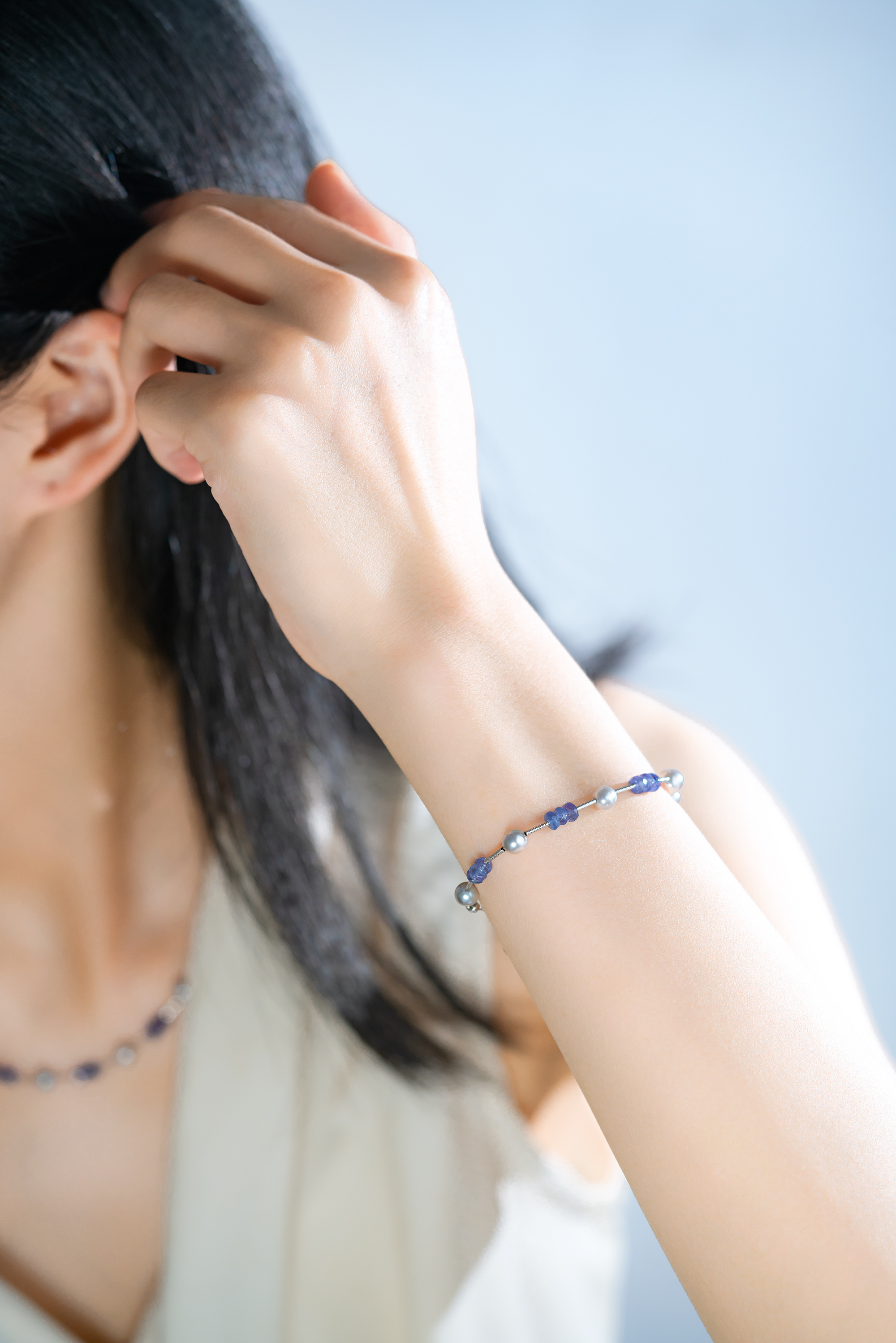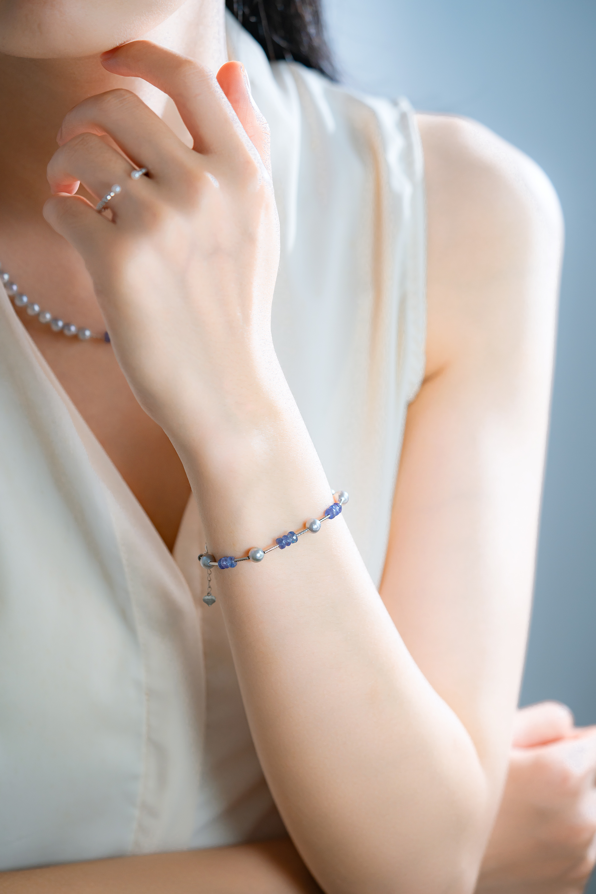 This bracelet combines silver blue Akoya pearls with nine deep blue Tanzanite stones, capturing the ocean’s tranquil beauty. Set in 18K white gold, it radiates refined elegance. Tanzanite, known as the “stone of the soul,” symbolizes hope and transformation, making a graceful companion to shine.