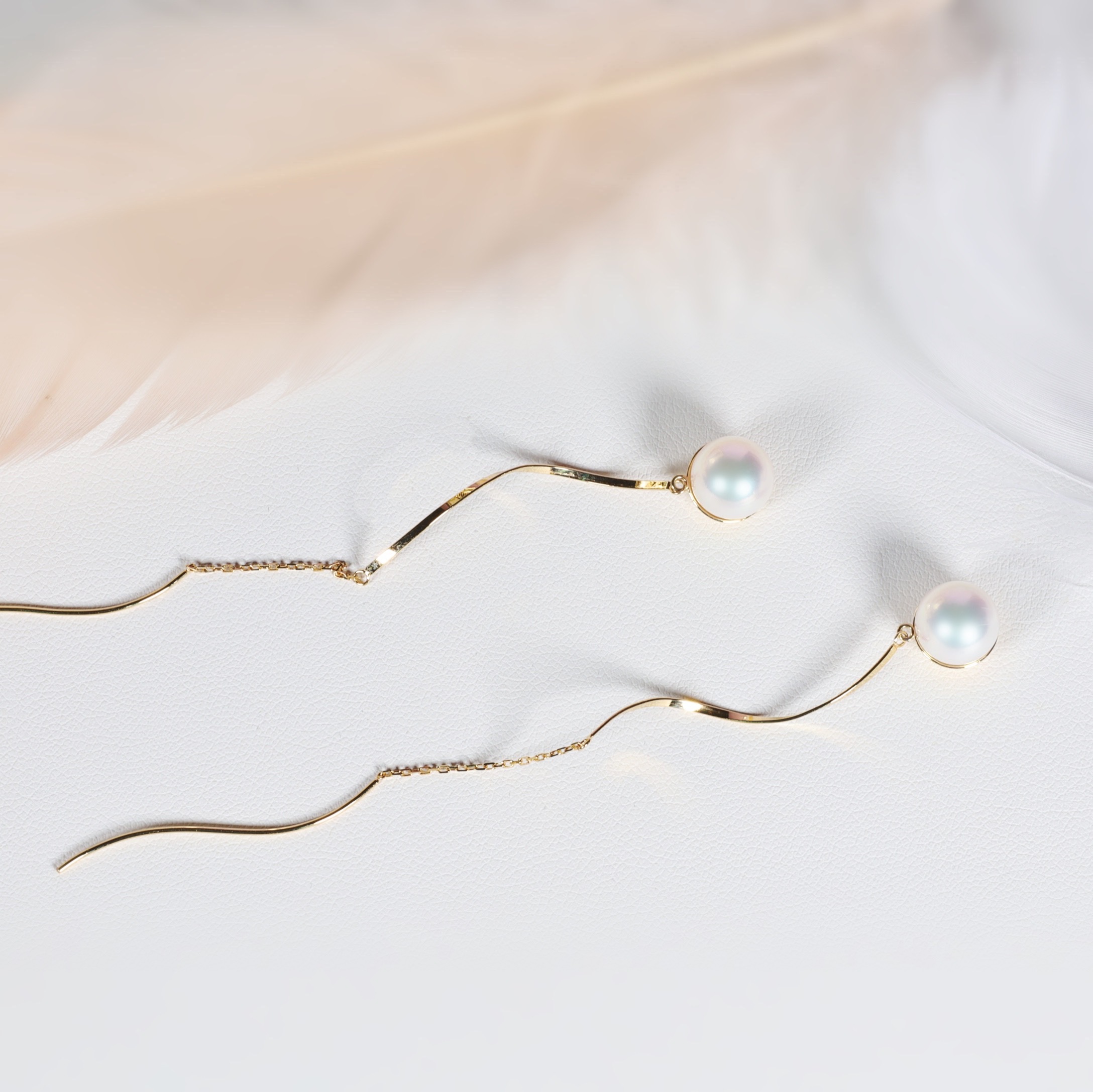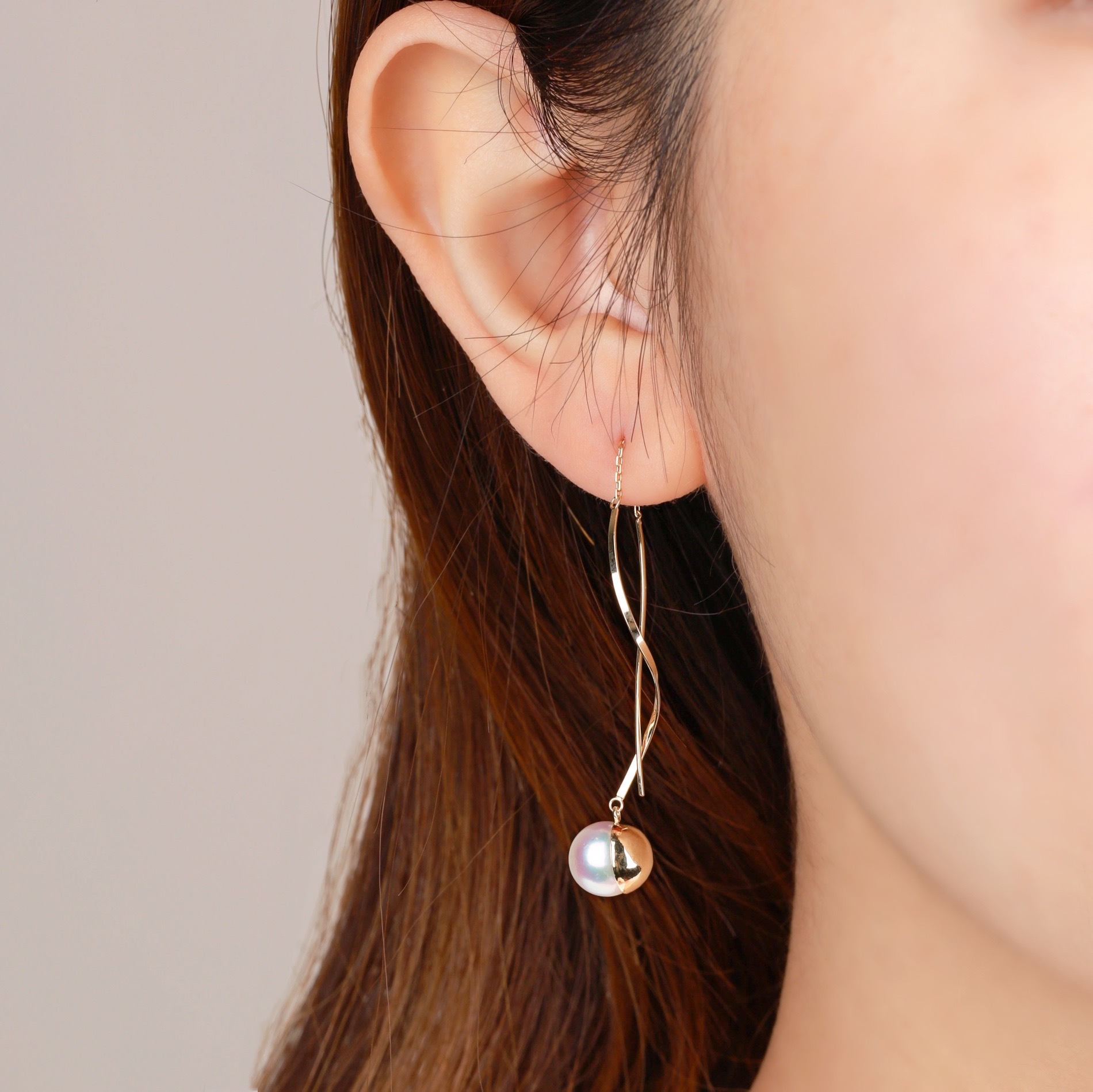 These 18K Yellow Gold dangling spiral earrings are embellished with the beautiful and rare 7.5 - 8mm Akoya pearl. The 18K Gold spirals dangle elegantly in the front and back, connecting with our delicate 18K gold chain, movement from the dangles adds vitality to the earrings.