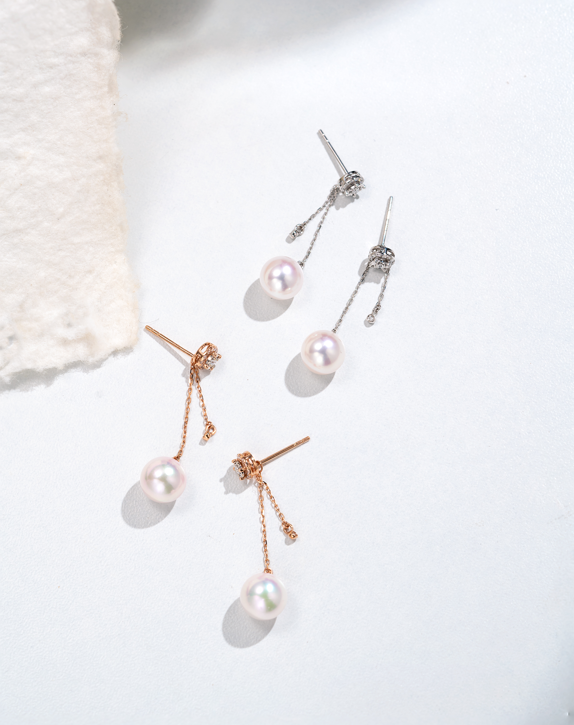 Dainty and Elegant. As the summer wind breezes, the earrings dangle along, making them a must-have item for all girls in Summer. Featuring the delicate 18K gold chain attaching a piece of 7.5-8mm Akoya Pearl as the back of the earring. The 18K gold stud part is fully adorned with diamonds in various