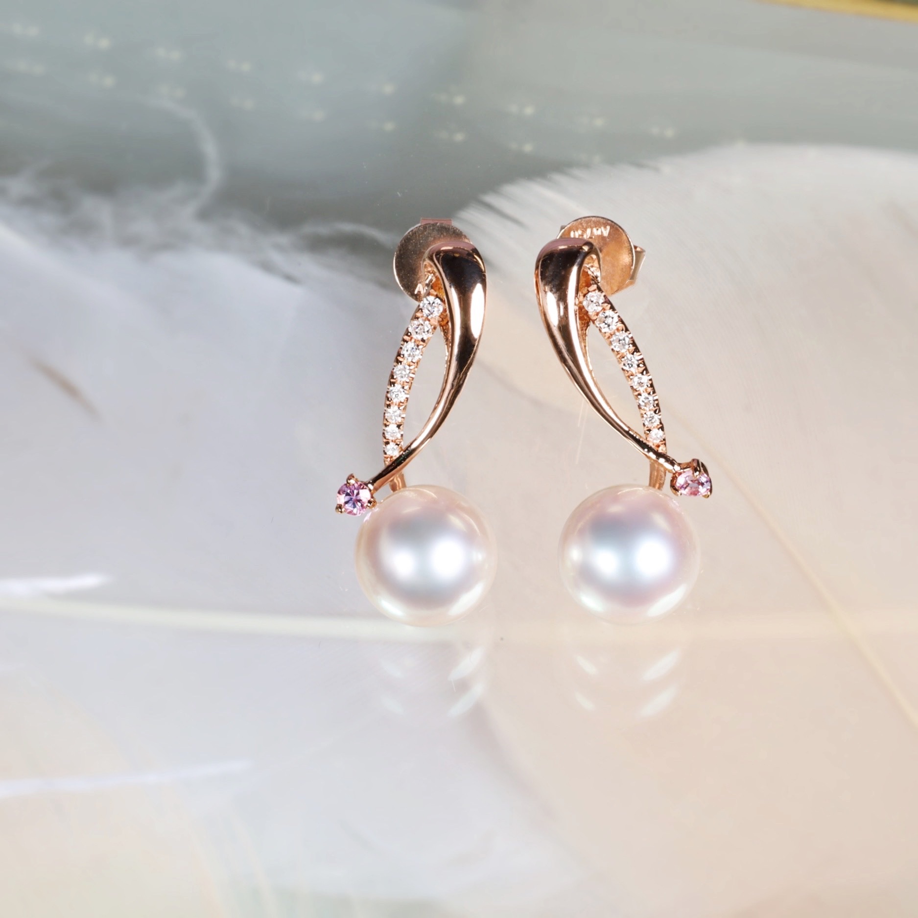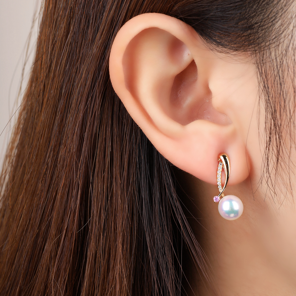The exceptional 18k white-gold streamline design, embellished with shimmering diamonds, gives the earrings an aura of elegance. The precious pink sapphire elevates the lustrous 7.5-8mm Akoya Pearl with pink aurora effect. This pair of sophisticated earrings is a must-have for any intellectual woman.