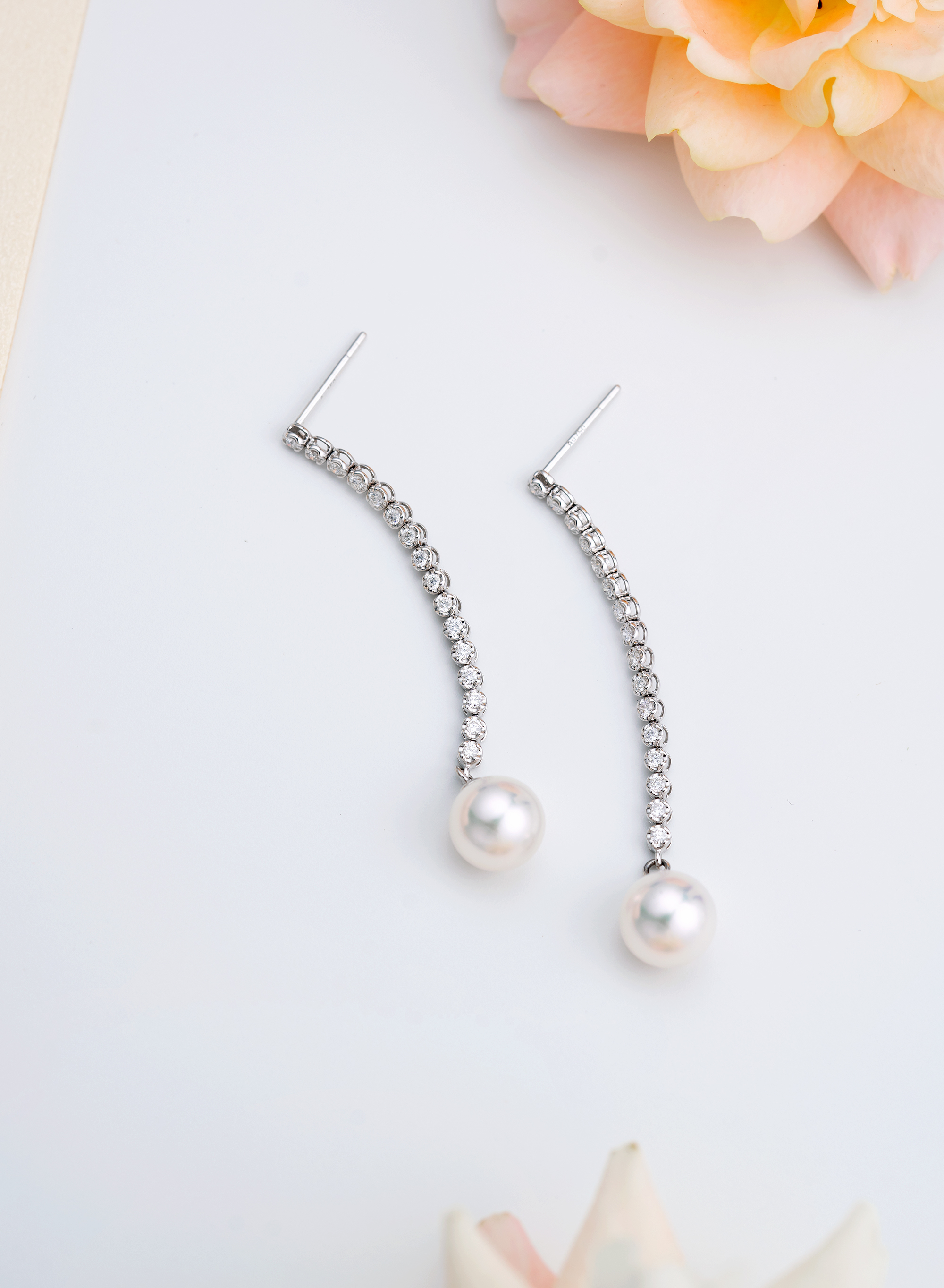These pearl and diamond drop earrings embody elegant poetry with minimalist design. 18K white gold chains studded with tiny diamonds drape like flowing star rivers, while the round, lustrous pearls below glisten like dewdrops on leaves. Perfect for elevating daily looks or adding sophistication to s