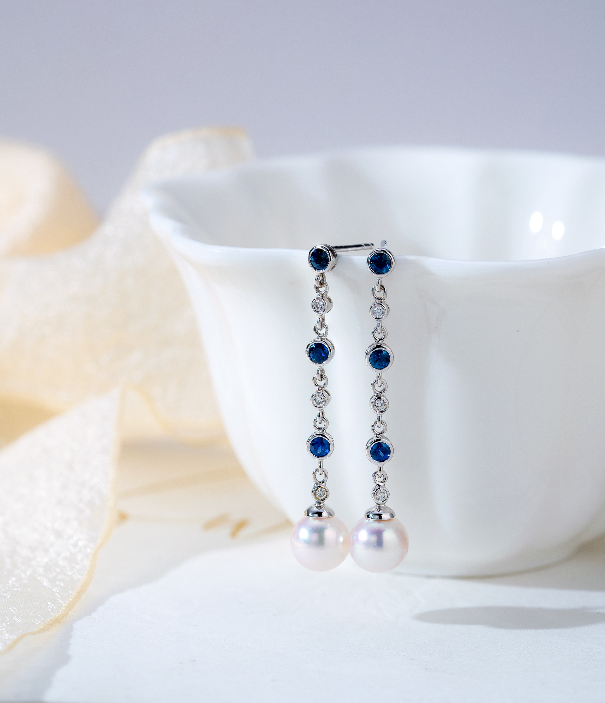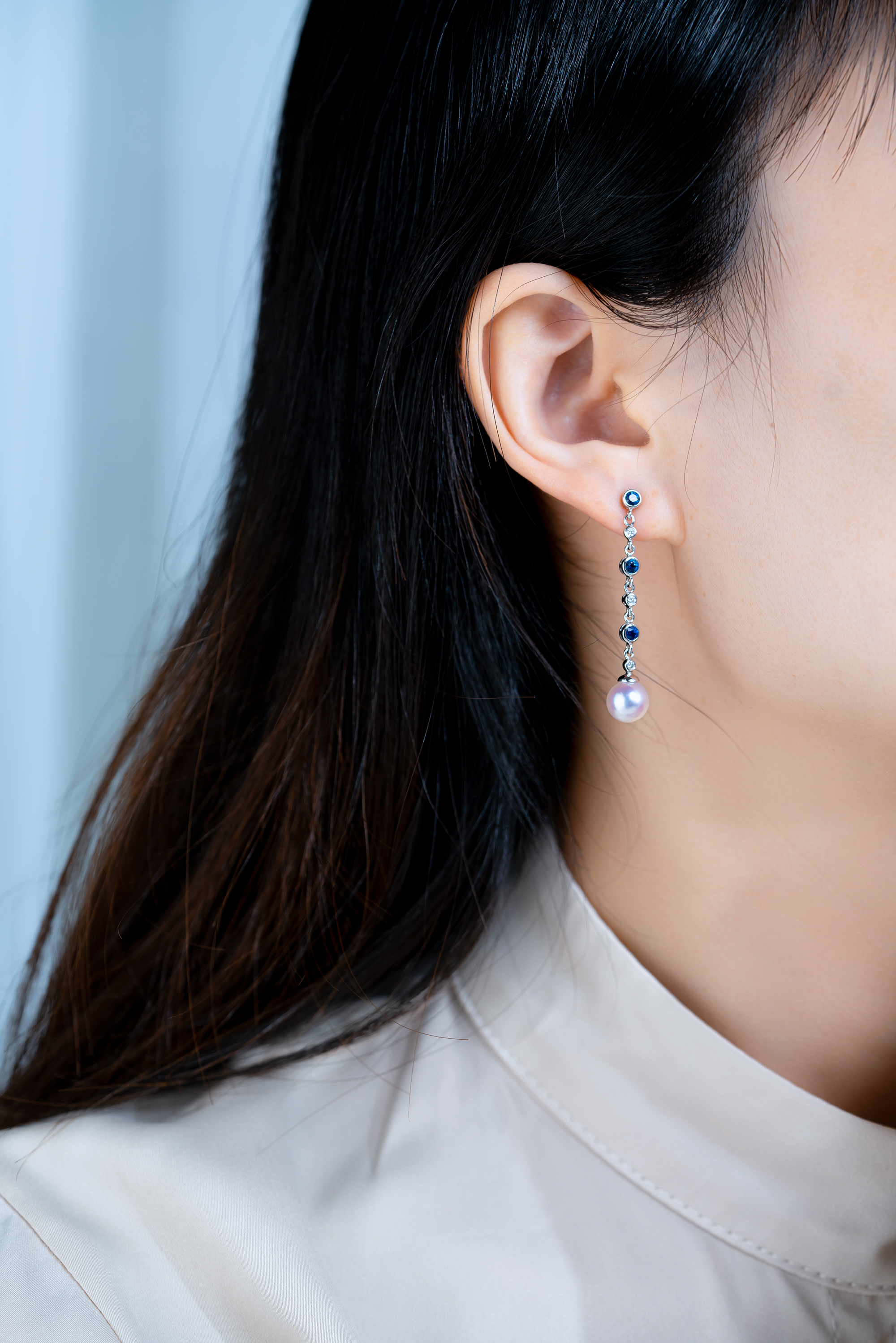 18K white gold earrings with dazzling diamonds and beautiful sapphires create captivating contrast. Deep blue sapphires and sparkling diamonds complement, mesmerizing visually. Akoya pearls add mystery, romance, elevate elegance. Intricate design showcases sophisticated, enchanting style.