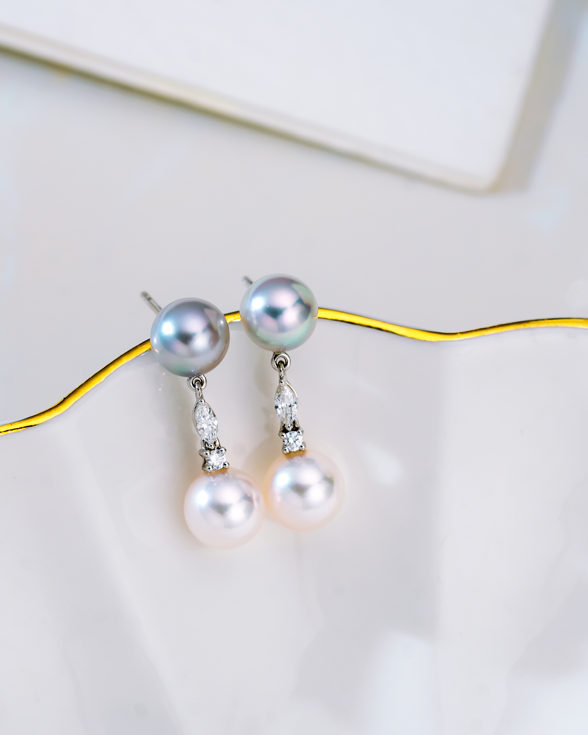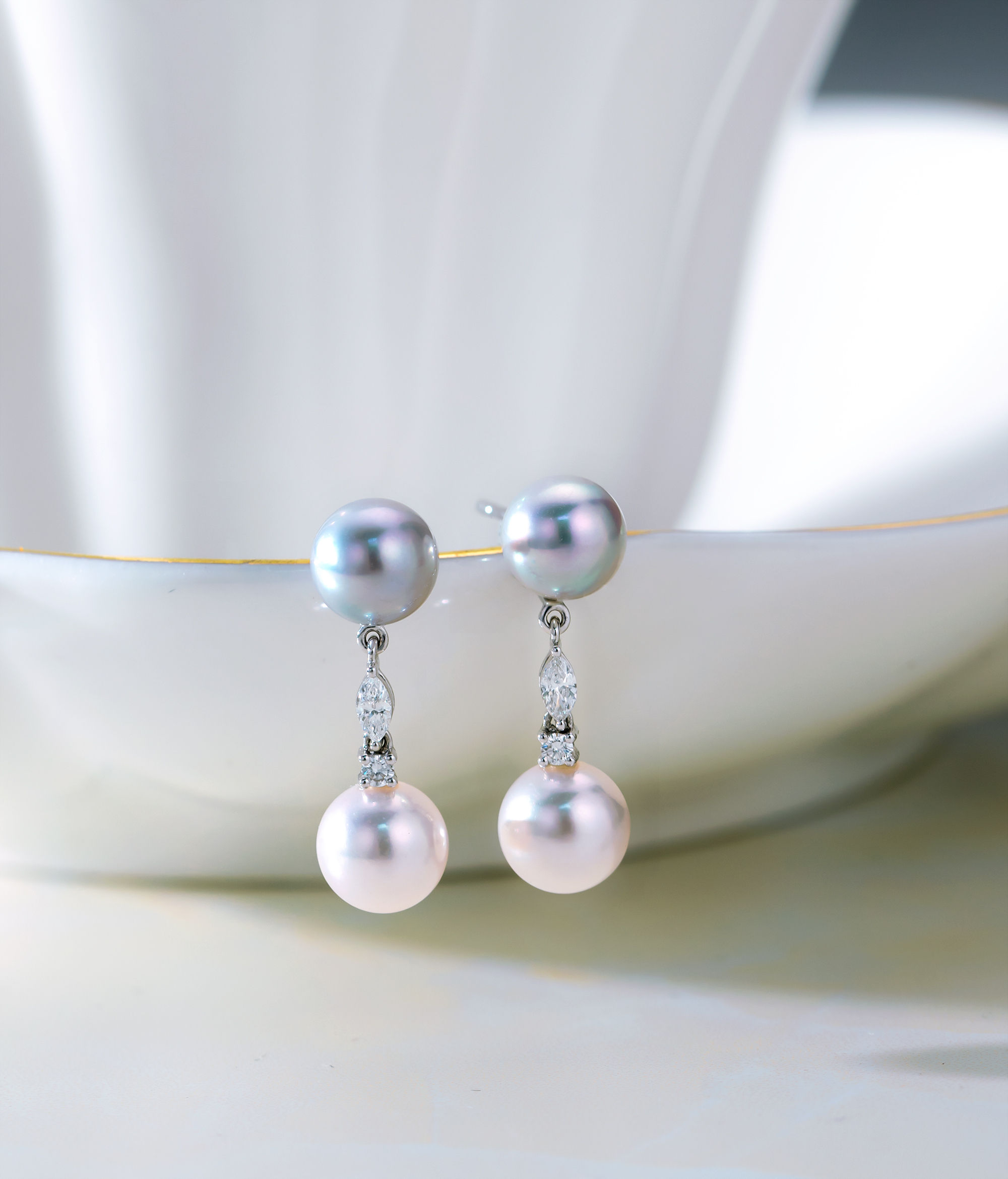 This 18K white gold drop earring cleverly combines the unique dreamy and mysterious silver-blue Akoya pearl, the sparkle of Marquise diamonds, and the noble white Akoya pearl, exuding the charm of elegant and intellectual women. A must-have item for who want to showcase stylish and charming fashion.