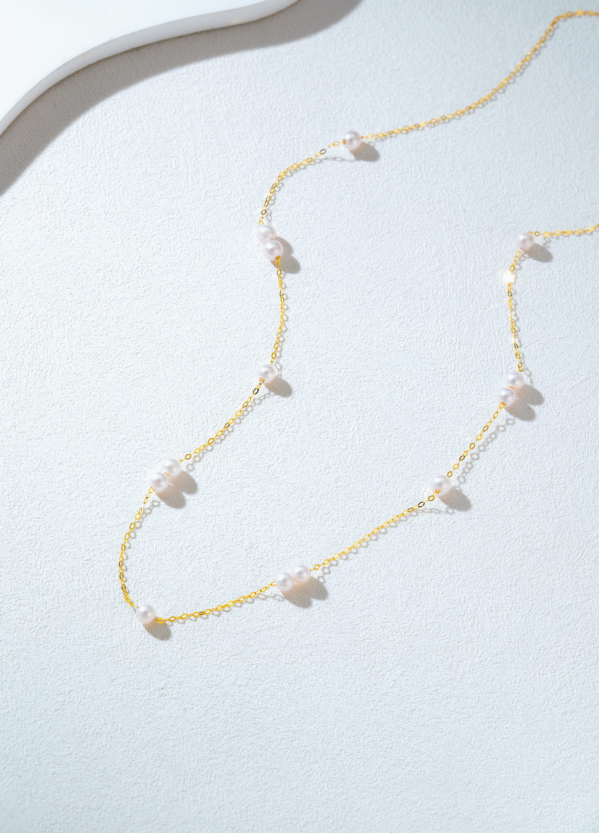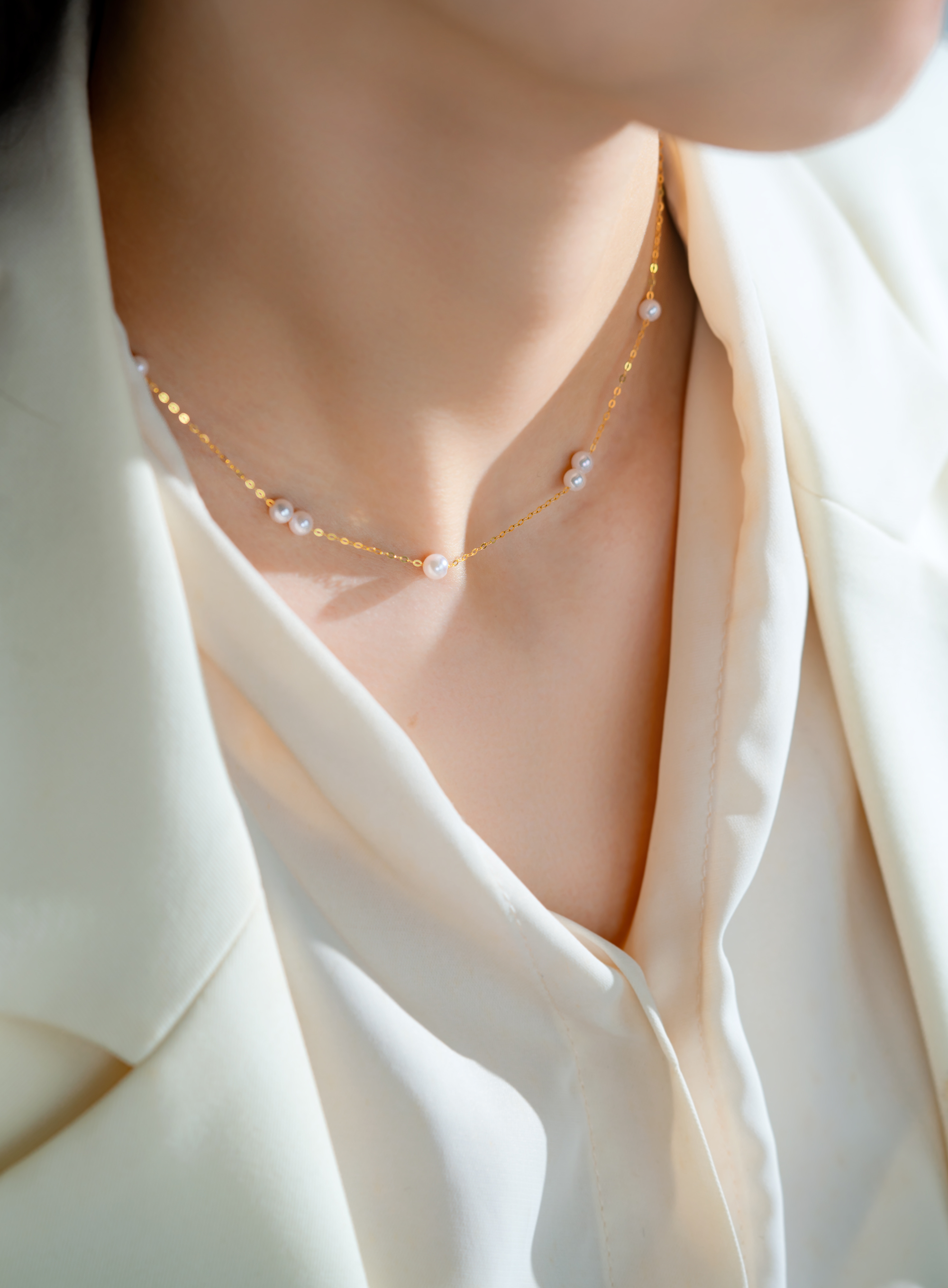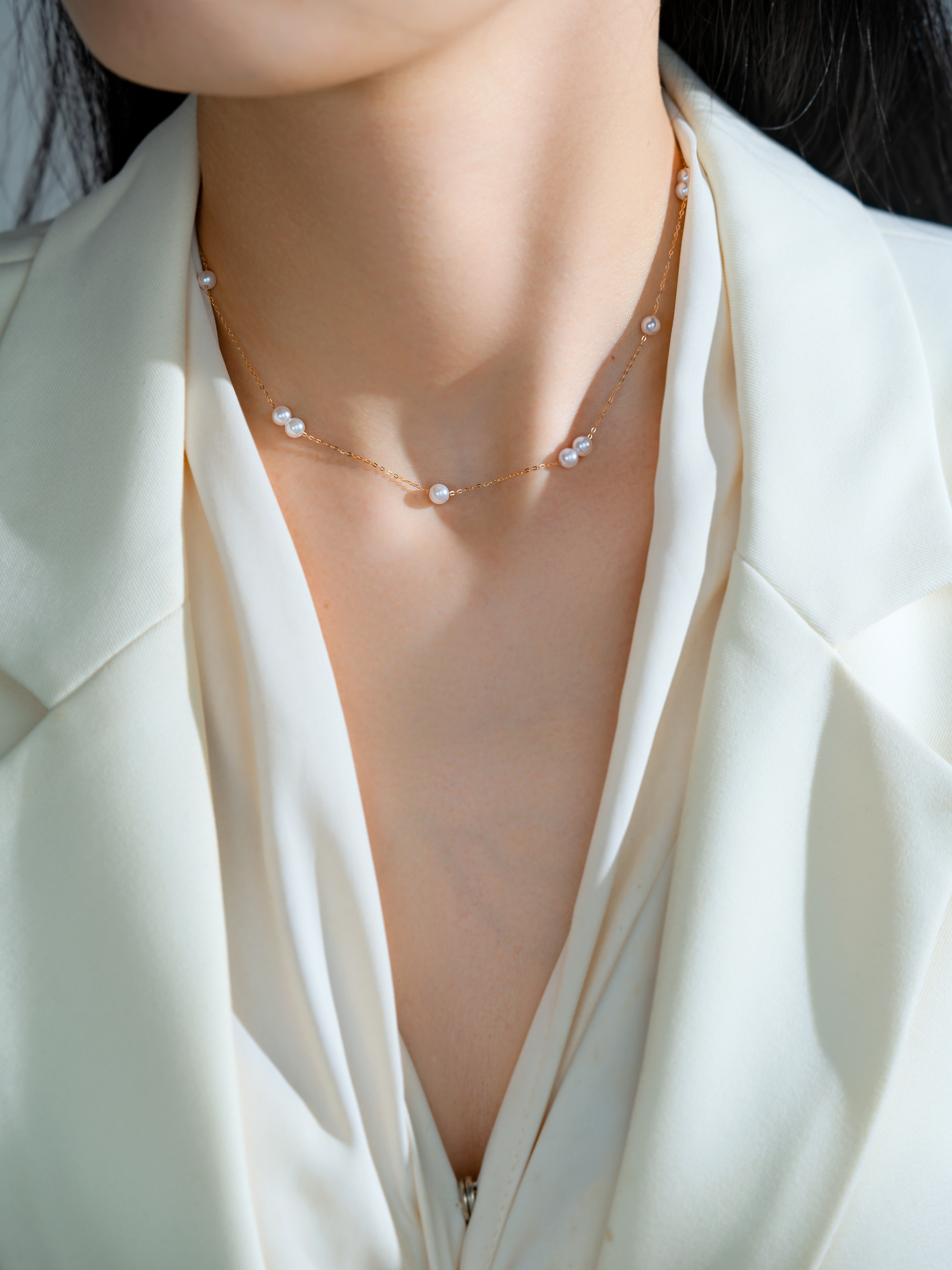 The necklace features a minimalist chain crafted from 18K gold, with 4-4.5mm Akoya pearls scattered like delicate morning dew. The pearls exude a warm luster, intertwining with the 18K gold to create an understated and elegant .