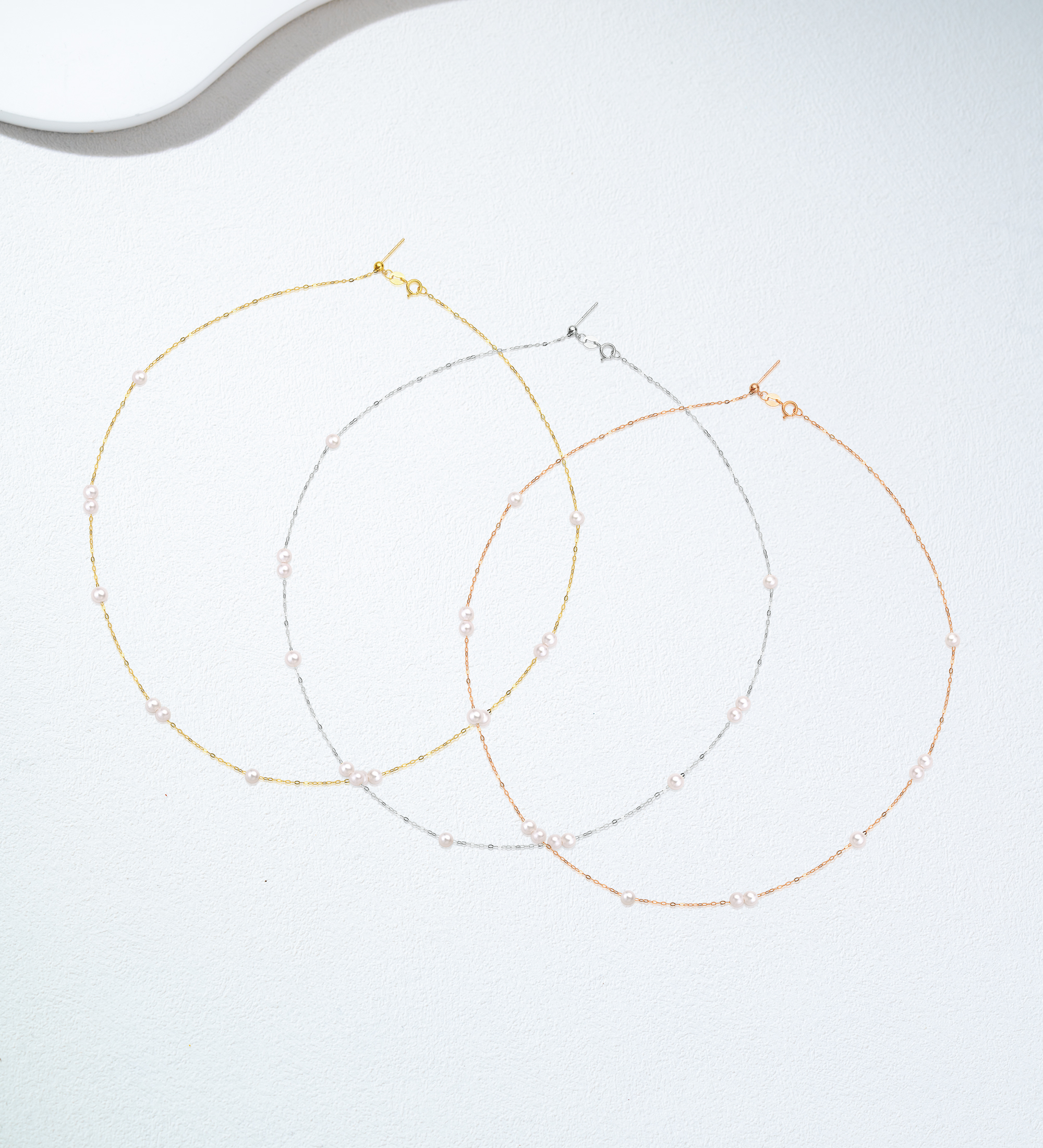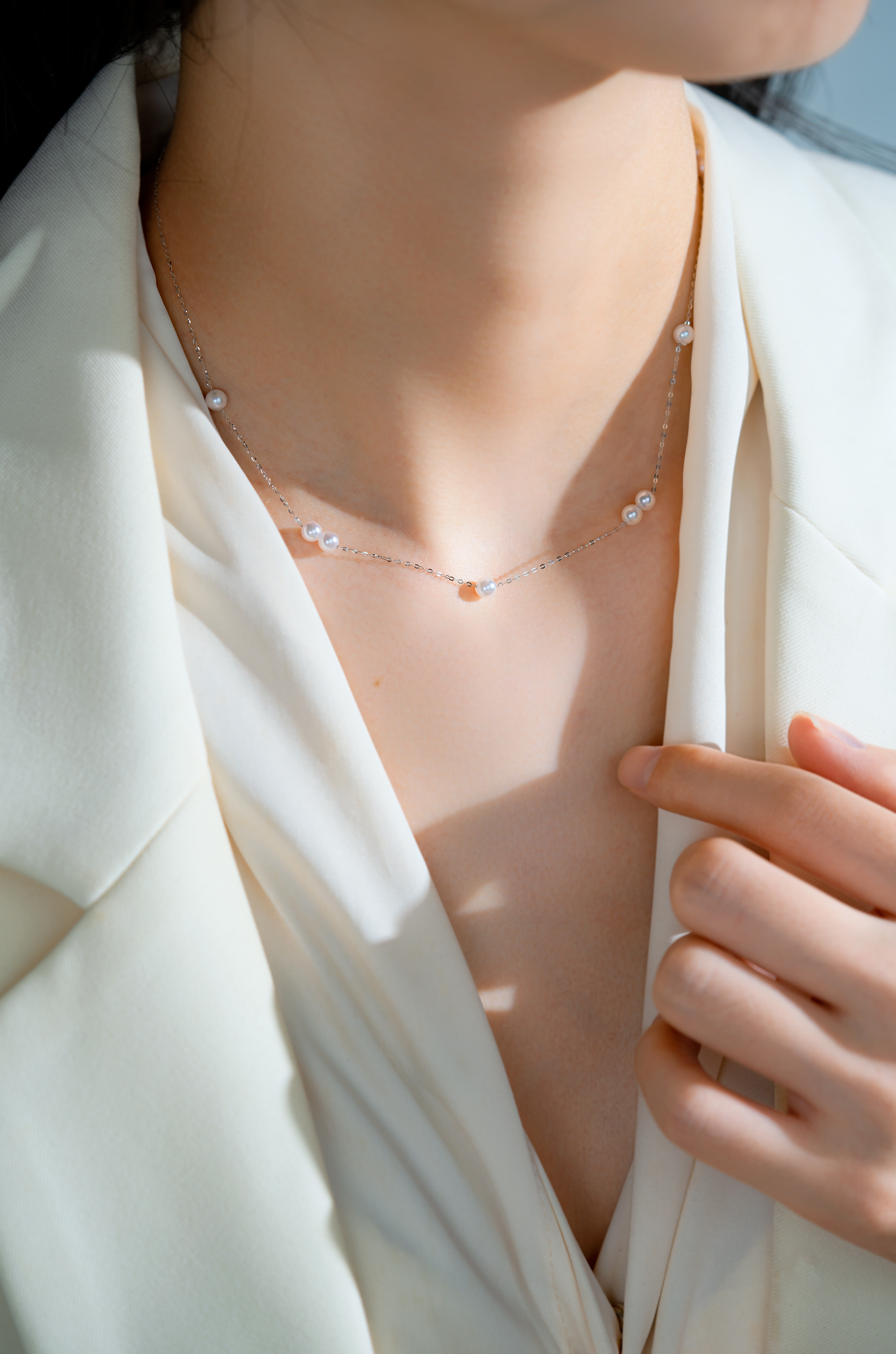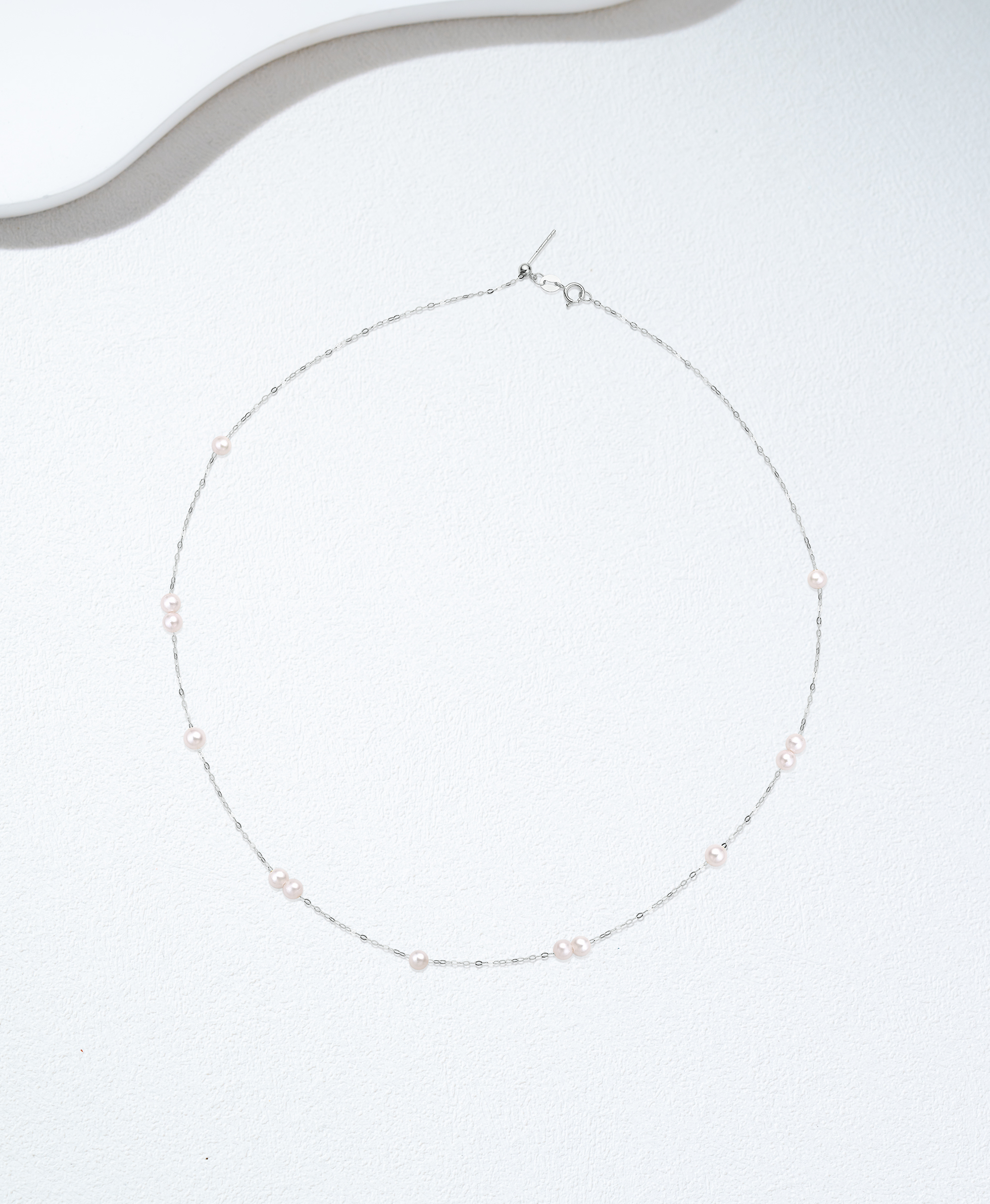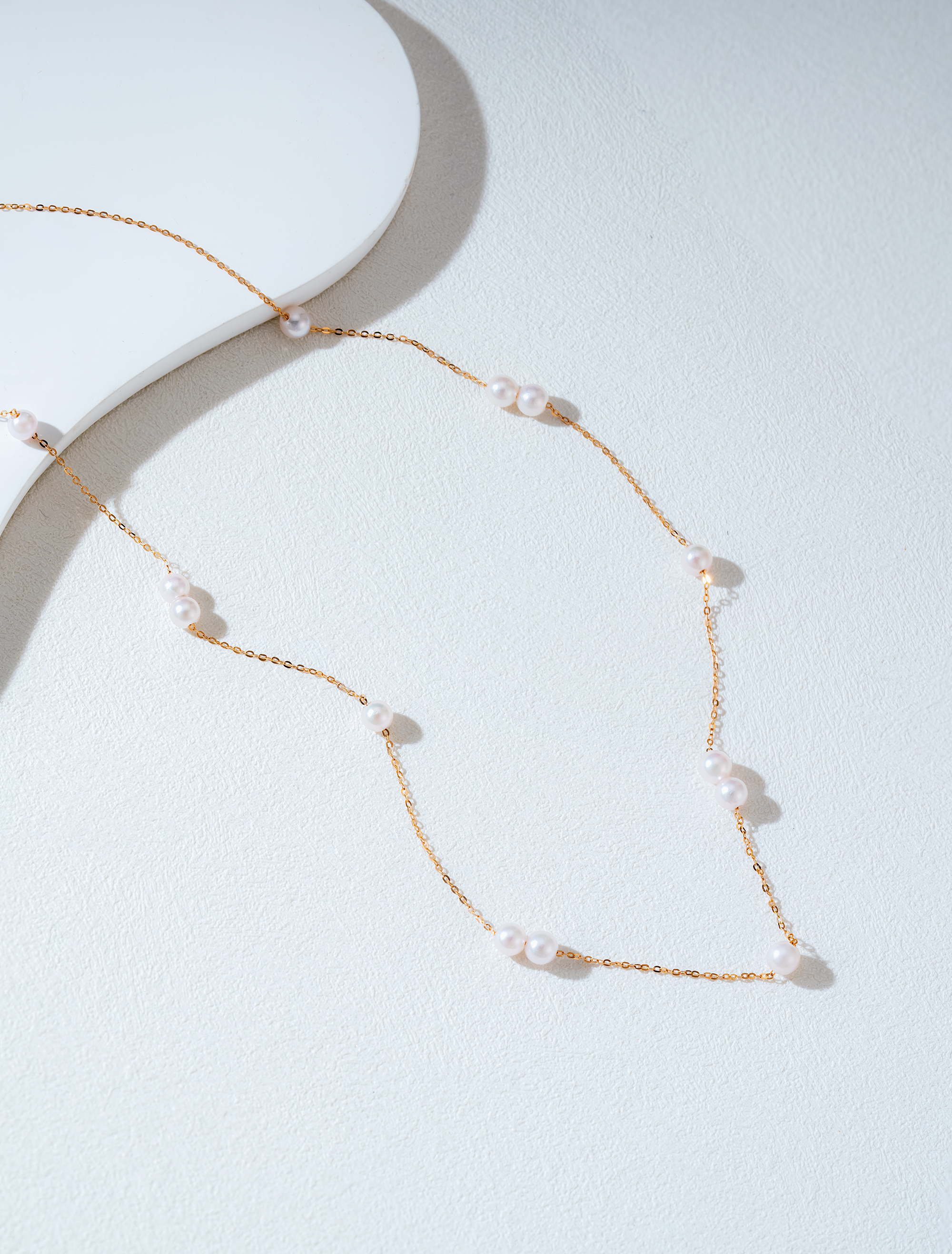 The necklace features a minimalist chain crafted from 18K gold, with 4-4.5mm Akoya pearls scattered like delicate morning dew. The pearls exude a warm luster, intertwining with the 18K gold to create an understated and elegant .