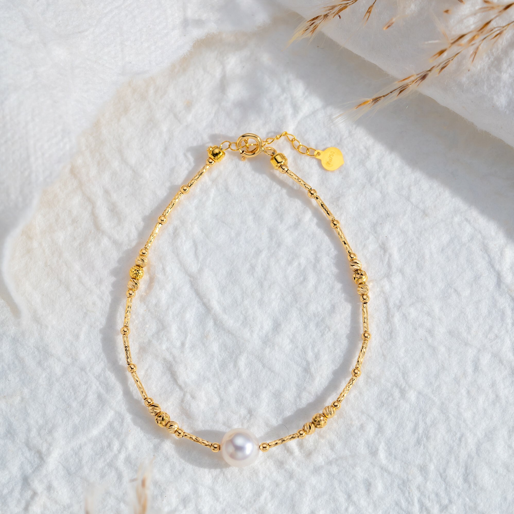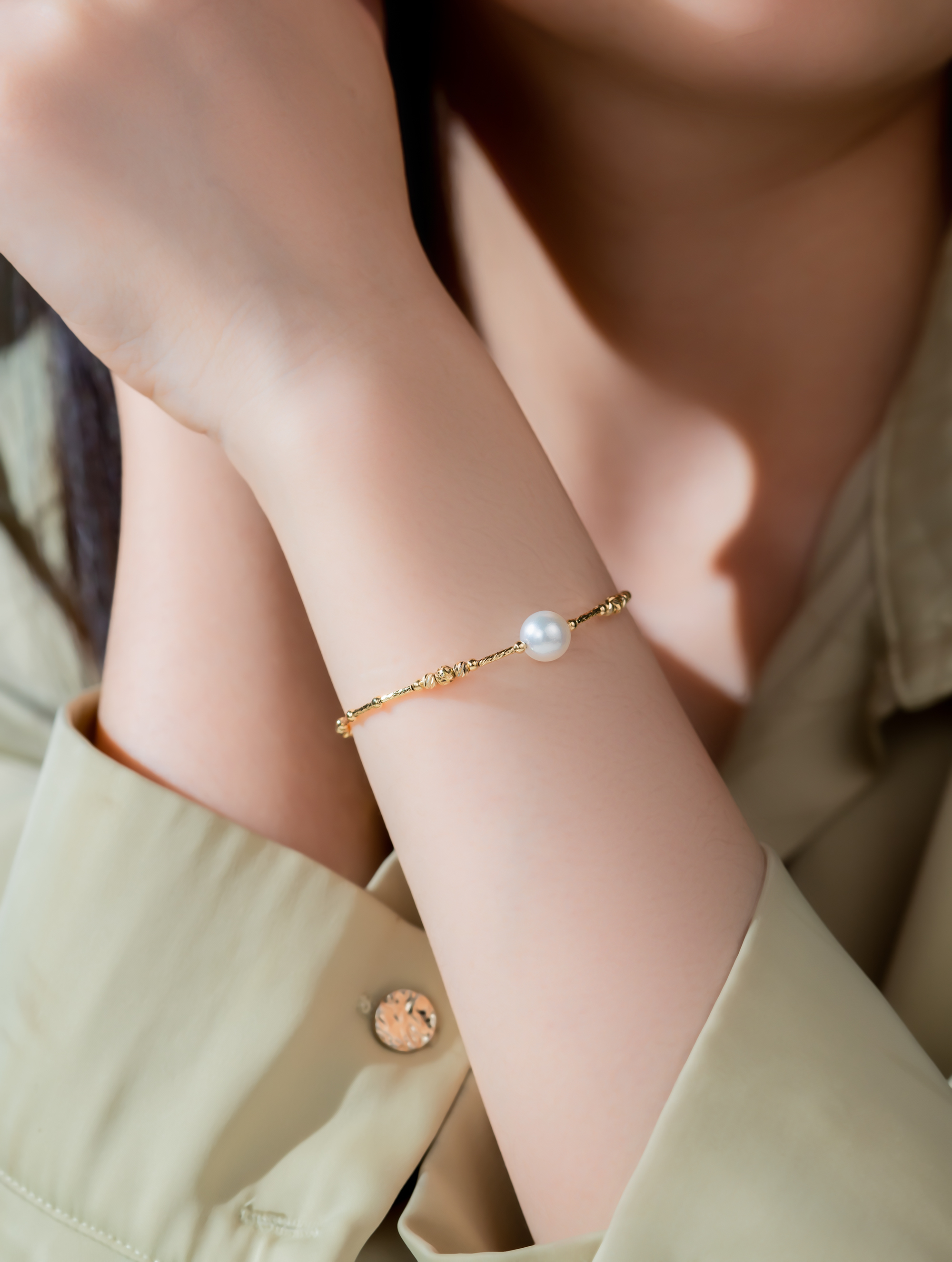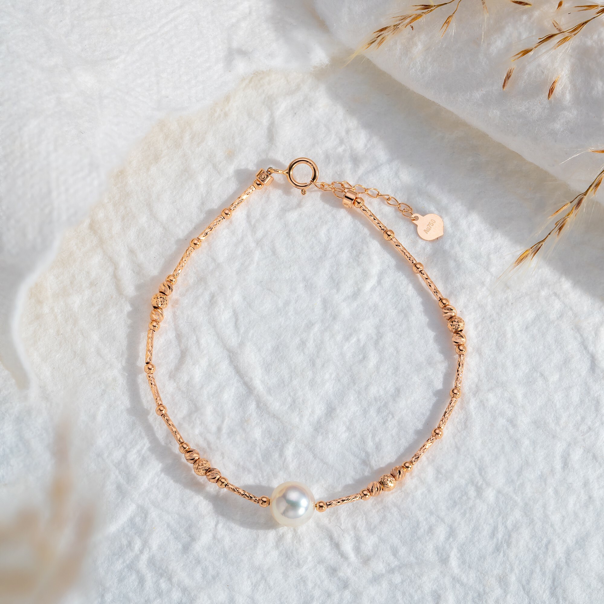 A very popular bracelet design in Japan and Korea in recent years. The 18K gold bracelet is made using the unique Italian handicraft technique, giving the bracelet its elasticity and lightweight. Matching with a Japanese Akoya Pearl with premium quality and is fixed in place with two 18K gold beads.