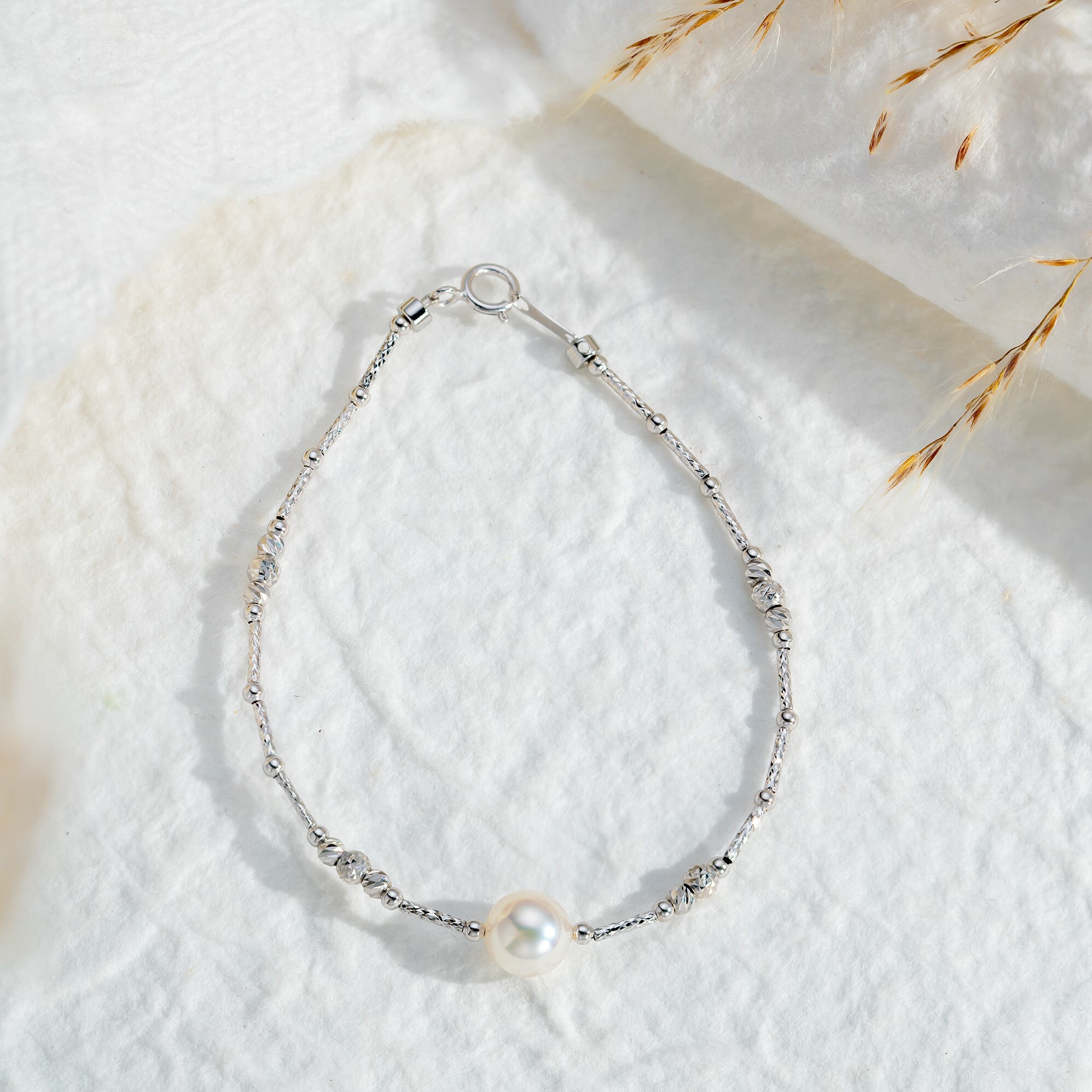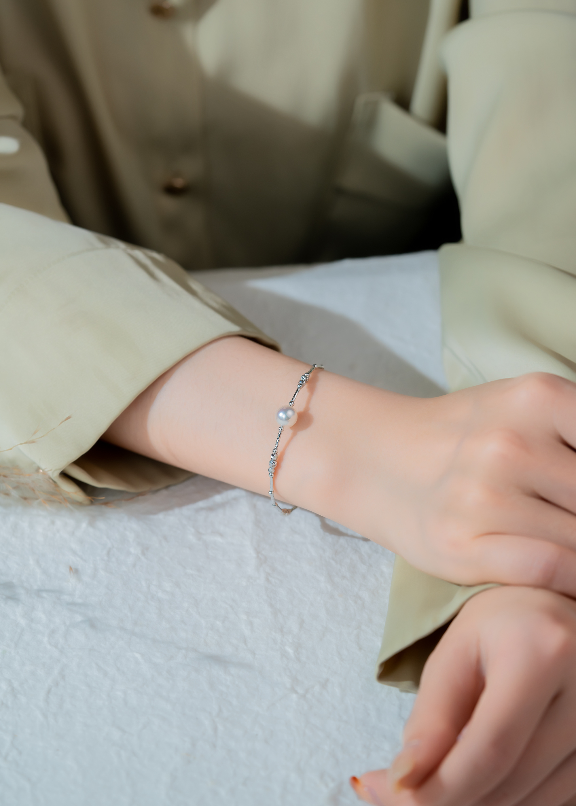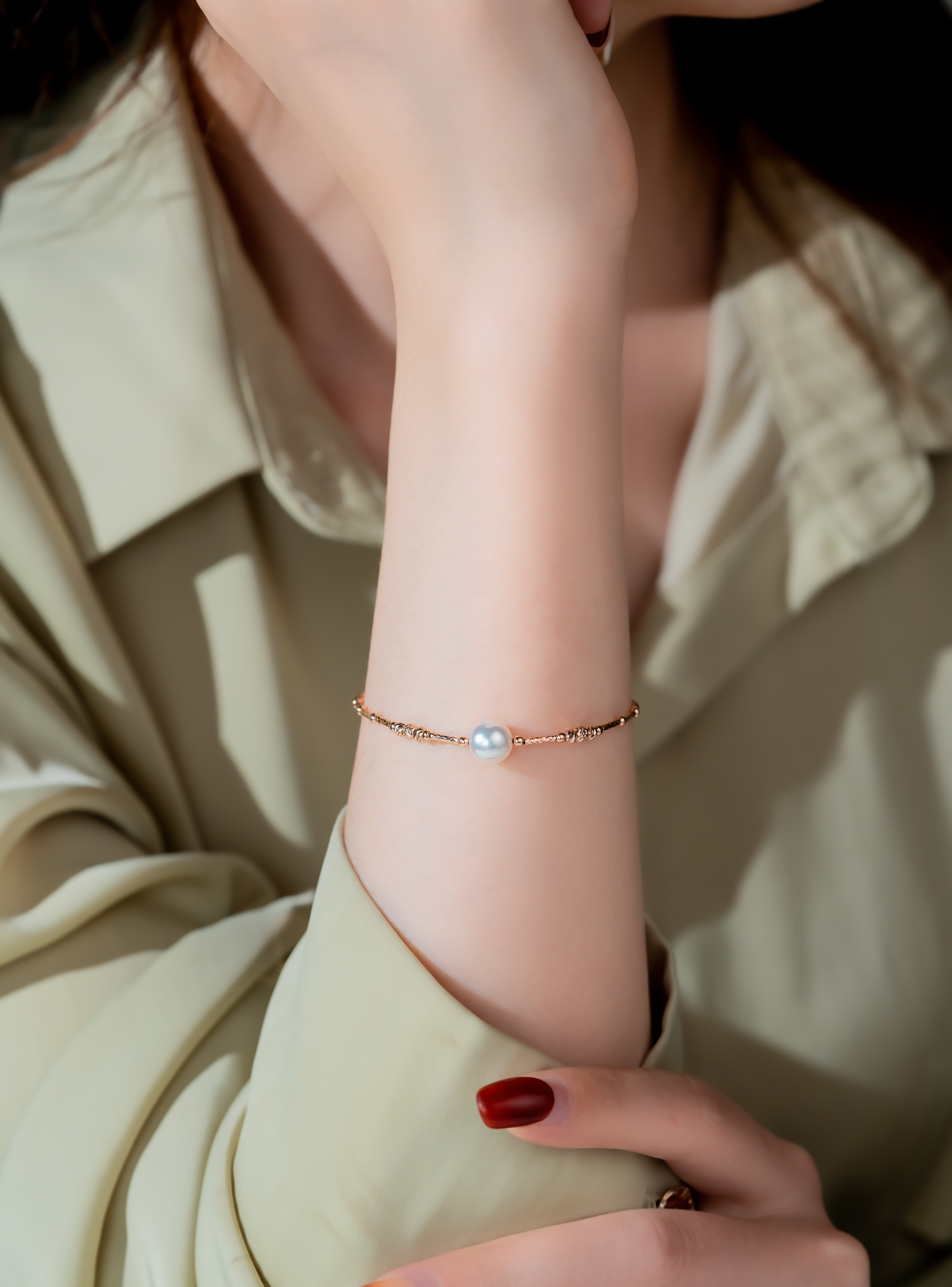 A very popular bracelet design in Japan and Korea in recent years. The 18K gold bracelet is made using the unique Italian handicraft technique, giving the bracelet its elasticity and lightweight. Matching with a Japanese Akoya Pearl with premium quality and is fixed in place with two 18K gold beads.