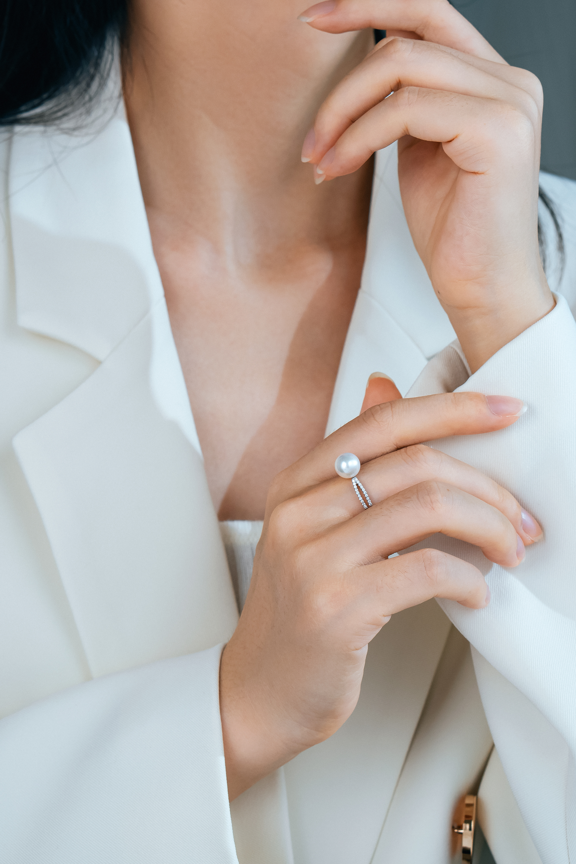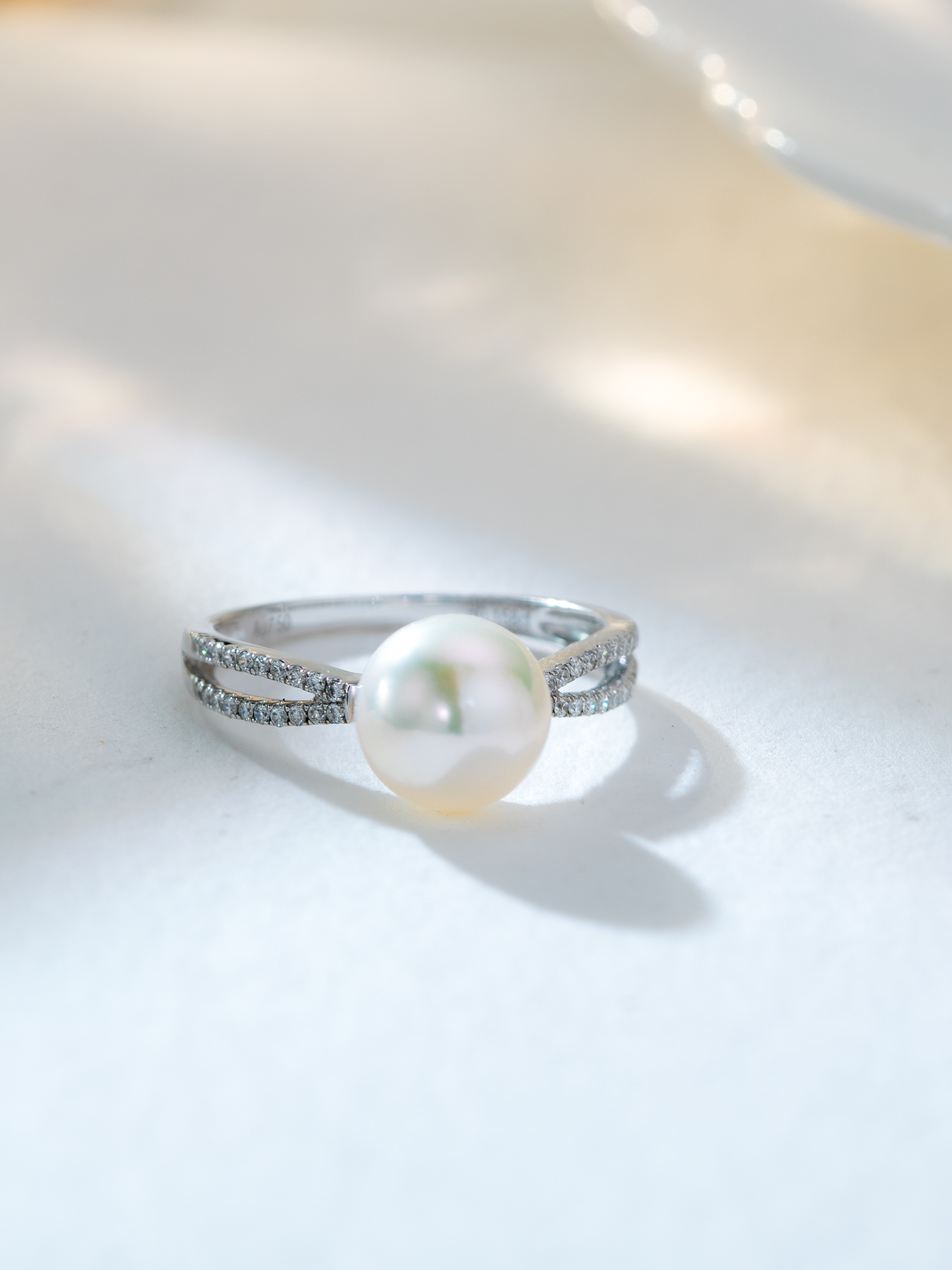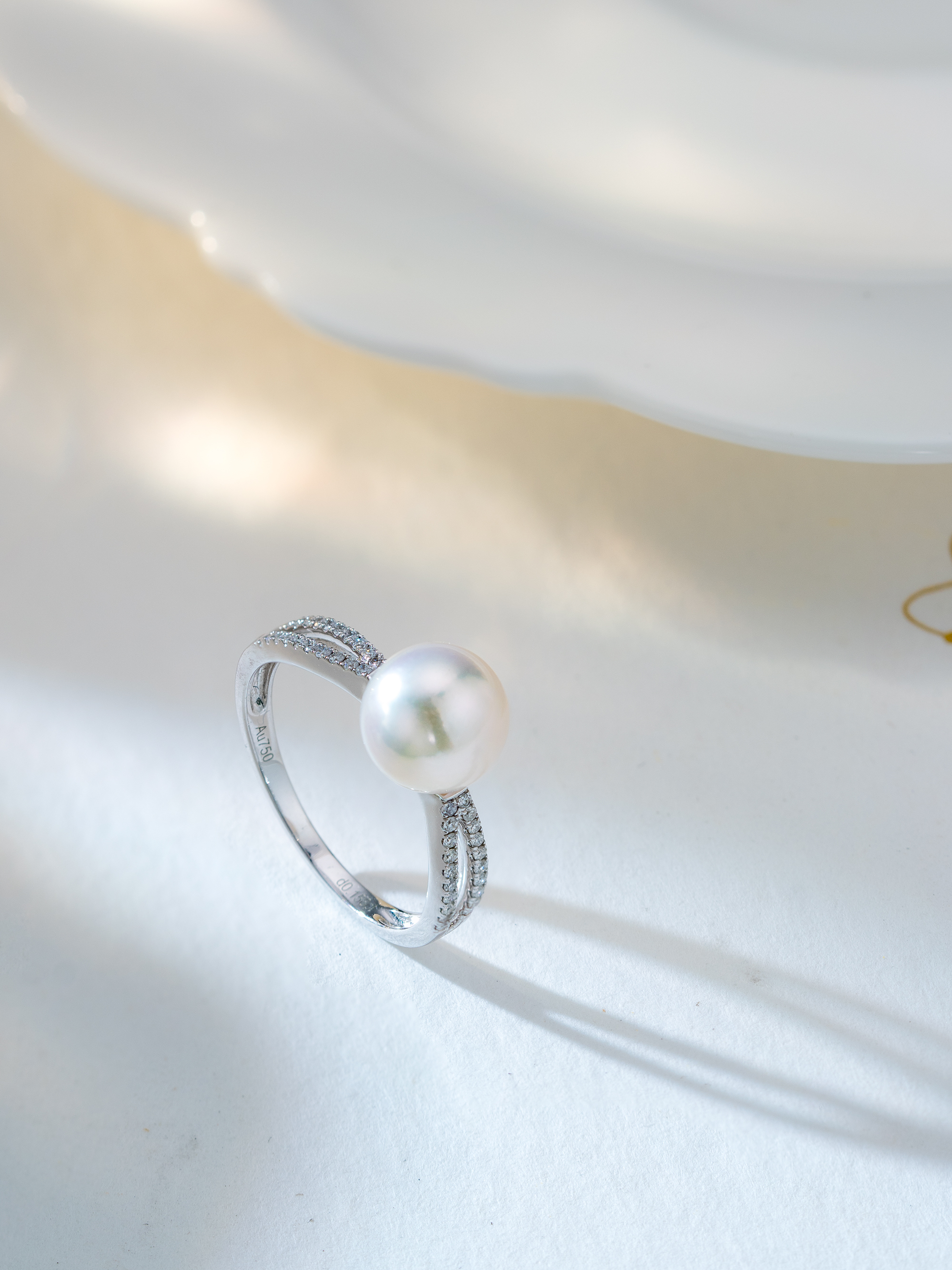 This exquisite ring features a dazzling Akoya pearl at its center, surrounded by shimmering diamonds on both sides. The double-layer design adds a unique touch and dimension to your fingers, making it a stylish statement piece for any occasion.