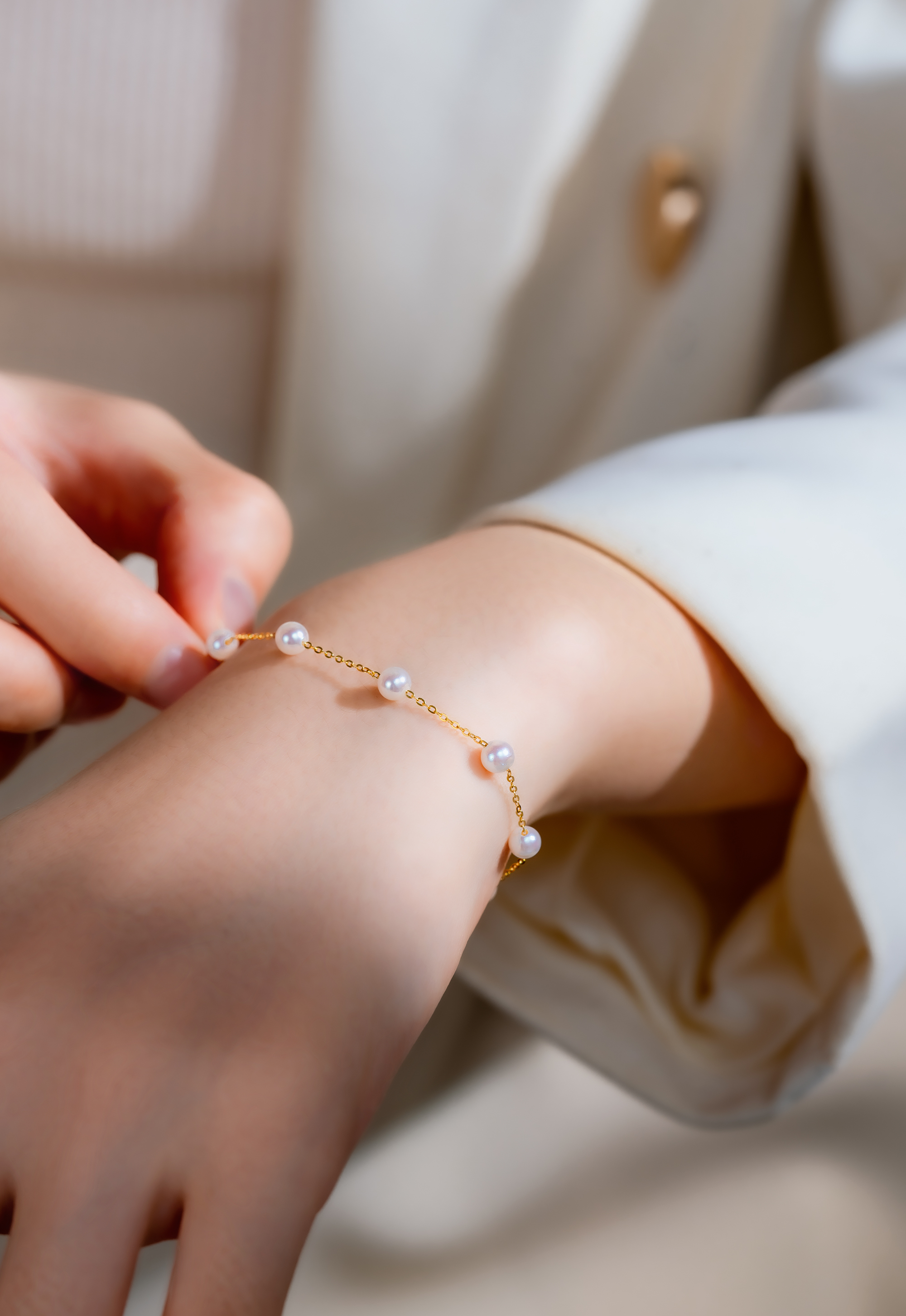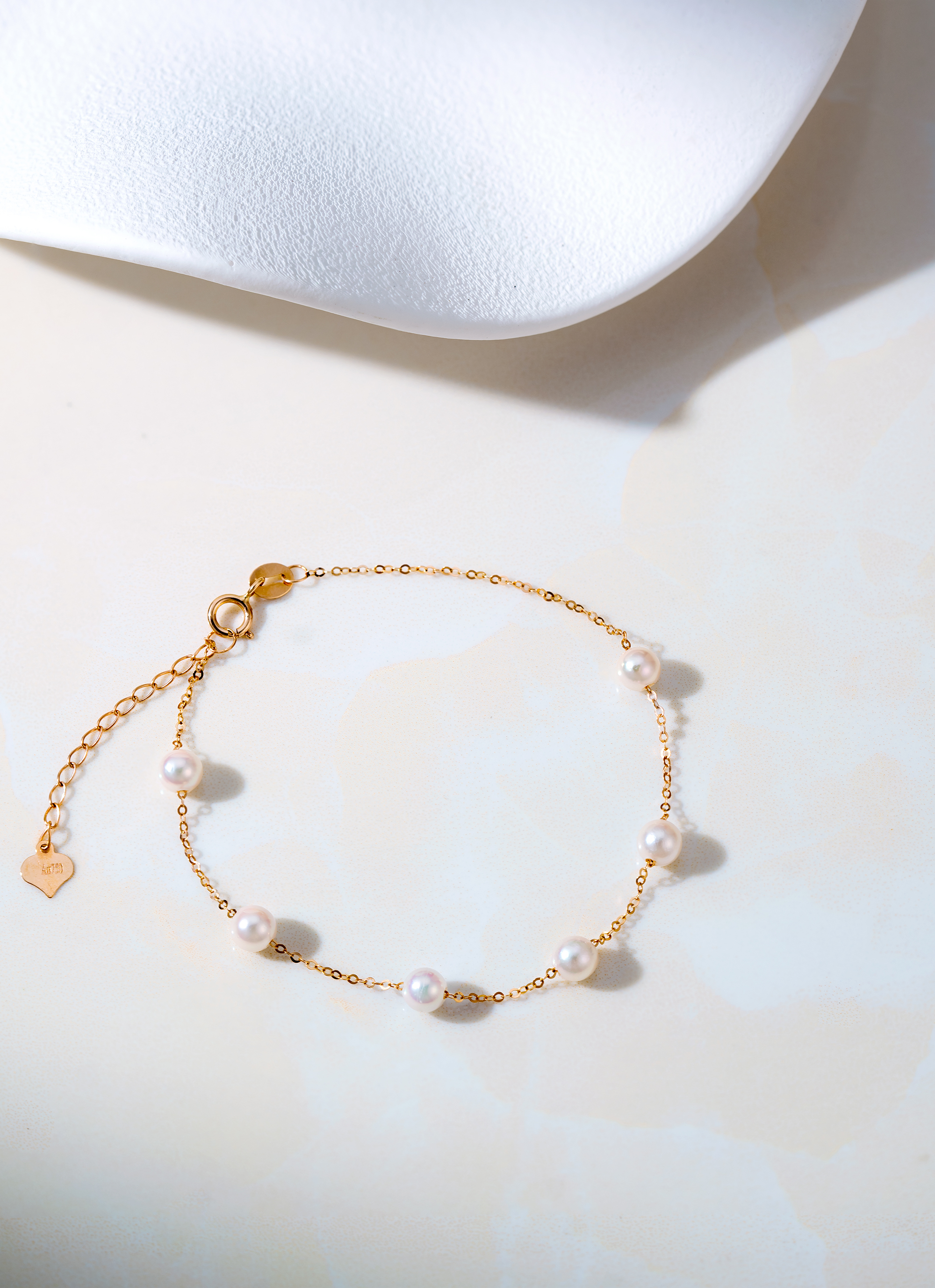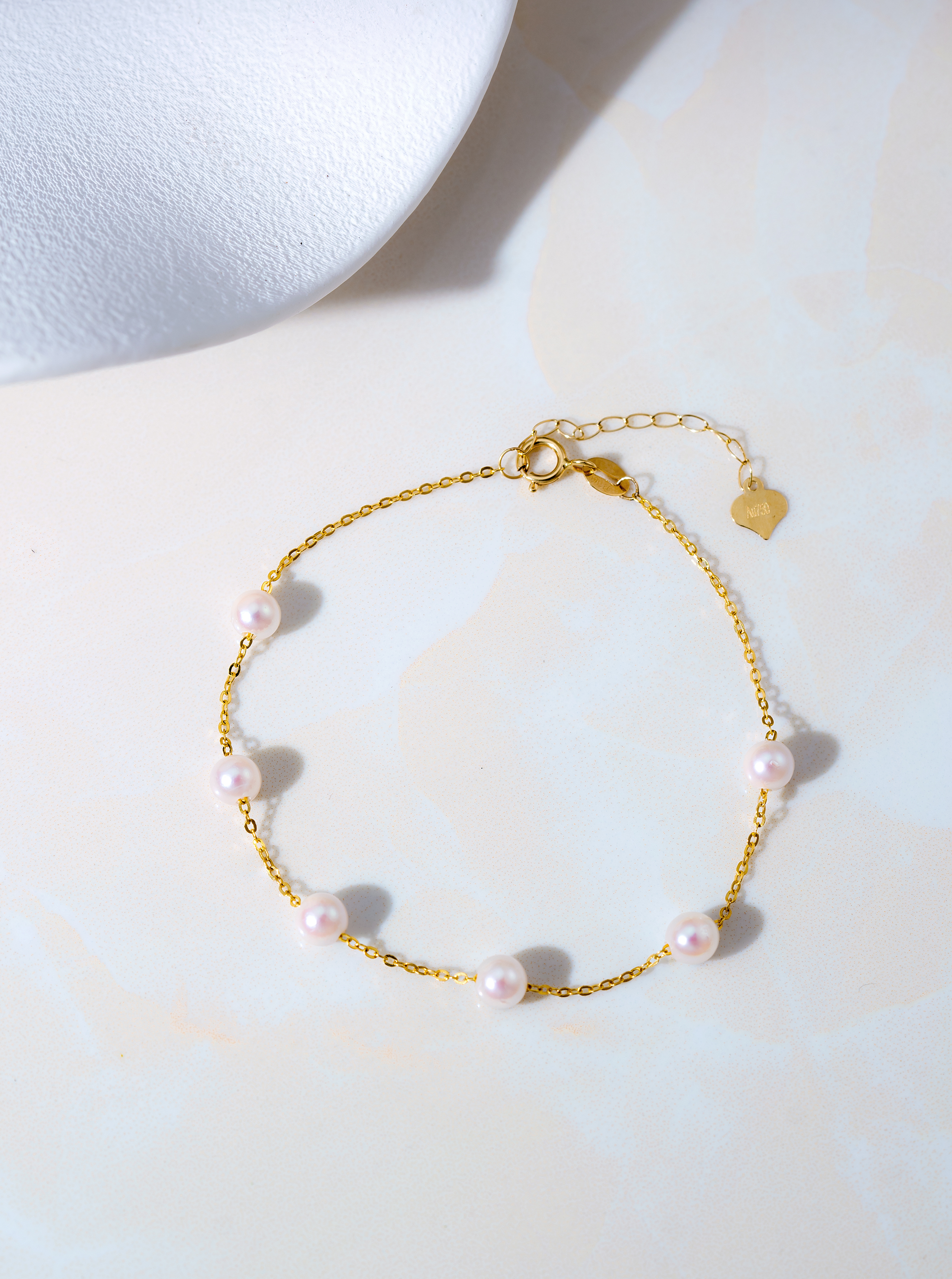 The bracelet features 5 shiny AKOYA pearls, stylishly combined with 18K gold, offering three K gold color choices for versatile styling. It has a unique luster and is adjustable to fit wrists, making it perfect for various occasions.