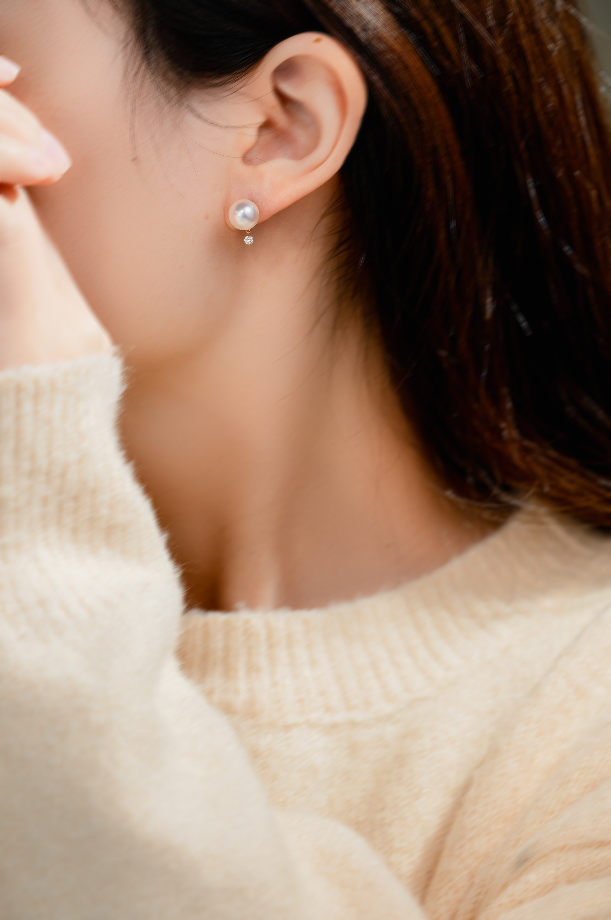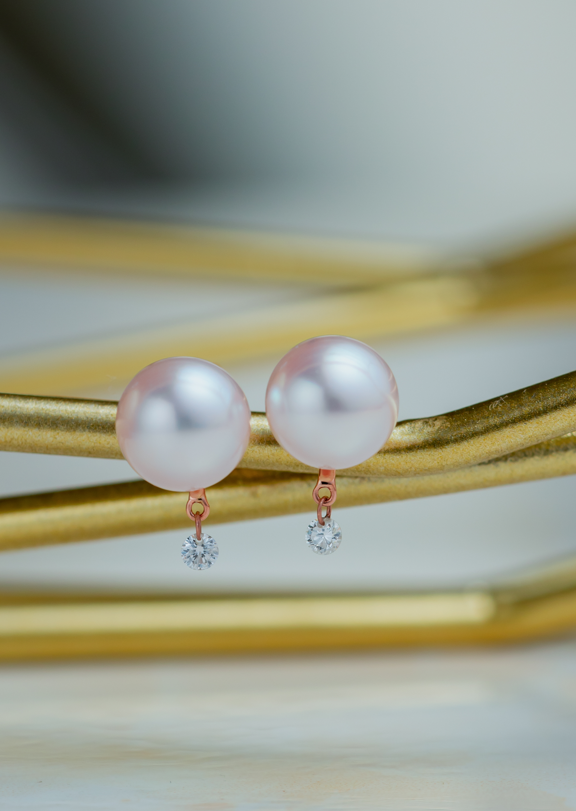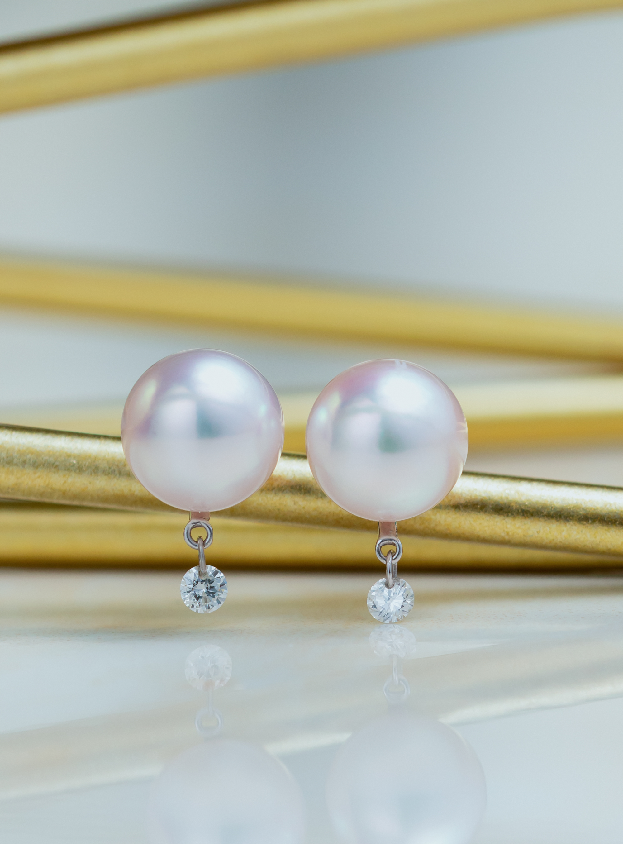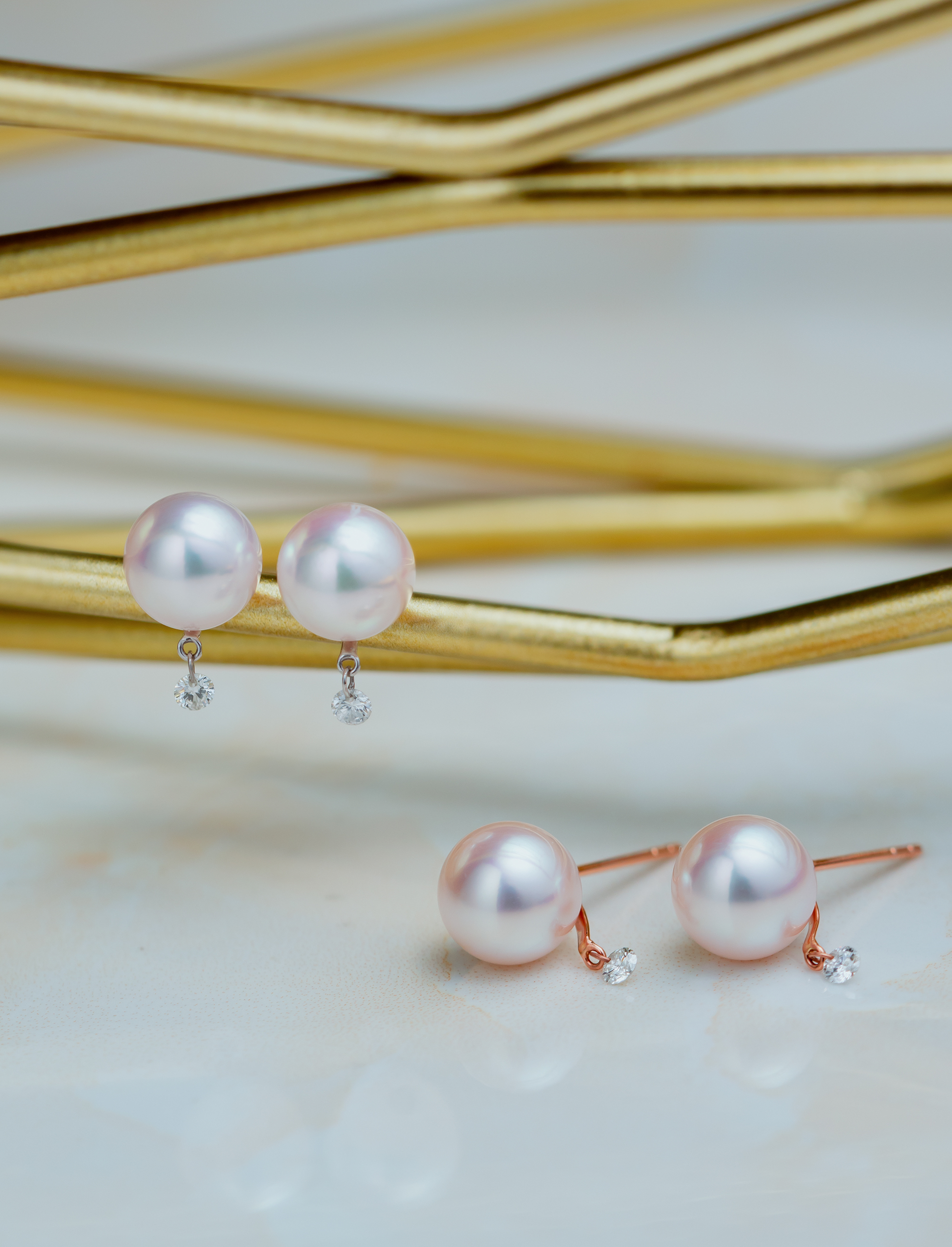 With super bright pearlescent, multiple colors are involved in this pair of Akoya pearls. By adding the trending dancing diamond design, what you truly see is the sophistication of jewel craftsmanship.