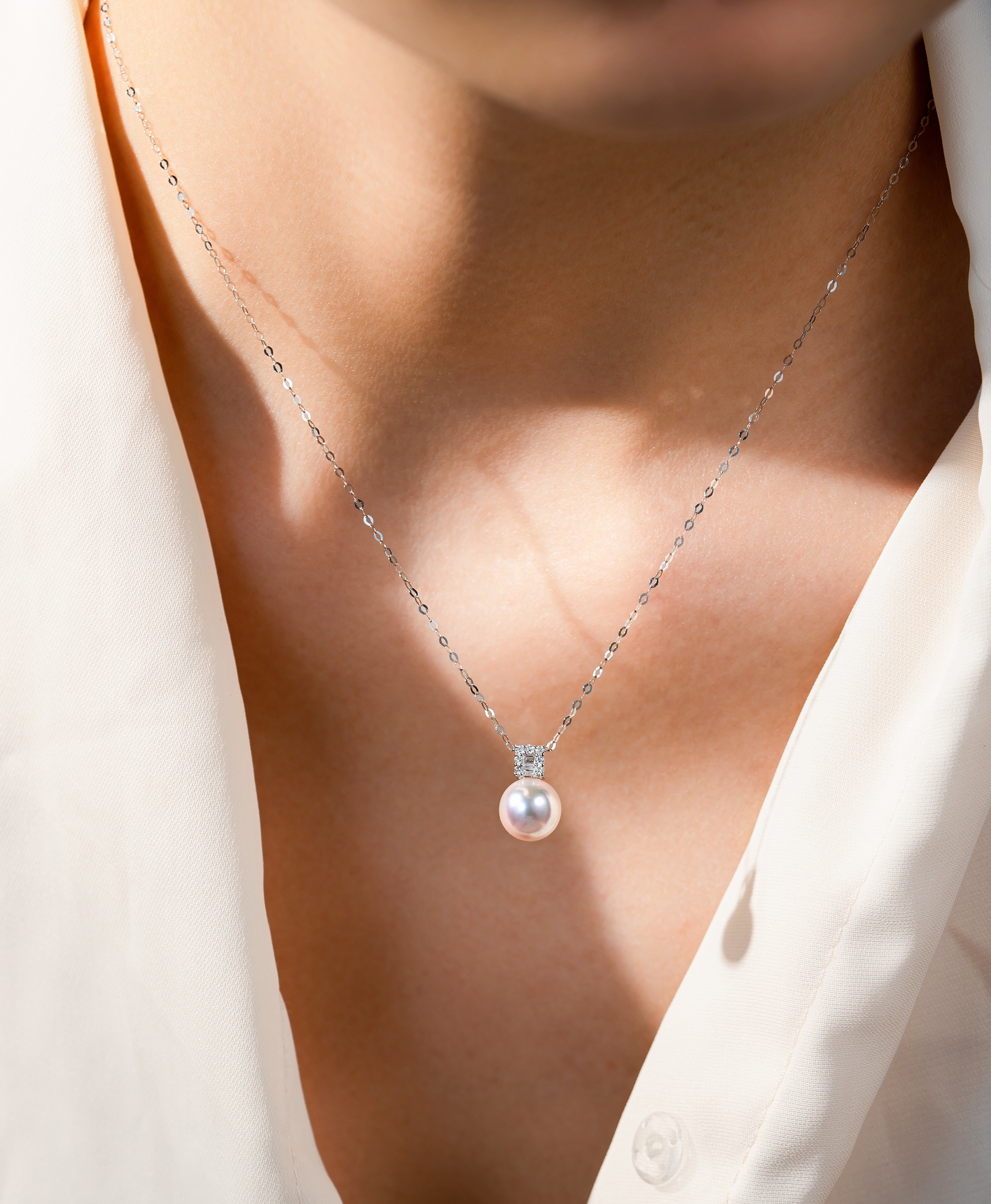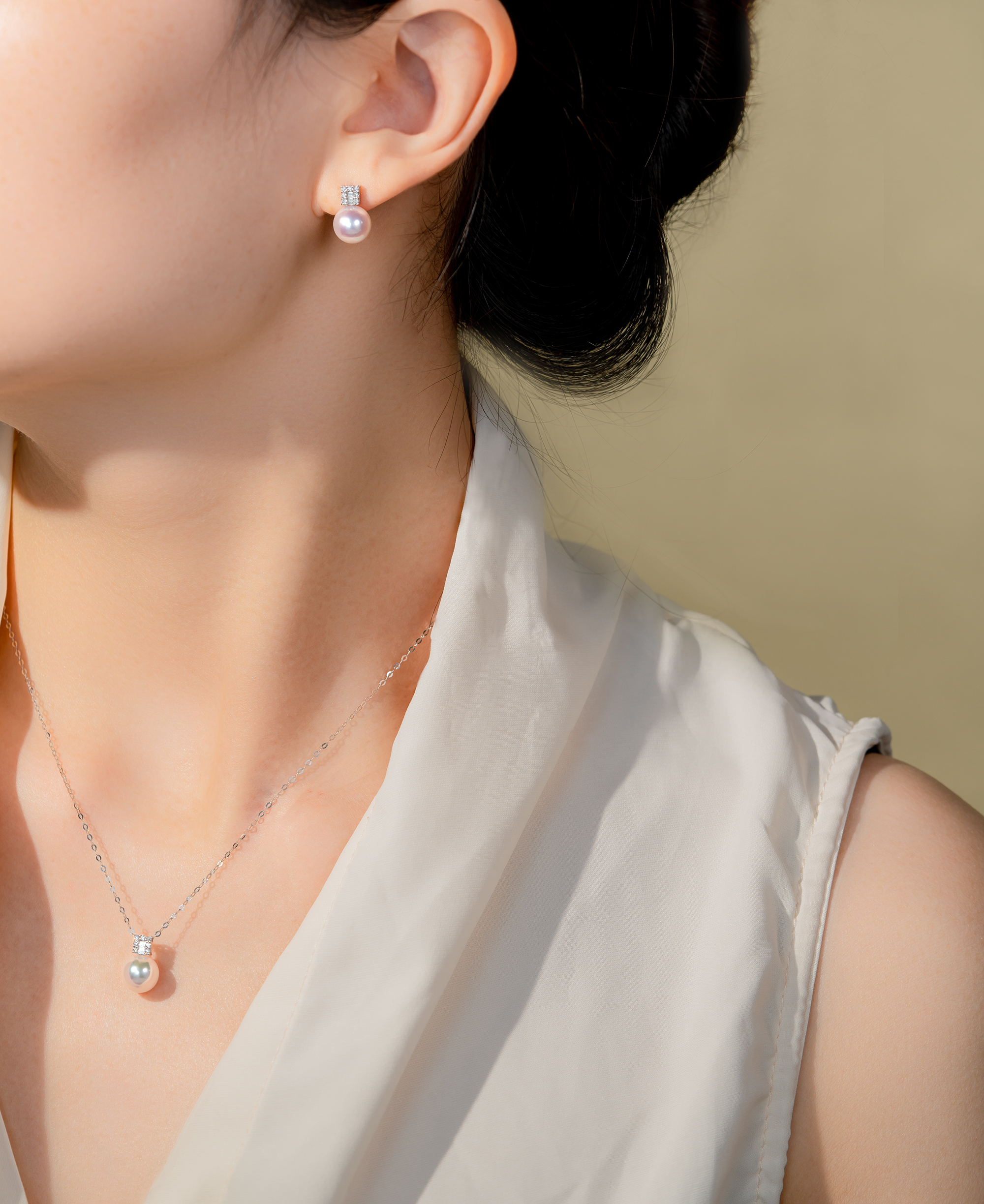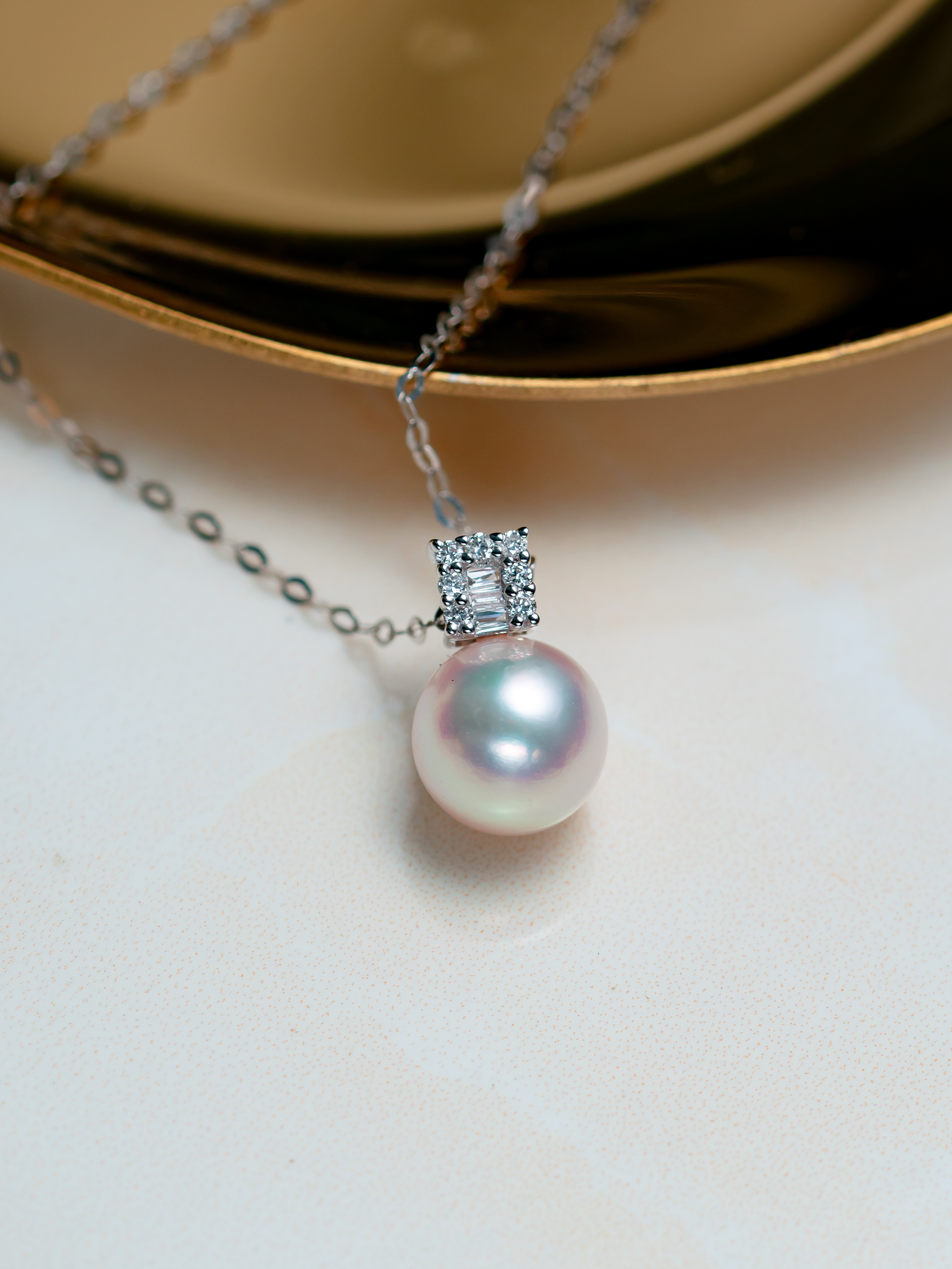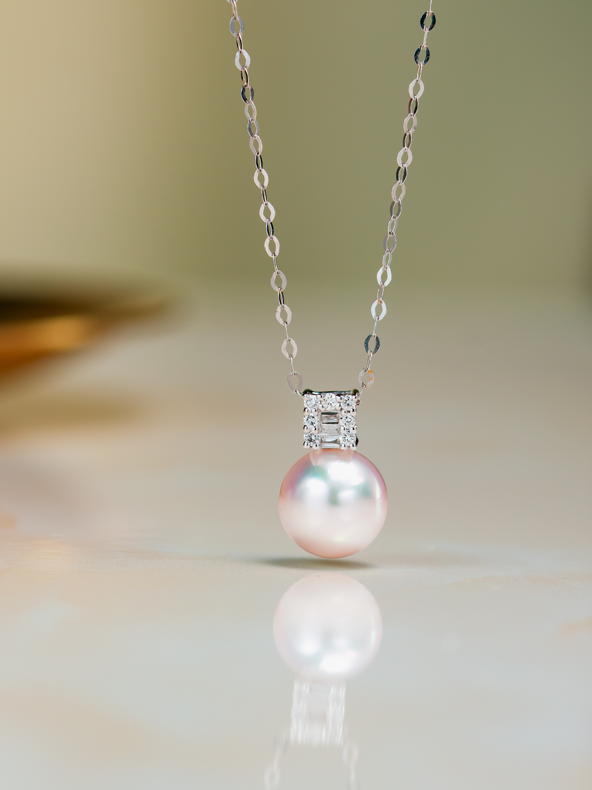 The rectangular 18K white gold is fully set with different cuts - baguette & round, of diminutive diamonds. Pairing with perfect round and pinkish luster to give a dignified and elegant statement. A perfect go-to for any formal occasions.