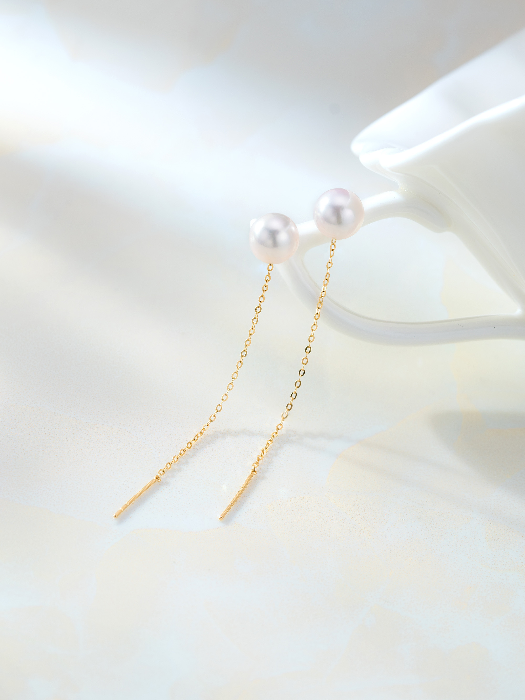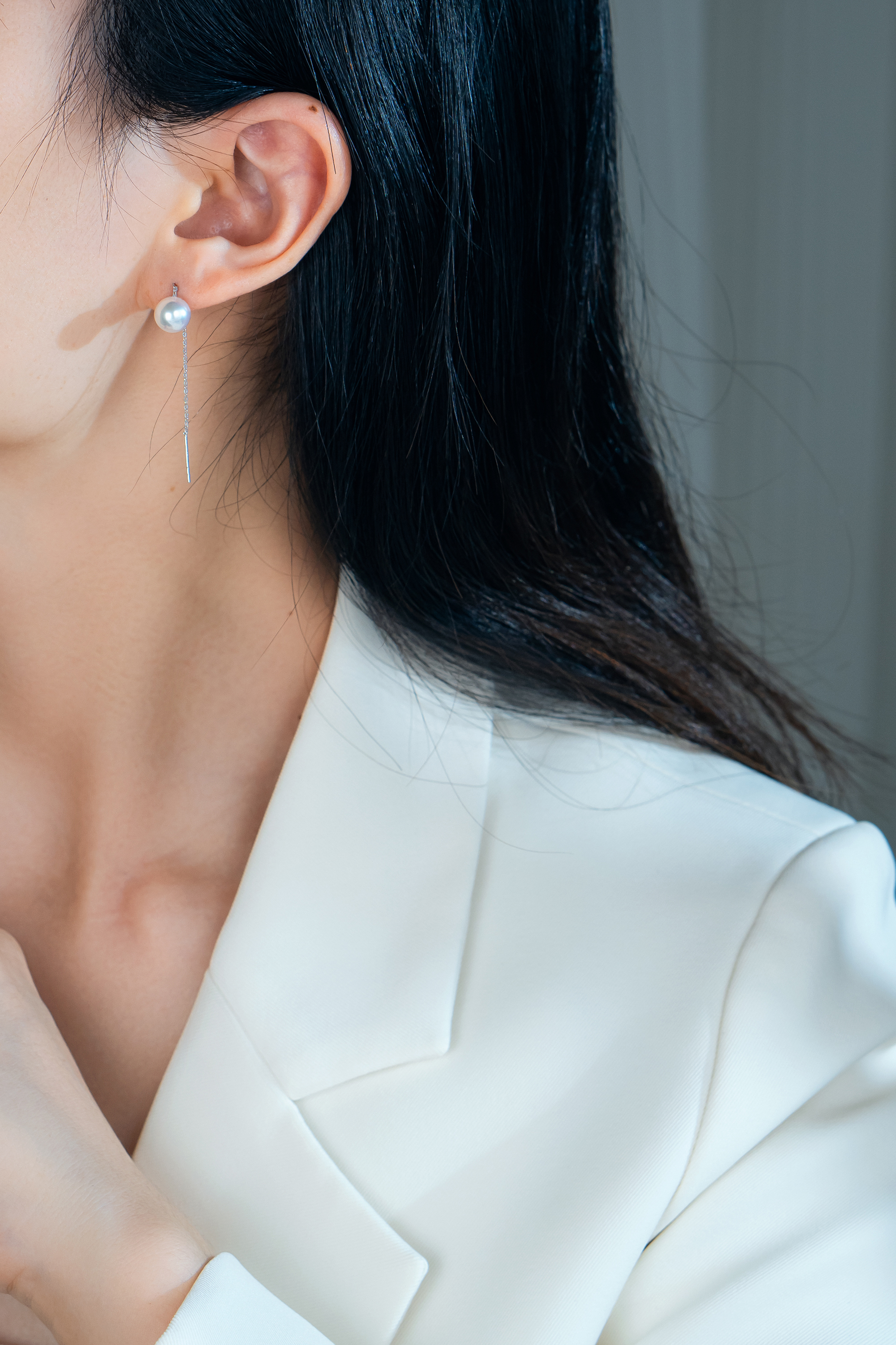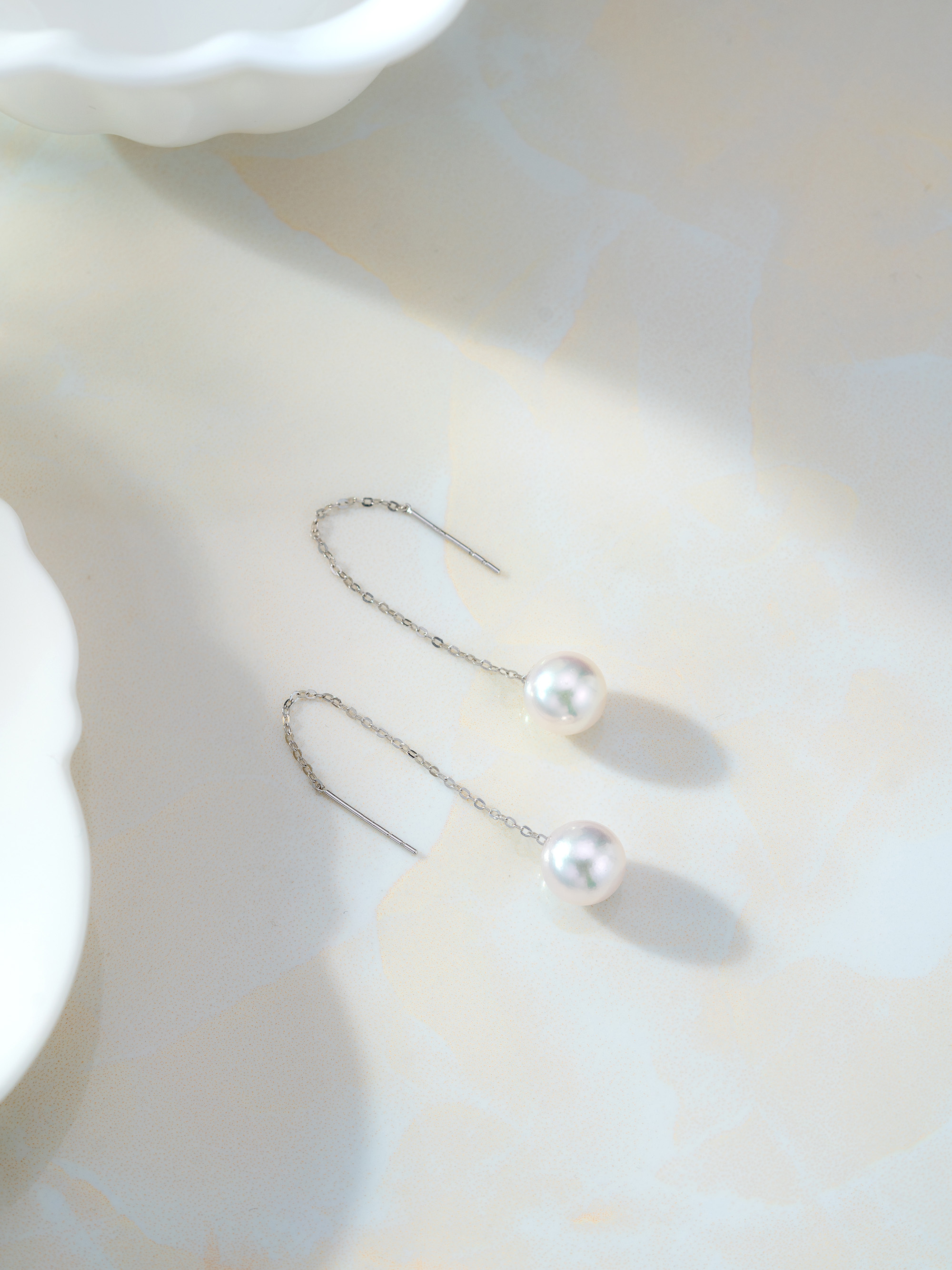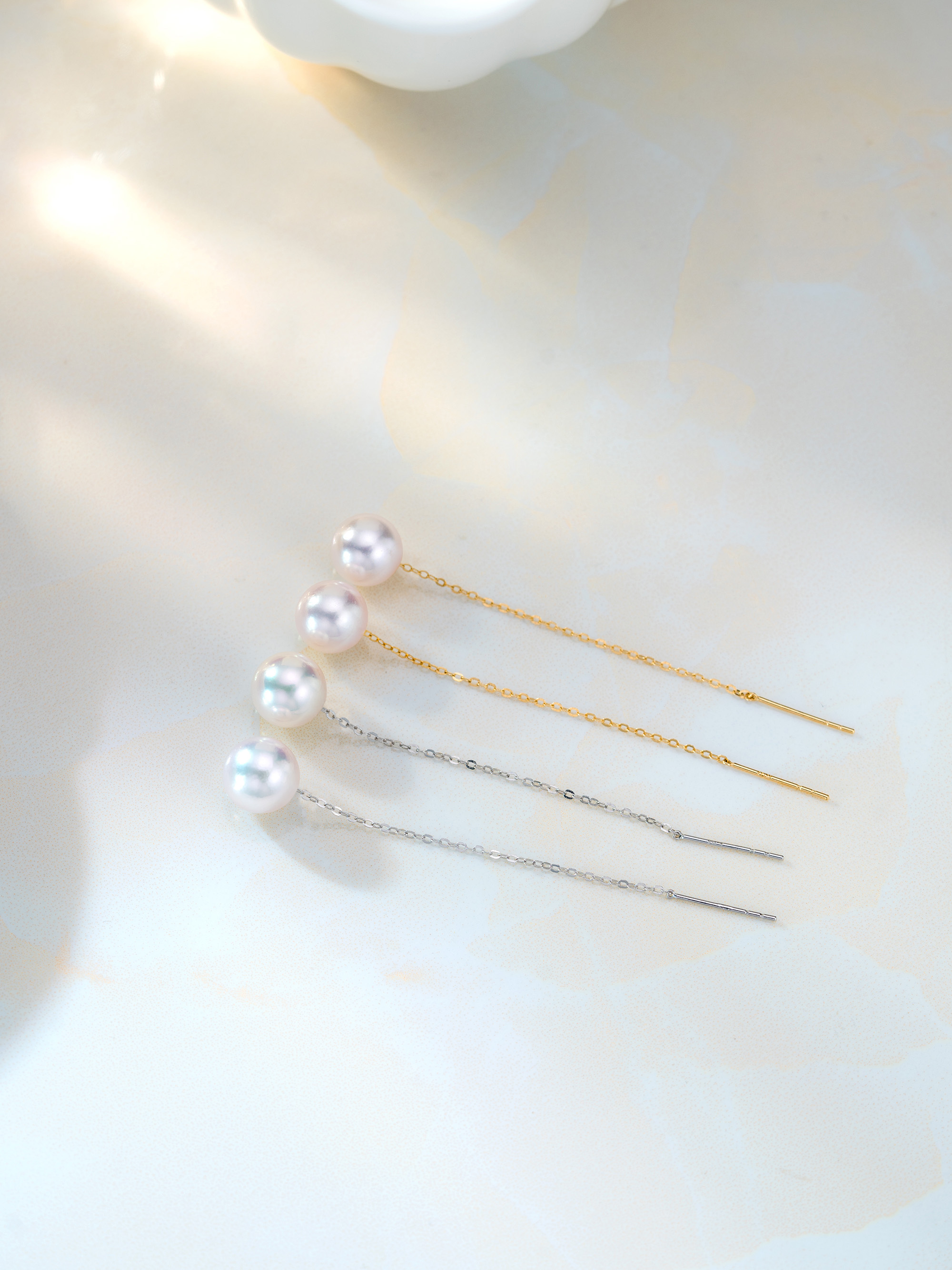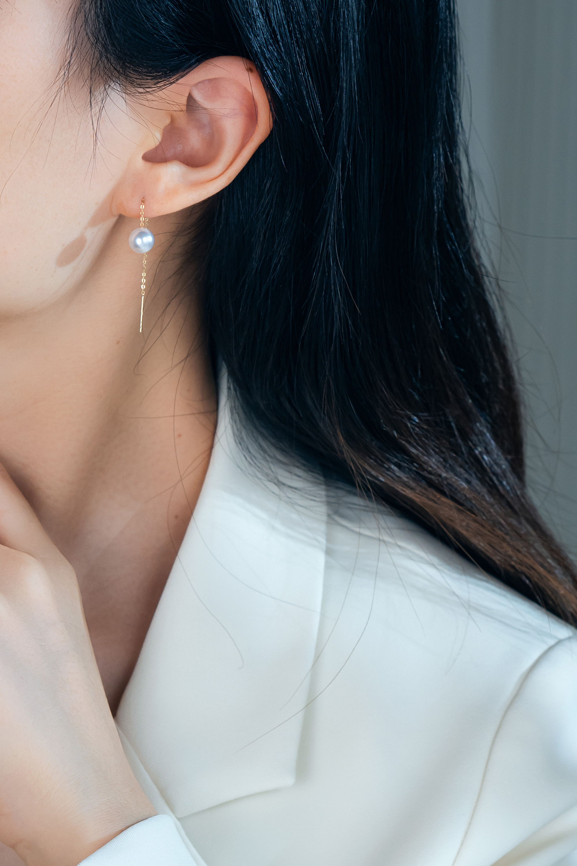 These 18K gold threader earrings with Akoya pearls feature a sleek design, effortlessly exuding sophistication. They are lightweight, elegant, and adjustable in length, making them a versatile and stylish addition to your jewelry collection.