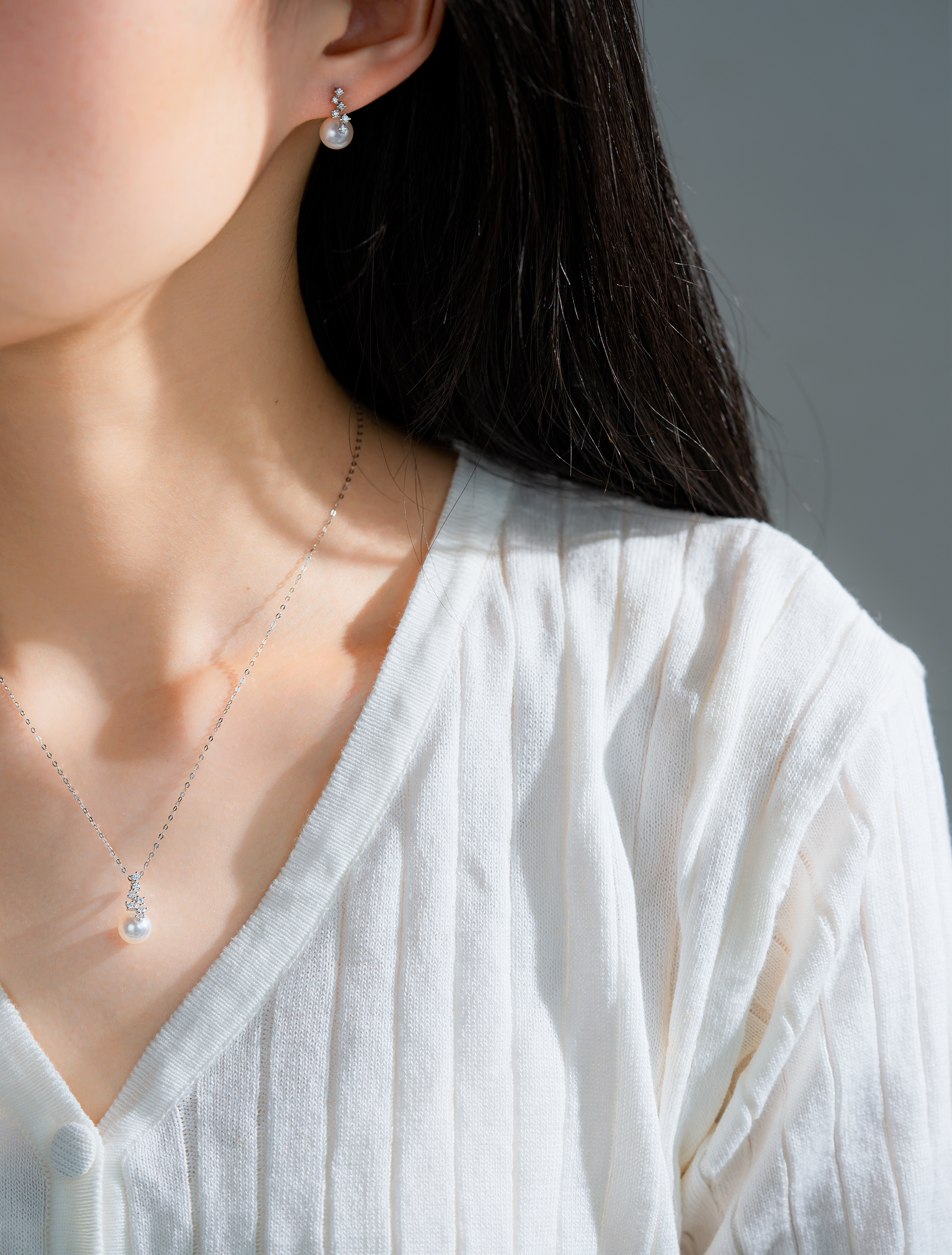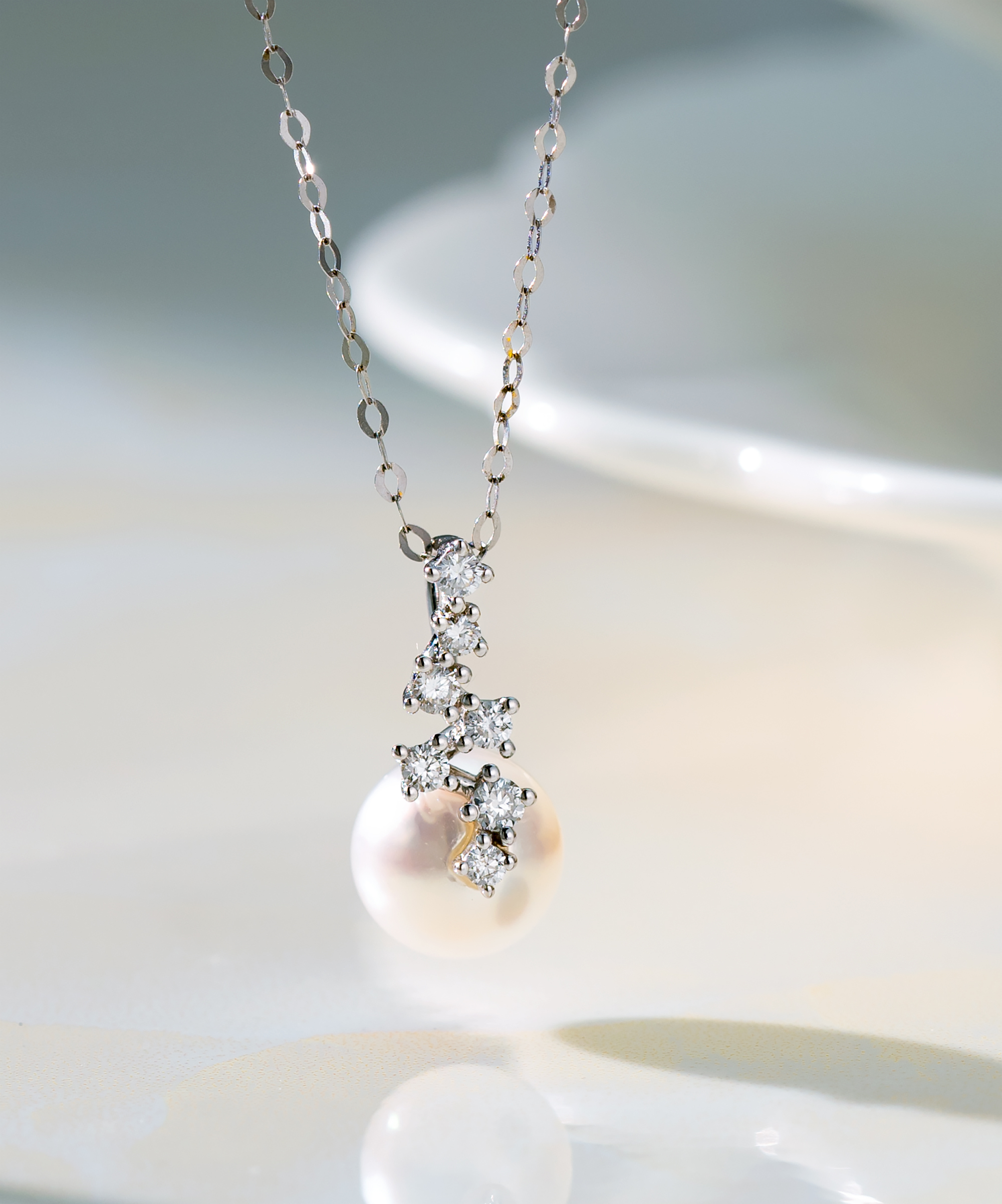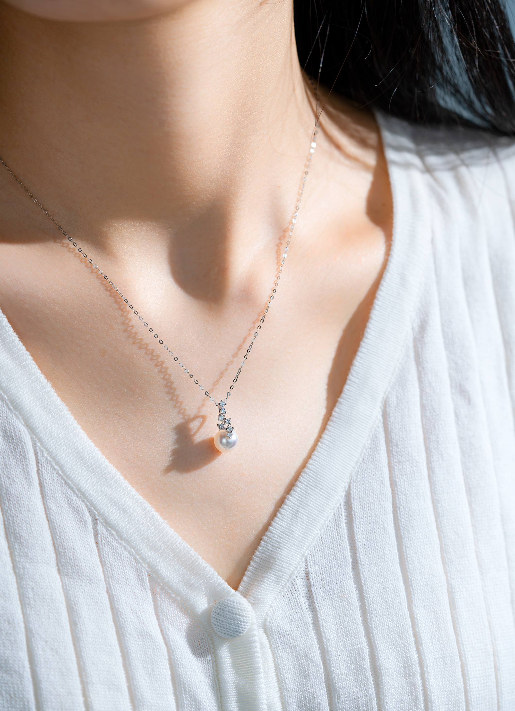 The shimmering diamonds and elegant Akoya pearls on the pendant create a celestial look, resembling shooting stars in the night sky. The way the stars smoothly glide on the Akoya Pearls adds a romantic touch, enhancing the pendant's charm and the wearer's allure.