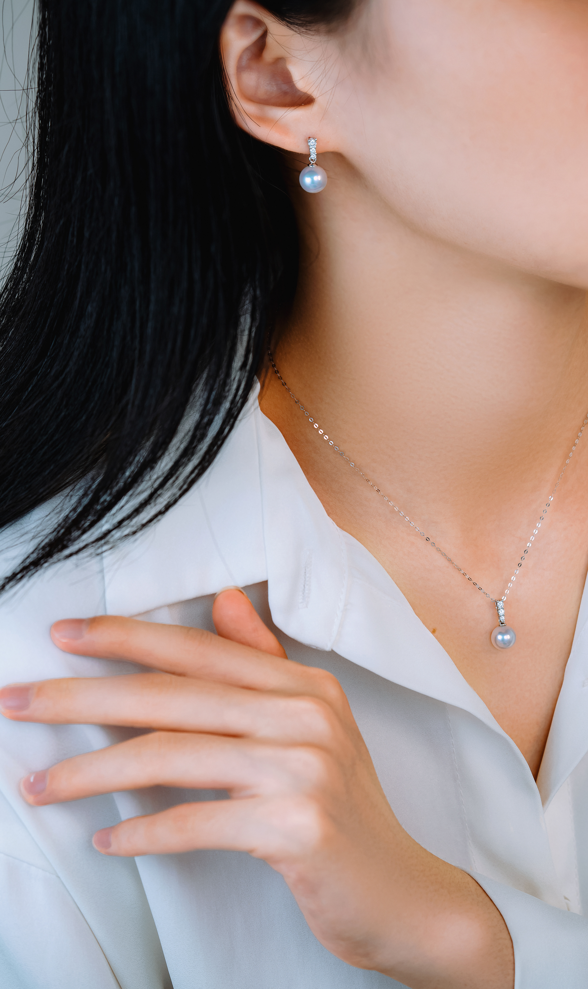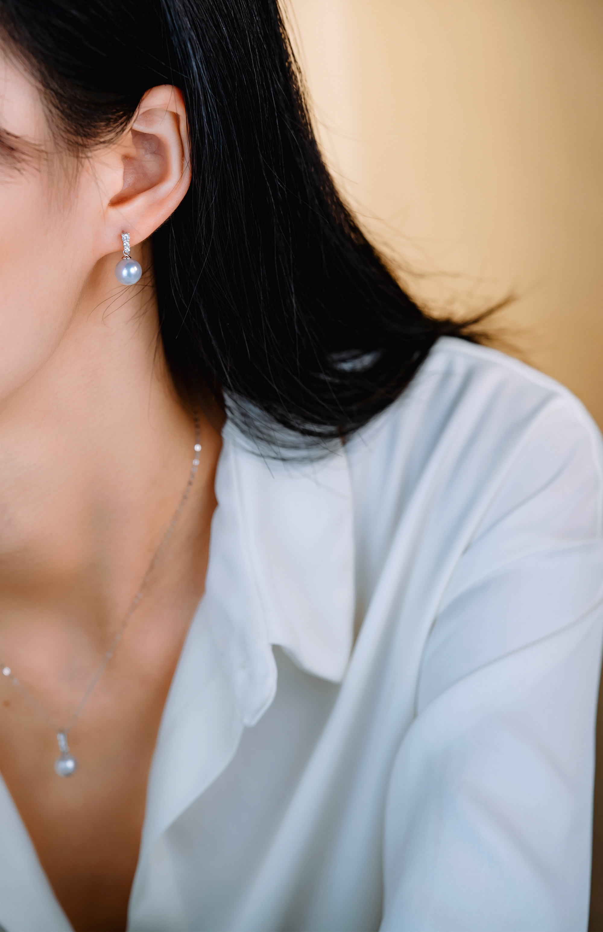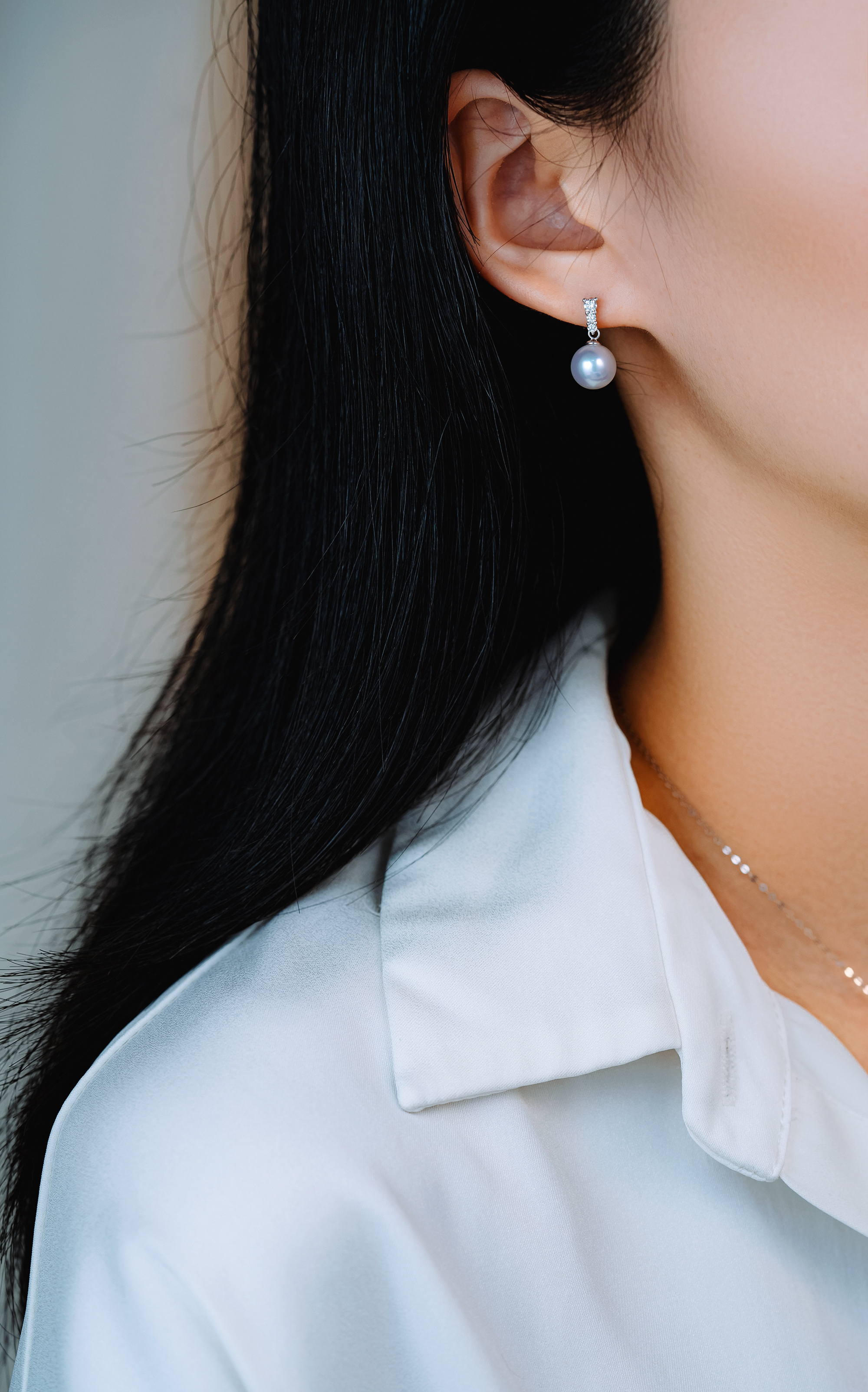 This pair of dangling silver-blue Akoya pearl earrings bring a sense of sophistication and elegance. Designed in 18K white gold with two peg-set Akoya pearls with colorful lustre, this pair of earrings is statement pieces. The diamond studded bar infuses elegancy to this pearl ball drop earrings.