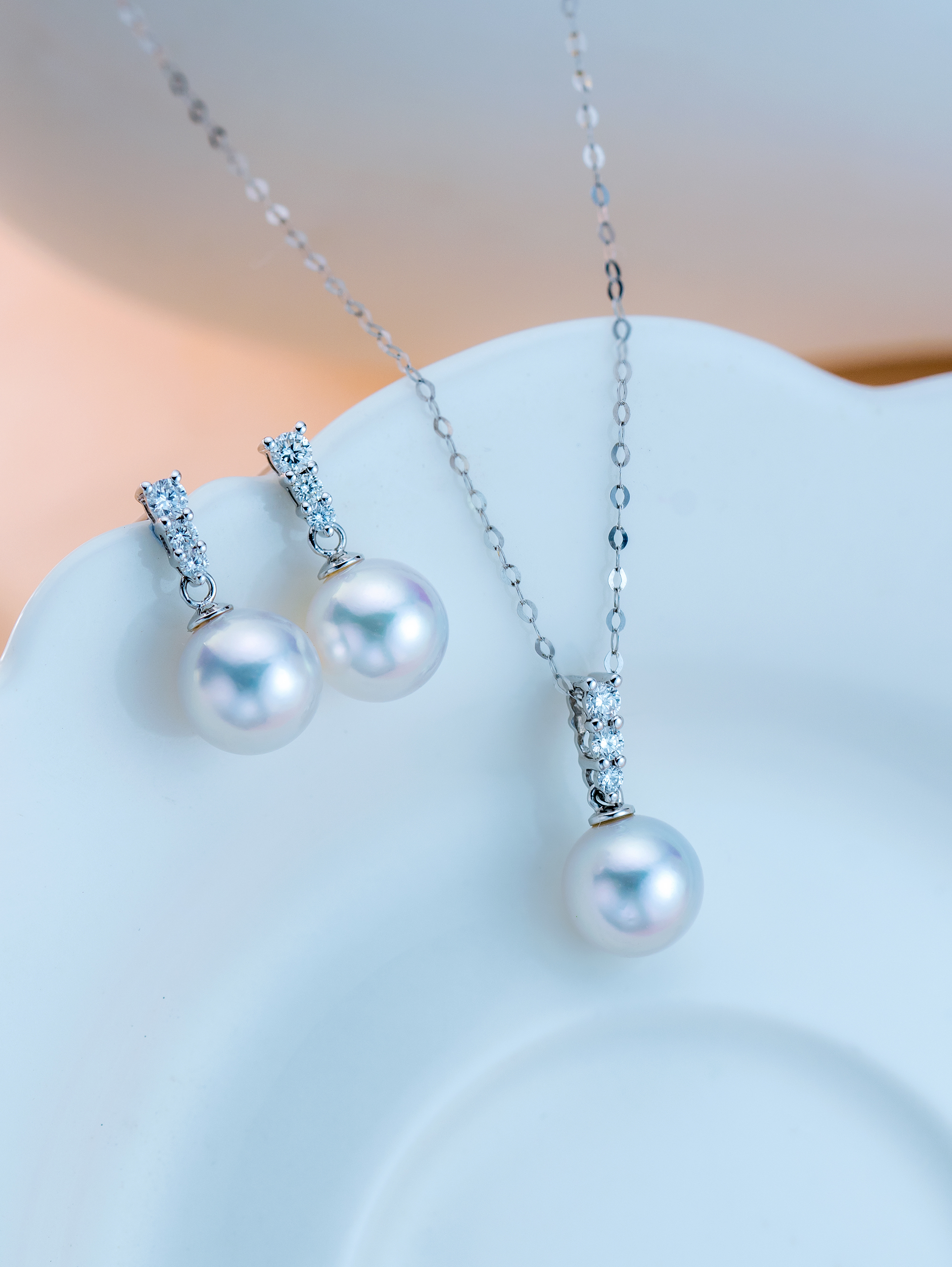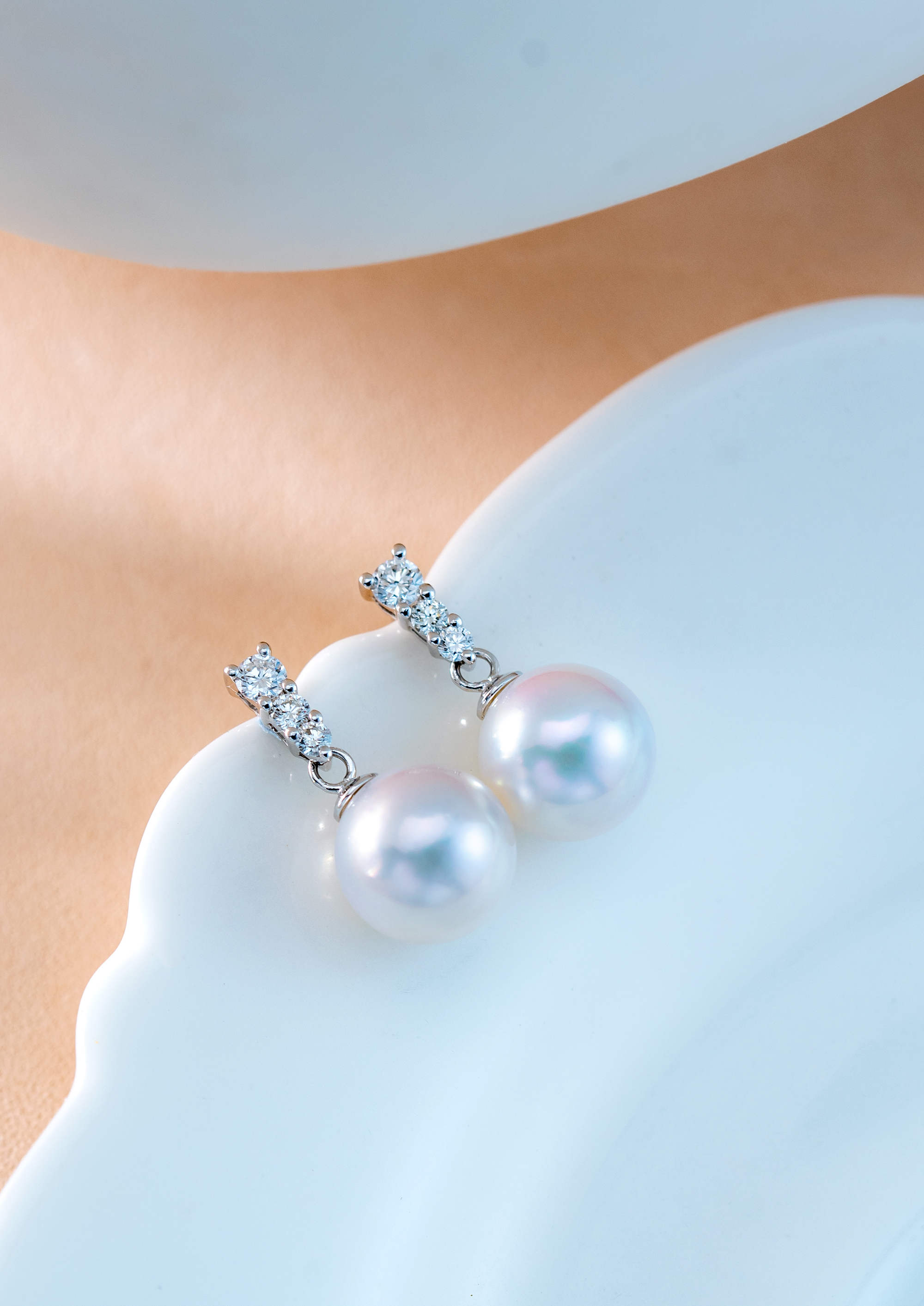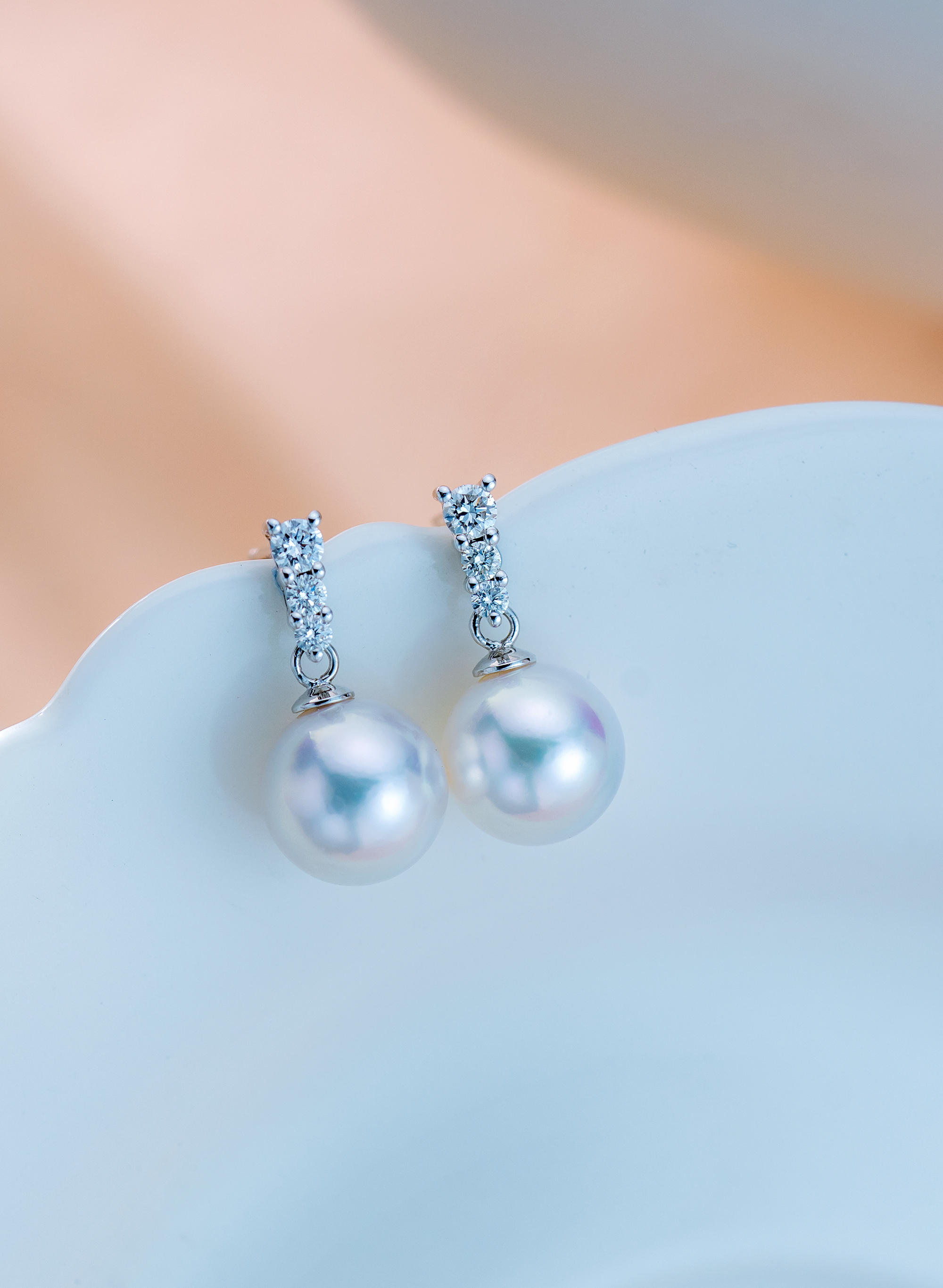This pair of dangling silver-blue Akoya pearl earrings bring a sense of sophistication and elegance. Designed in 18K white gold with two peg-set Akoya pearls with colorful lustre, this pair of earrings is statement pieces. The diamond studded bar infuses elegancy to this pearl ball drop earrings.