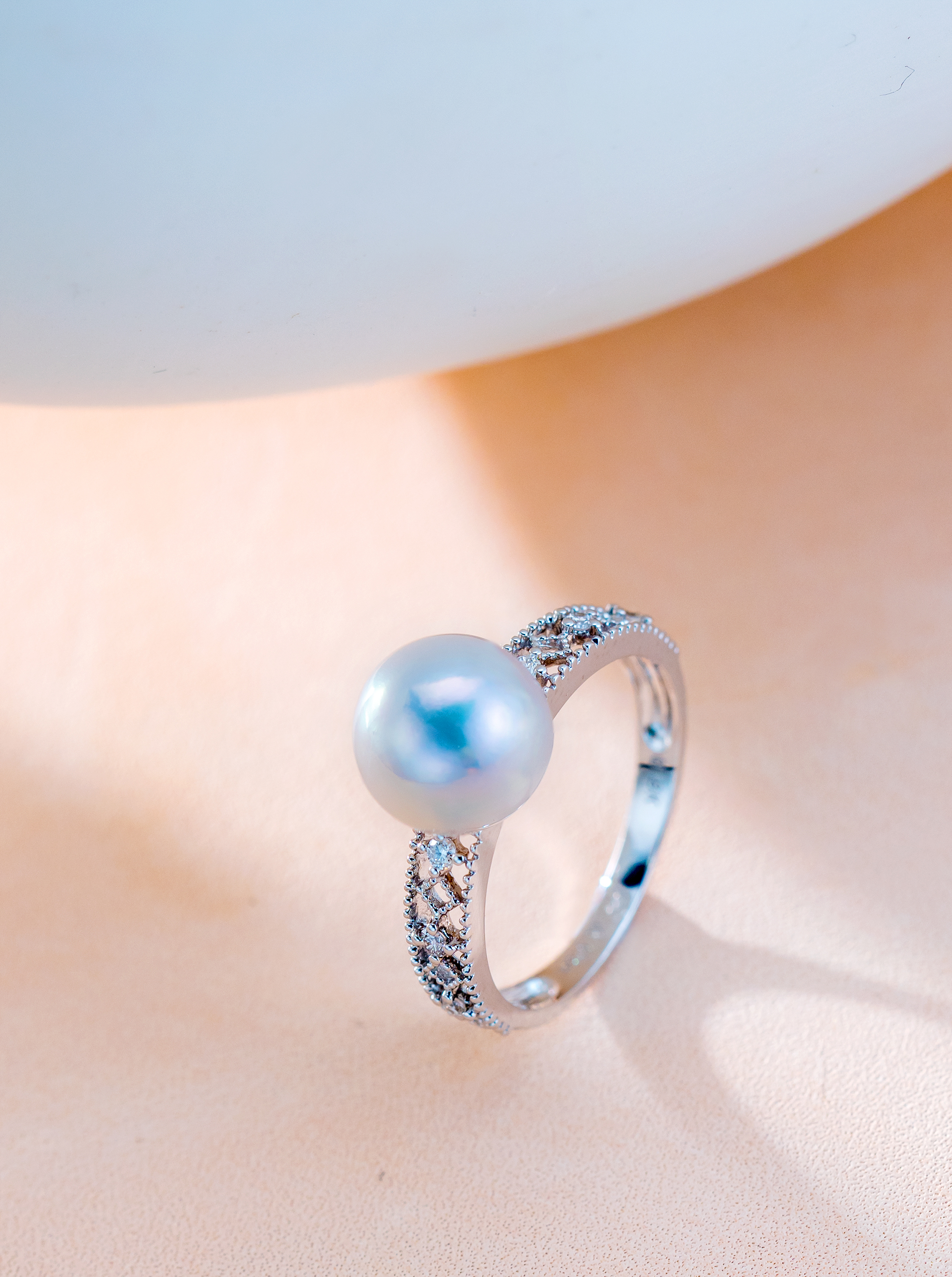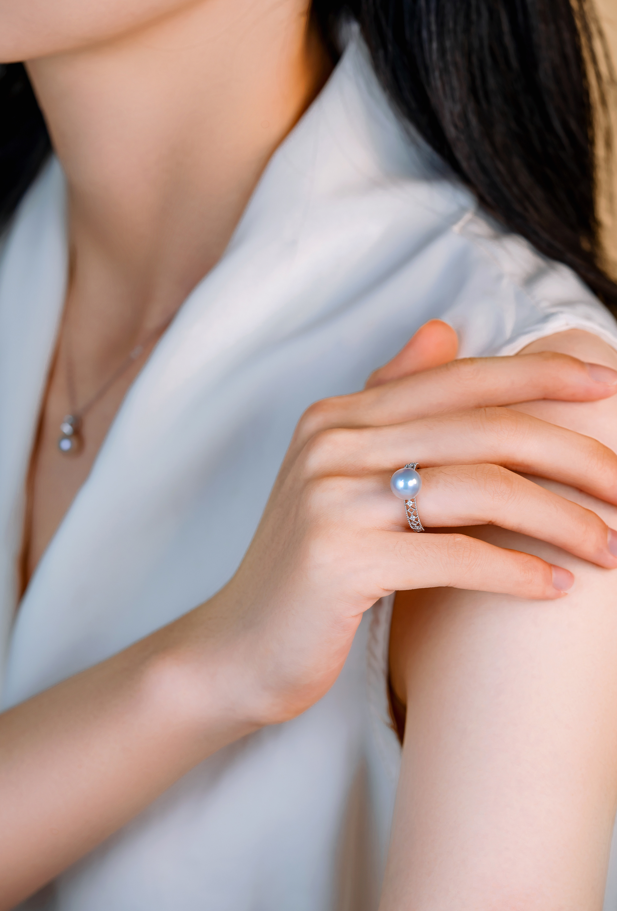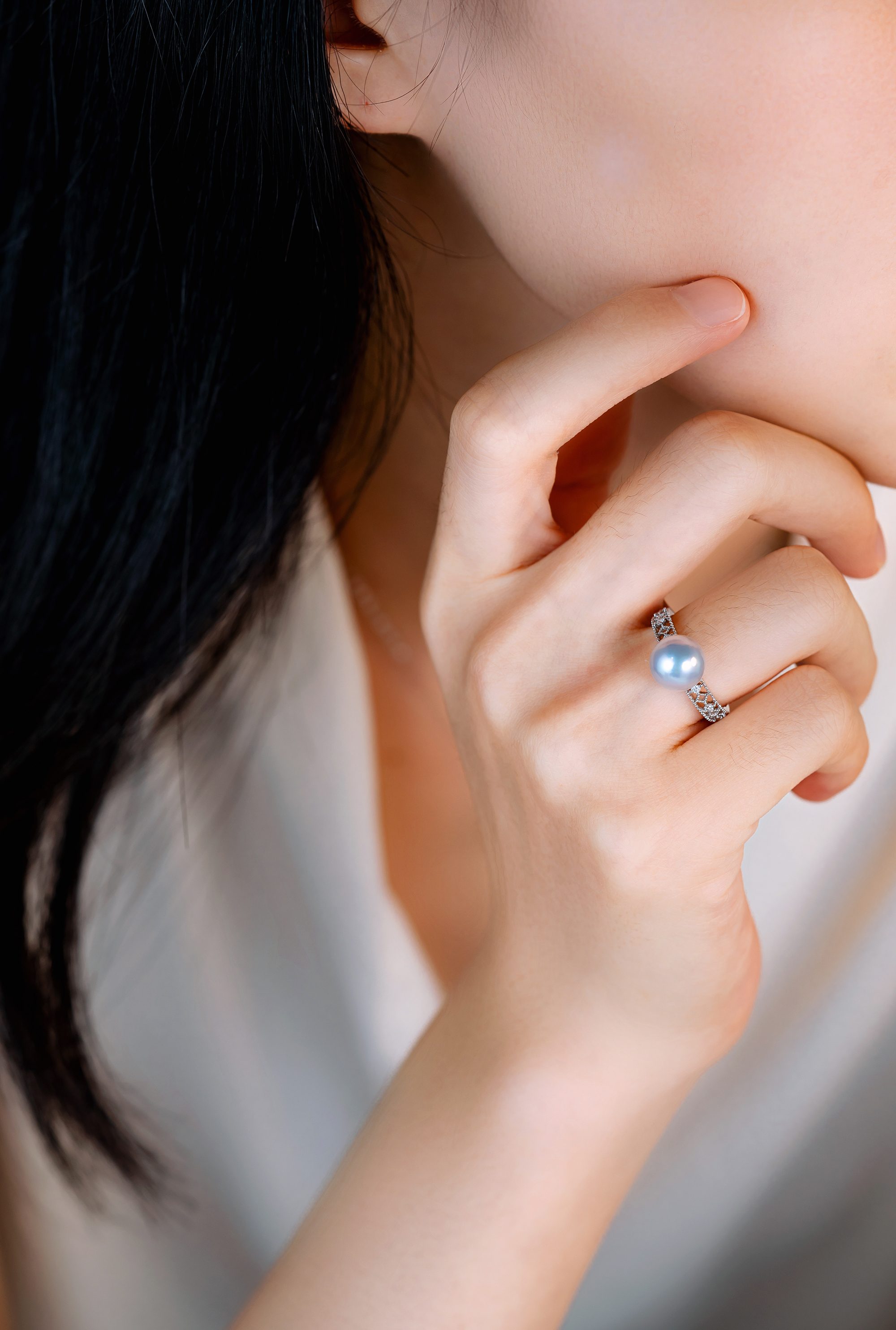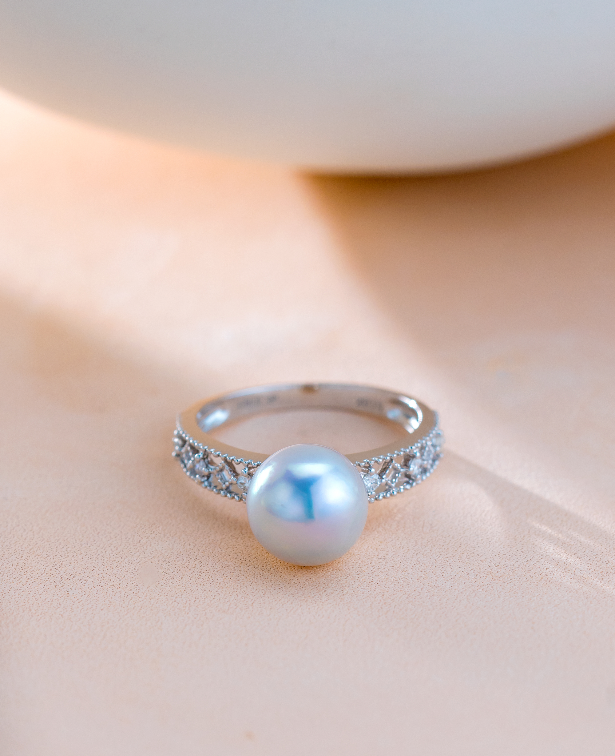 One of the bestselling ring in Olina Pearl!! Inspired by “Broderie Anglaise lace”, with diamonds adorned on the ring and suspending a rare 8.5-9mm silver-blue Akoya pearl. This ring can further highlights the elegant charm of women.