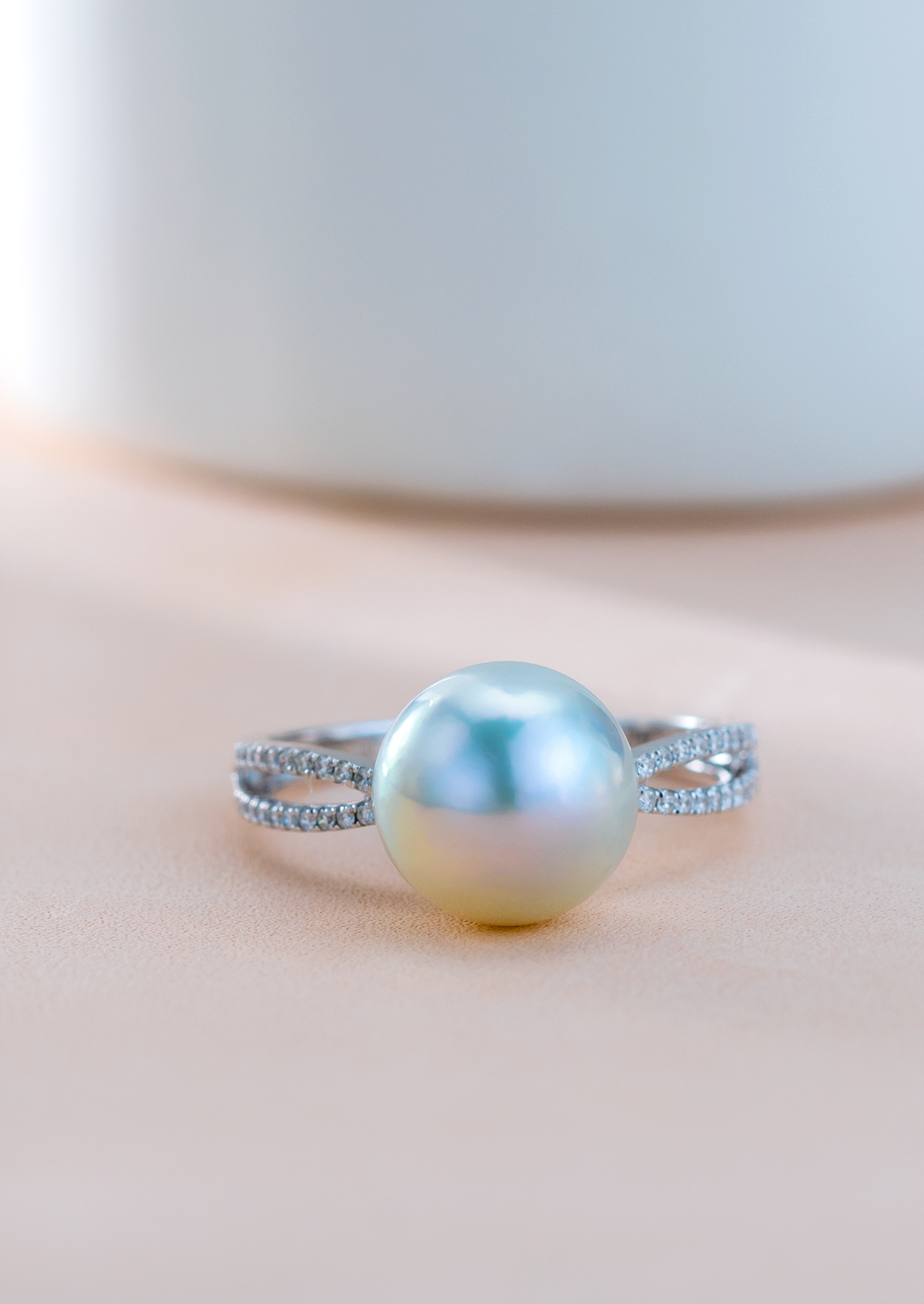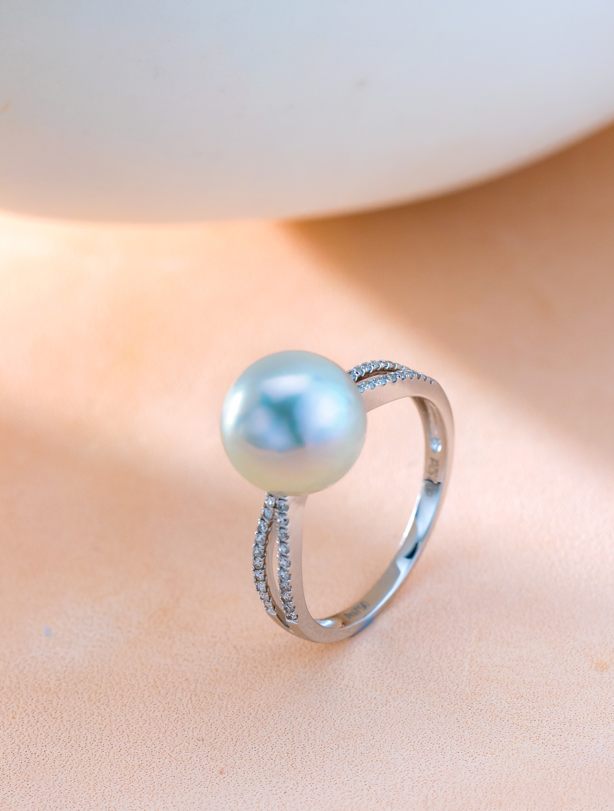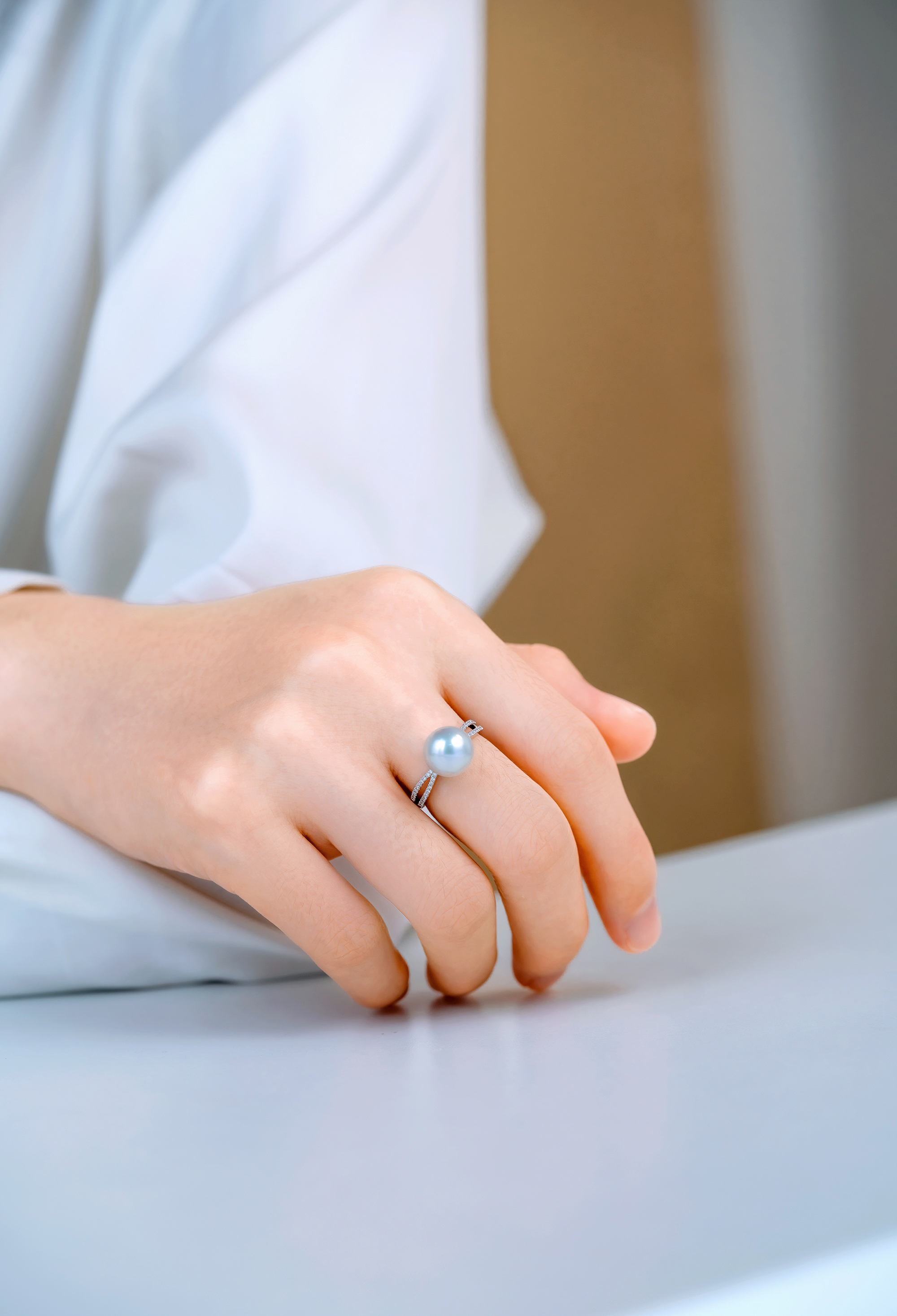 This exquisite ring features a dazzling silver-blue Akoya pearl at its center, surrounded by shimmering diamonds on both sides. The double-layer design adds a unique touch and dimension to your fingers, making it a stylish statement piece for any occasion.