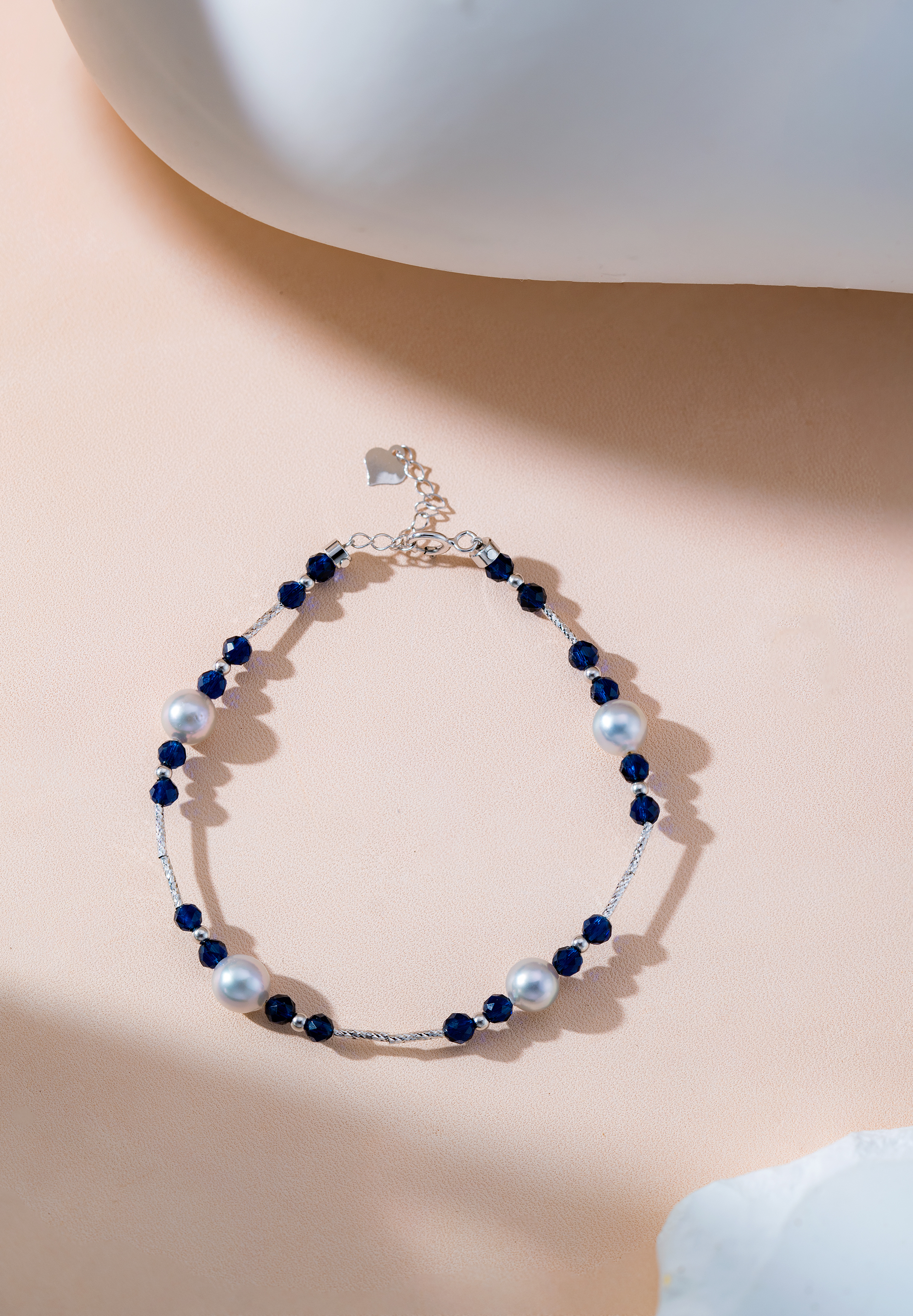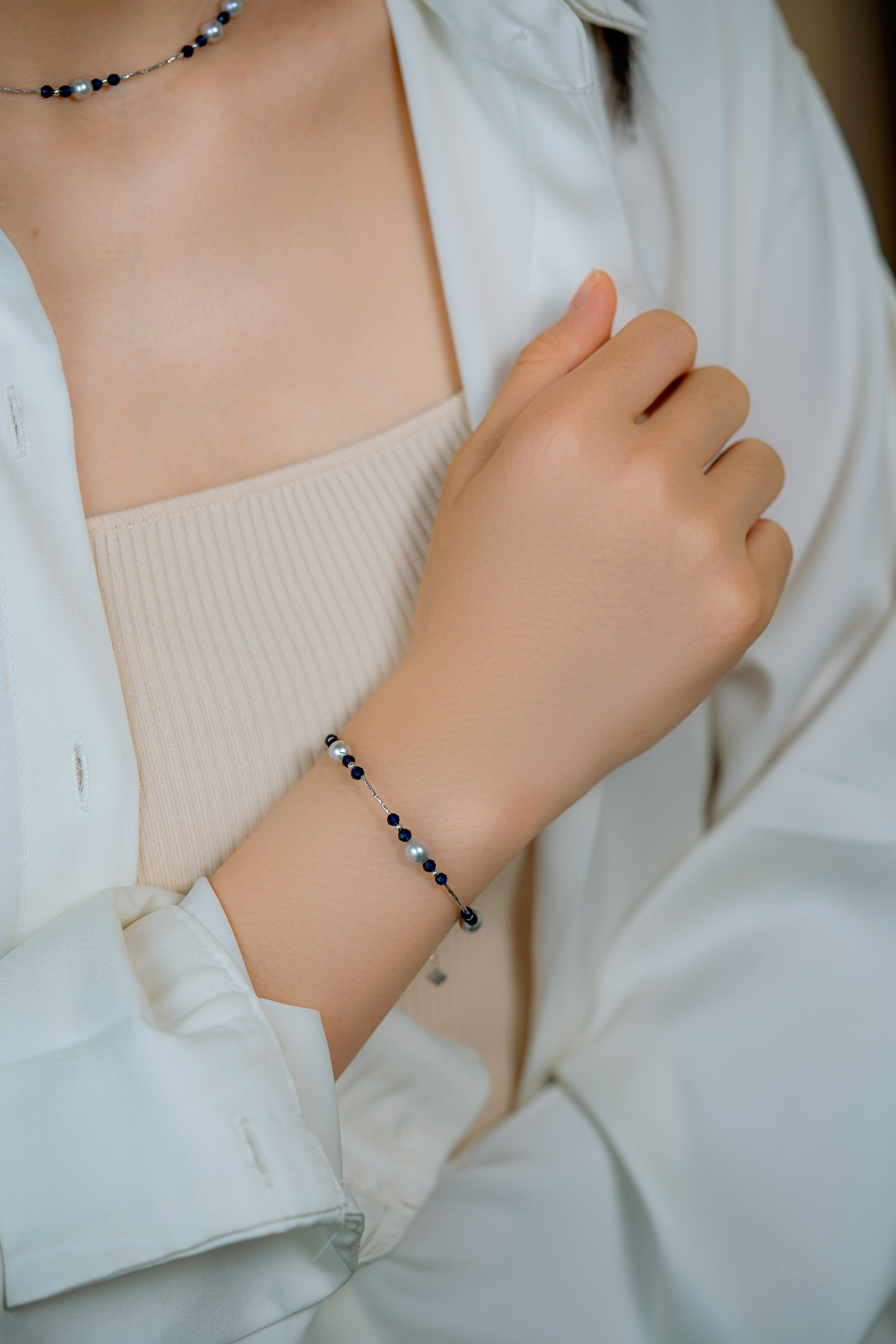 This bracelet features a captivating blend of silver-blue Akoya pearls and sapphires. The contrasting gems create a striking visual effect, with the sapphires' brilliant sparkle complementing the pearls' lustrous glow. Paired with the matching necklace, this set exudes a fashionable charm.