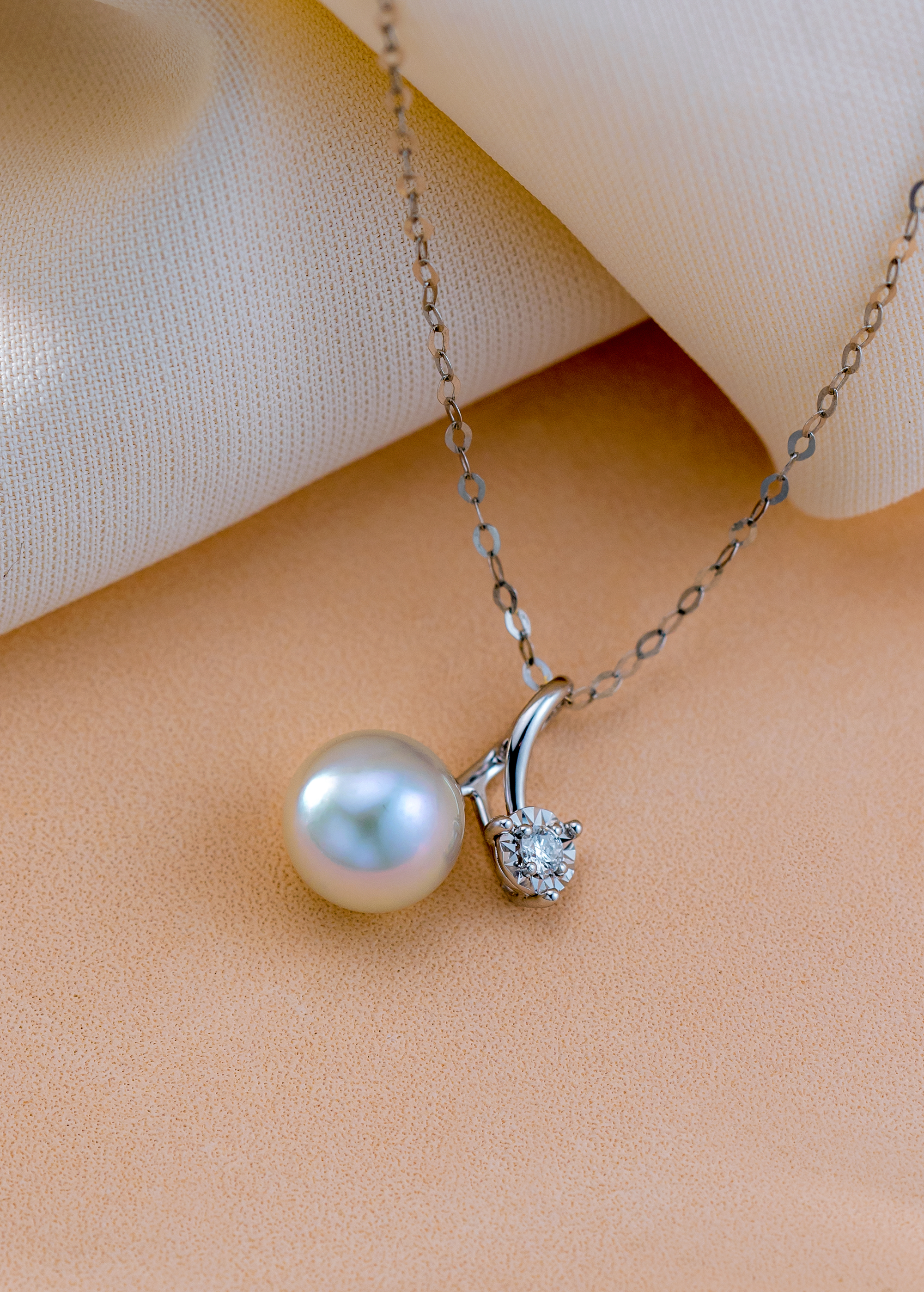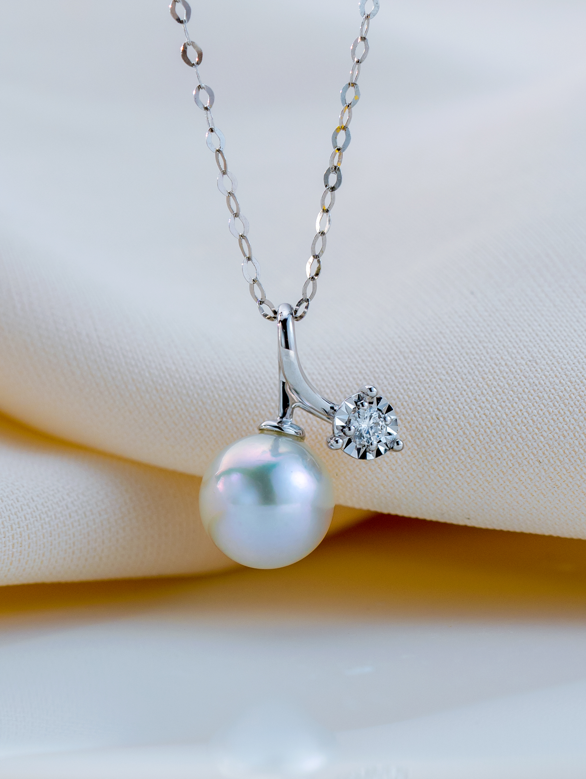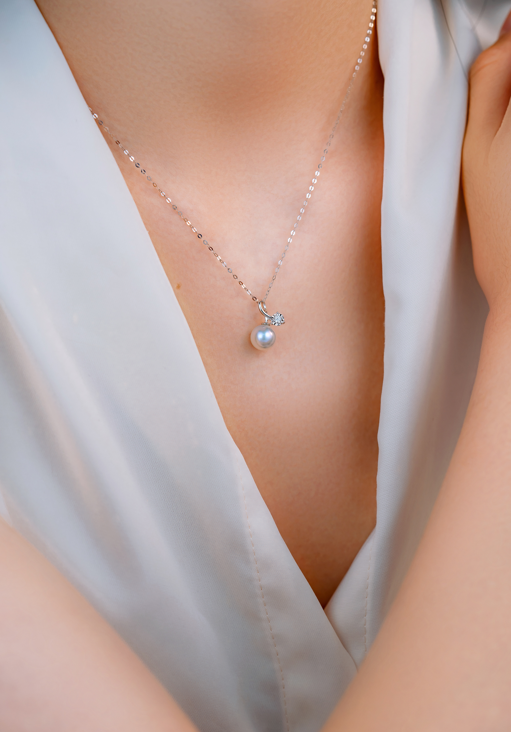 The highest quality 7.5-8mm silver blue Akoya pearl and a dazzling diamond are attached to both ends of the 18K gold irregular loop, resembling the footage and appearance of a shooting star. This pendant is designed to add a hint of elegance to your daily look.
