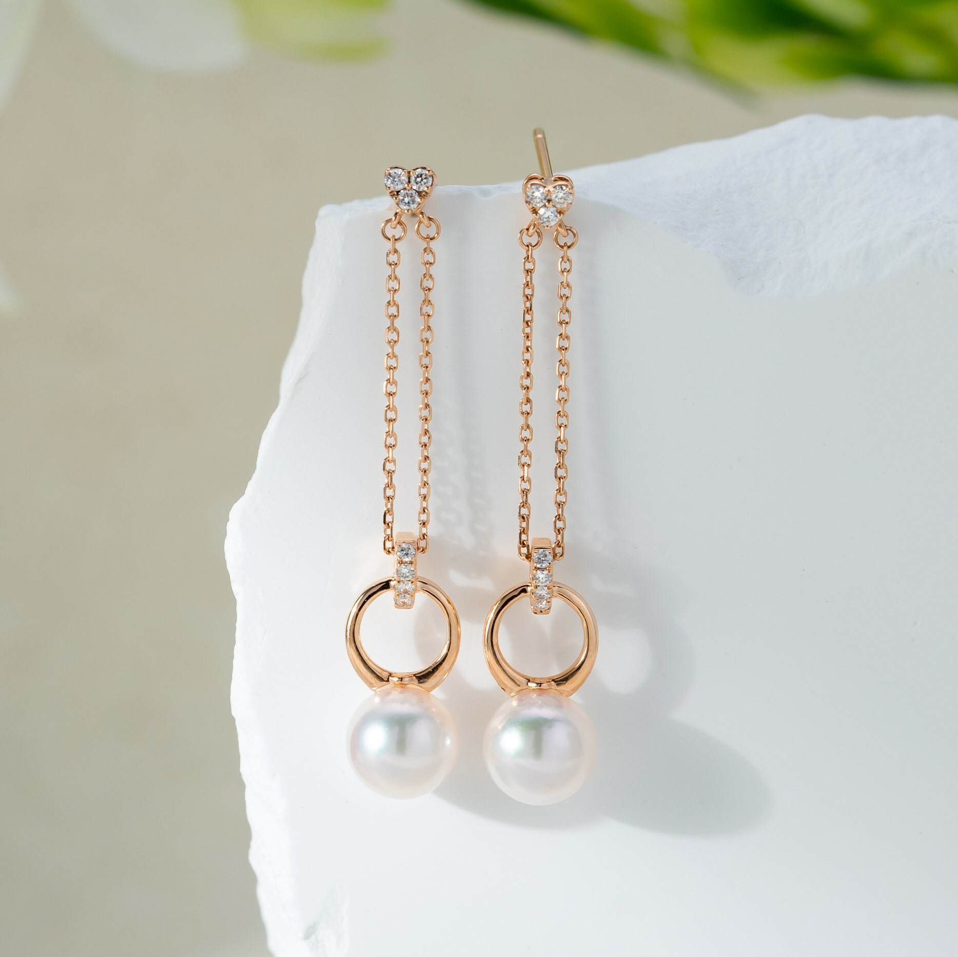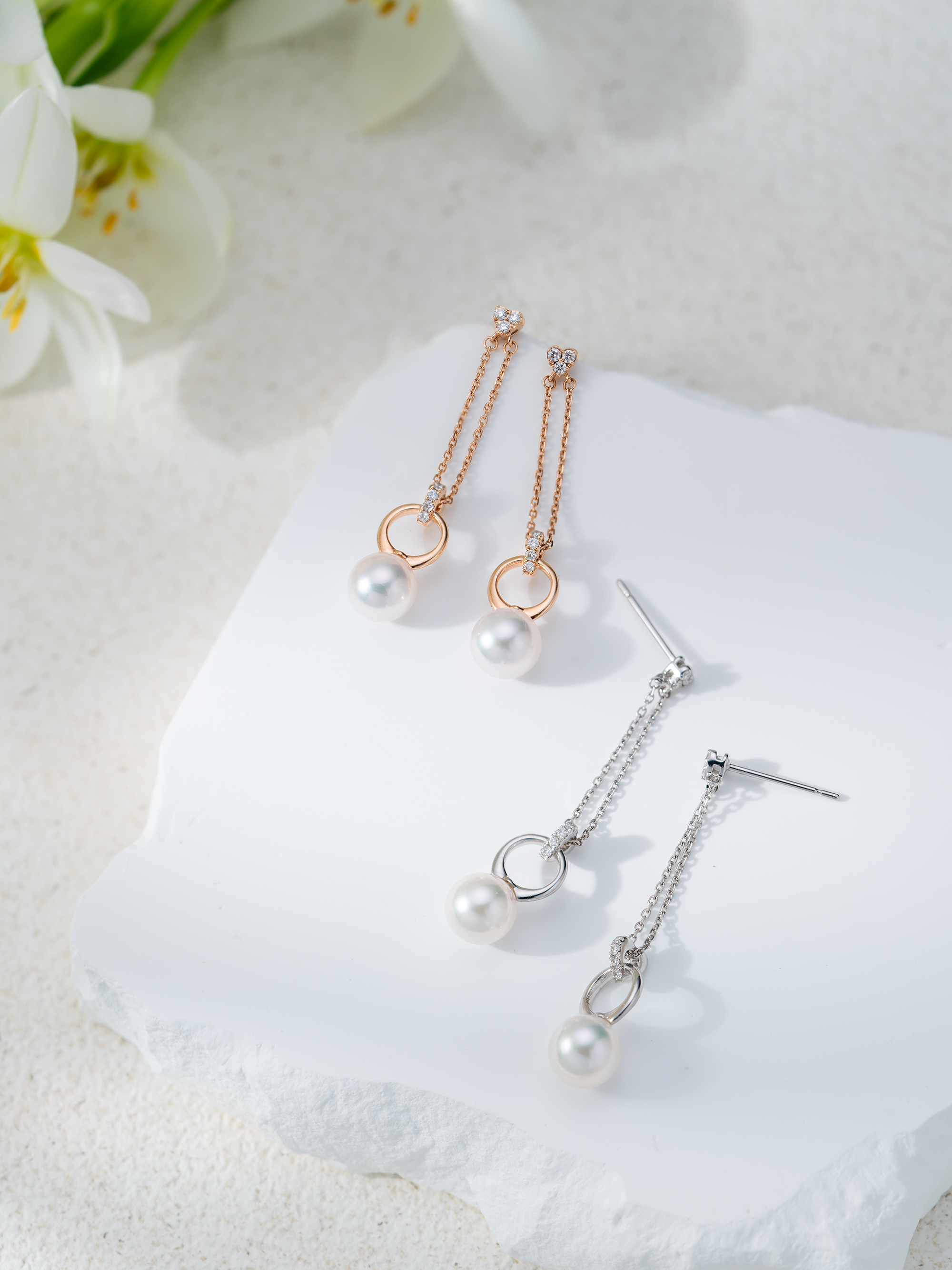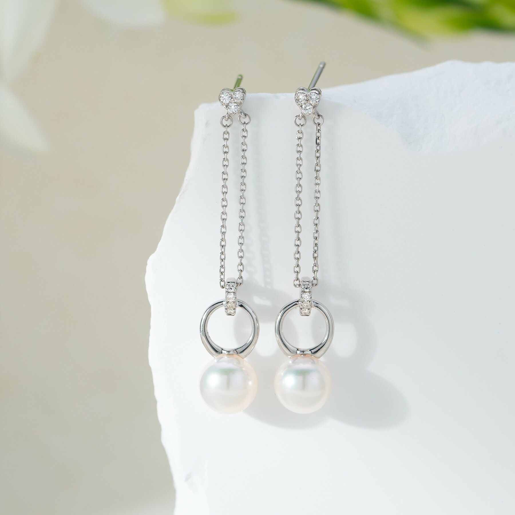 This long dangling earrings showcases a pure radiance and the natural beauty of Akoya pearls. The exquisite design of the 18K dual gold chain adds elegance to the earring. Perfect for daily wear or special occasions that will bring out your confident and captivating style.