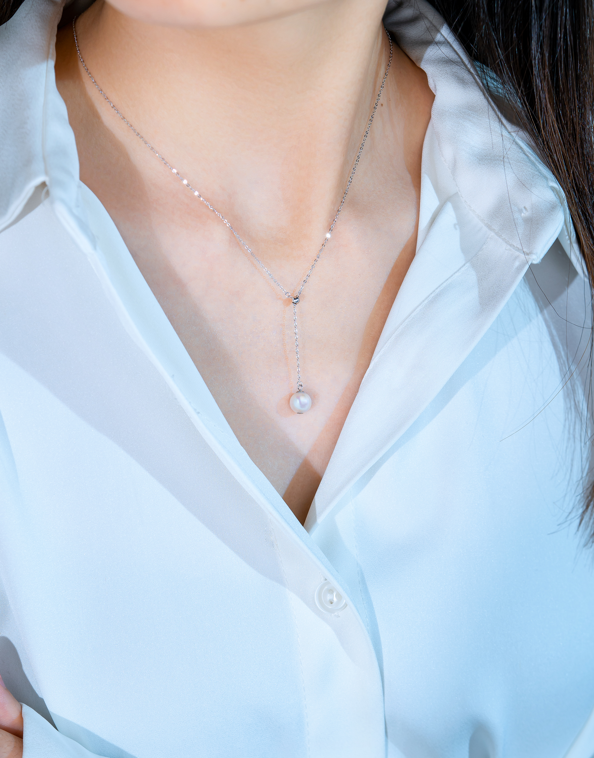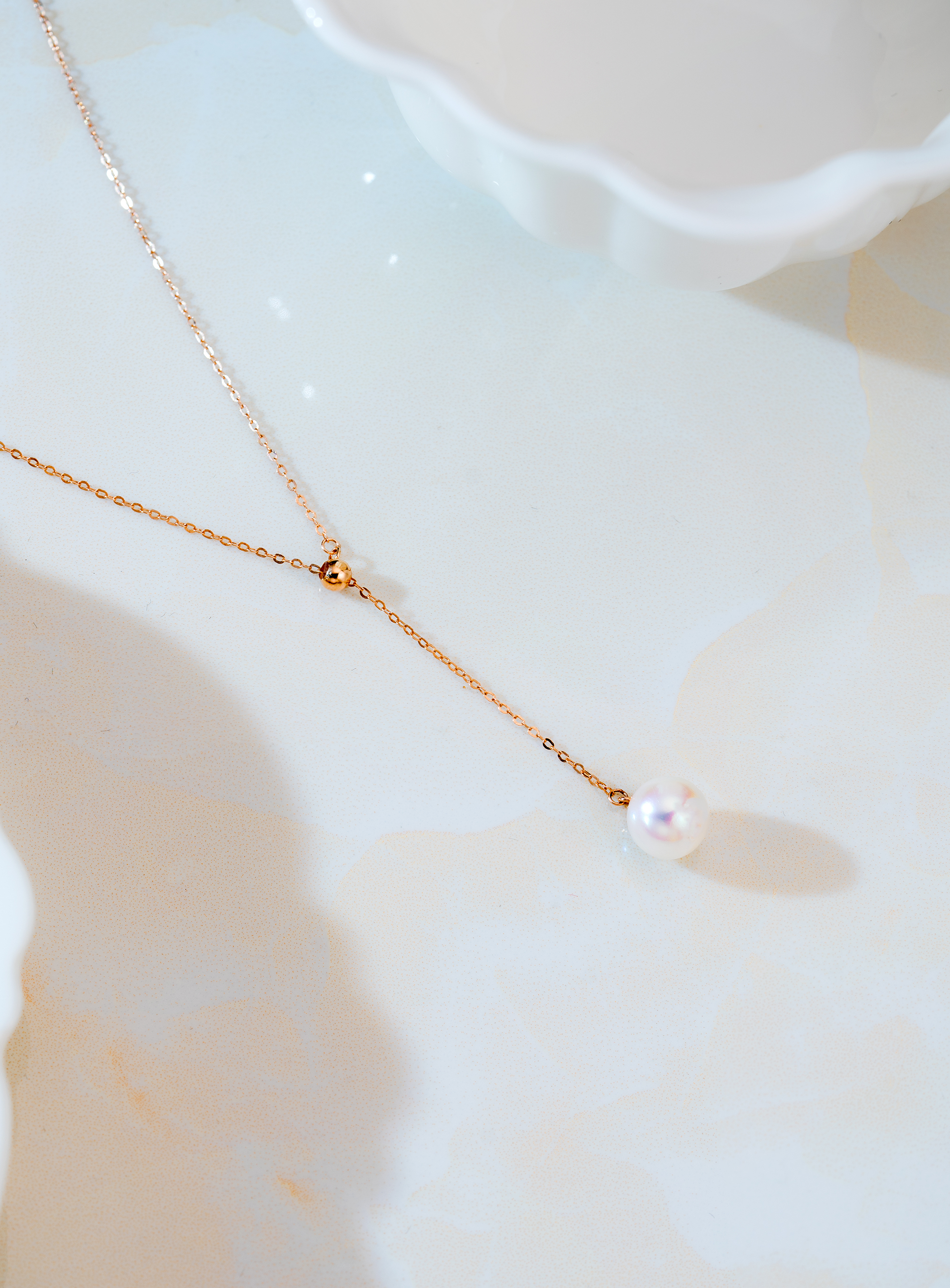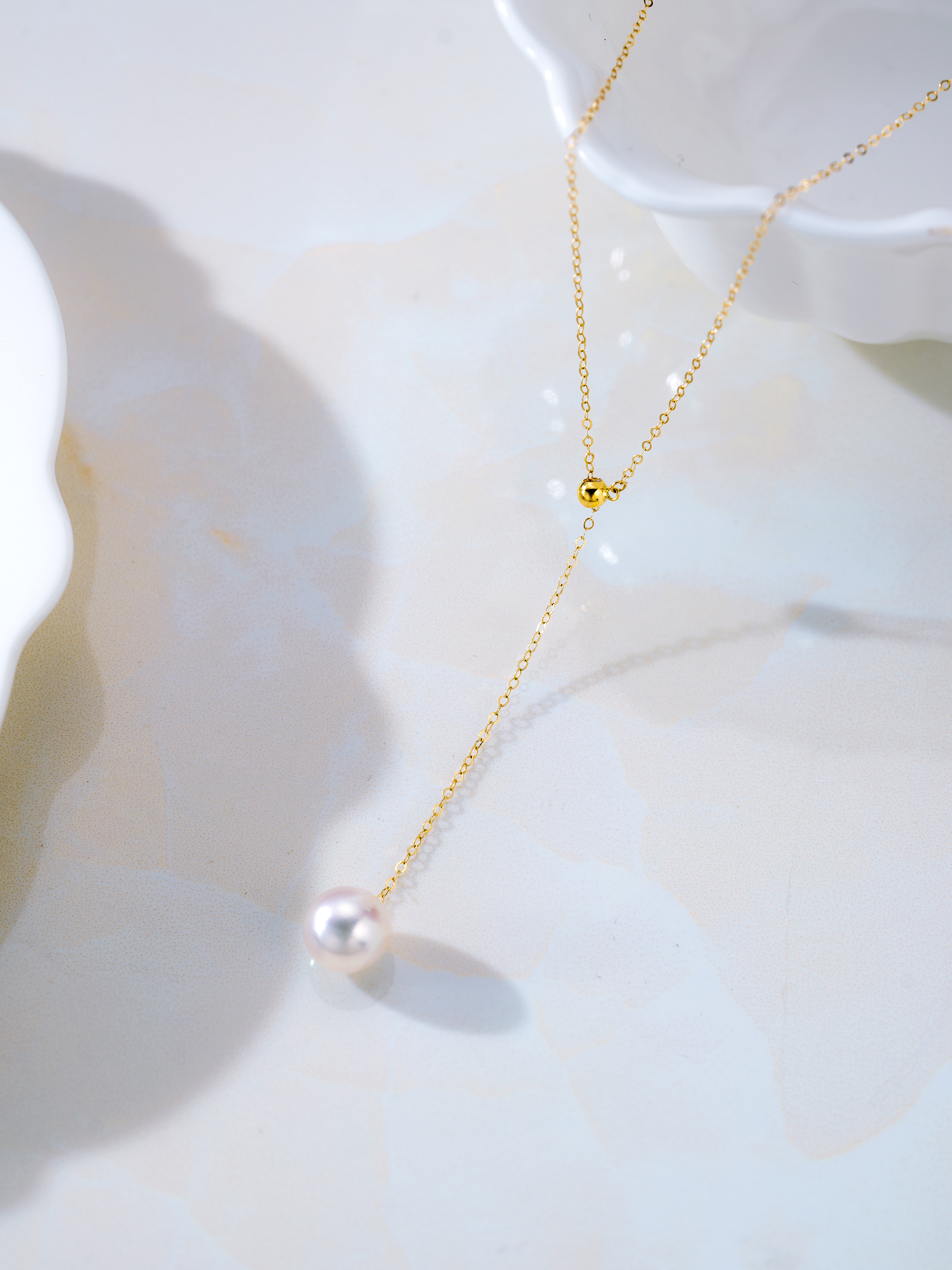 This necklace uses small gold balls for easy length adjustment. The end is adorned with an Akoya pearl, which adds a unique luster to the entire design. The Y-shaped chain made of 18K gold is full of fashion sense, highlighting the contour of the neck and collarbone, easily match any daily outfit.