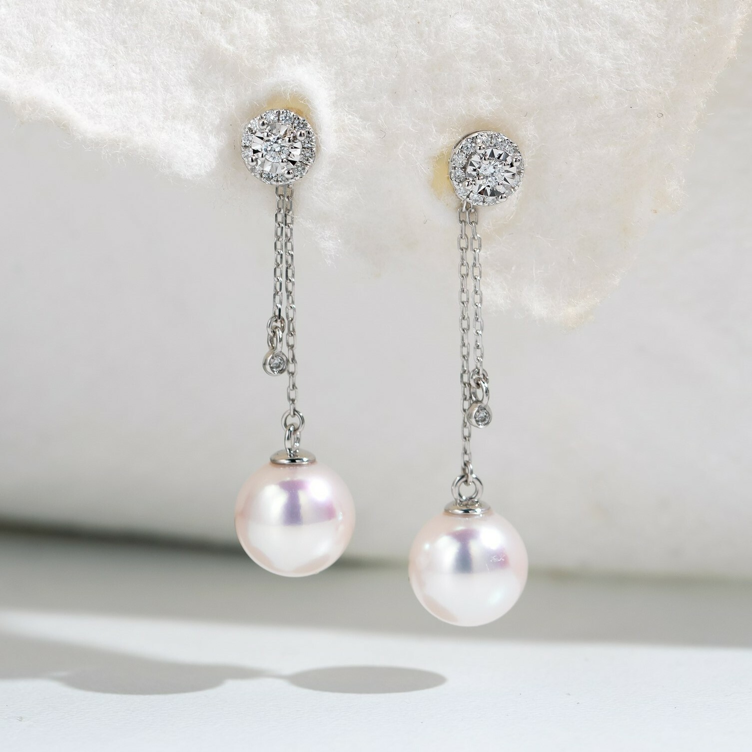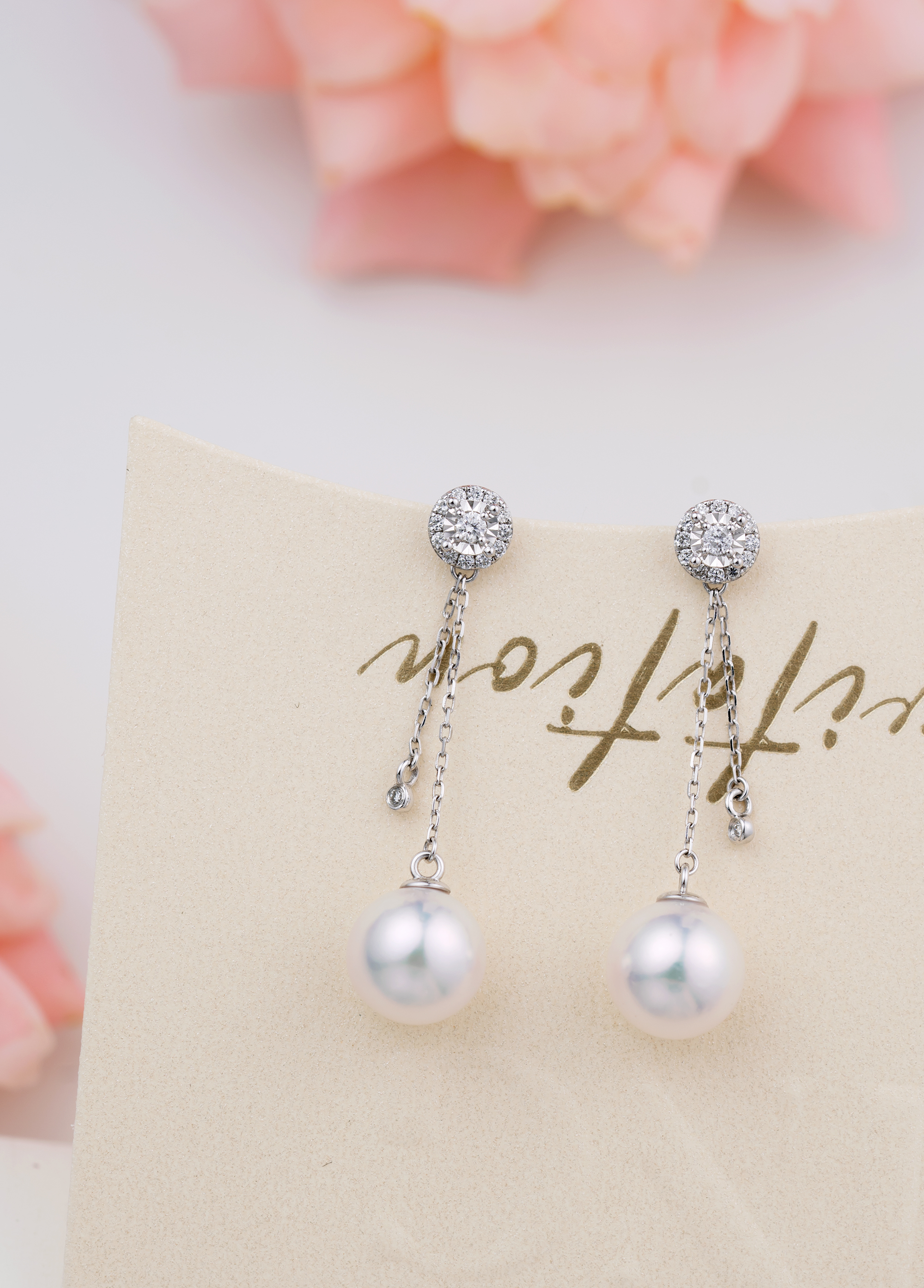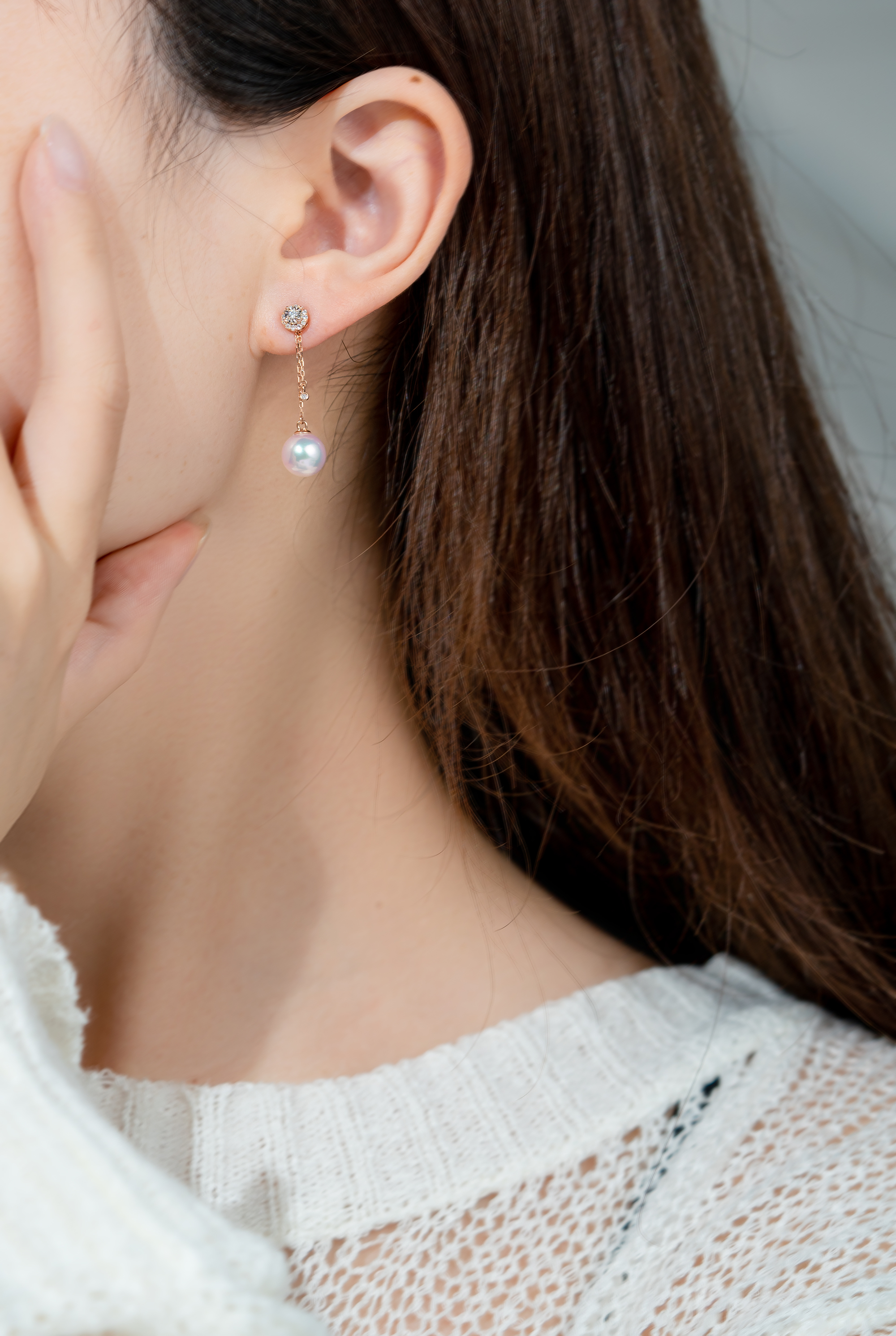 Dainty and Elegant. As the summer wind breezes, the earrings dangle along, making them a must-have item for all girls in Summer. Featuring the delicate 18K gold chain attaching a piece of 7.5-8mm Akoya Pearl as the back of the earring. The 18K gold stud part is fully adorned with diamonds in various