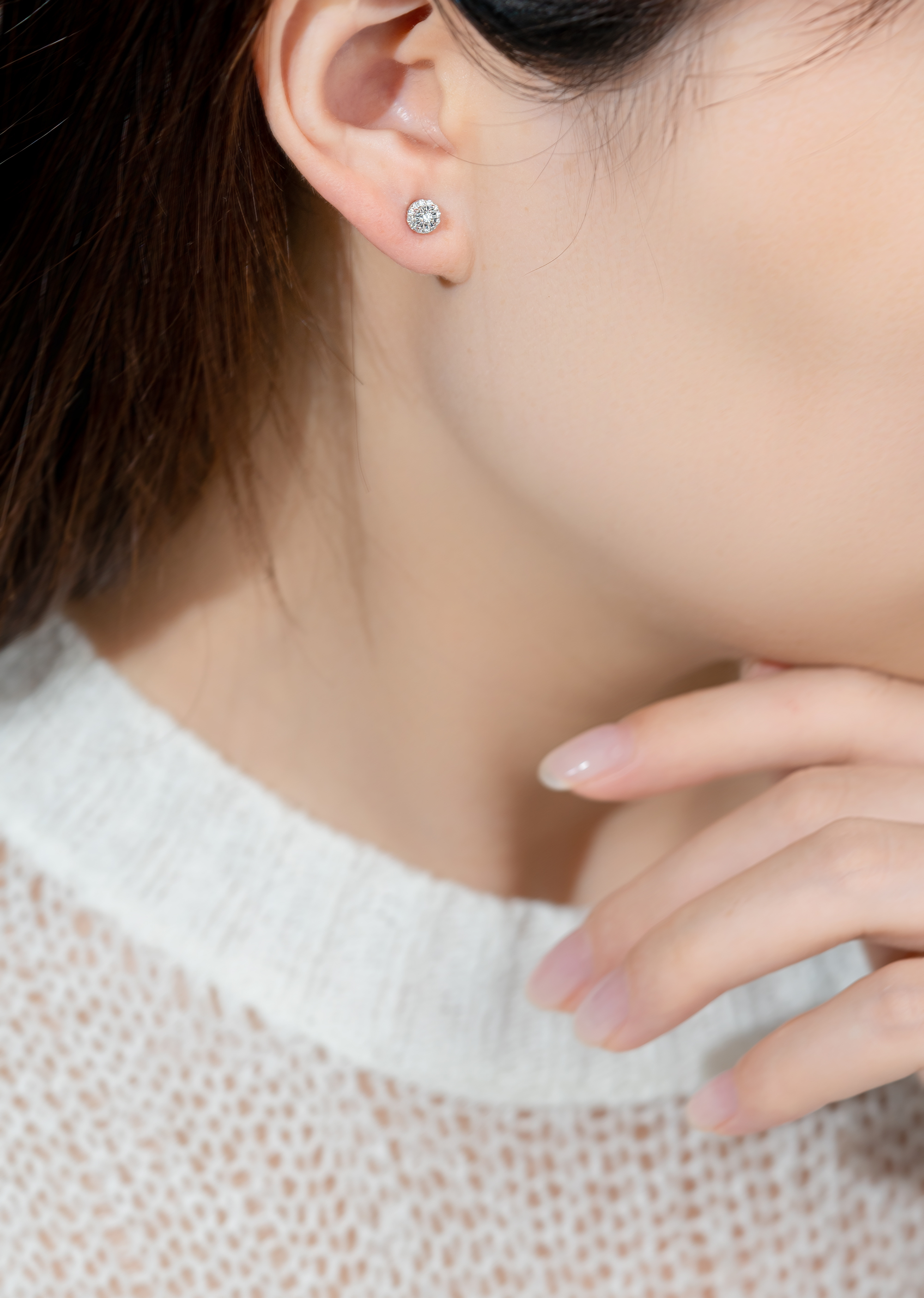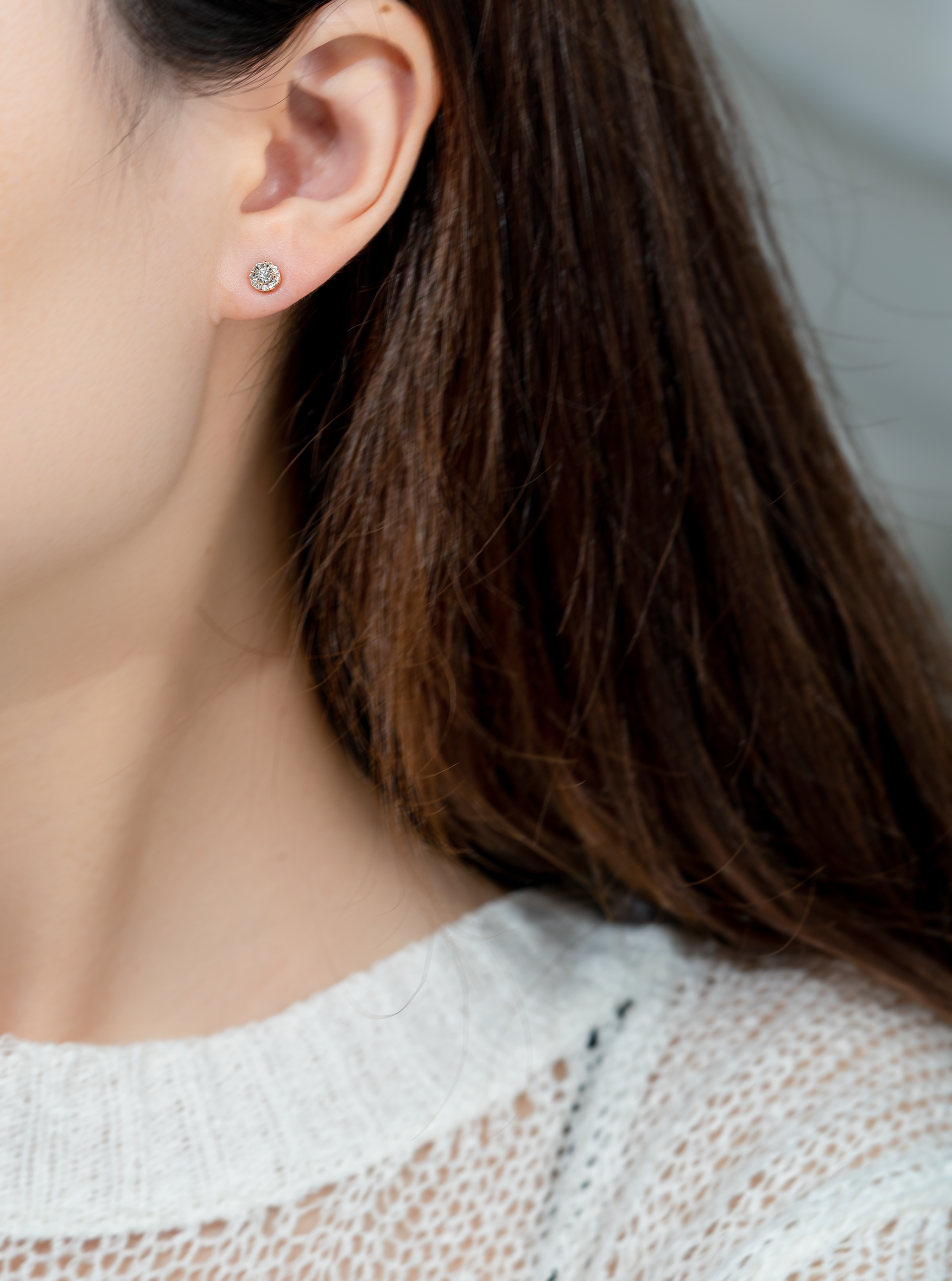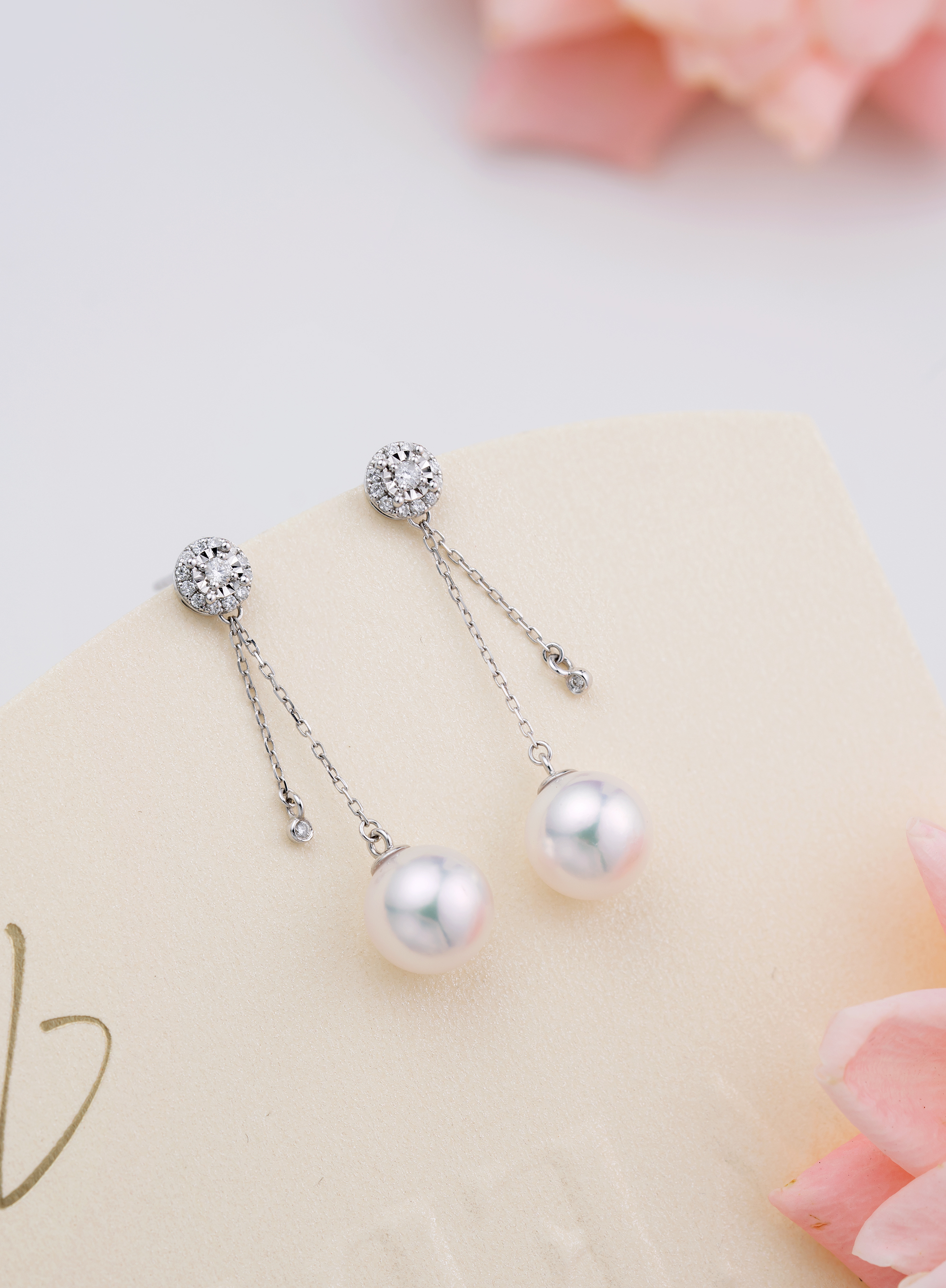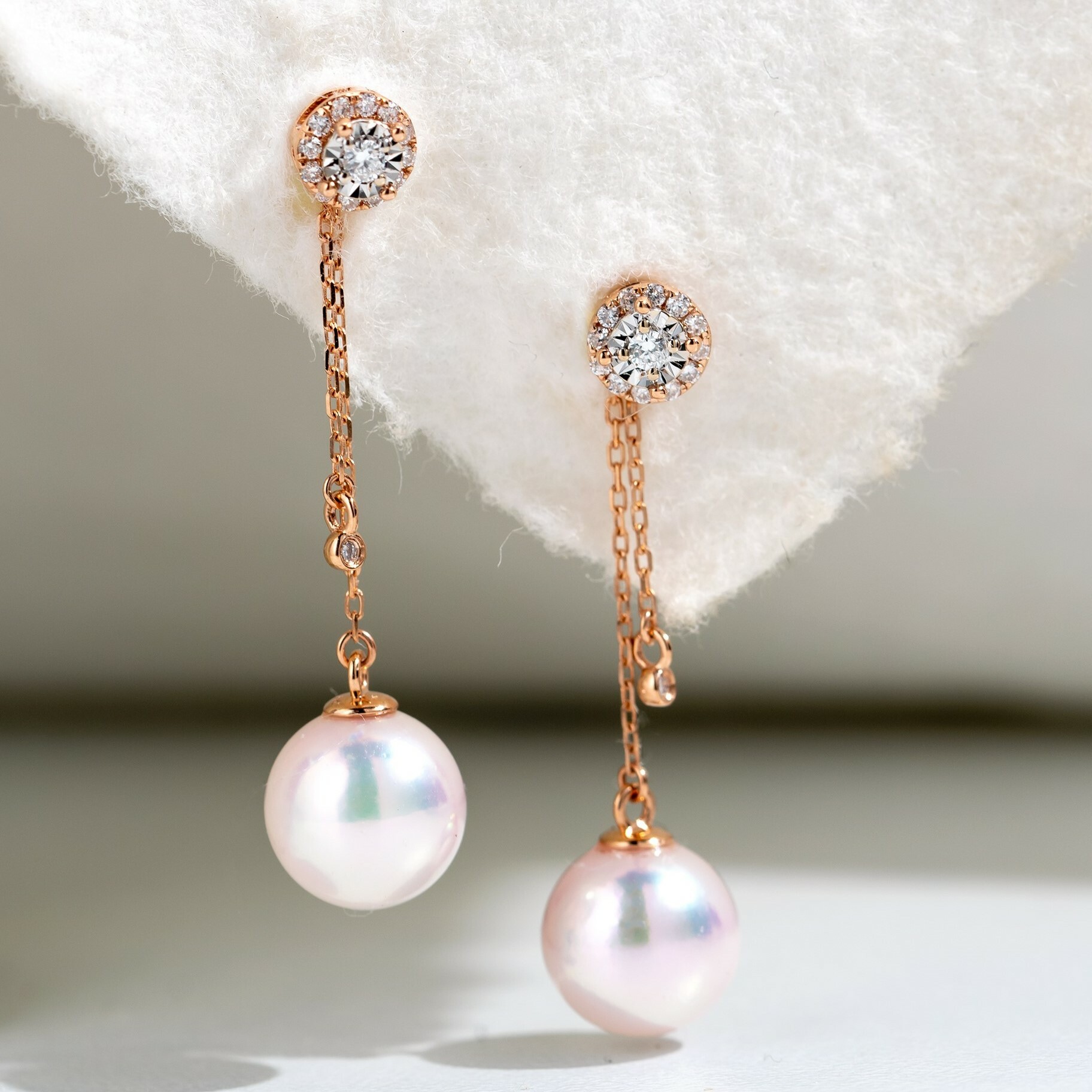 Dainty and Elegant. As the summer wind breezes, the earrings dangle along, making them a must-have item for all girls in Summer. Featuring the delicate 18K gold chain attaching a piece of 7.5-8mm Akoya Pearl as the back of the earring. The 18K gold stud part is fully adorned with diamonds in various