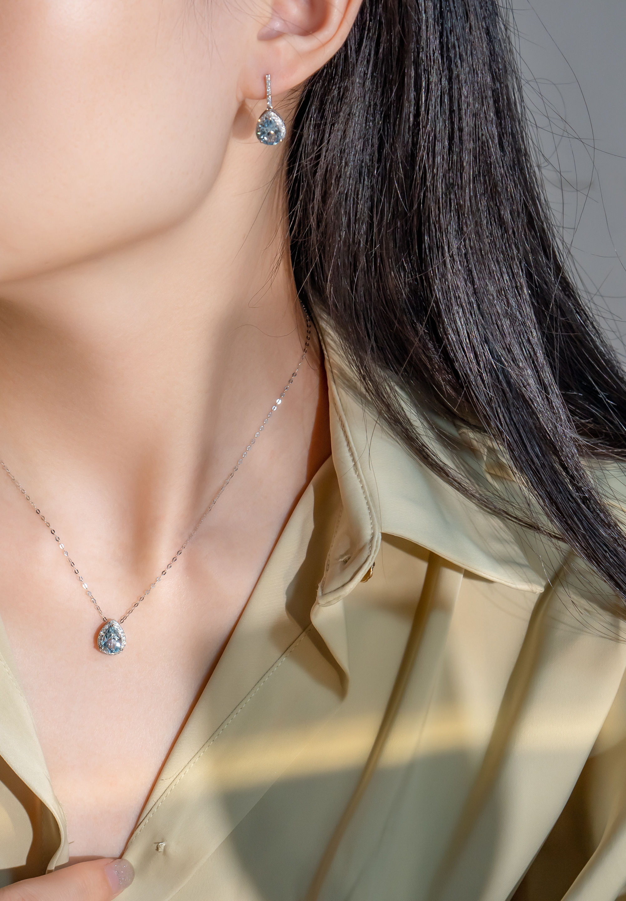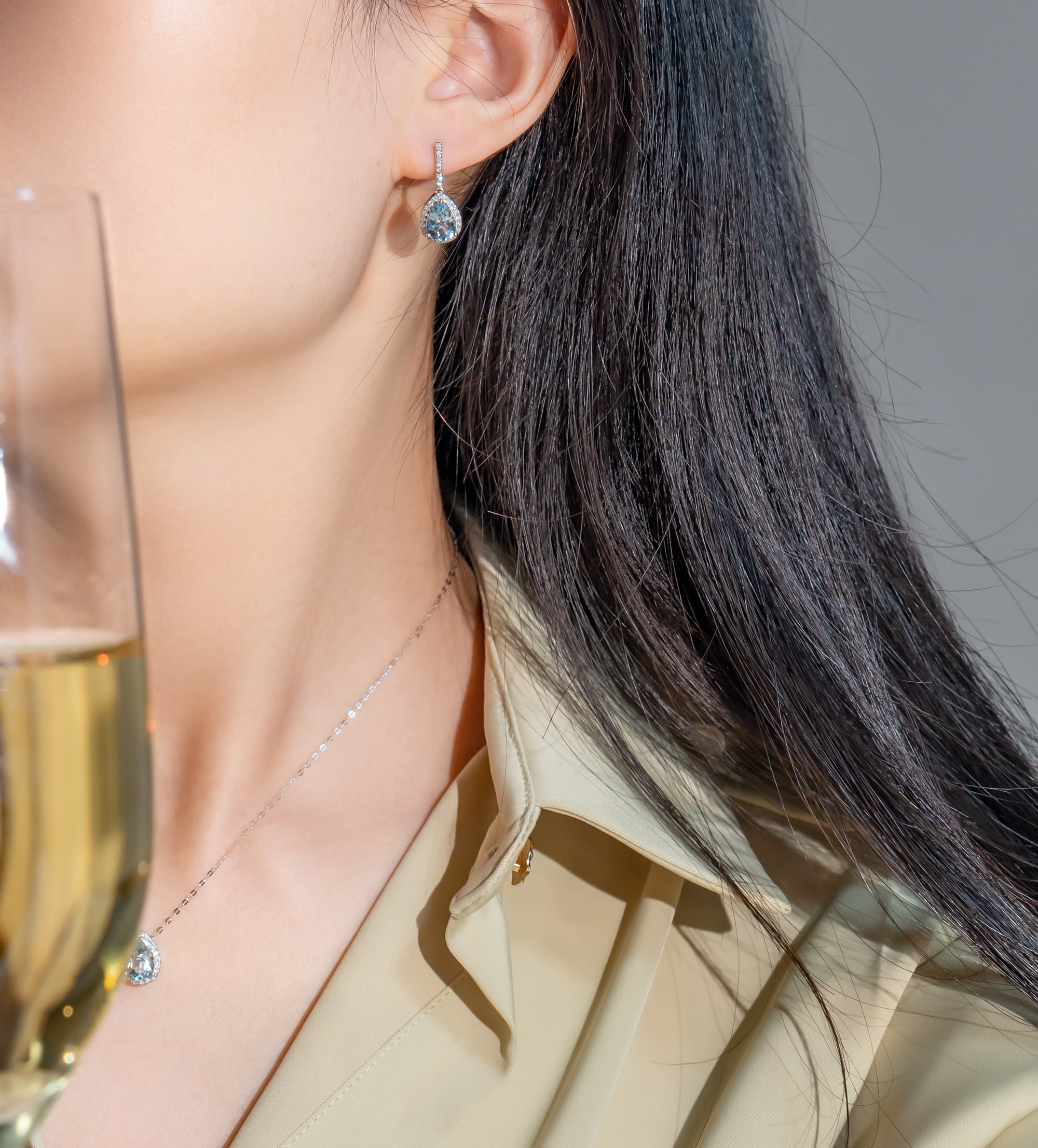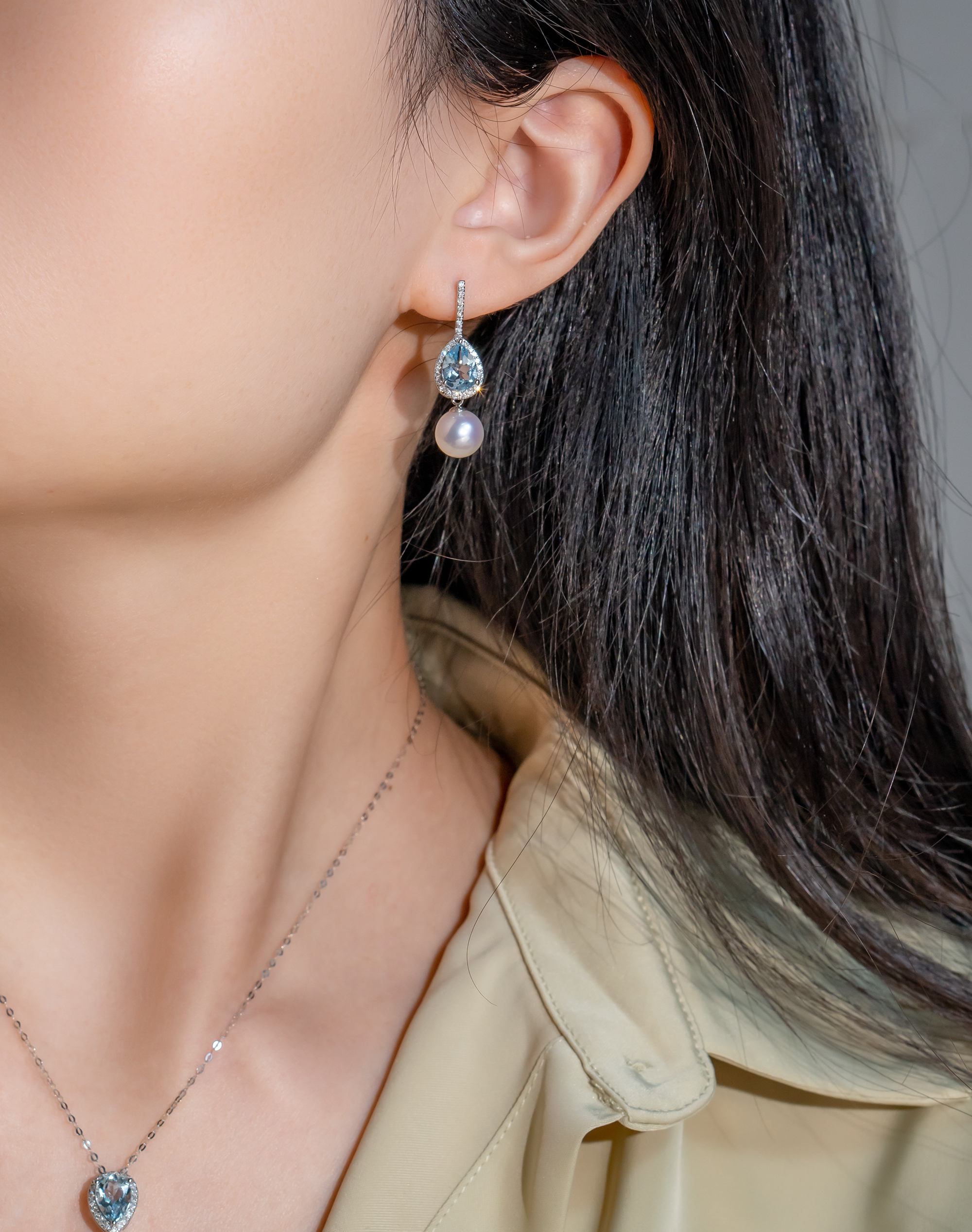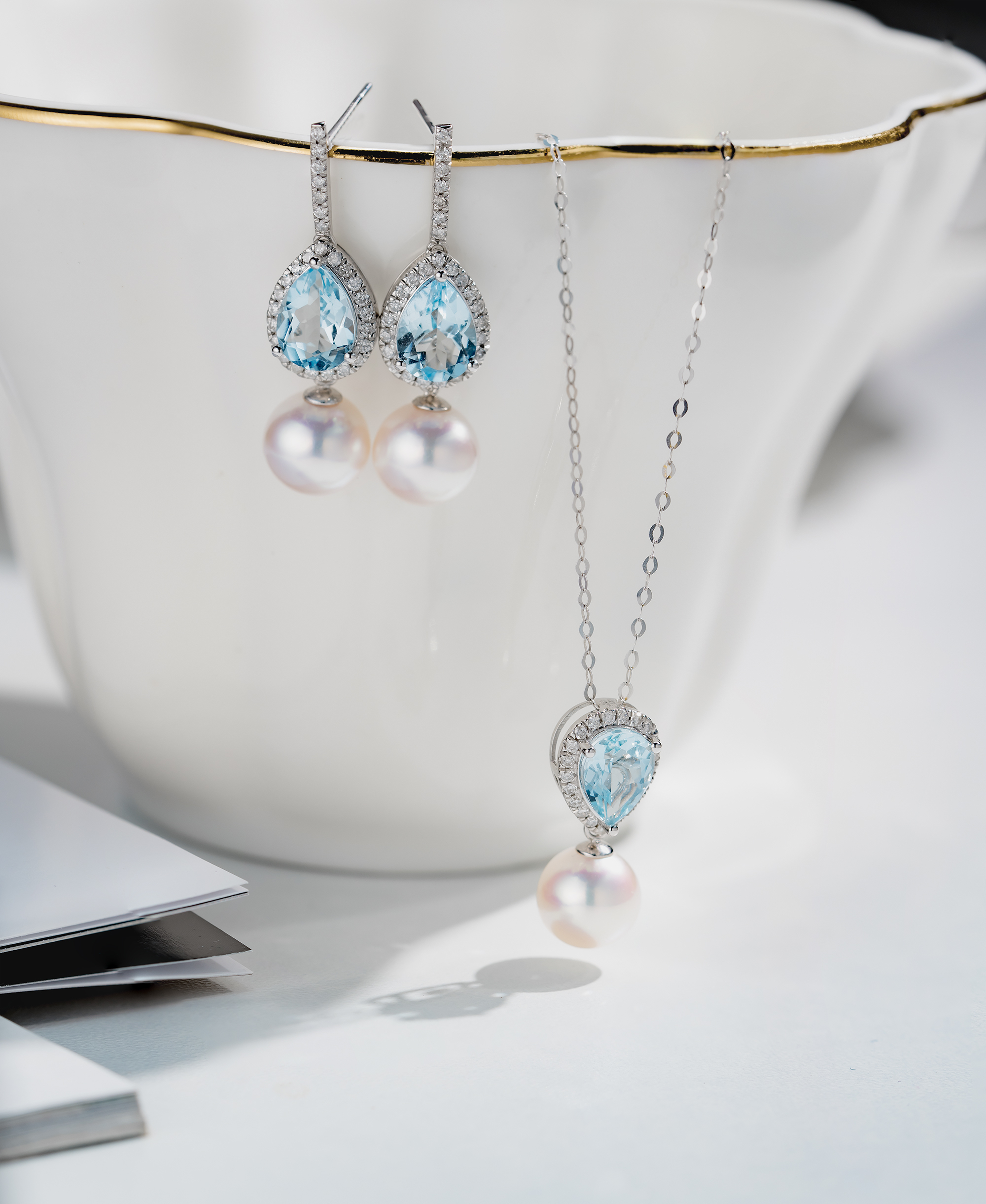 The dazzling 8 to 8.5mm Akoya Pearl suspended by the clear blue drop shaped Aquamarine surrounded by diamonds, showcases a sense of elegancy, classic and timeless.