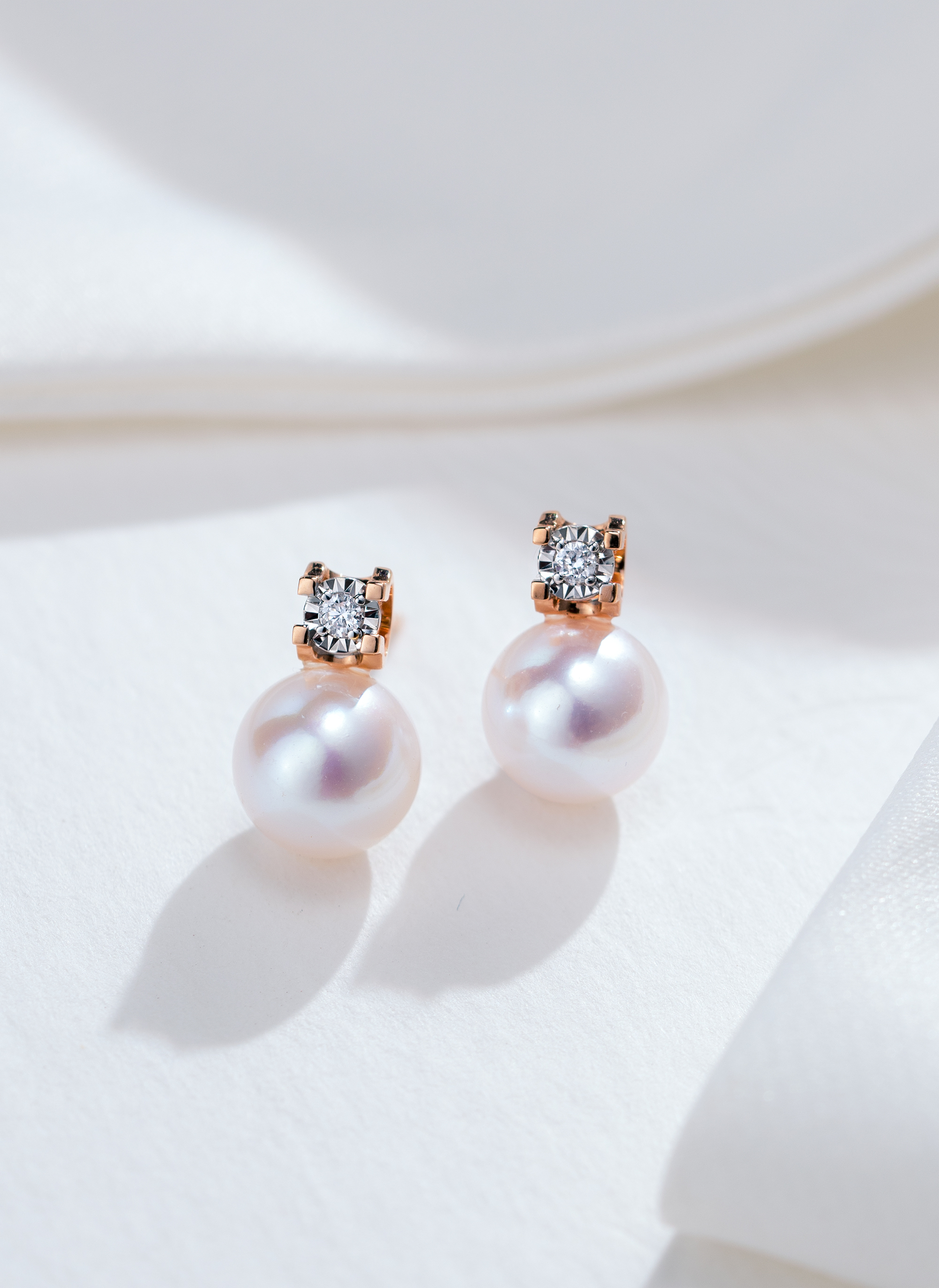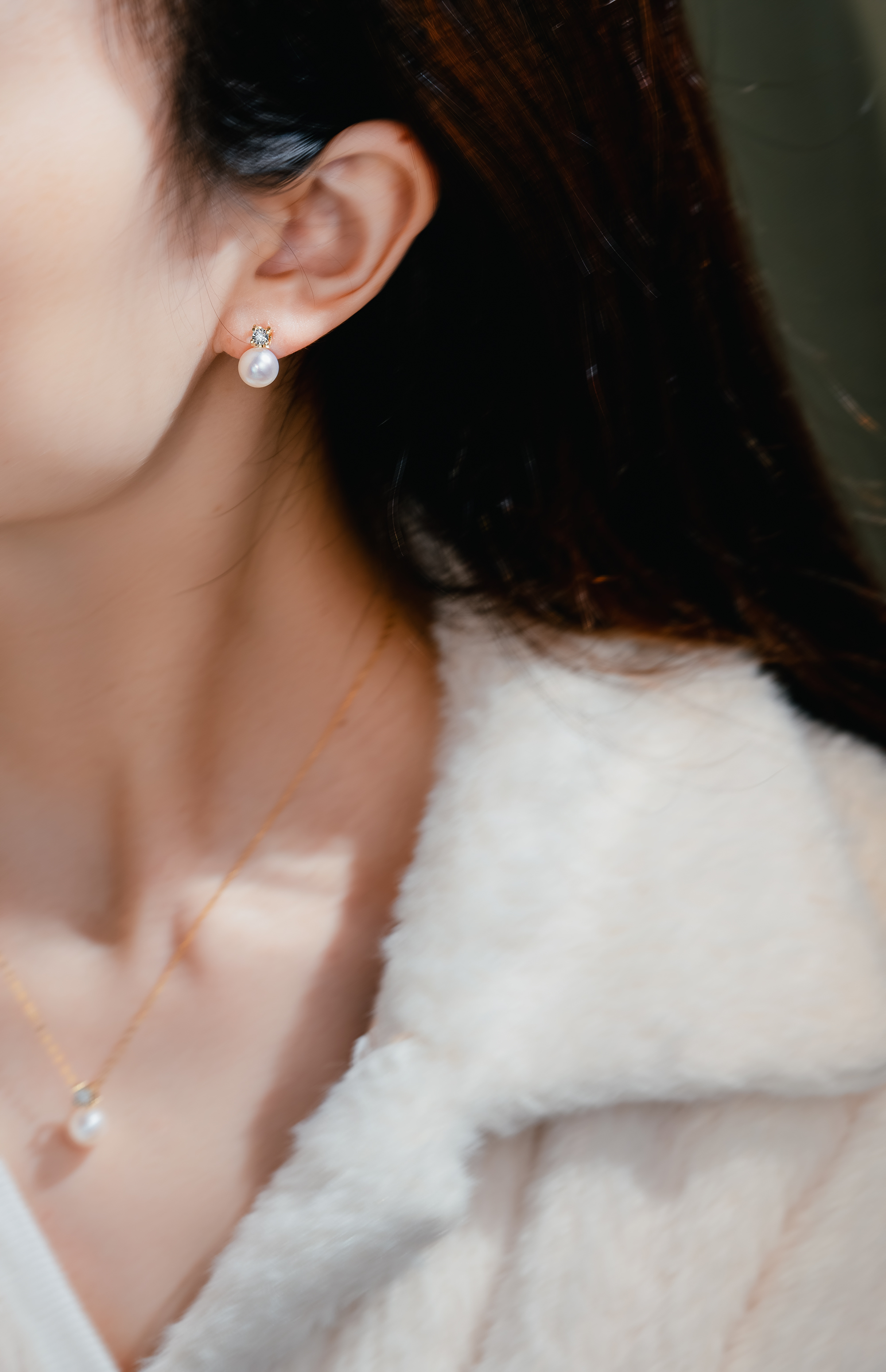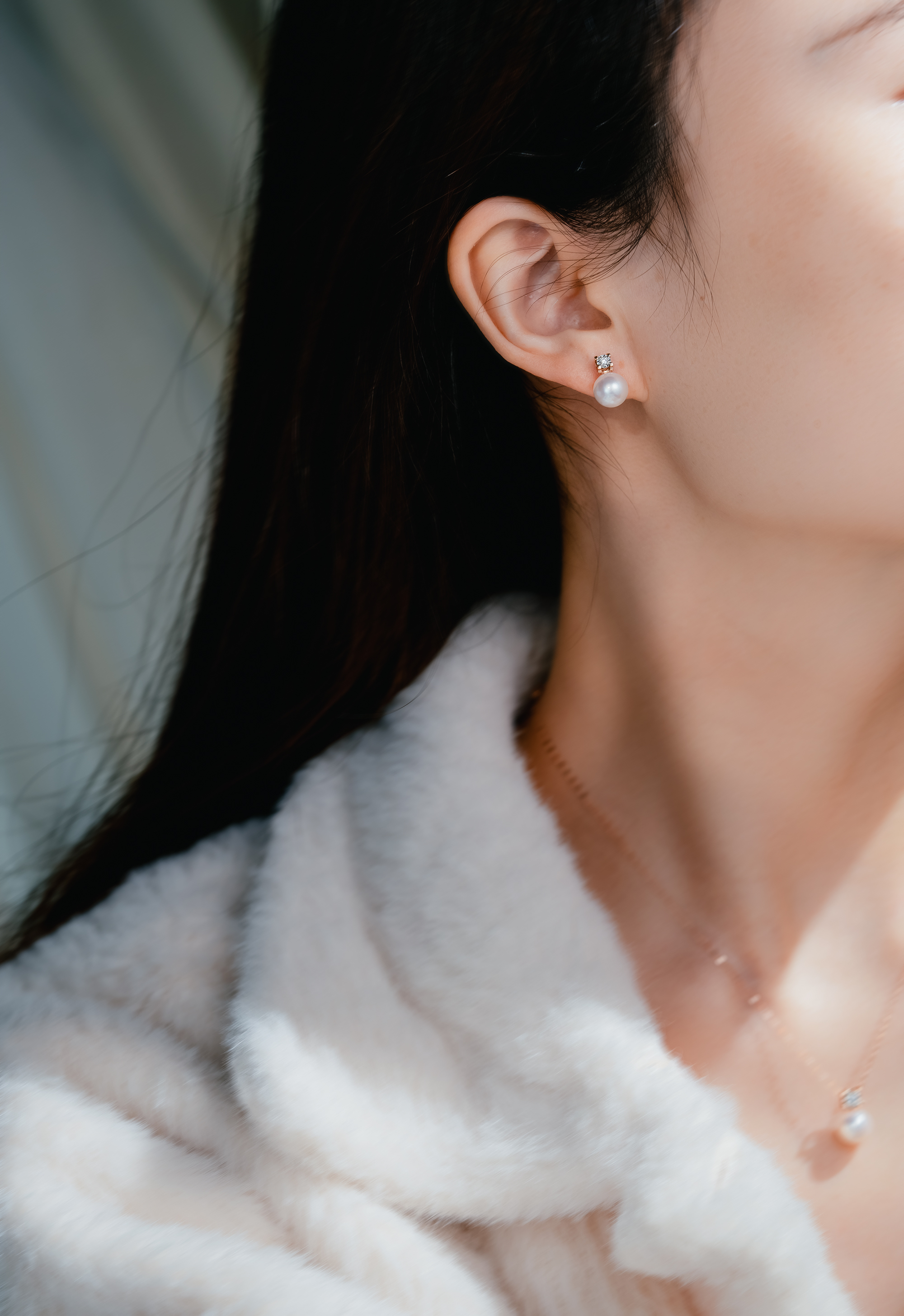 One of the bestselling earrings in Olina Pearl!! This pair features two prong-set solitaire diamonds and two peg-set rare 8-8.5mm Akoya pearl. The design of this pair of earrings is classic and can easily go with any outfit of any occasions!