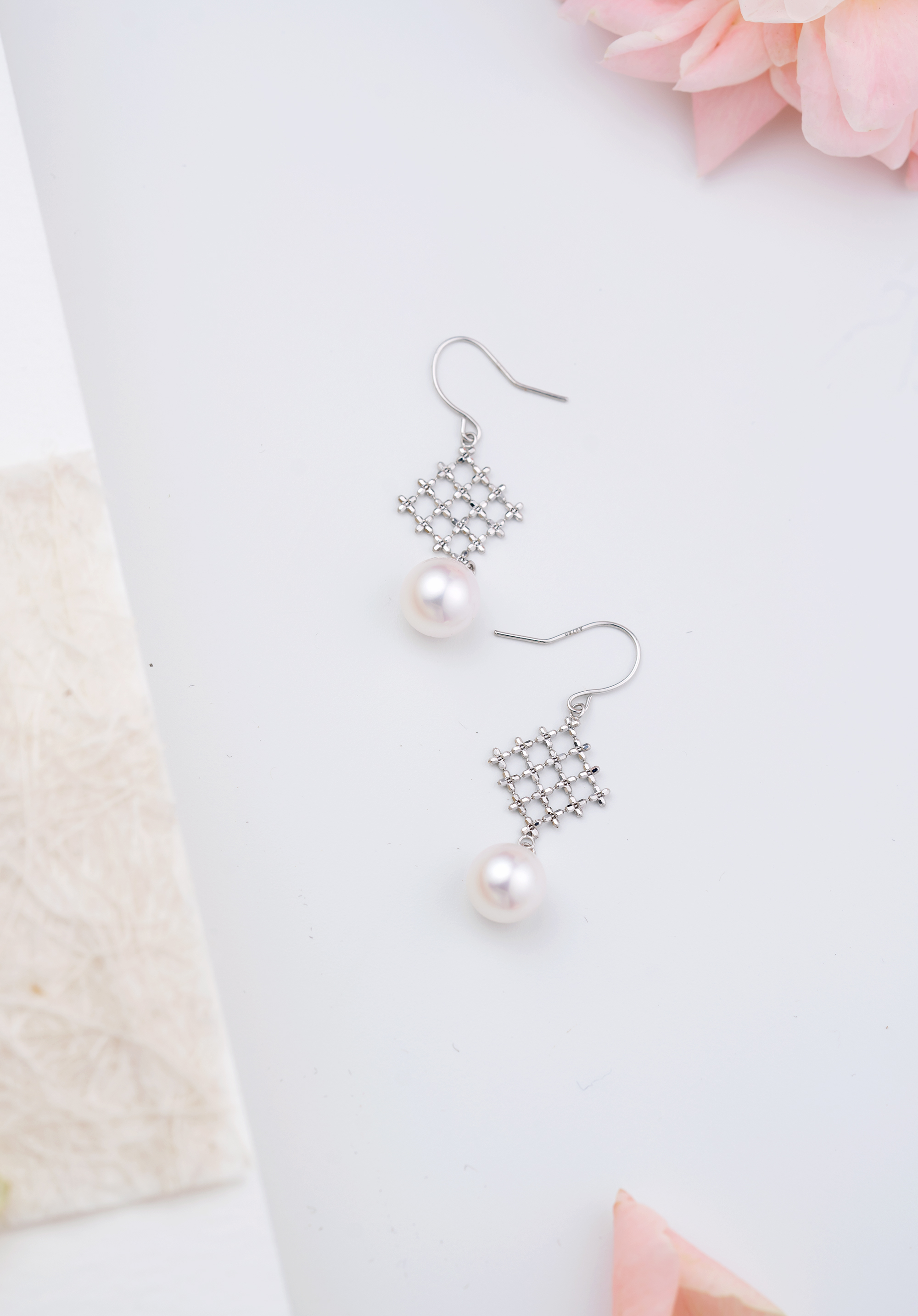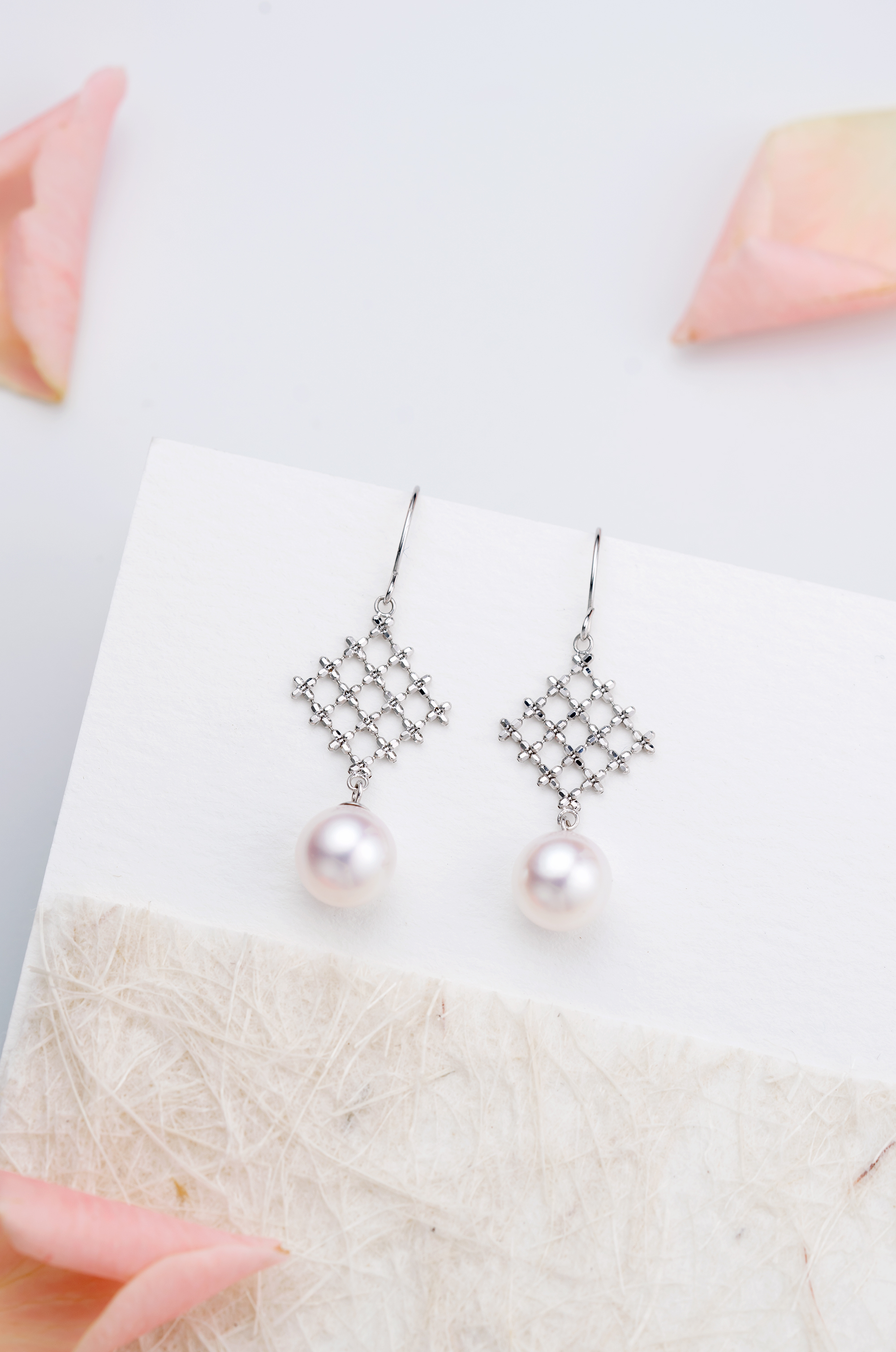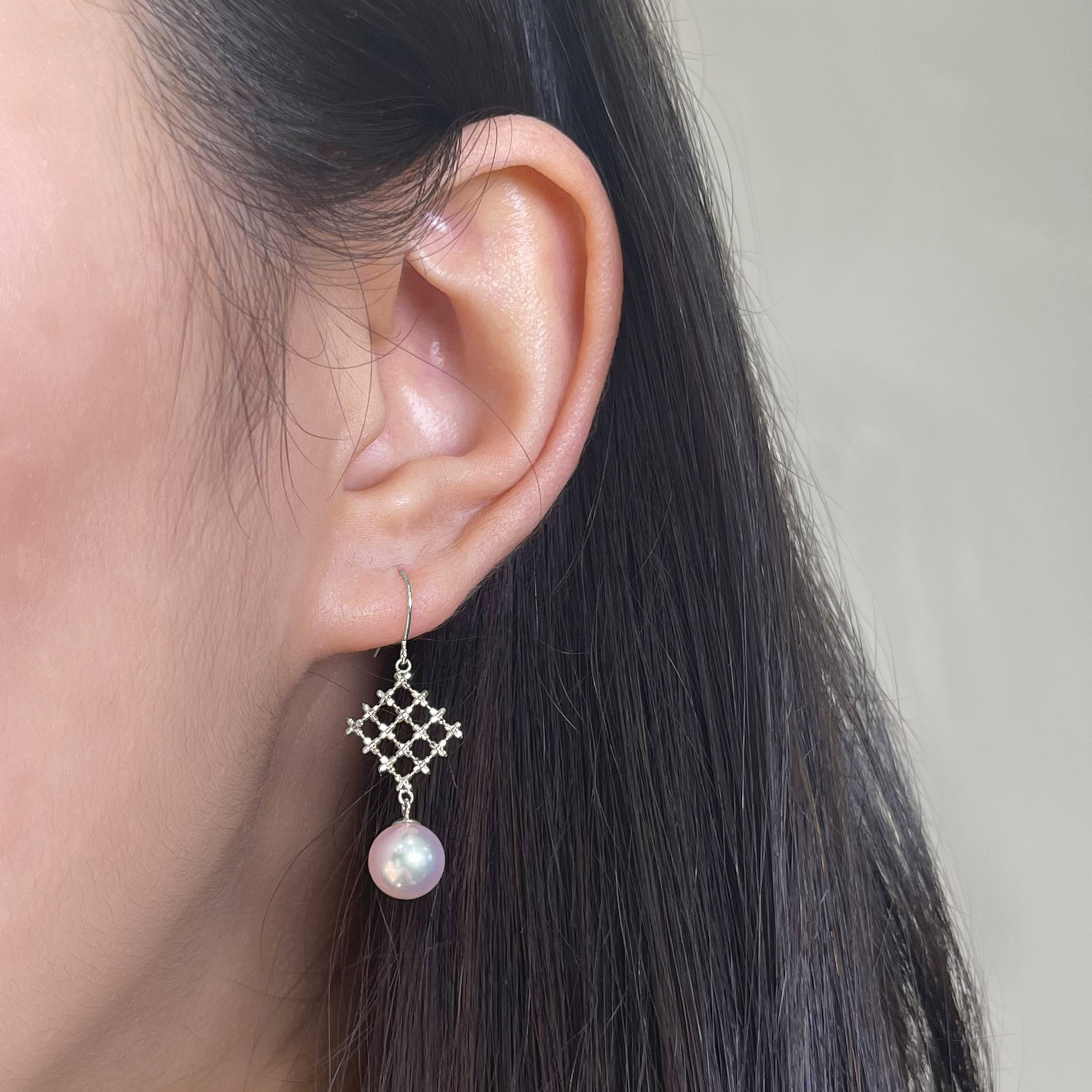 Pure and Elegant. This pair of earrings is knitted in grids with 18K Gold beads, and peg-set with premium Akoya pearl. Wear it under the light to discover its natural and beautiful luster reflecting from the surface of the materials.