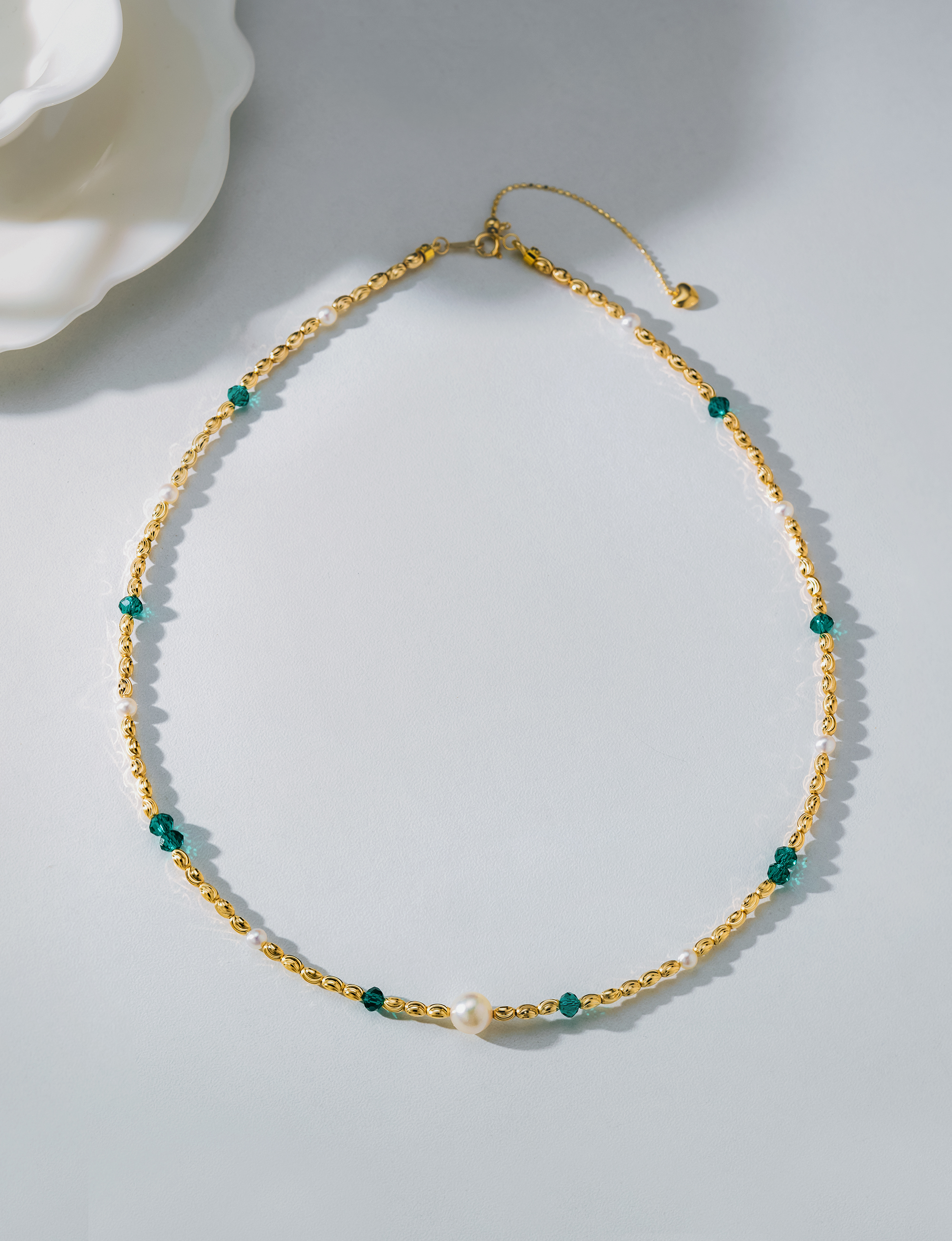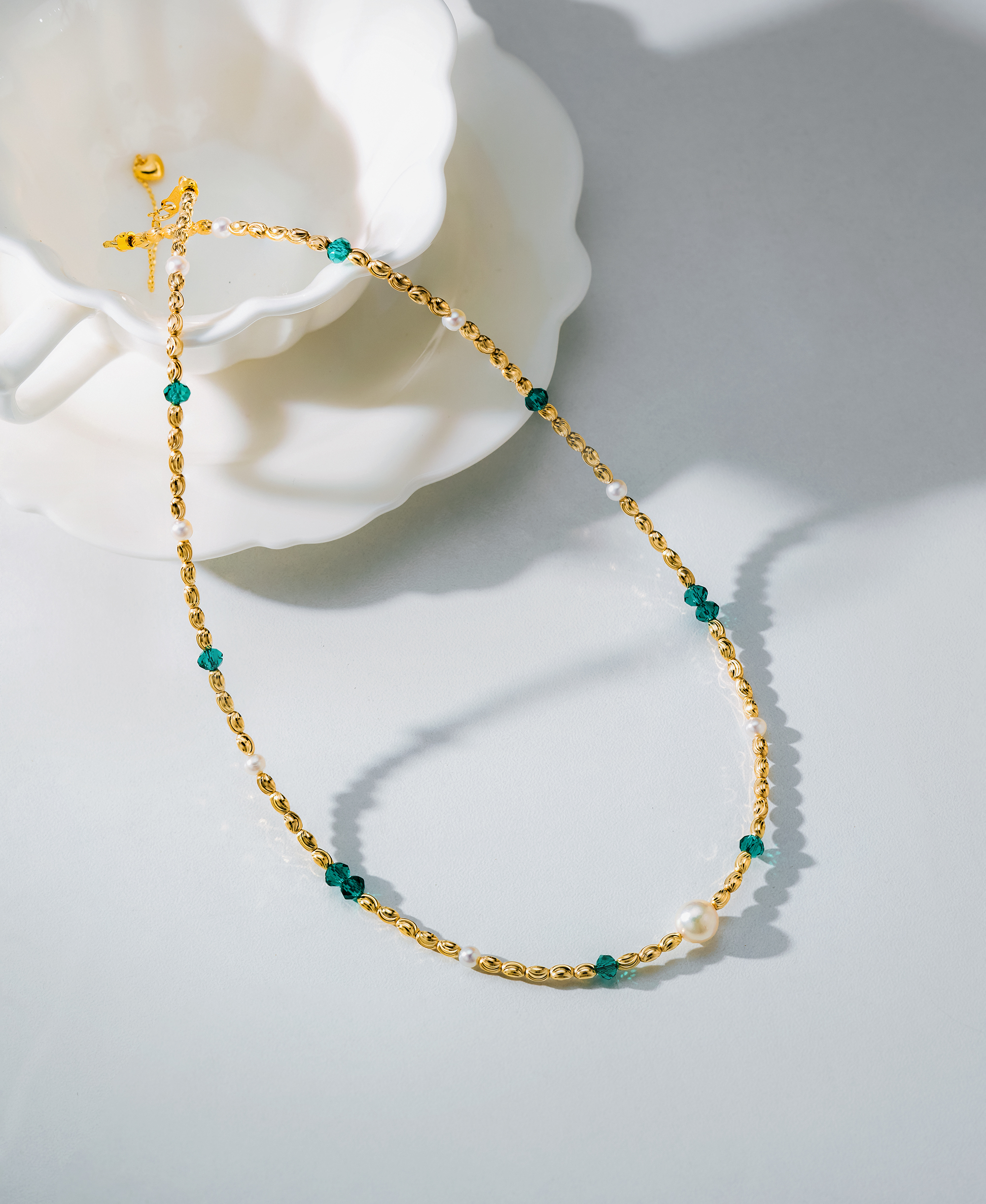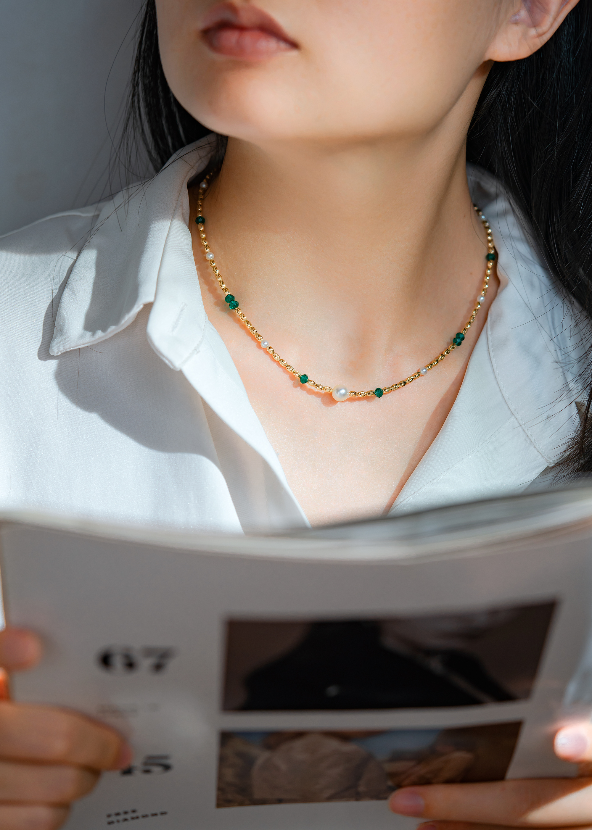 This necklace features elegant Akoya pearls paired with vivid emeralds that beautifully complement each other. Crafted with 18K gold in a special tube design, it showcases exquisite craftsmanship. Paired with the matching bracelet, it enhances your refined elegance and unique charm.