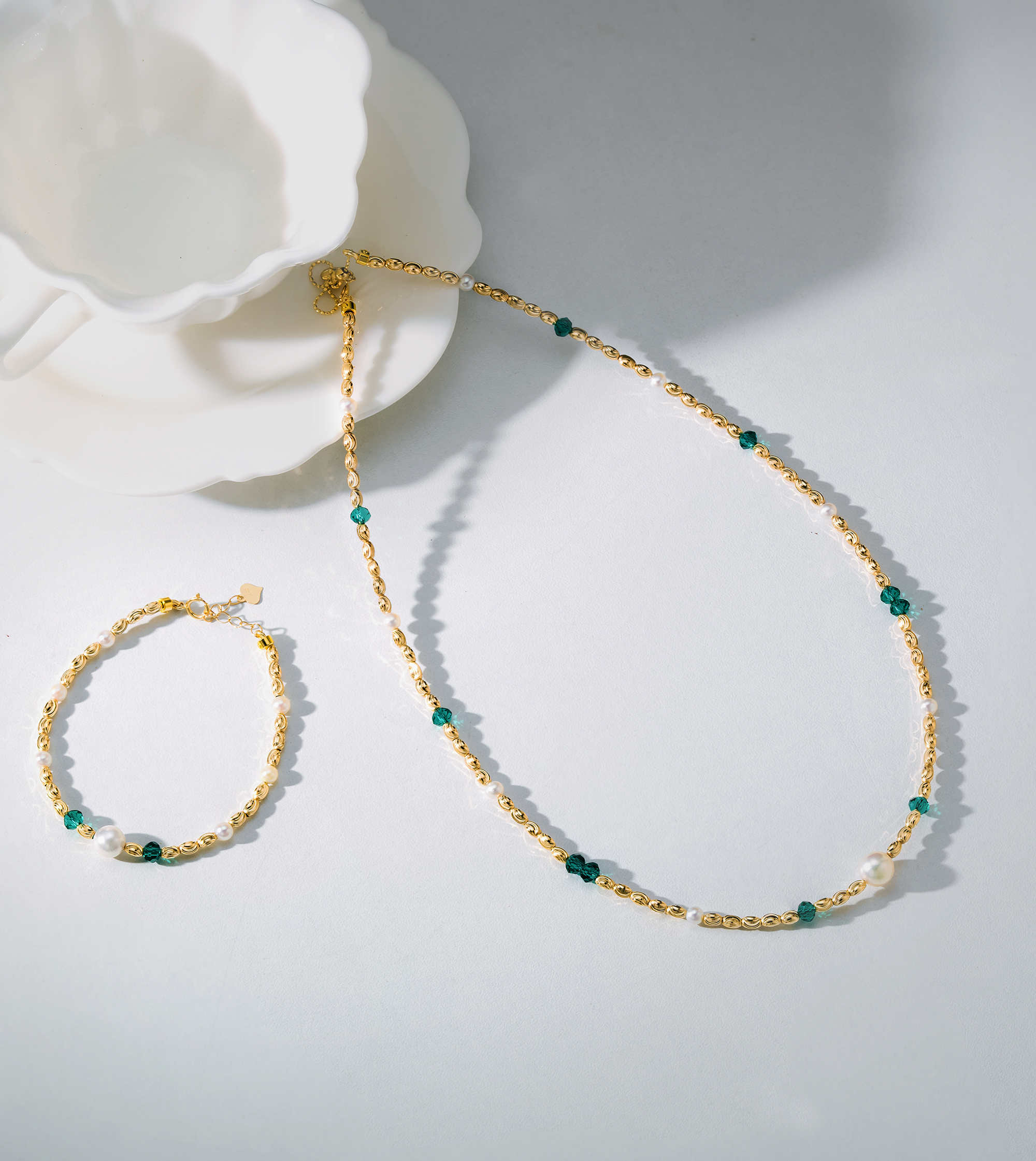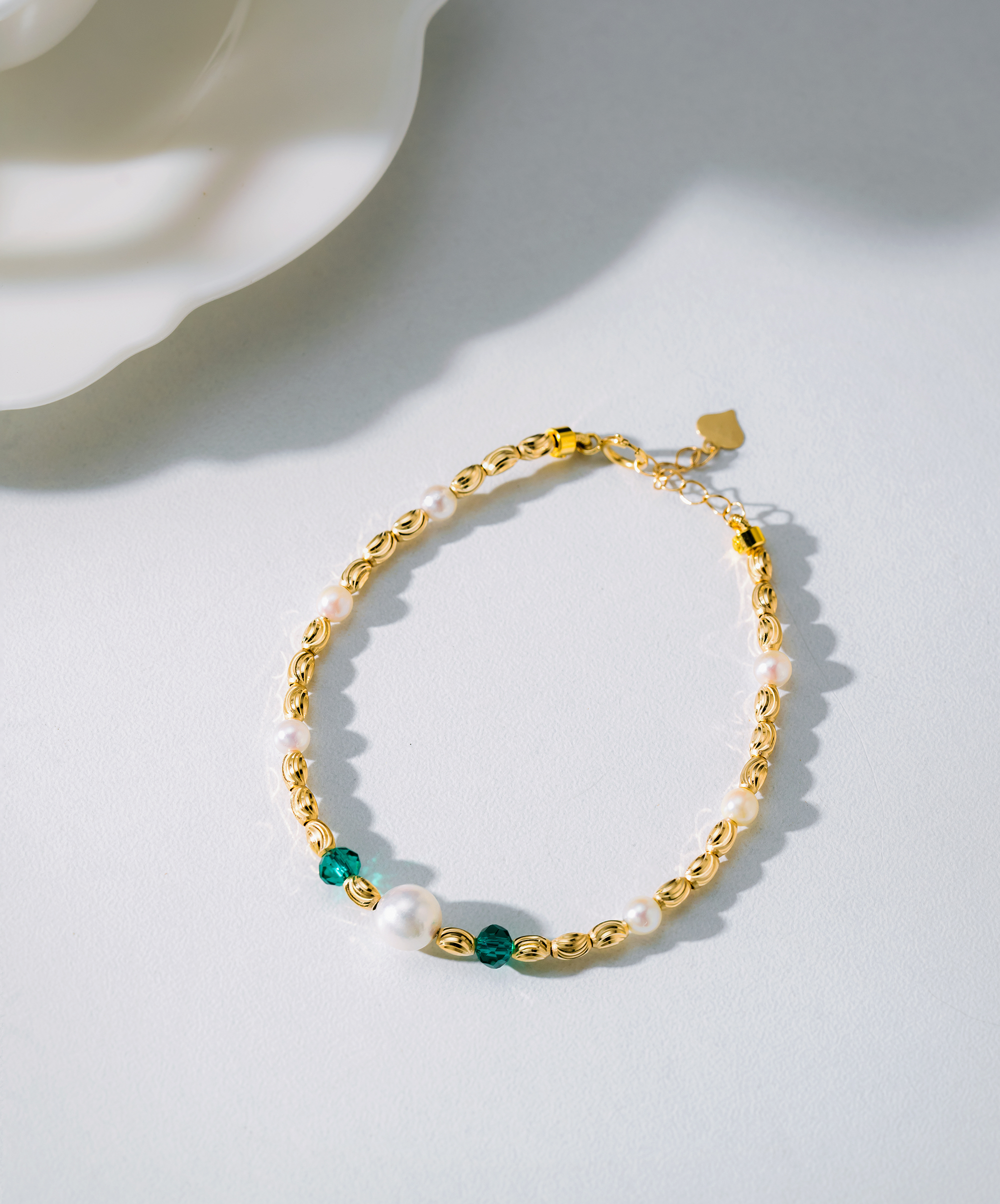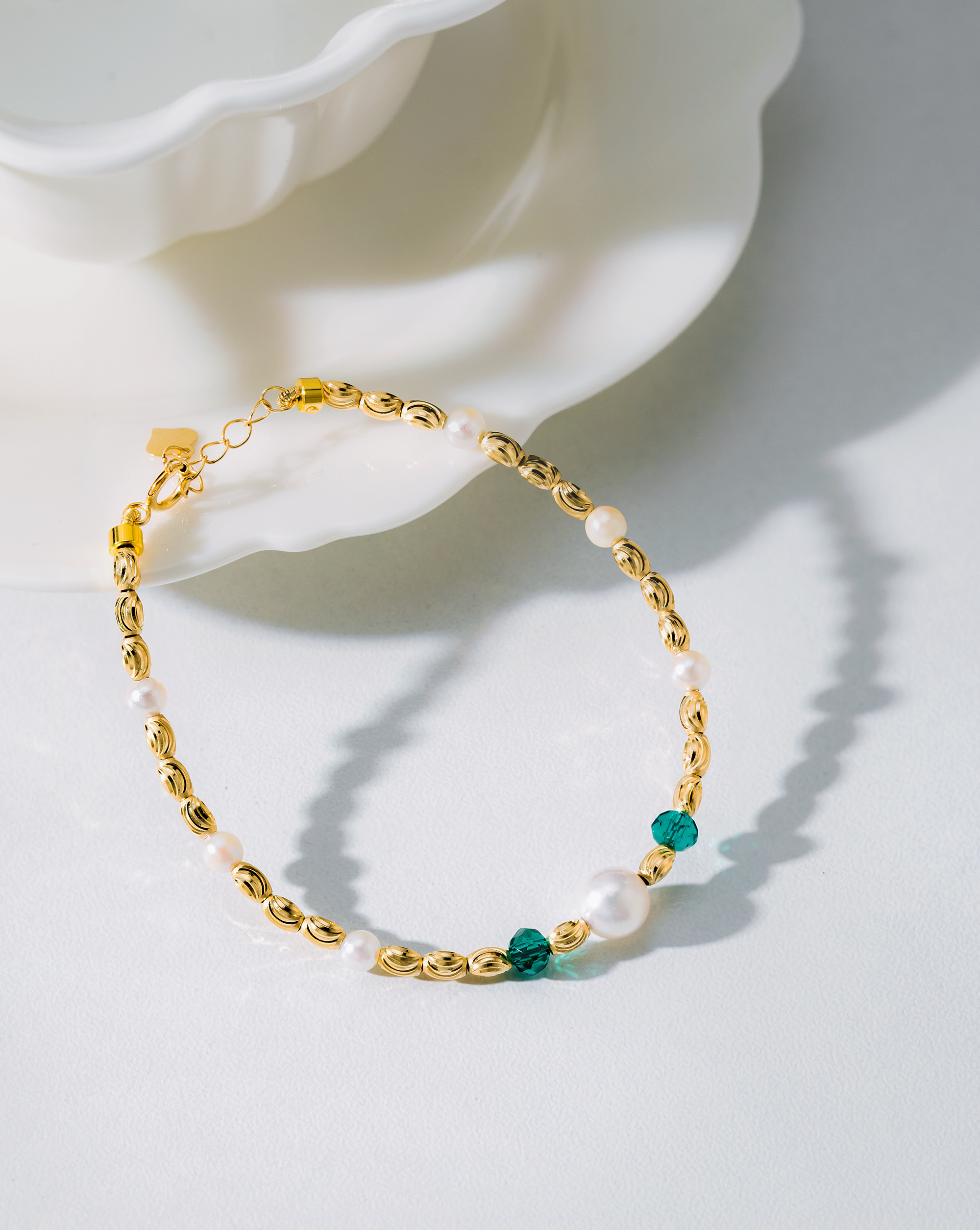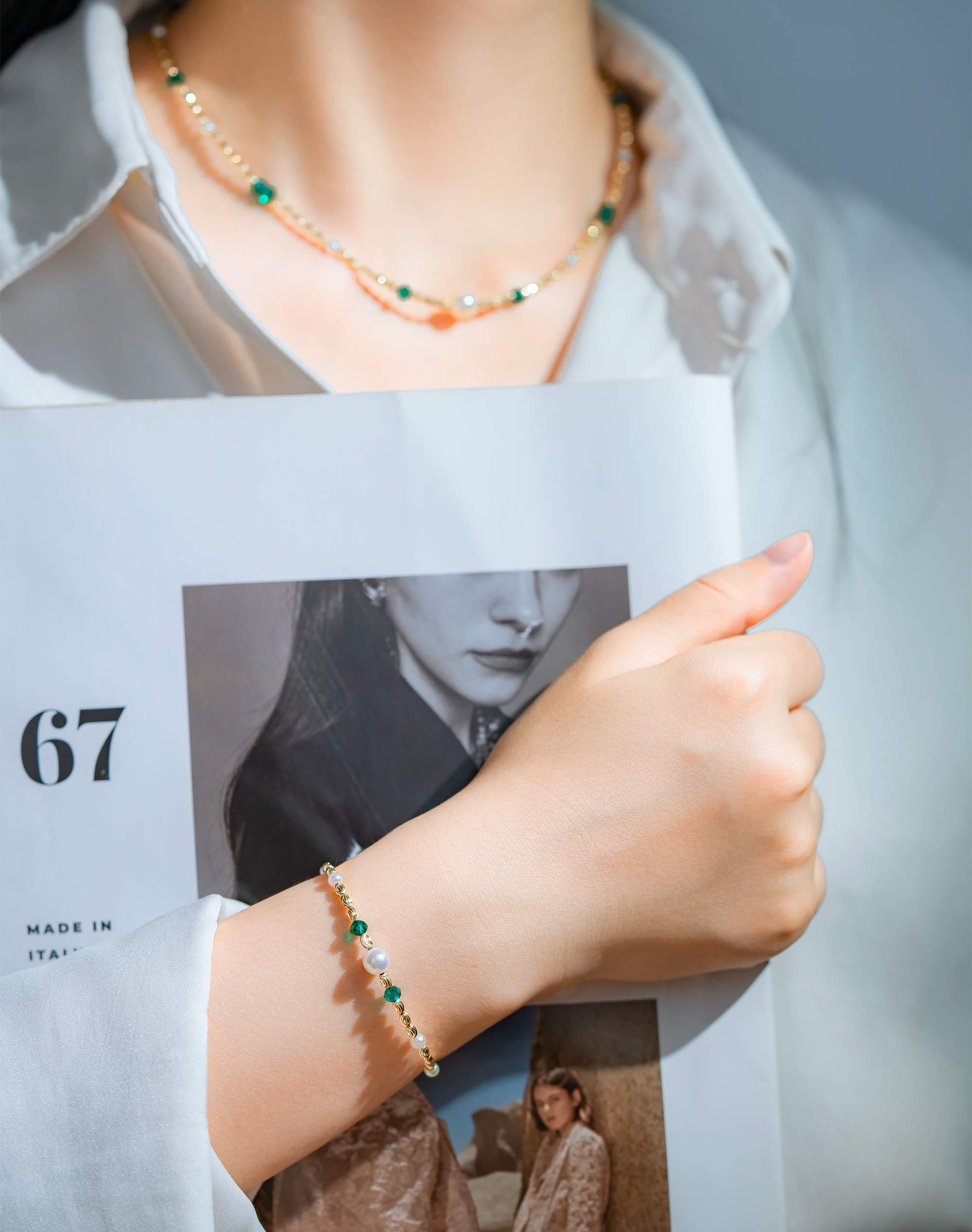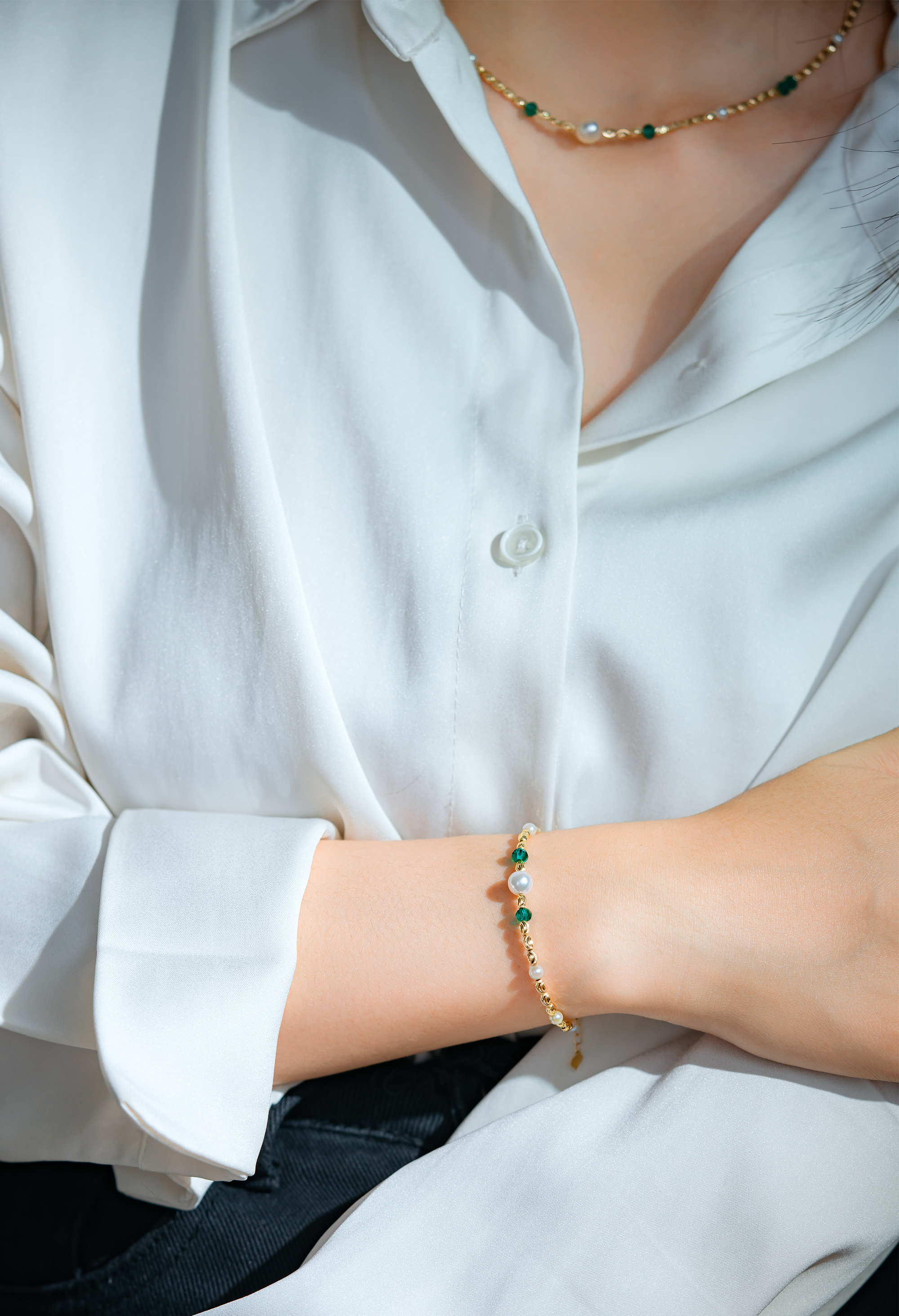 This bracelet features elegant Akoya pearls with vivid emeralds that shine deeply and complement the pearls beautifully. Crafted in 18K gold with a special tube design, the front showcases two emeralds flanking an Akoya pearl as a focal point, highlighting its luxurious craftsmanship.
