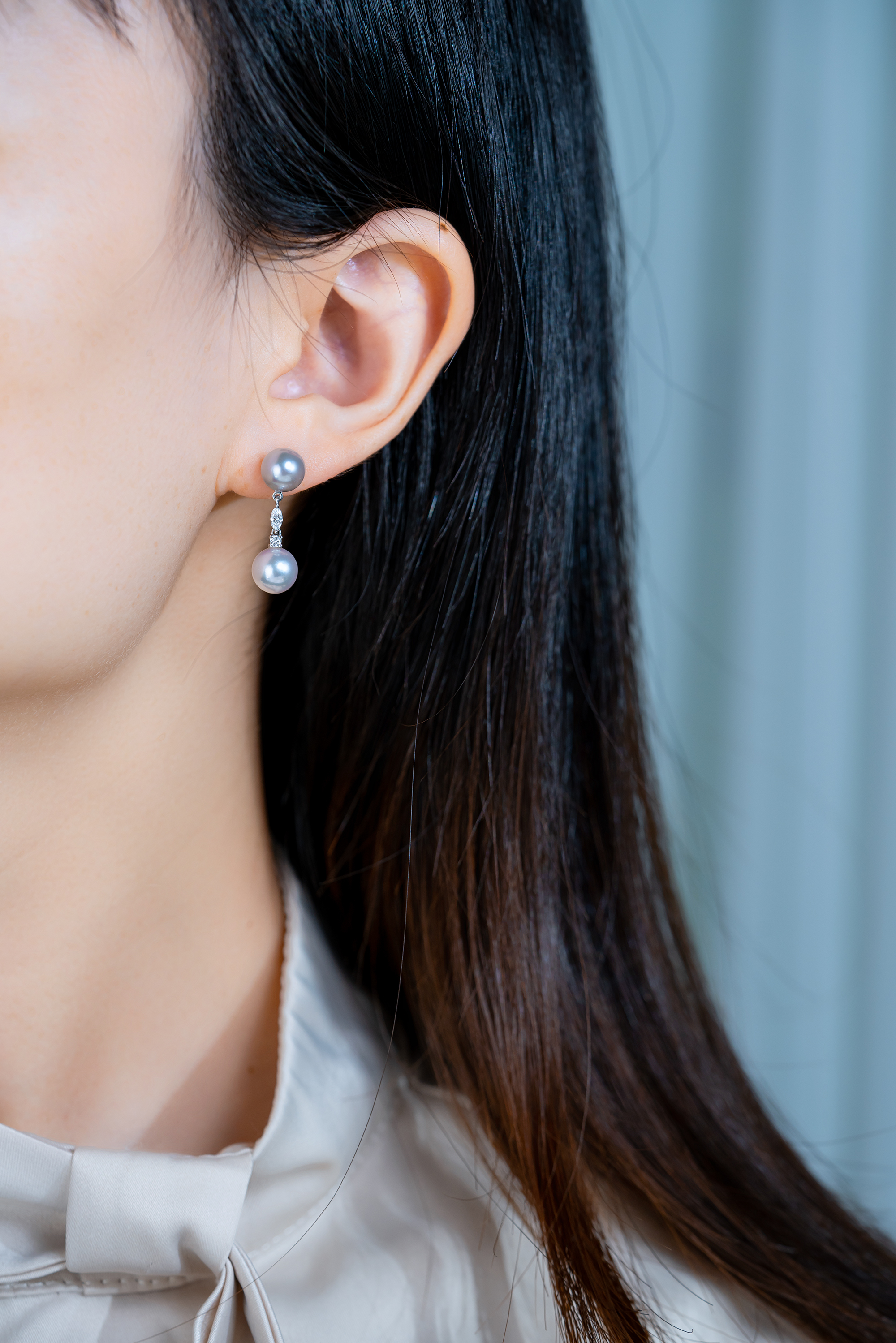 This 18K white gold drop earring cleverly combines the unique dreamy and mysterious silver-blue Akoya pearl, the sparkle of Marquise diamonds, and the noble white Akoya pearl, exuding the charm of elegant and intellectual women. A must-have item for who want to showcase stylish and charming fashion.