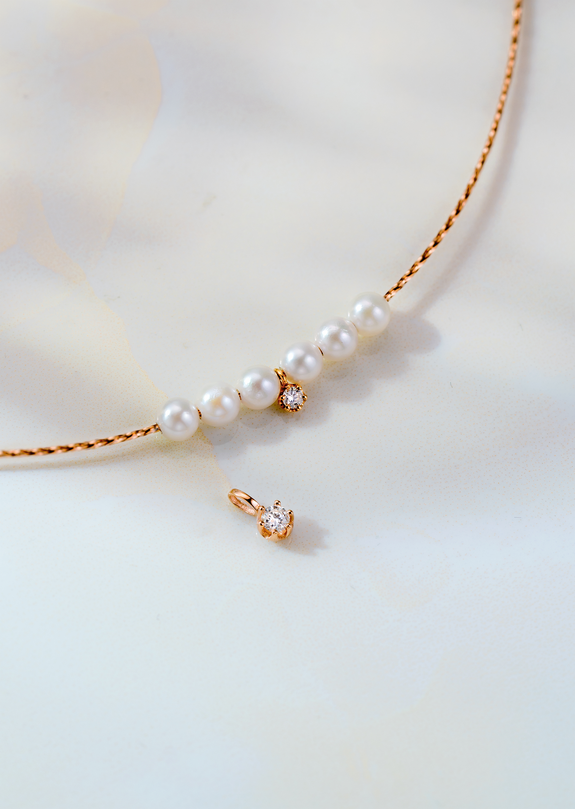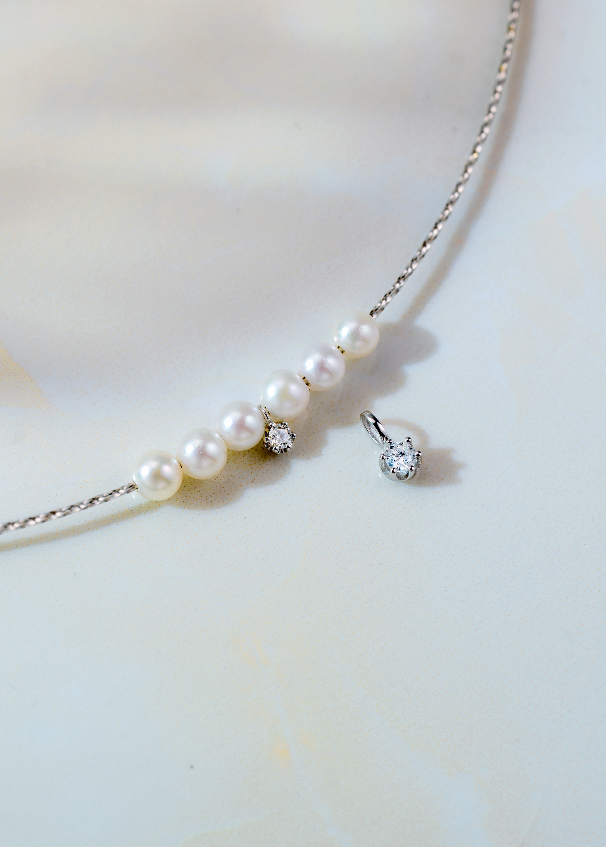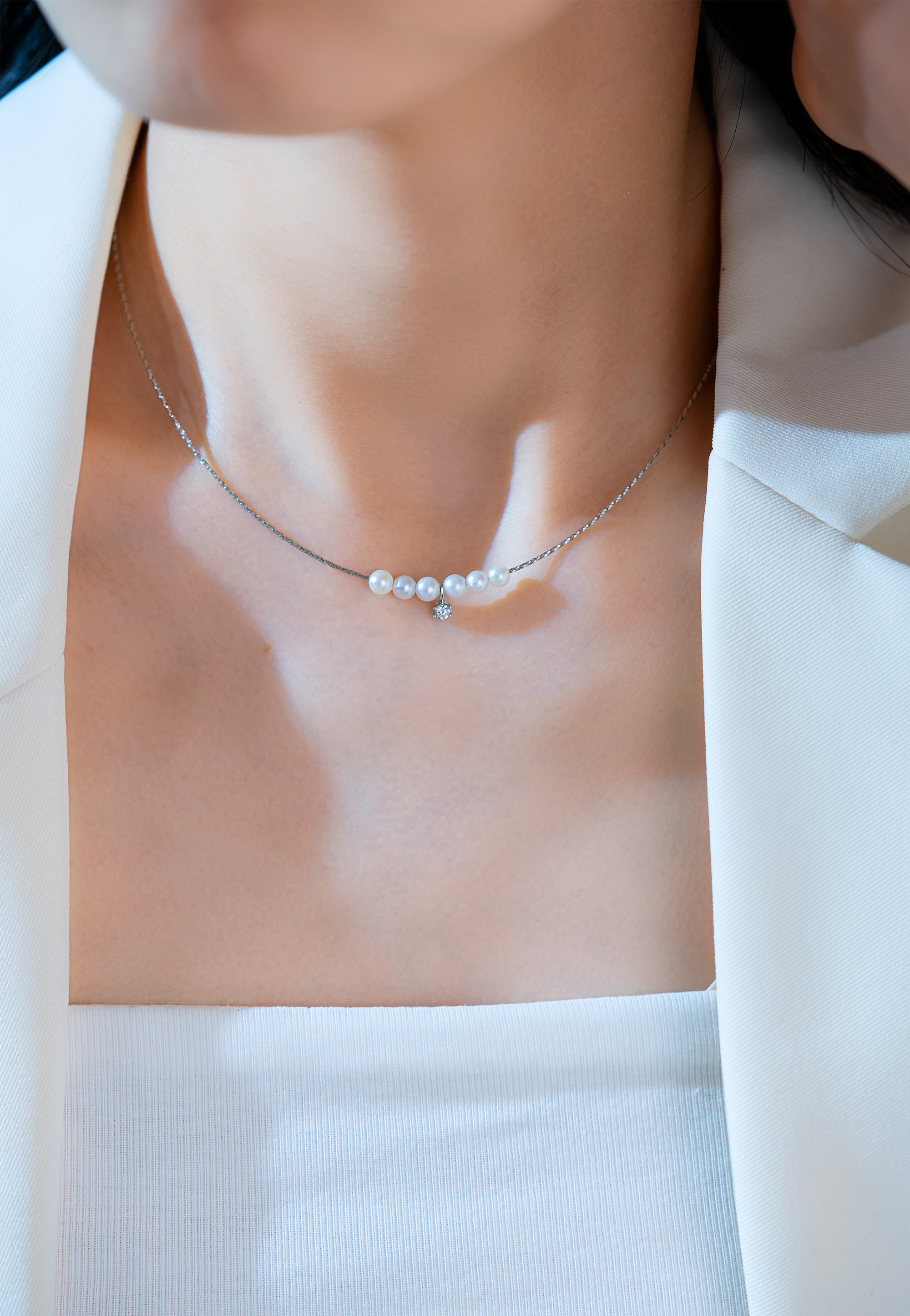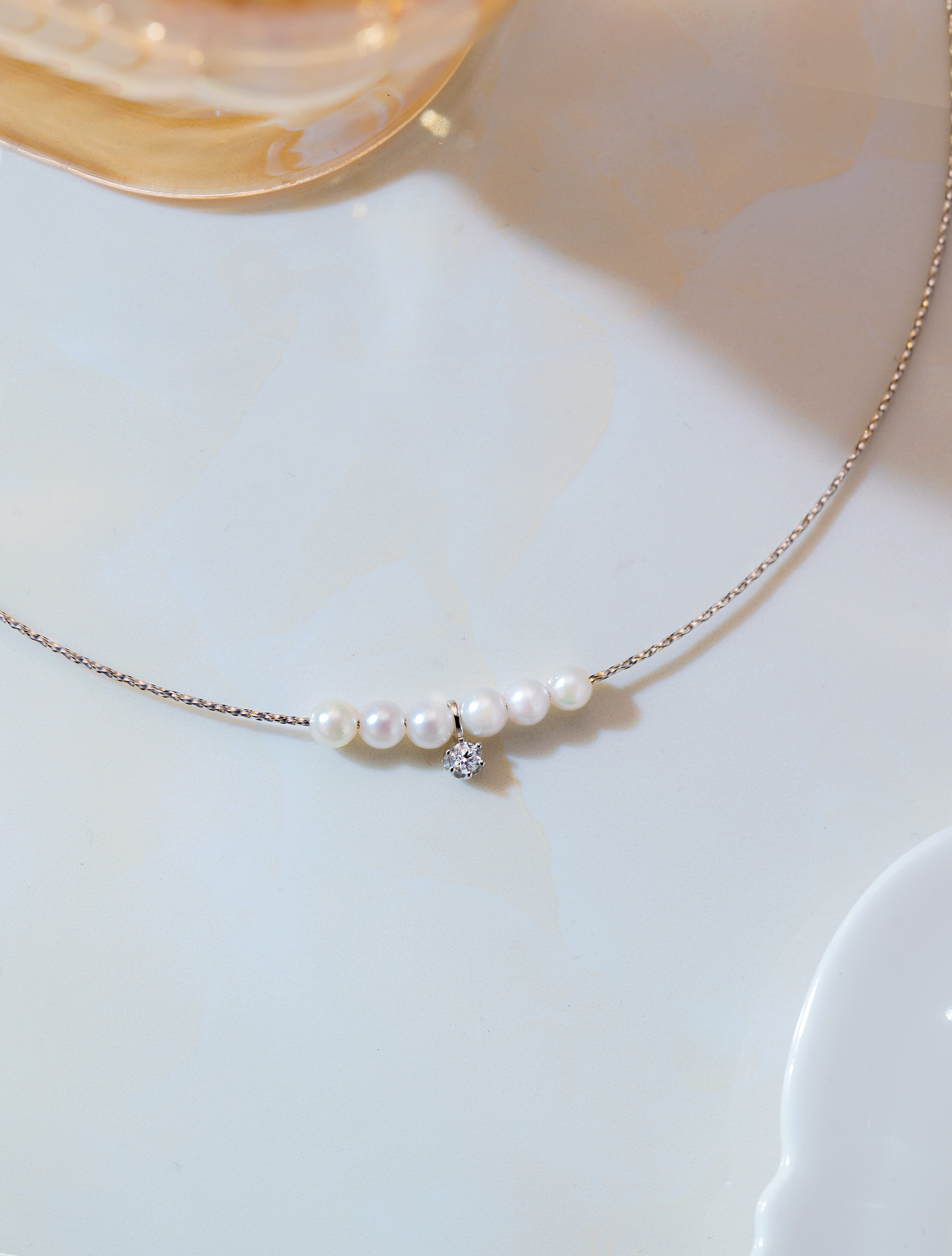 This necklace combines multiple Japanese Baby Akoya pearls with sparkling diamonds,