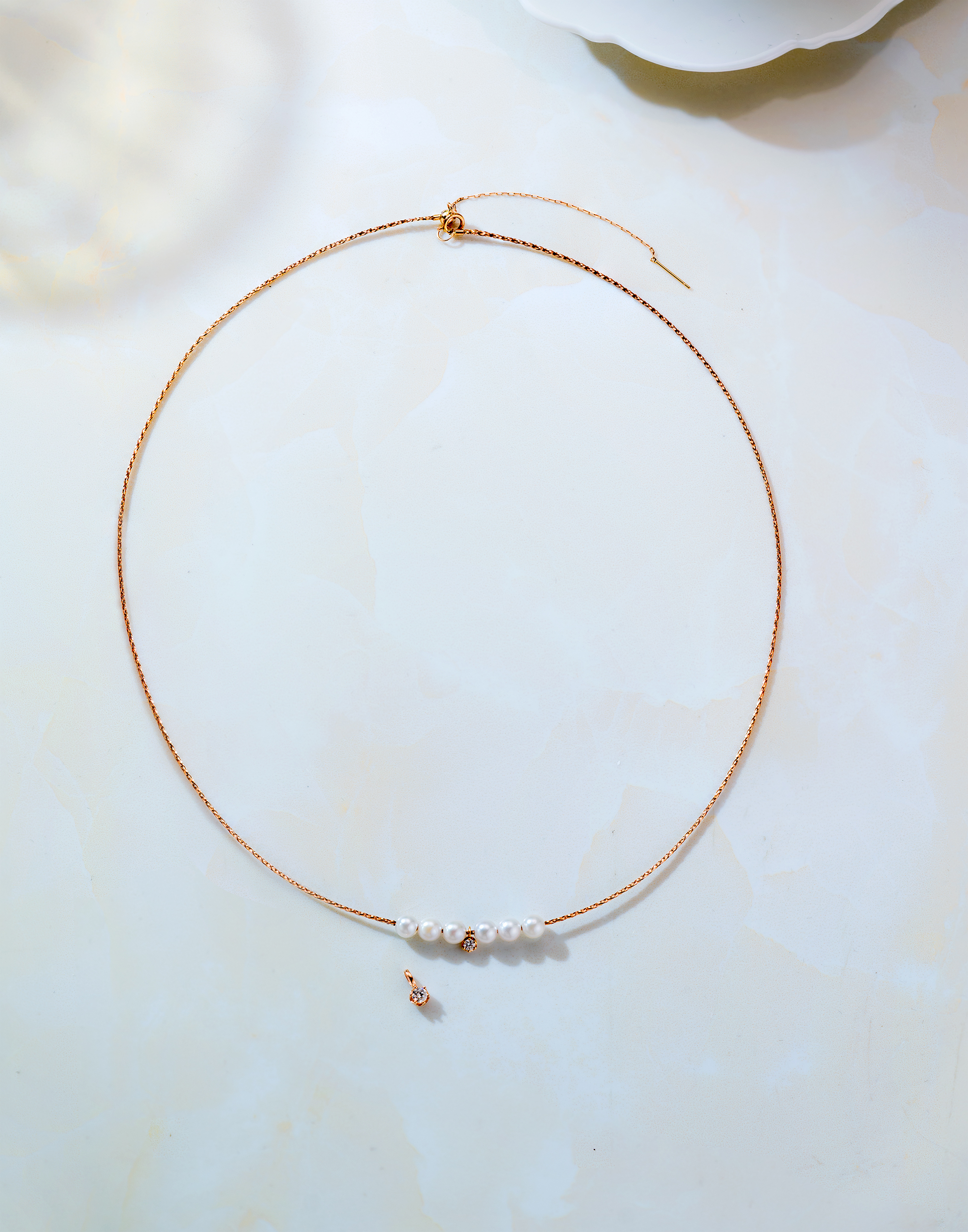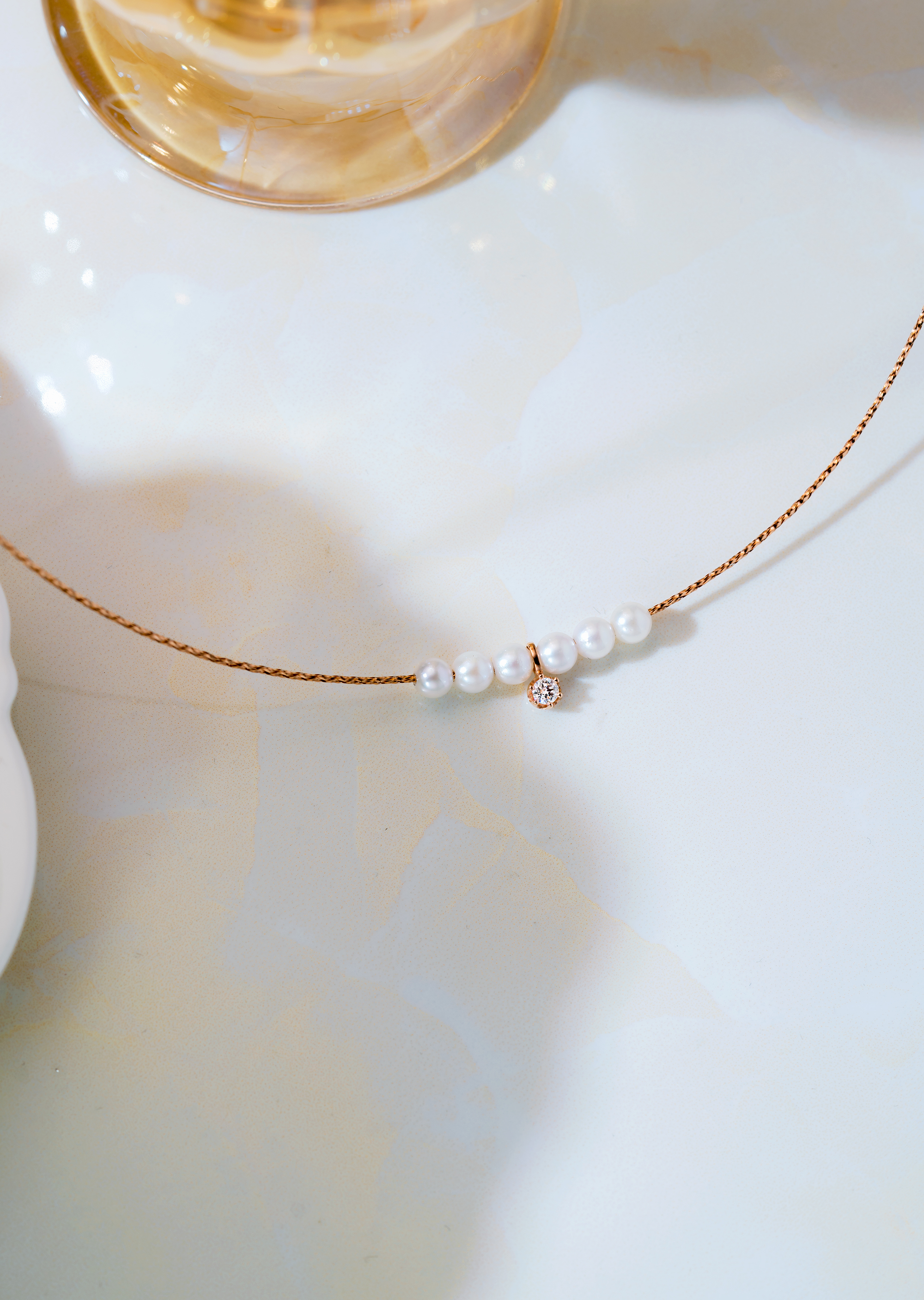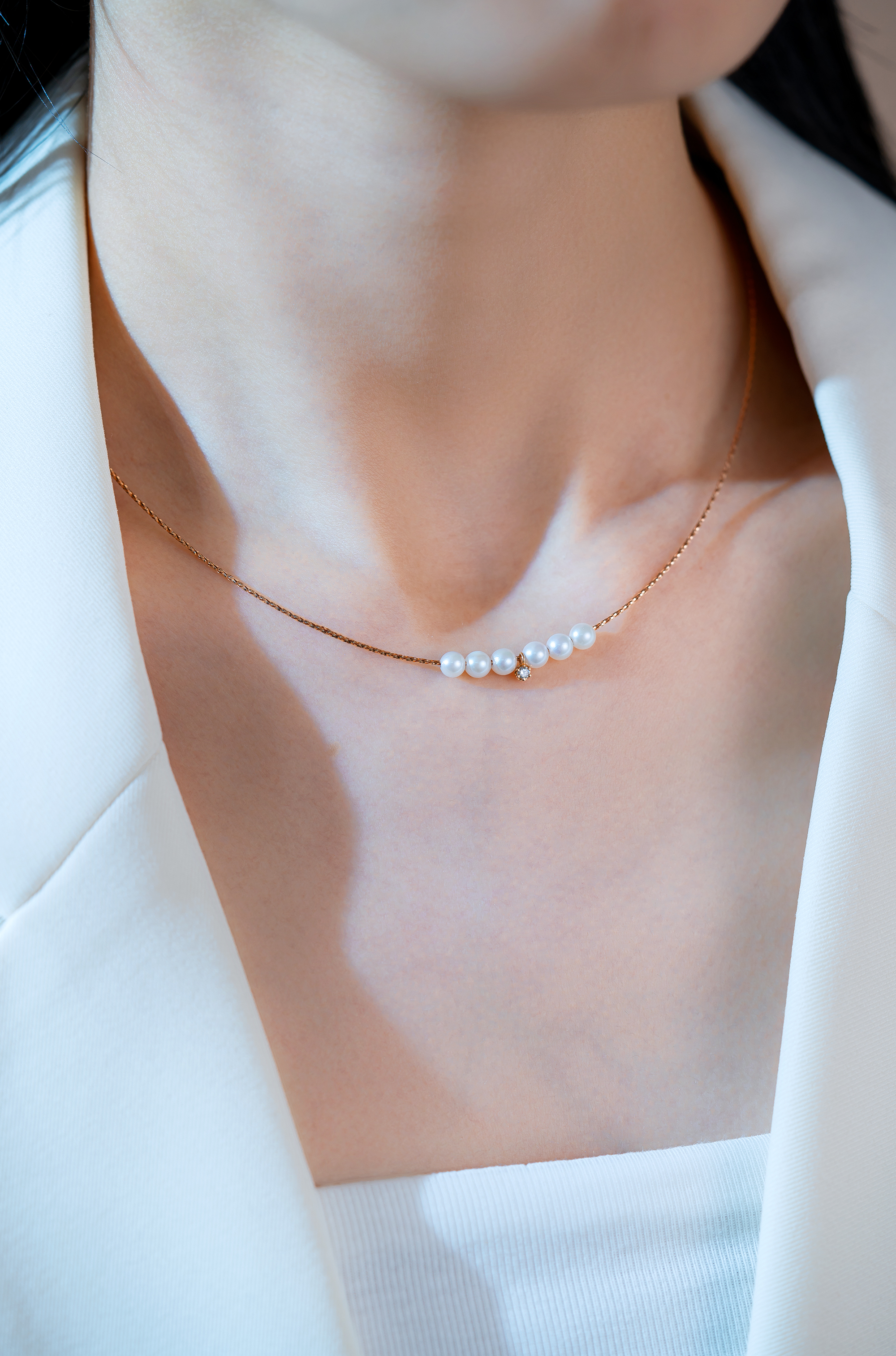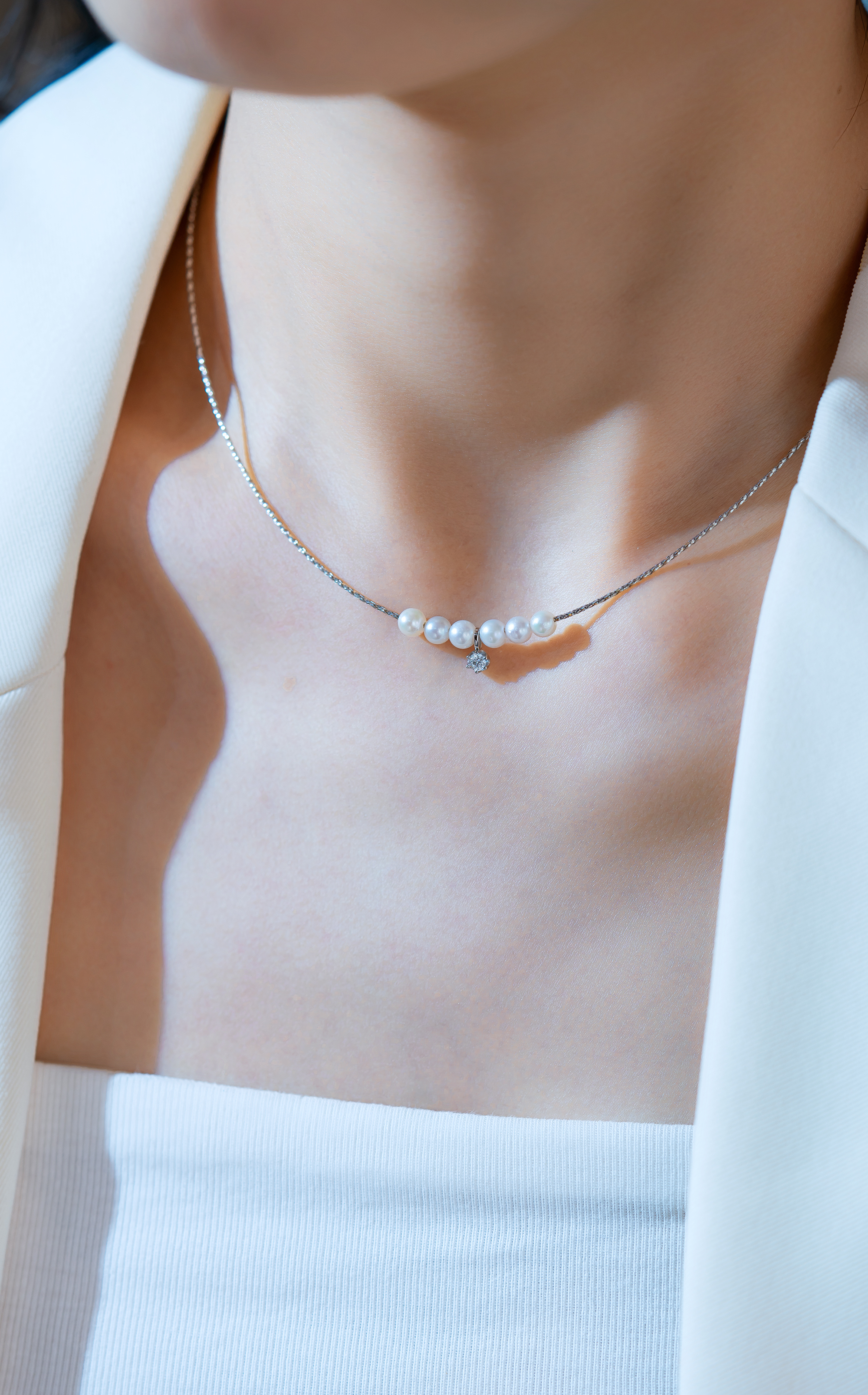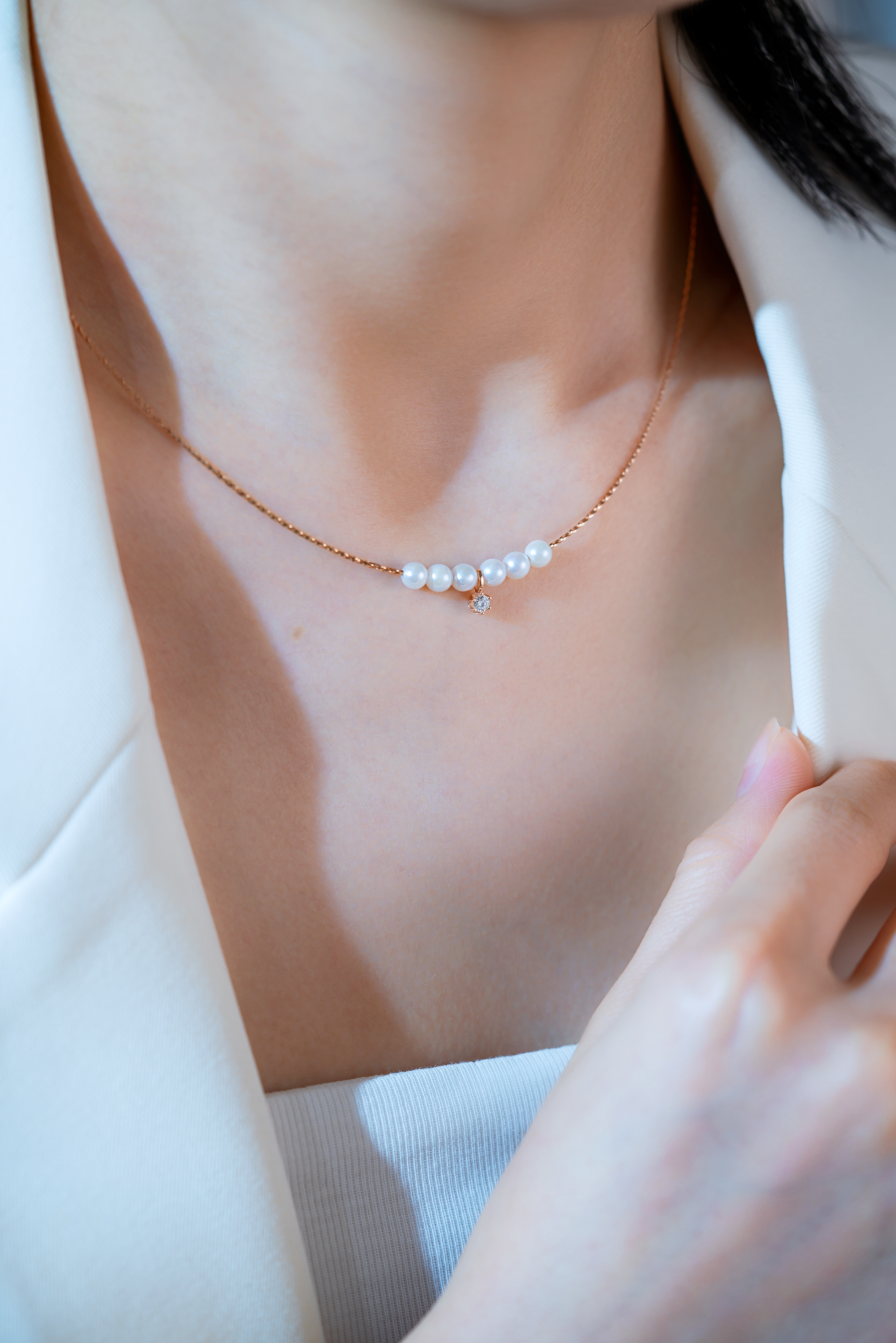 This necklace combines multiple Japanese Baby Akoya pearls with sparkling diamonds,