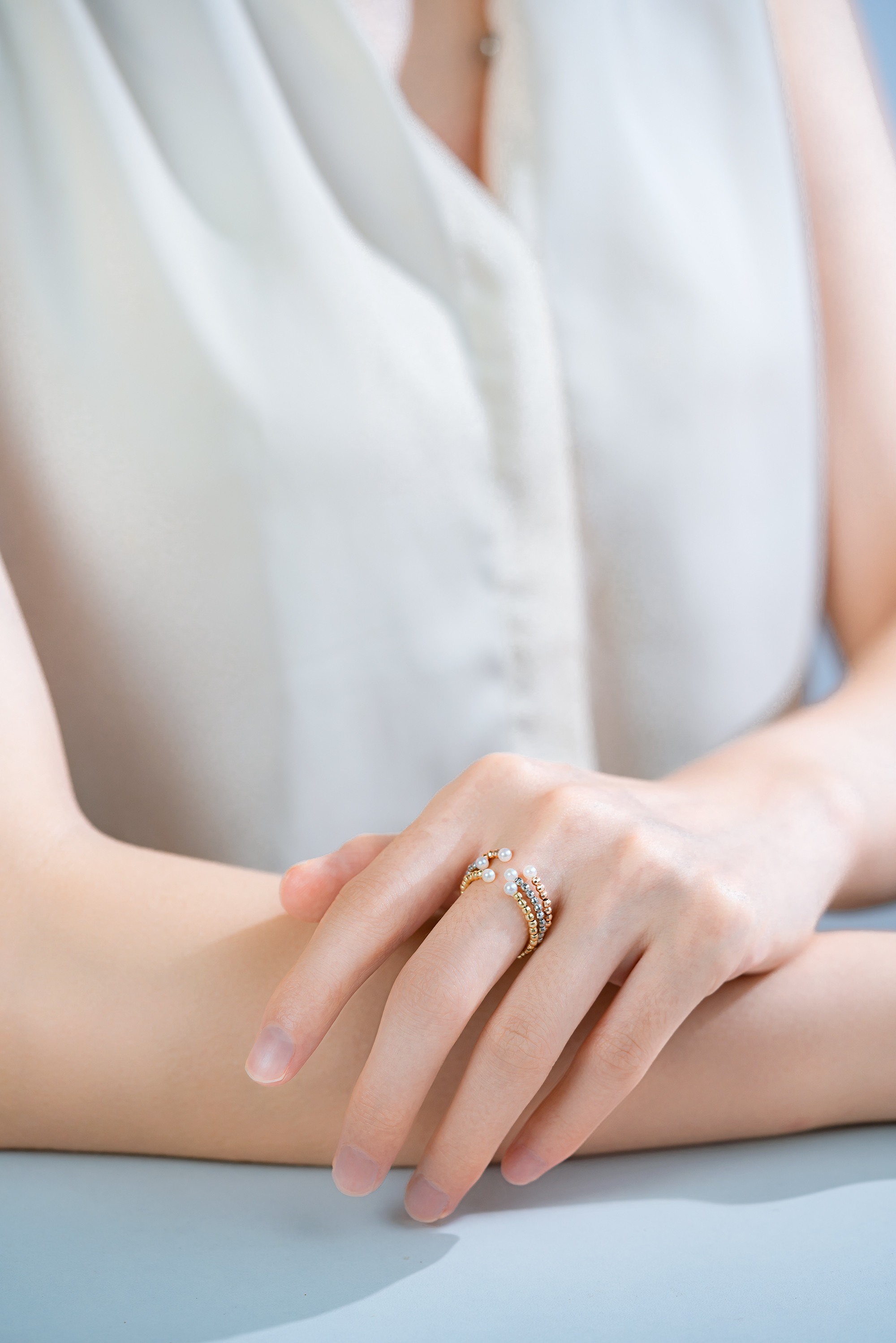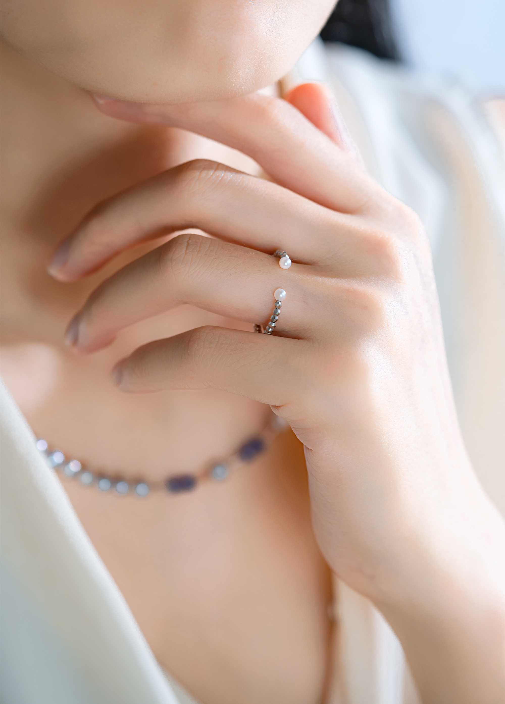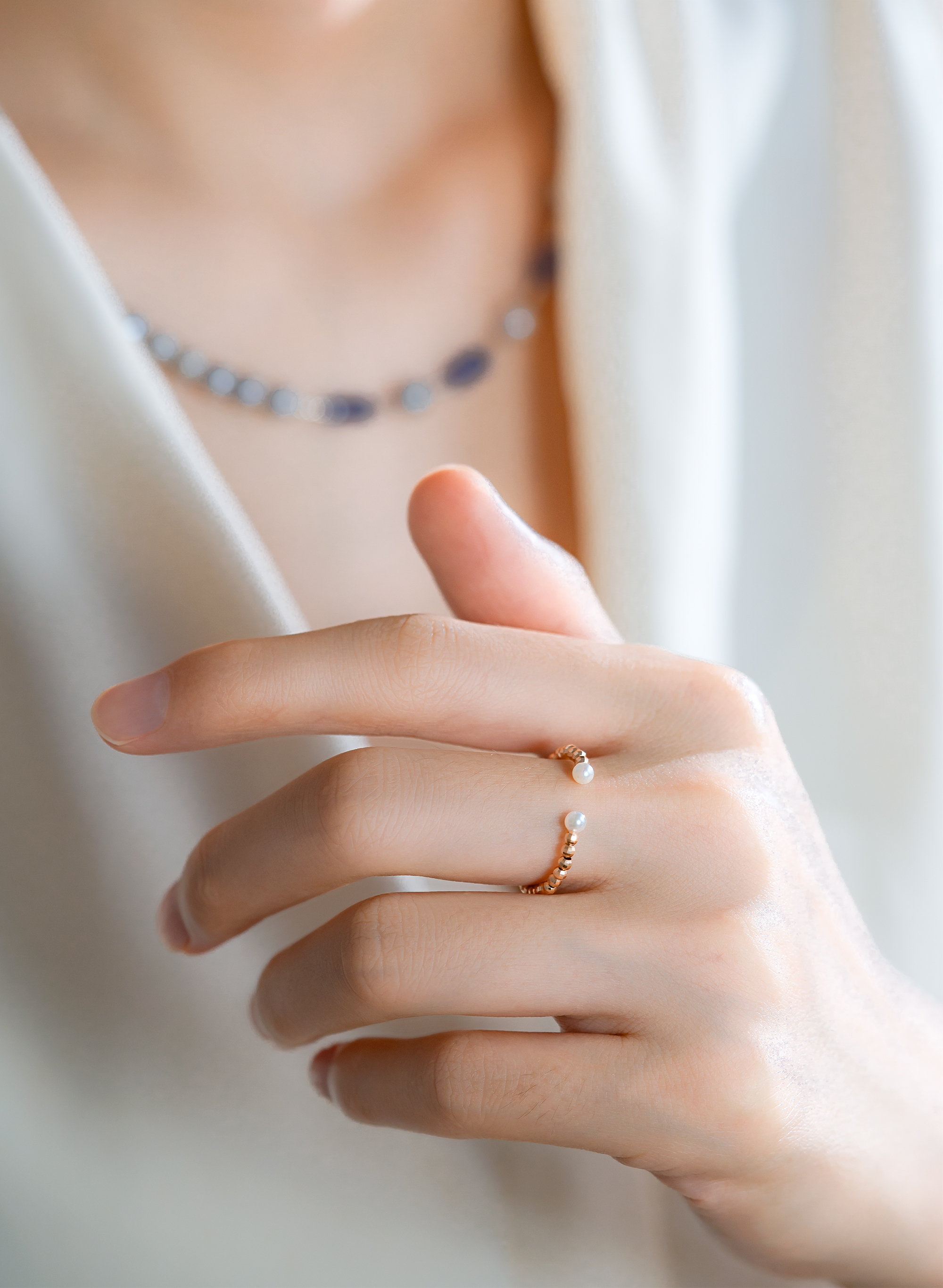This open ring features delicate Baby Akoya pearls on both ends, shimmering with a subtle glow. Crafted in smooth 18K gold, it’s adjustable for a perfect, comfortable fit. Its minimalist design is perfect for stacking, adding a touch of elegant luxury to any look.