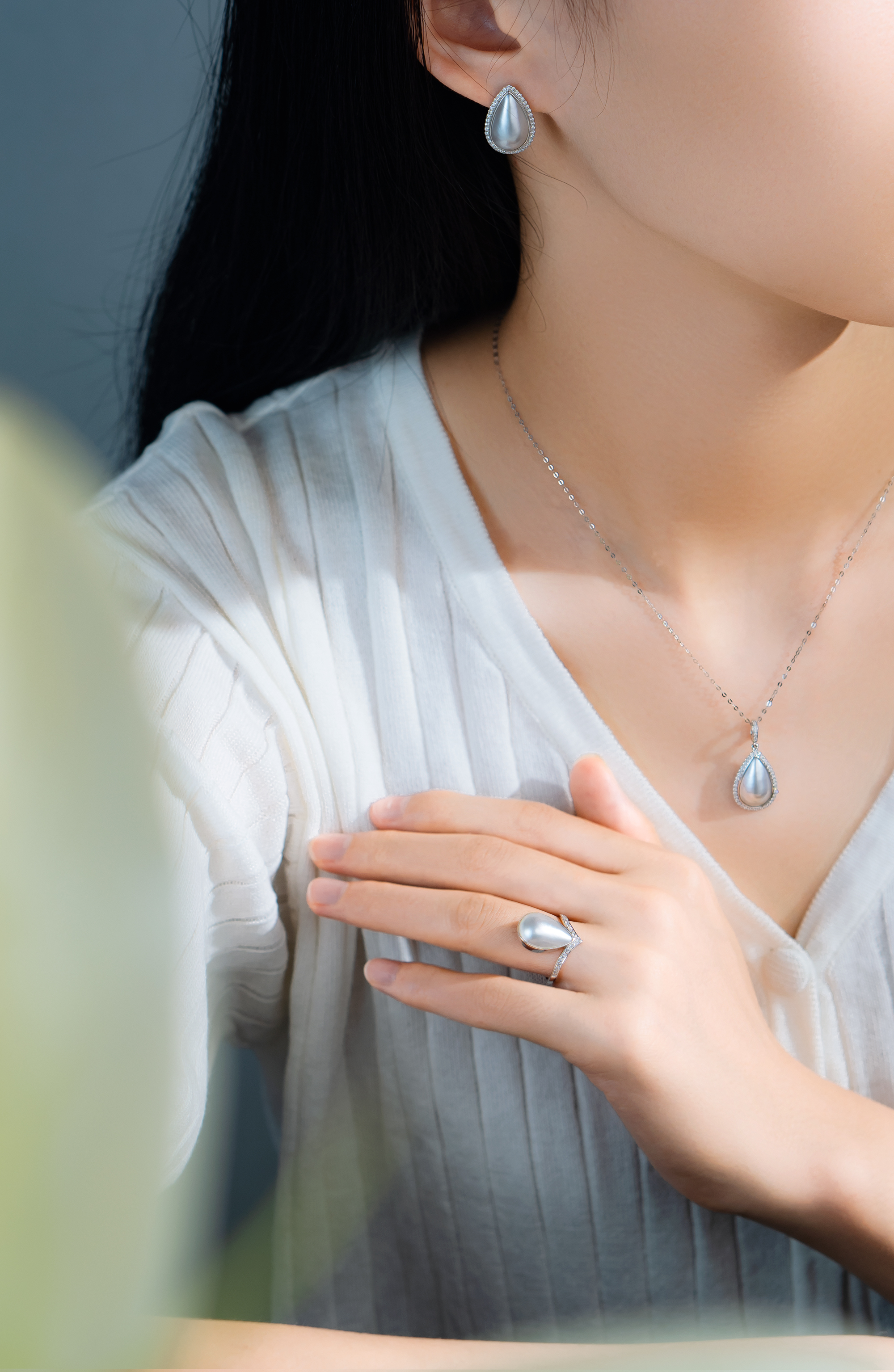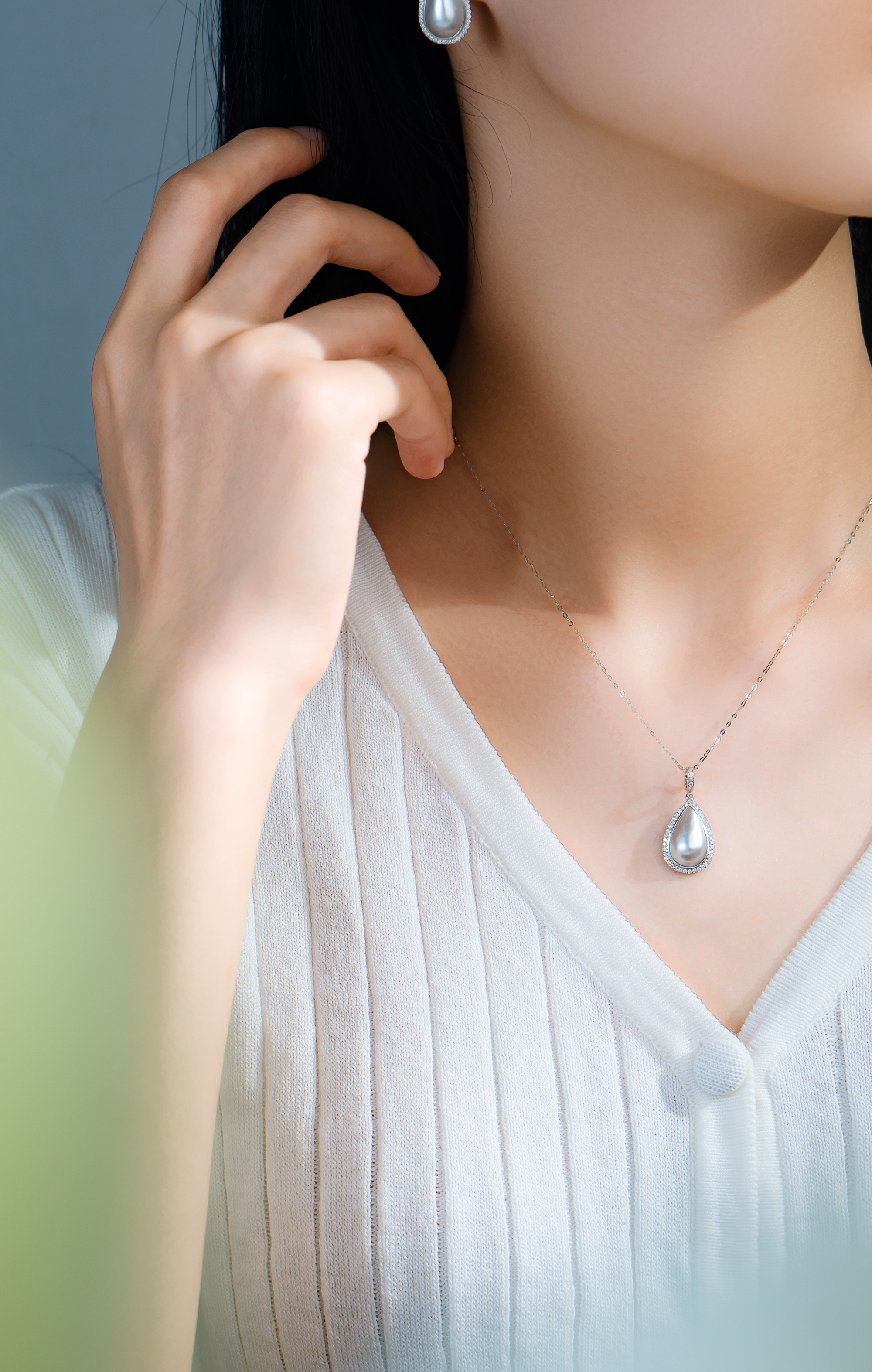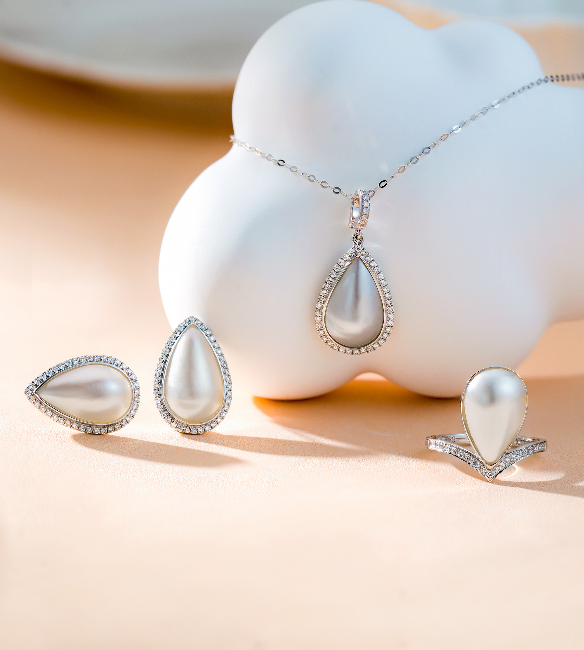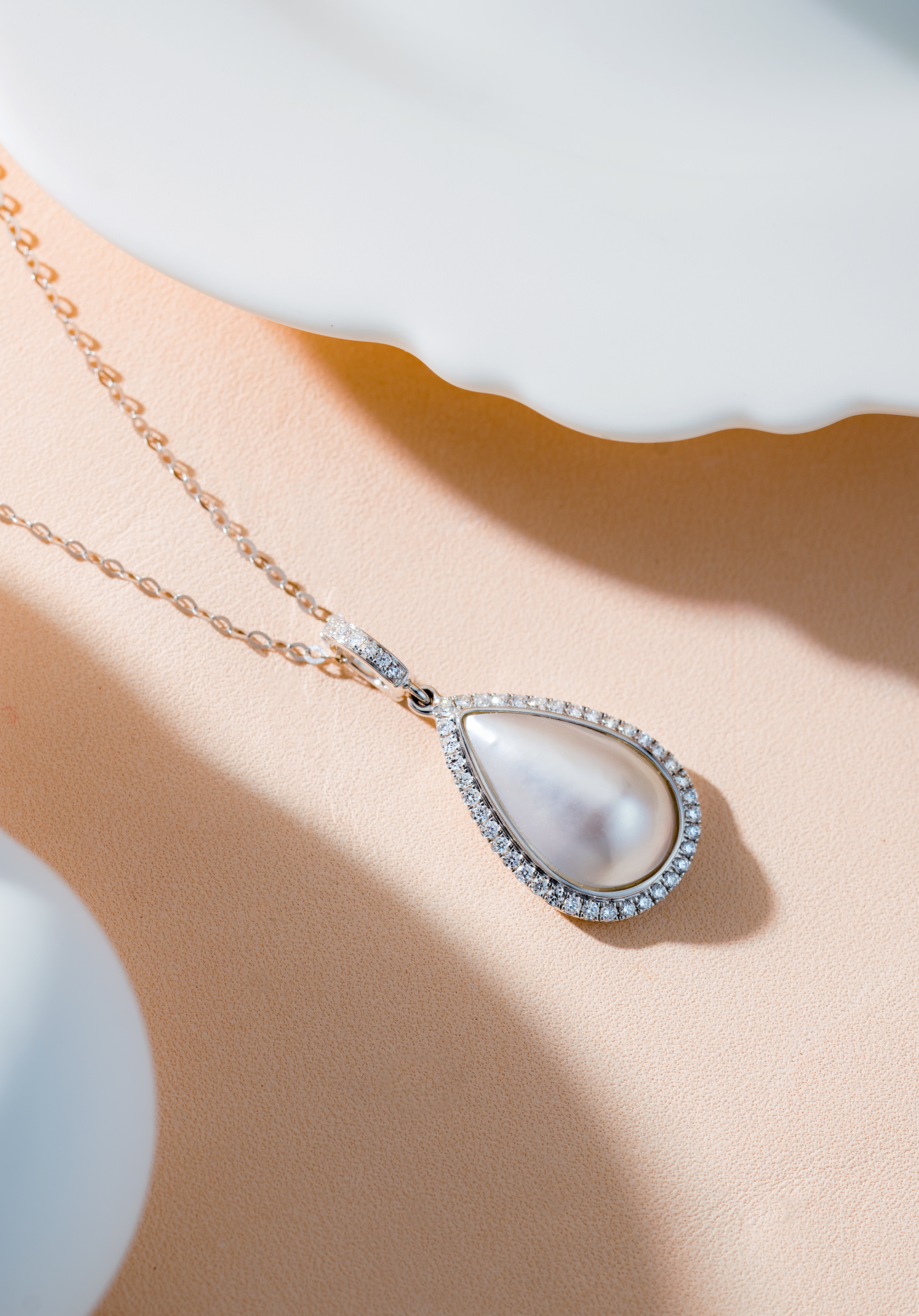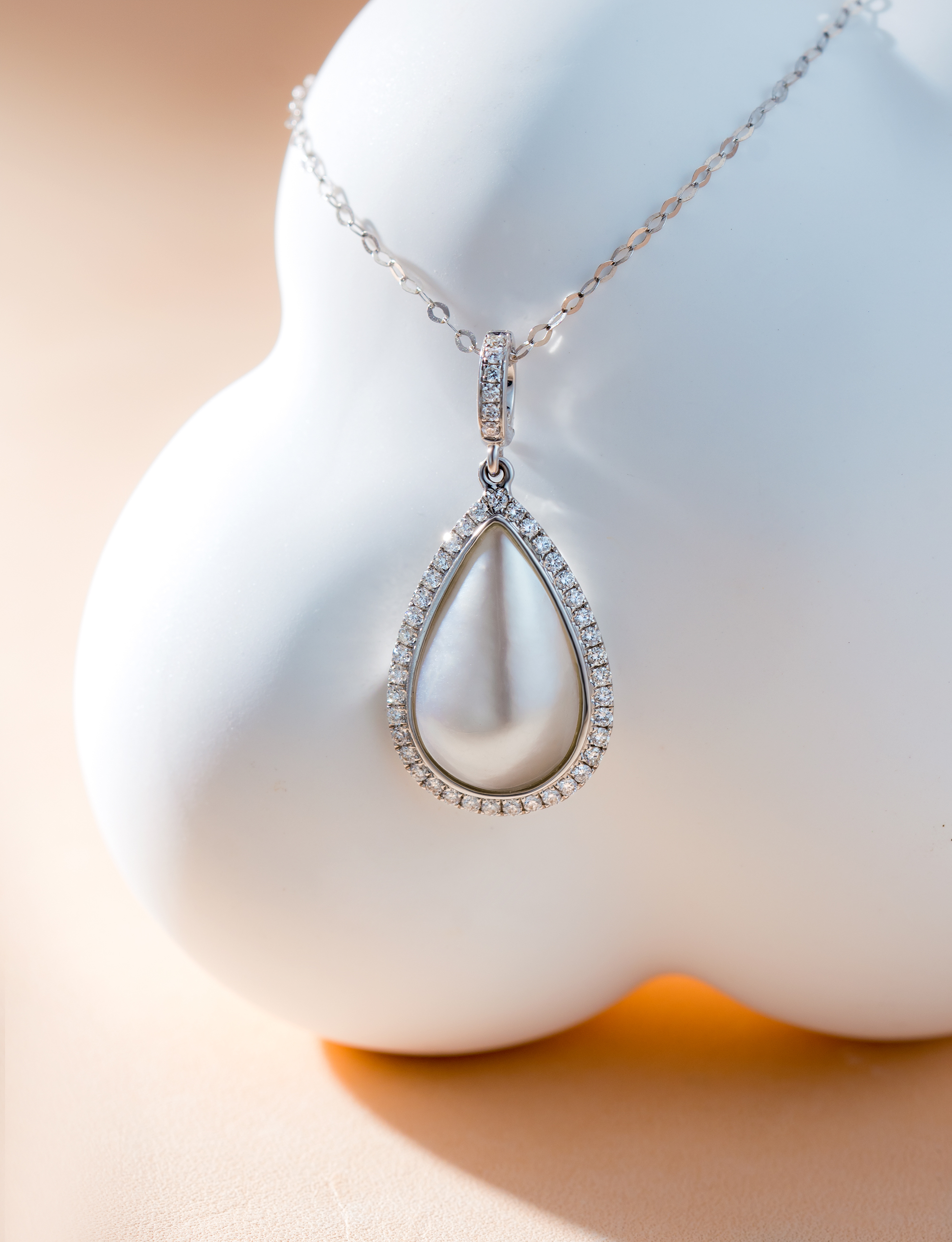 This pendant features a meticulously crafted drop shape, blending the elegance of Southsea White Mabe Pearl with a shimmering diamond halo.