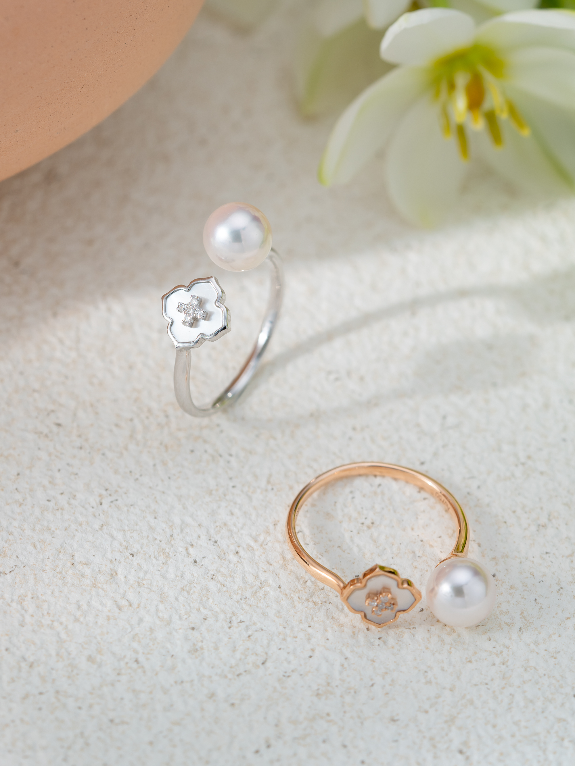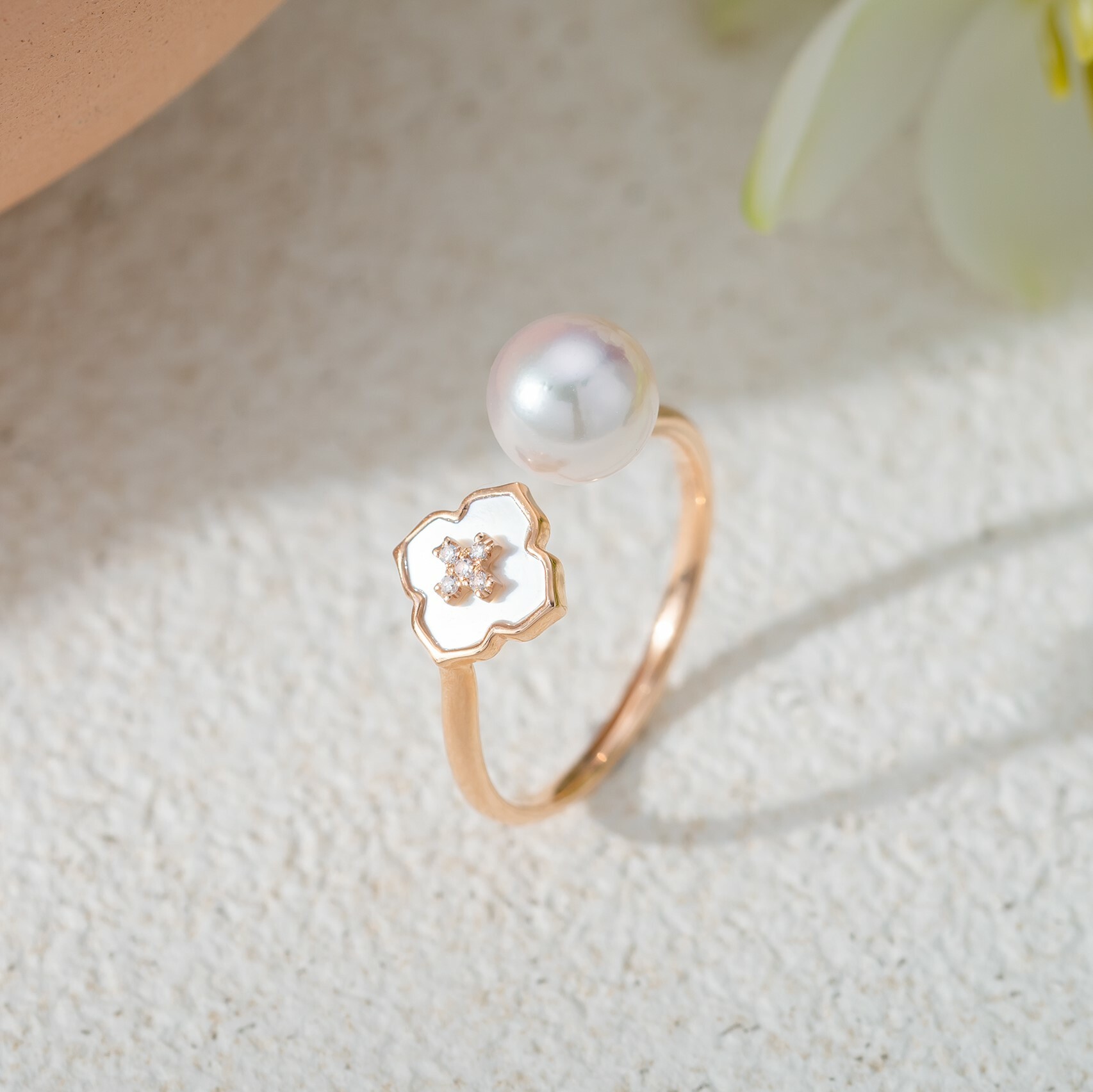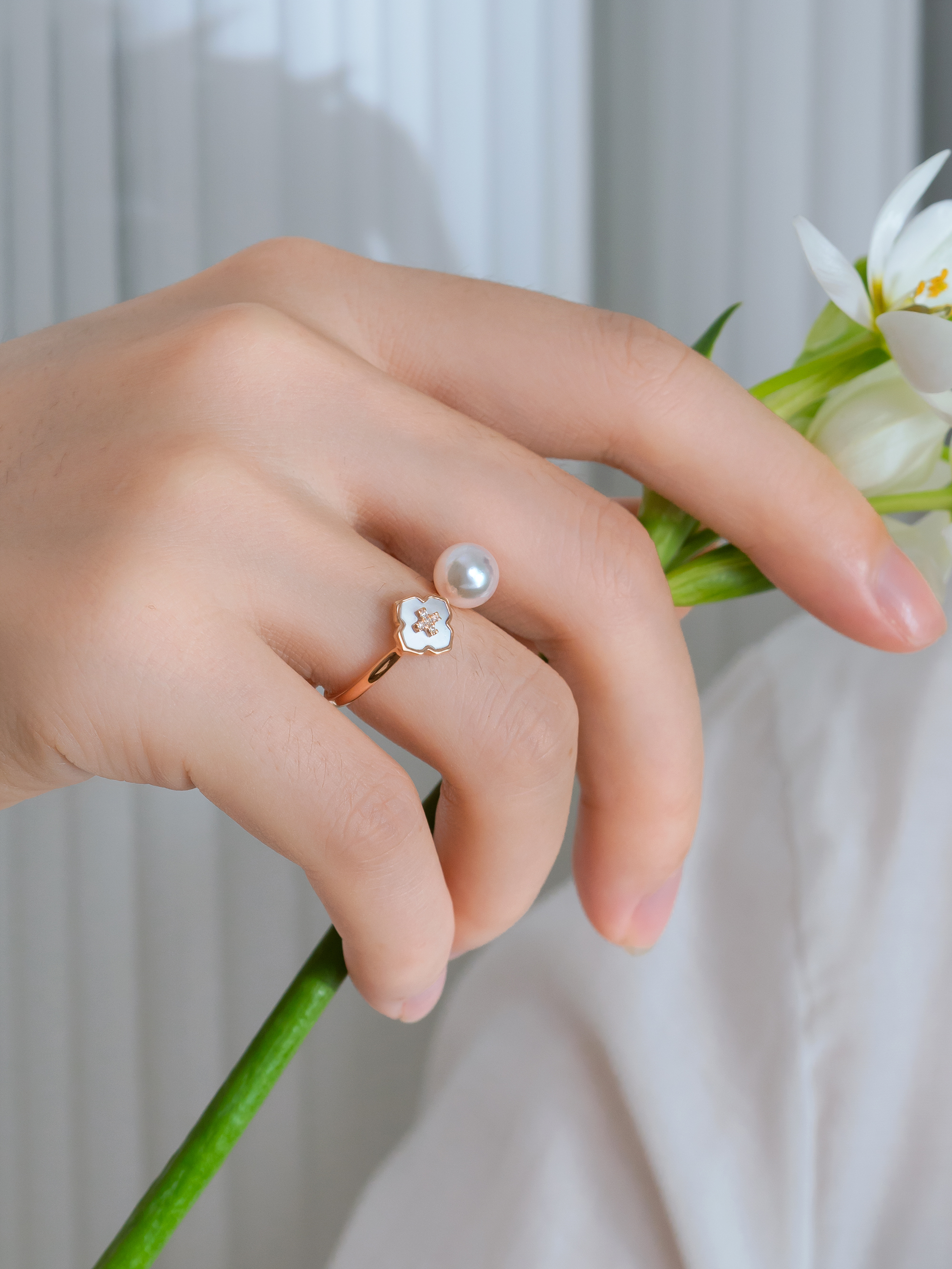 This ring offers a luxurious jewelry experience. With stunning akoya mother-of-pearl, it exudes an elegant rainbow-like luster. The flower-shaped design, adorned with sparkling diamonds, adds a touch of grandeur. When worn, it blossoms like a radiant flower, exuding grace and charm.