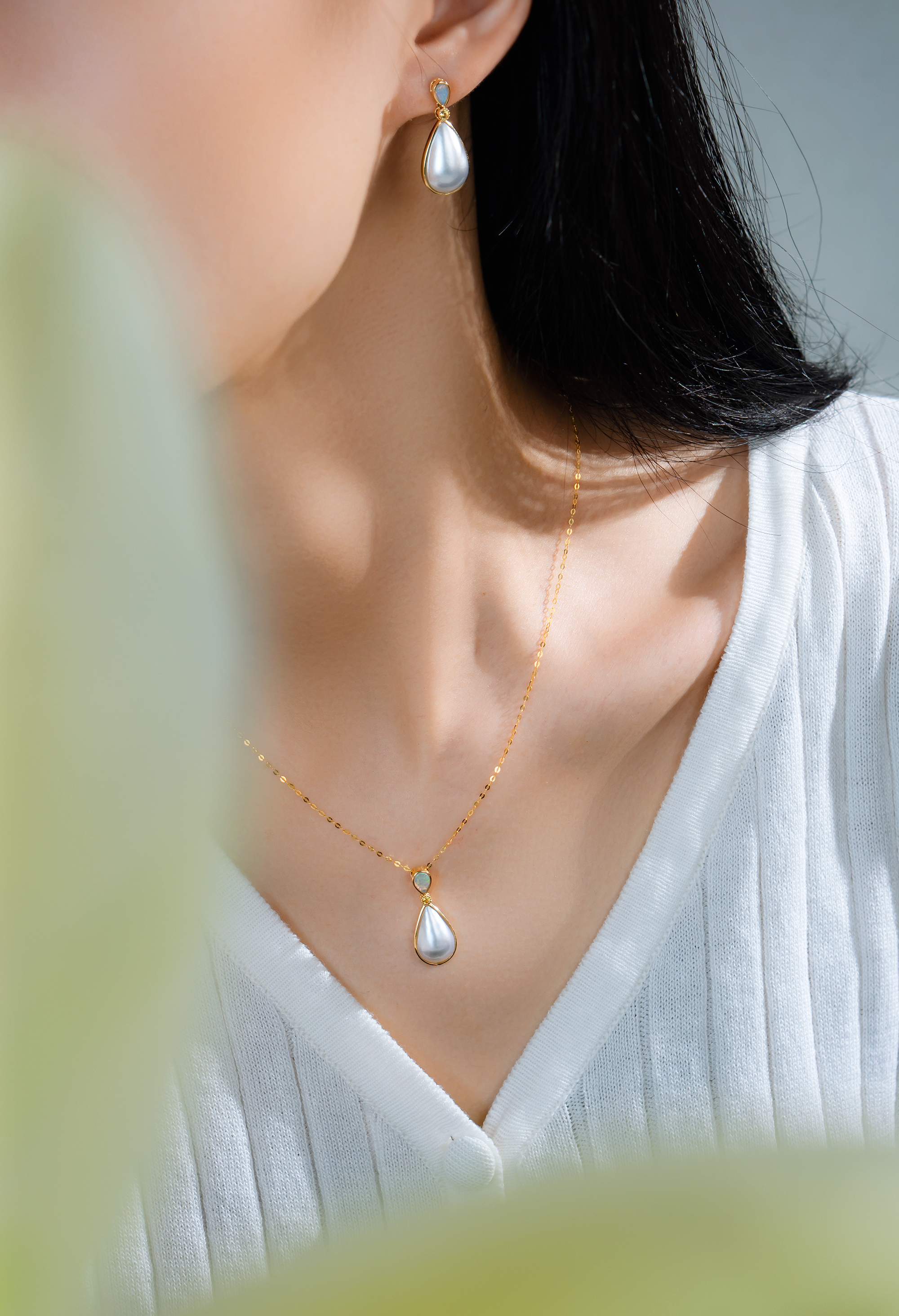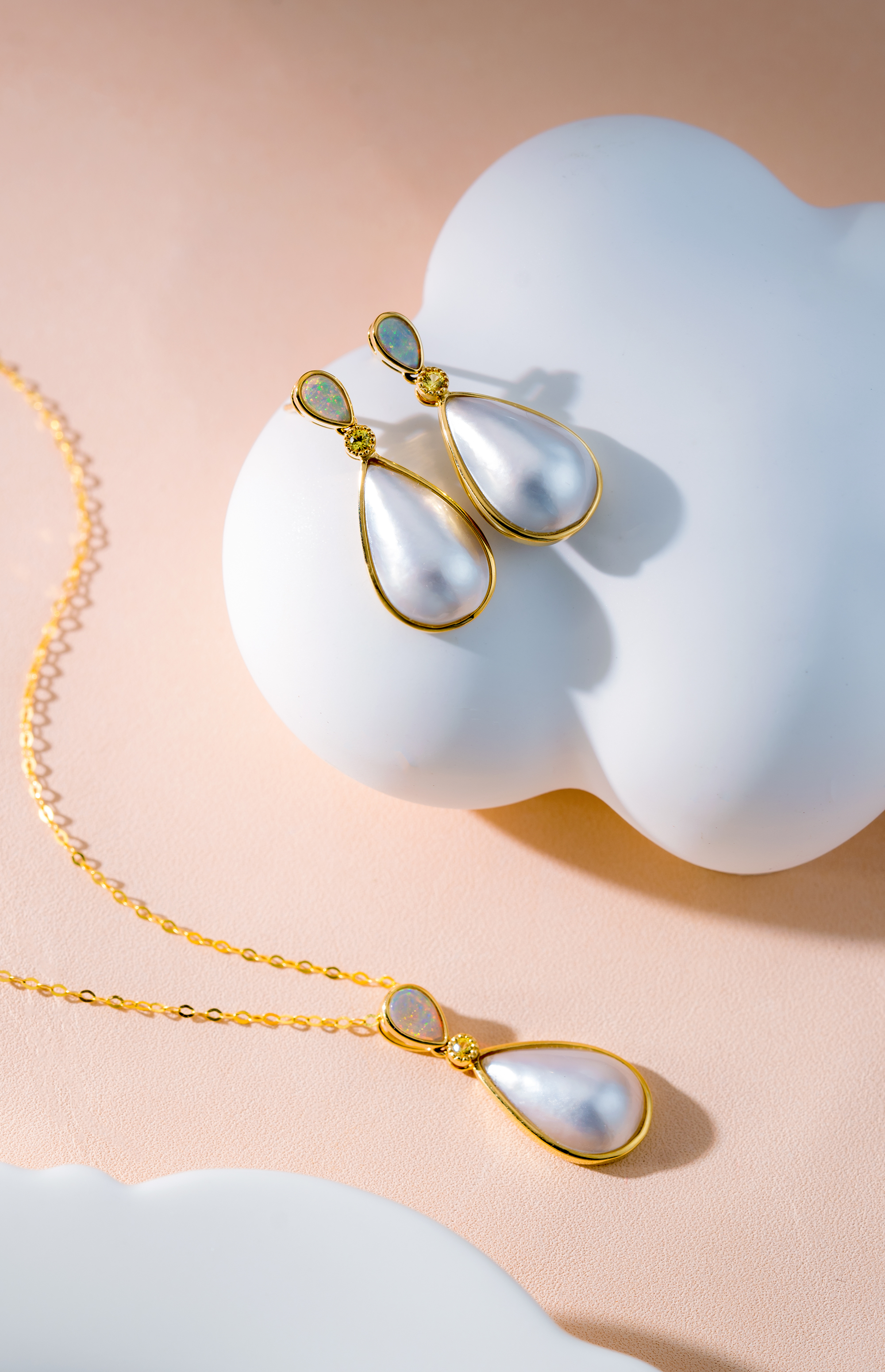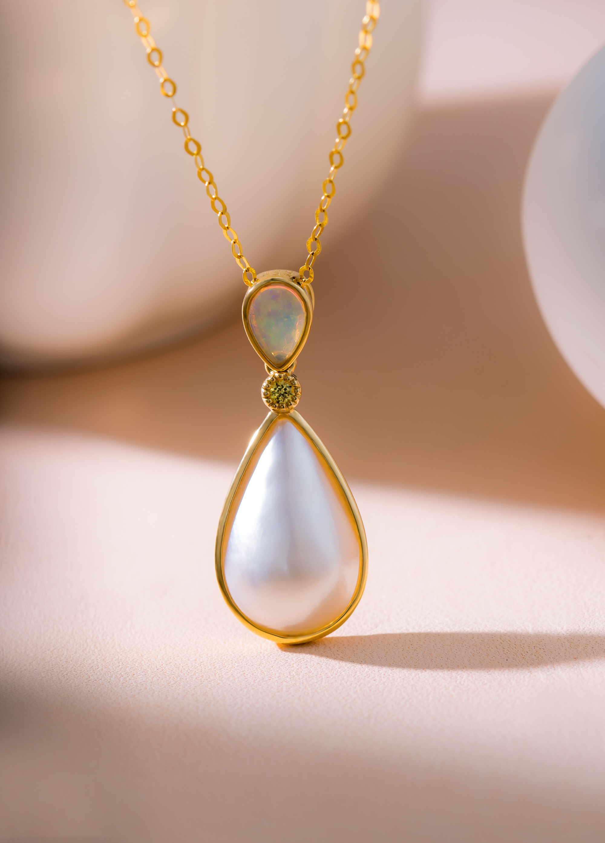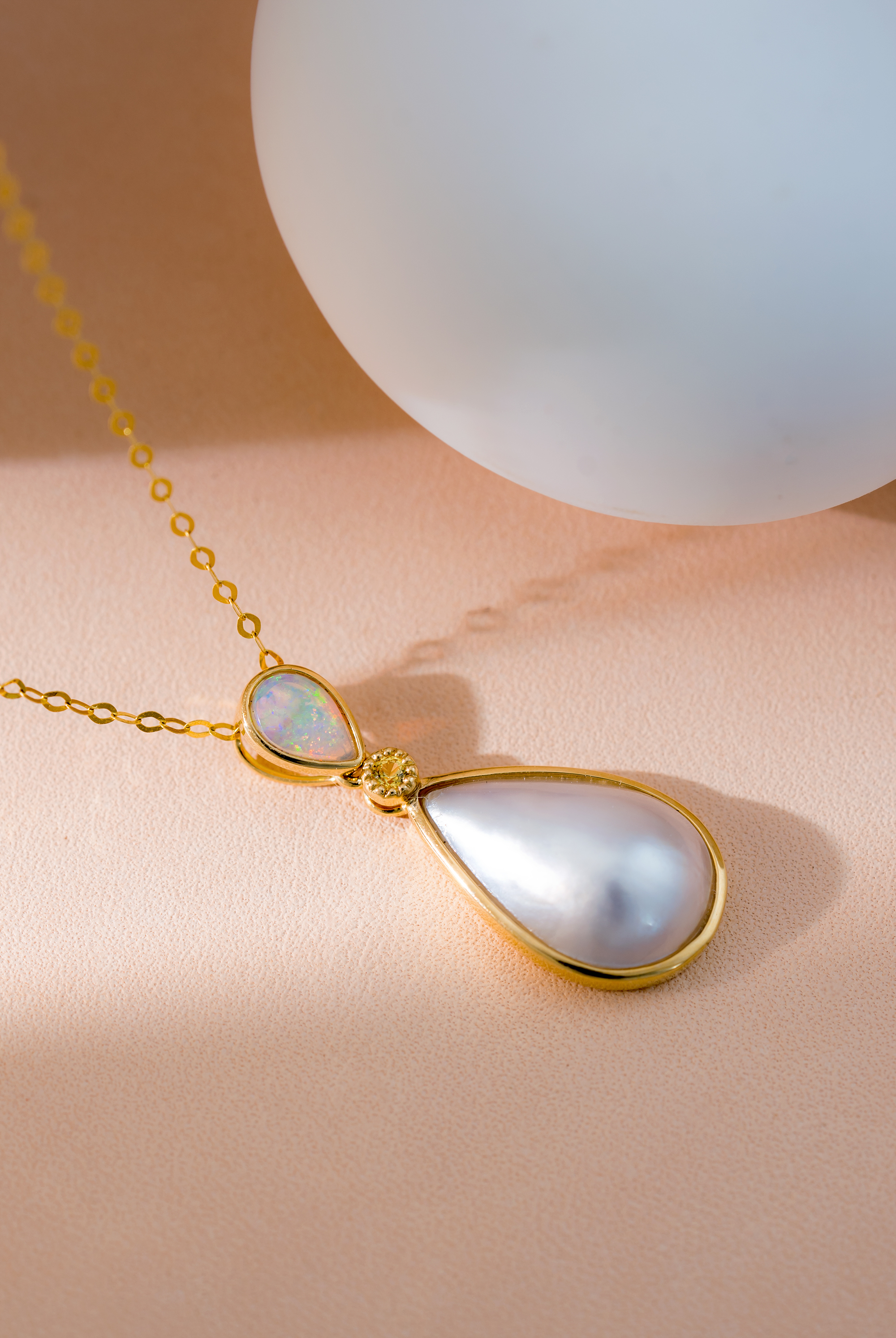 It's definitely a noble pendant, combing a unique double drop shaped design with Southsea White Mabe Pearl and Opal, complemented by a sparkling Yellow Sapphire connecting the two. Resonating with 18K gold, capturing a moment of wonder in time. It adds a unique touch of elegance to your style.