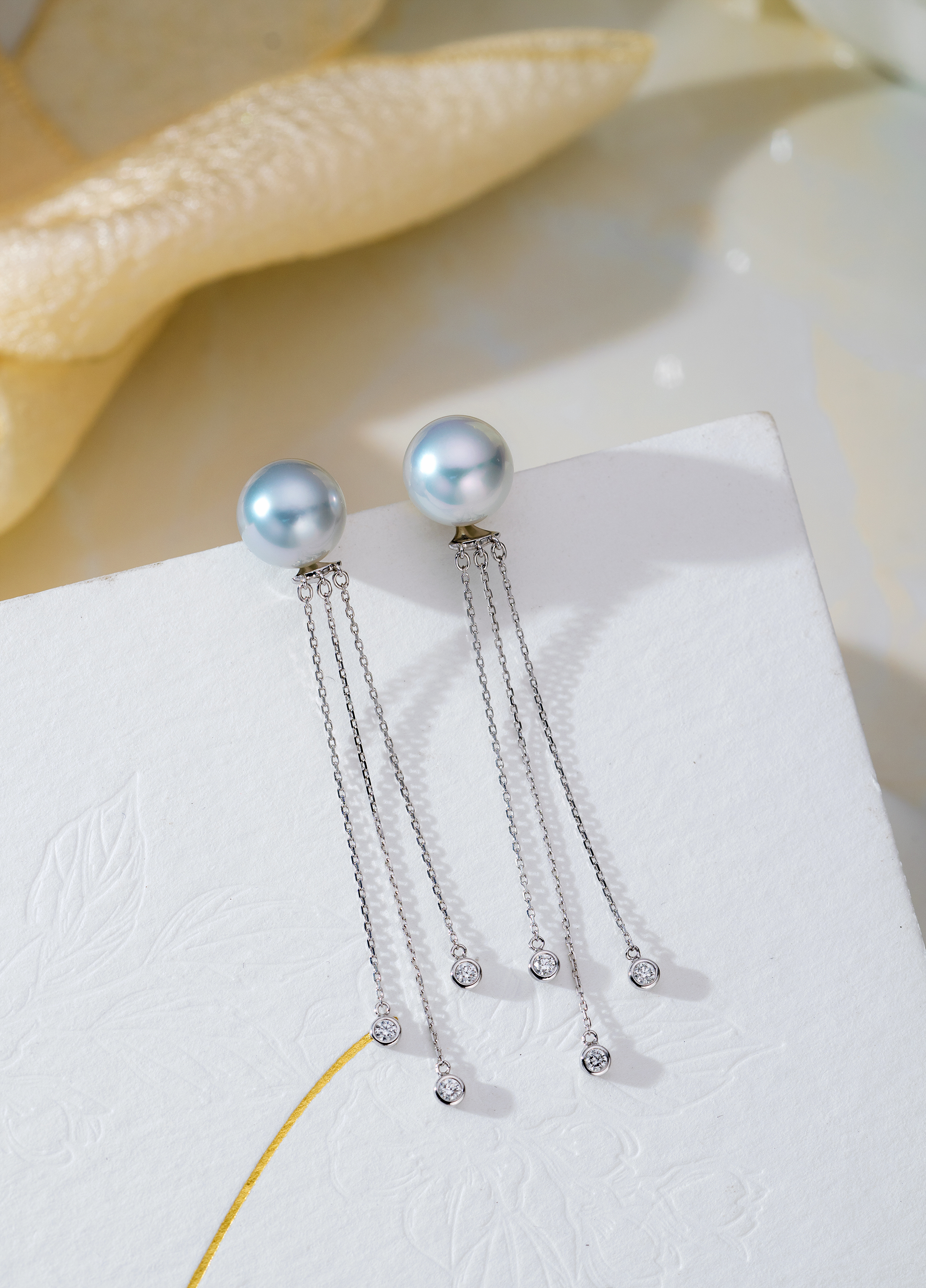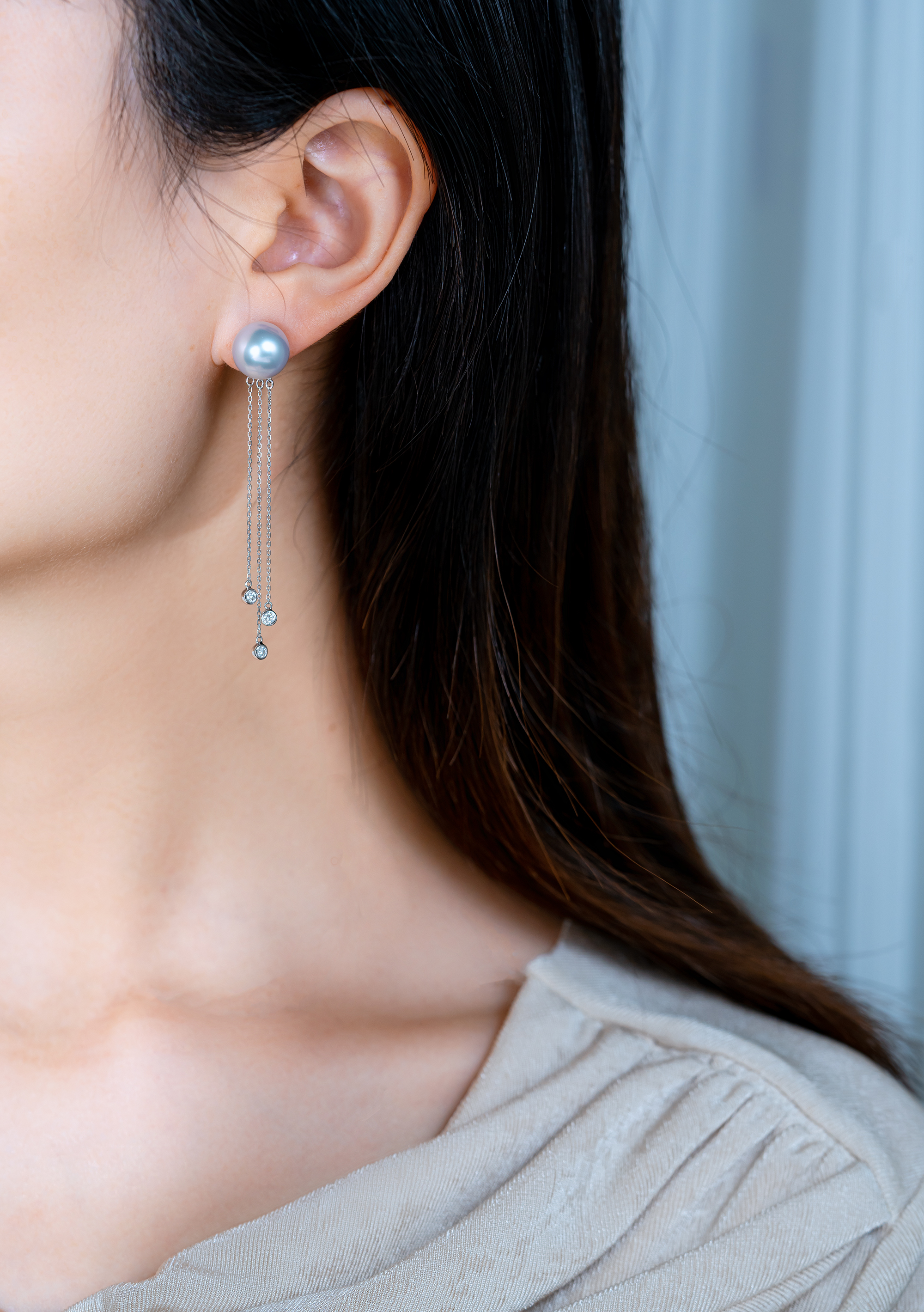 The Australian pearls are paired with three strands of 18K white gold of varying lengths to create the dangling part of the earring, with a diamond set at the end of each strand. The earrings sway with the wind, exuding a refreshing summer vibe like ocean waves, creating a strong visual impact.