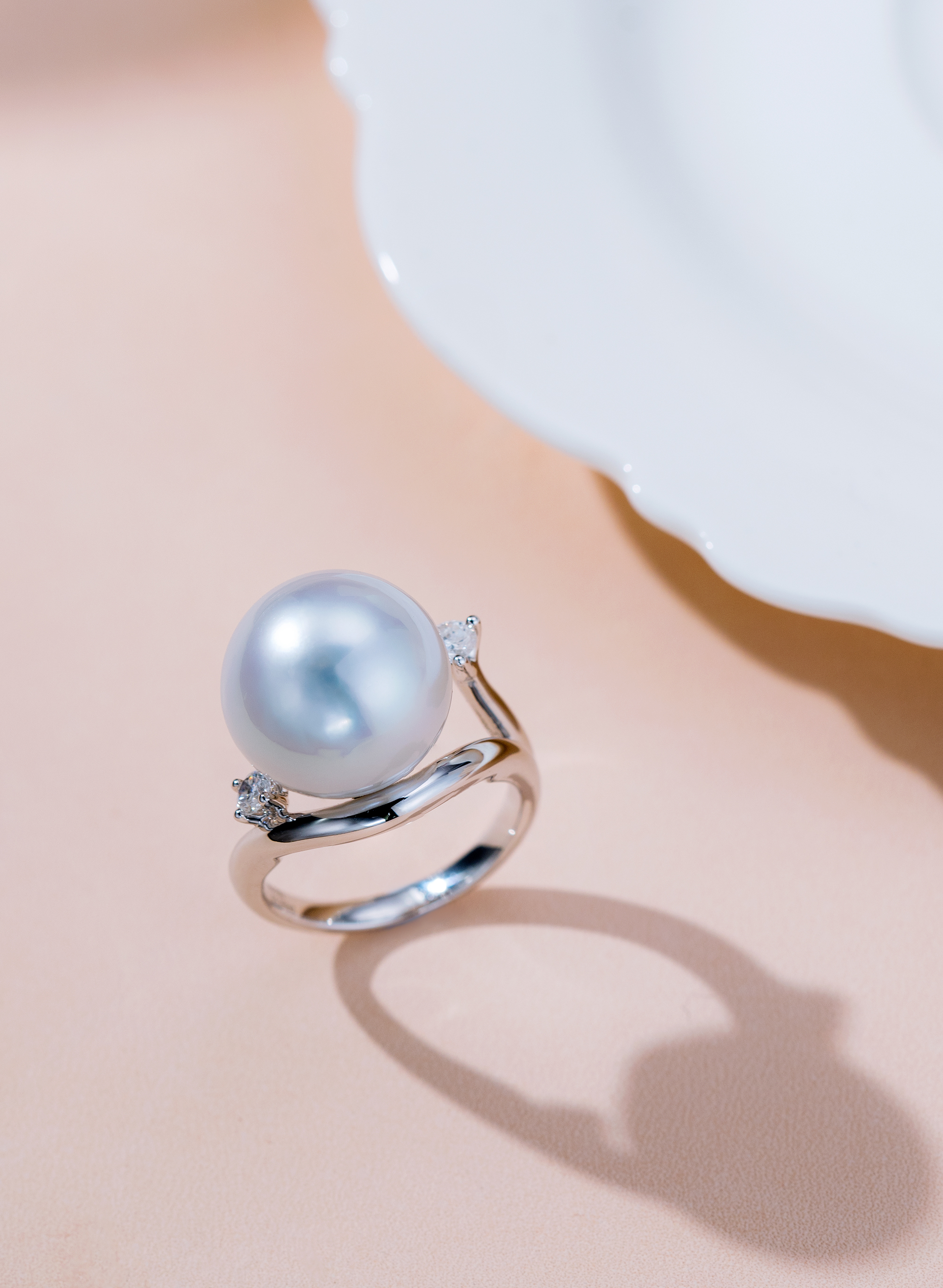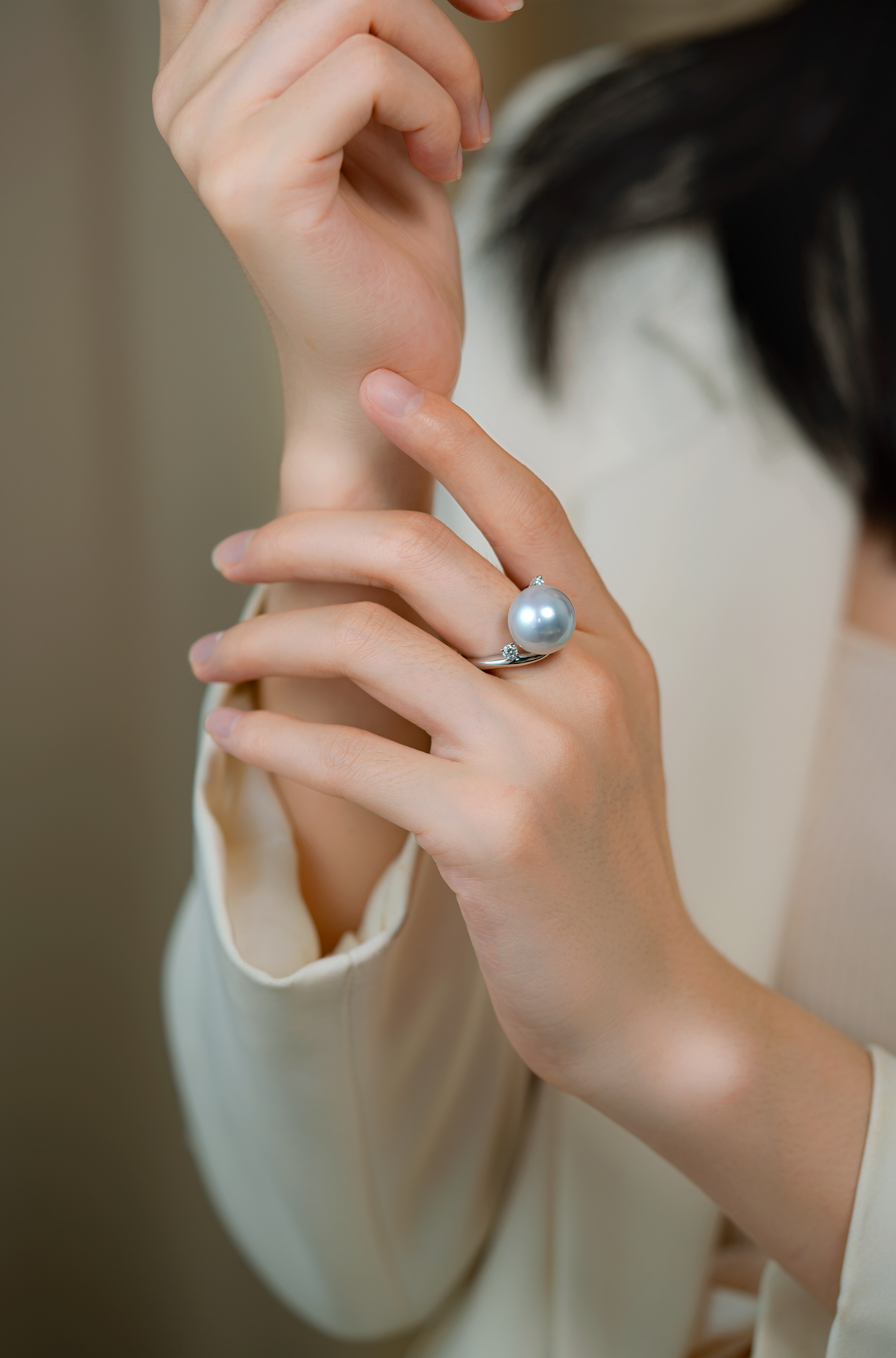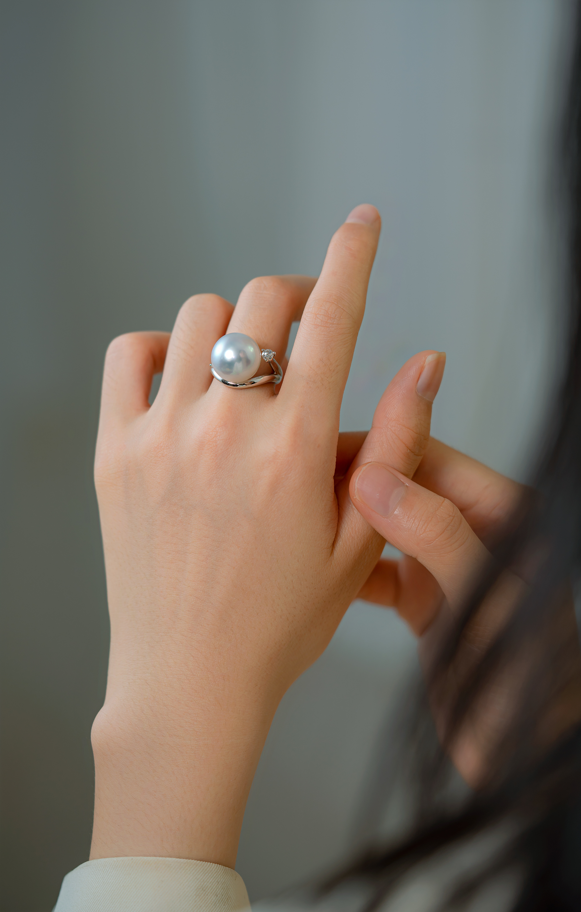 This ring features a large 14-15mm Southsea White Pearl, with its smooth and glistening surface emanating a subtle and alluring charm.