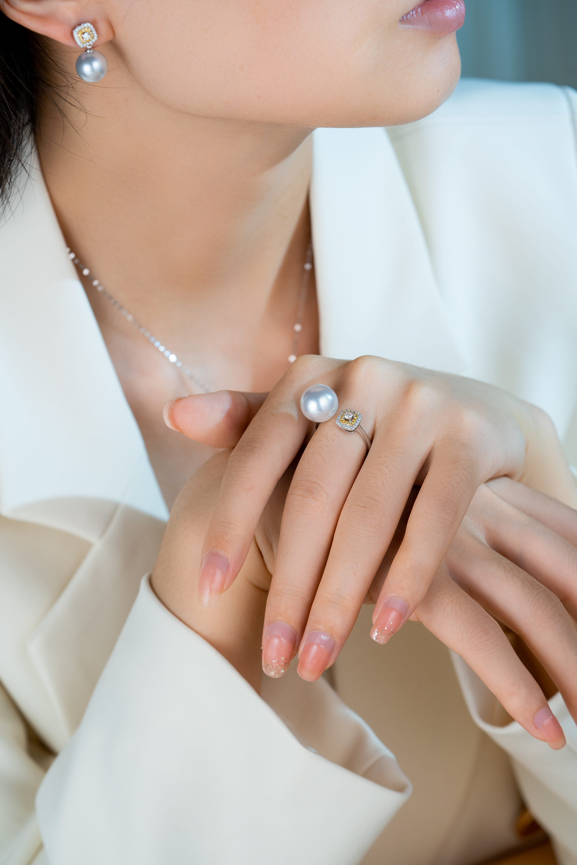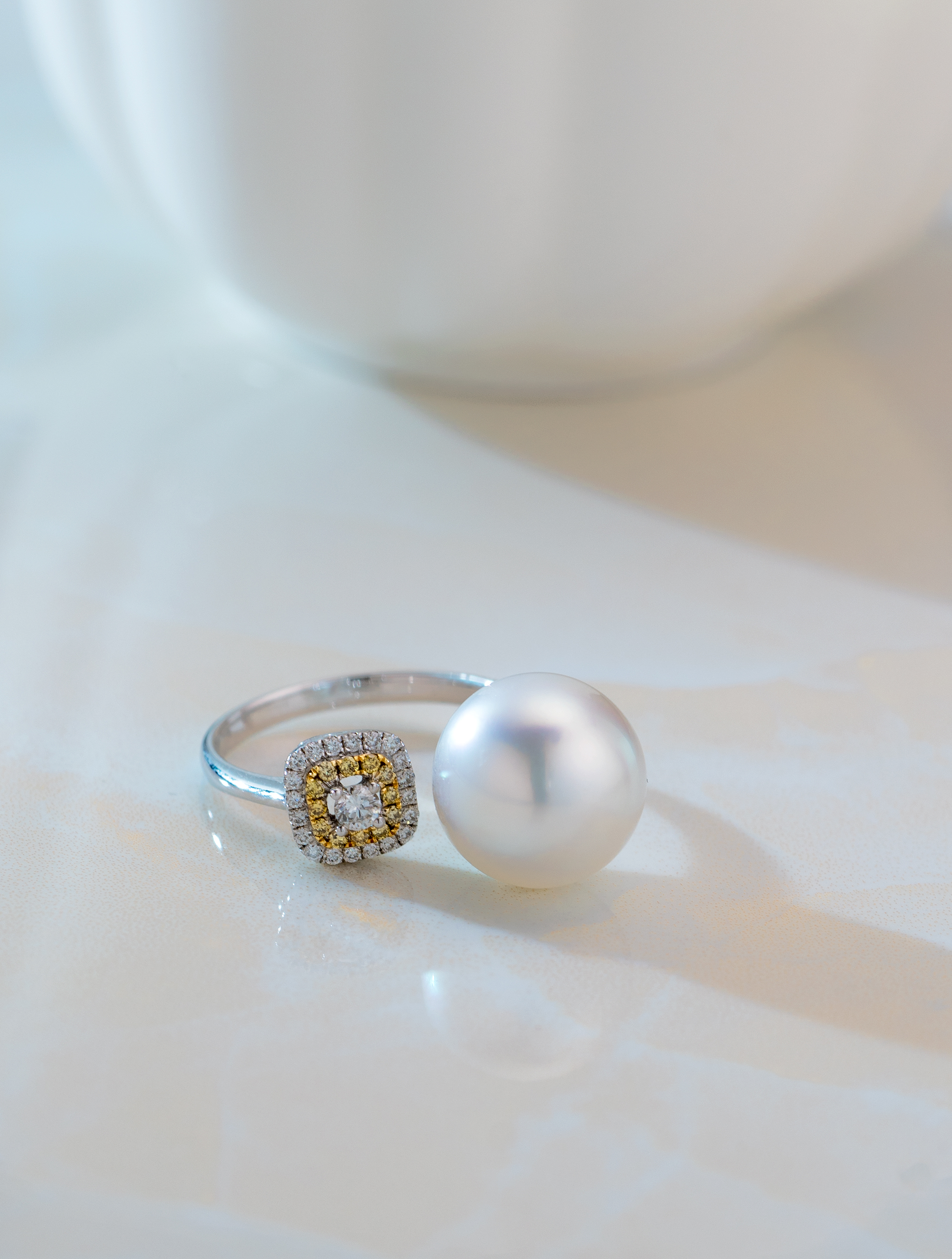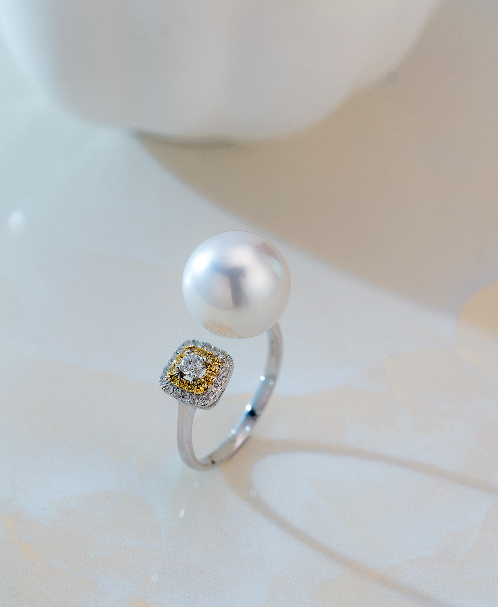 combining southsea white pearl, diamonds, and yellow diamonds for a glamorous and stunning visual effect.