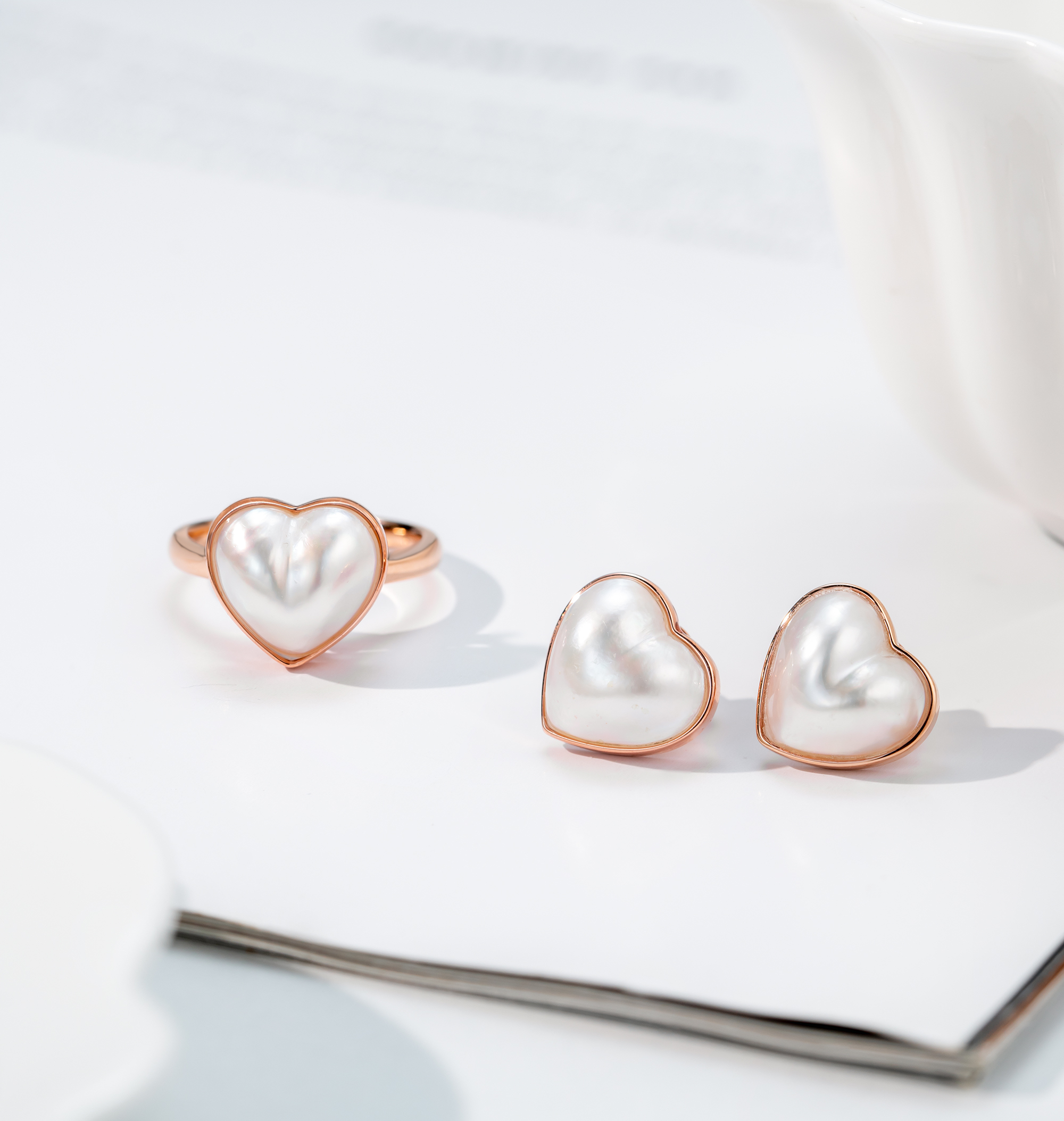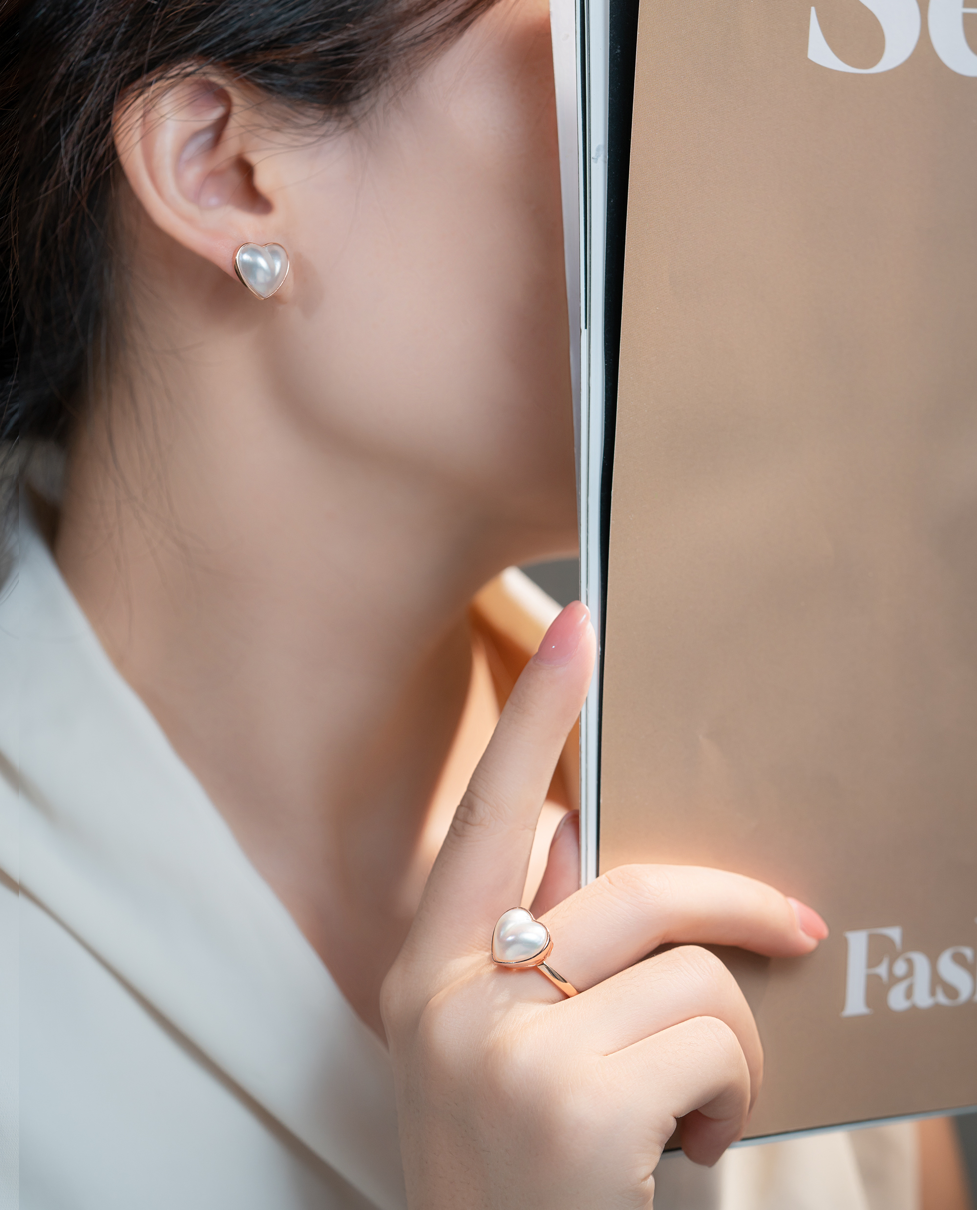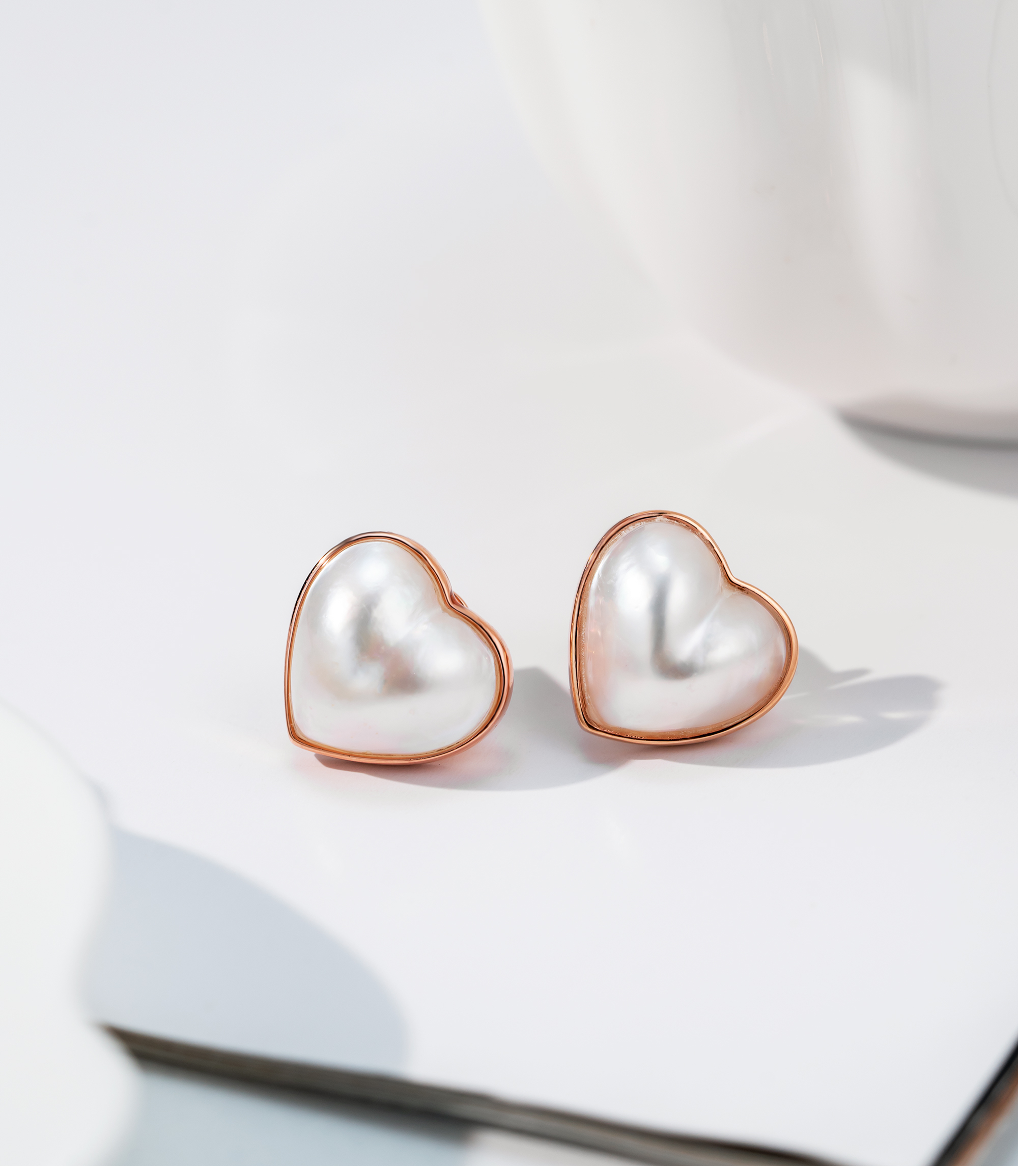 There isn’t any better description than gentle and pure for heart shaped white Mabe pearls. Using the bezel setting method to emphasize the luster of the pearl and with 18K rose gold, the earrings bring a touch of classicality that balances off the cuteness of heart shaped pearls.