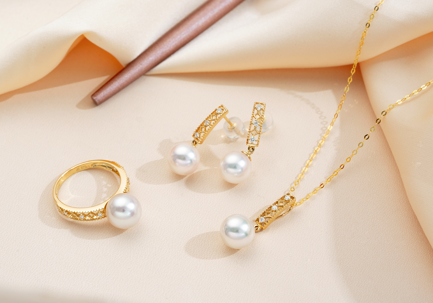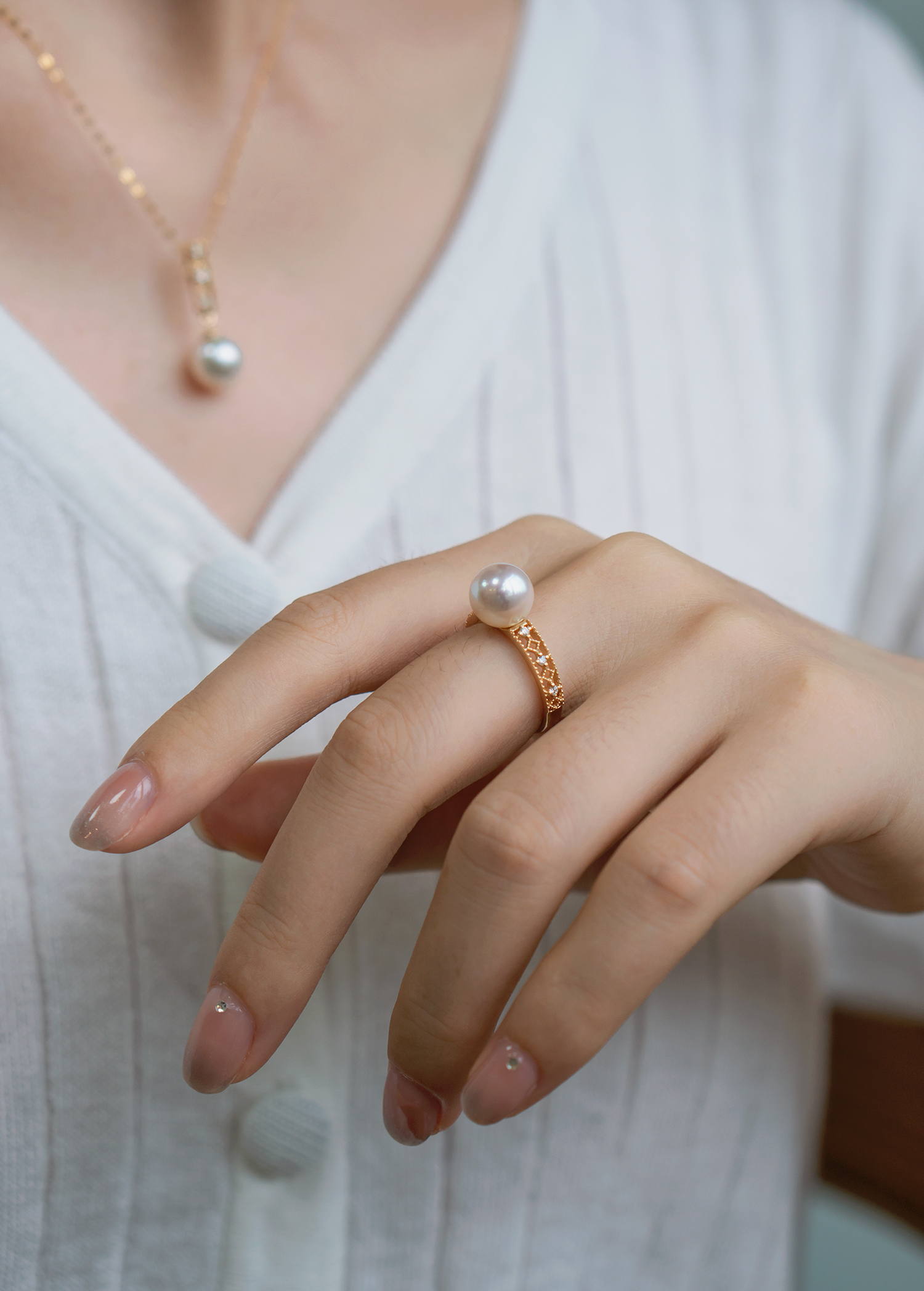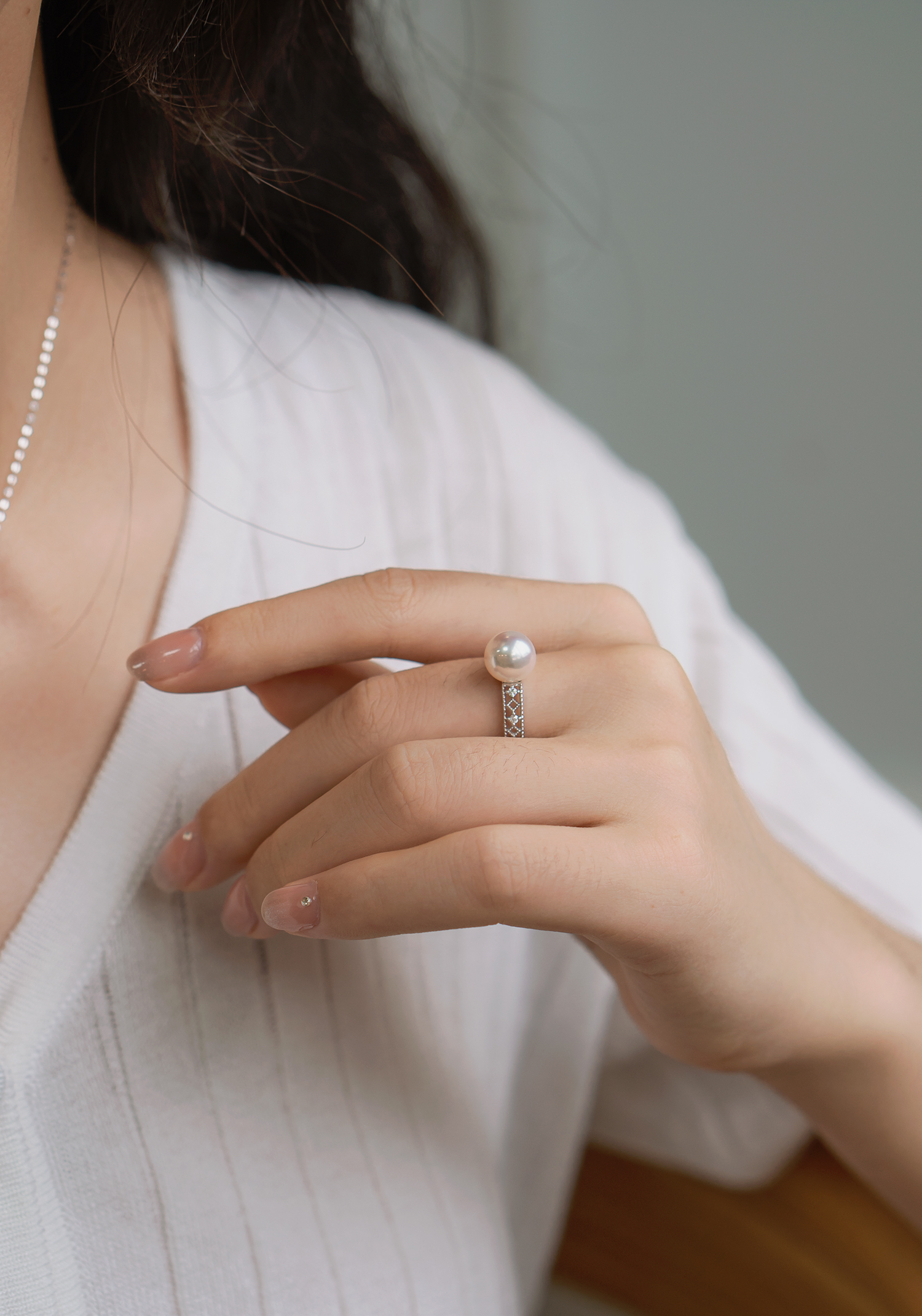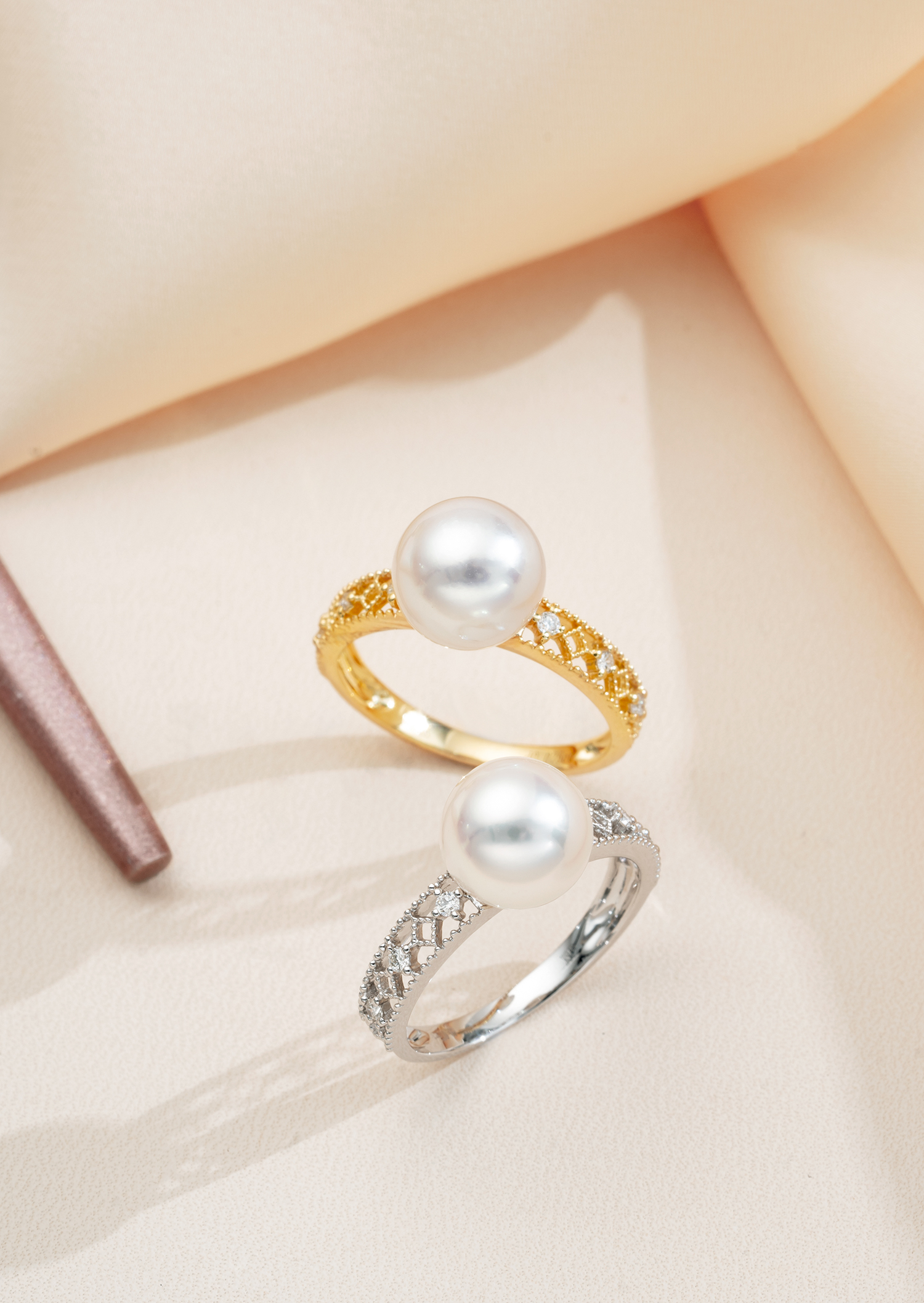有如聖堂玻璃花窗的復古經典蕾絲設計,是Olina店內的大熱人氣款式之一,精緻的日系Lace通花讓設計整體增添不少少女感,點綴的小鑽石也是讓人注目的加分細節位,與同色系極光Akoya配搭起來,更能突顯出女性的優雅氣質,成套入手也不過分呢。