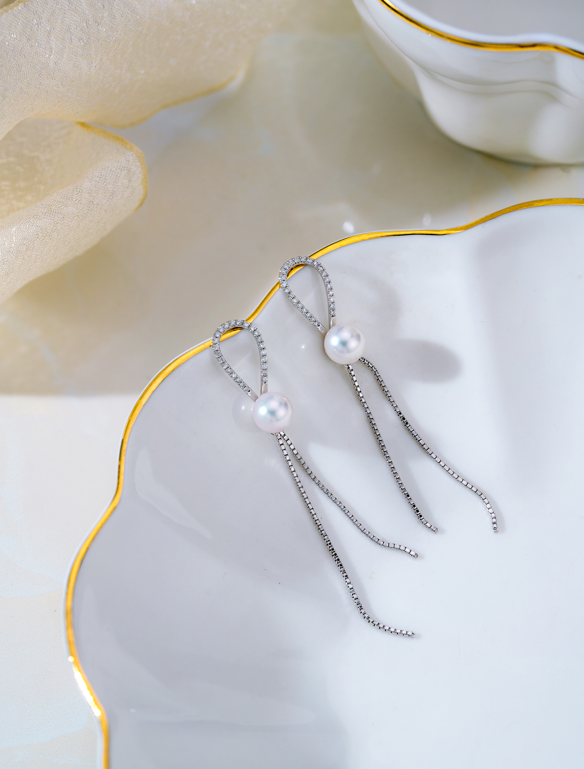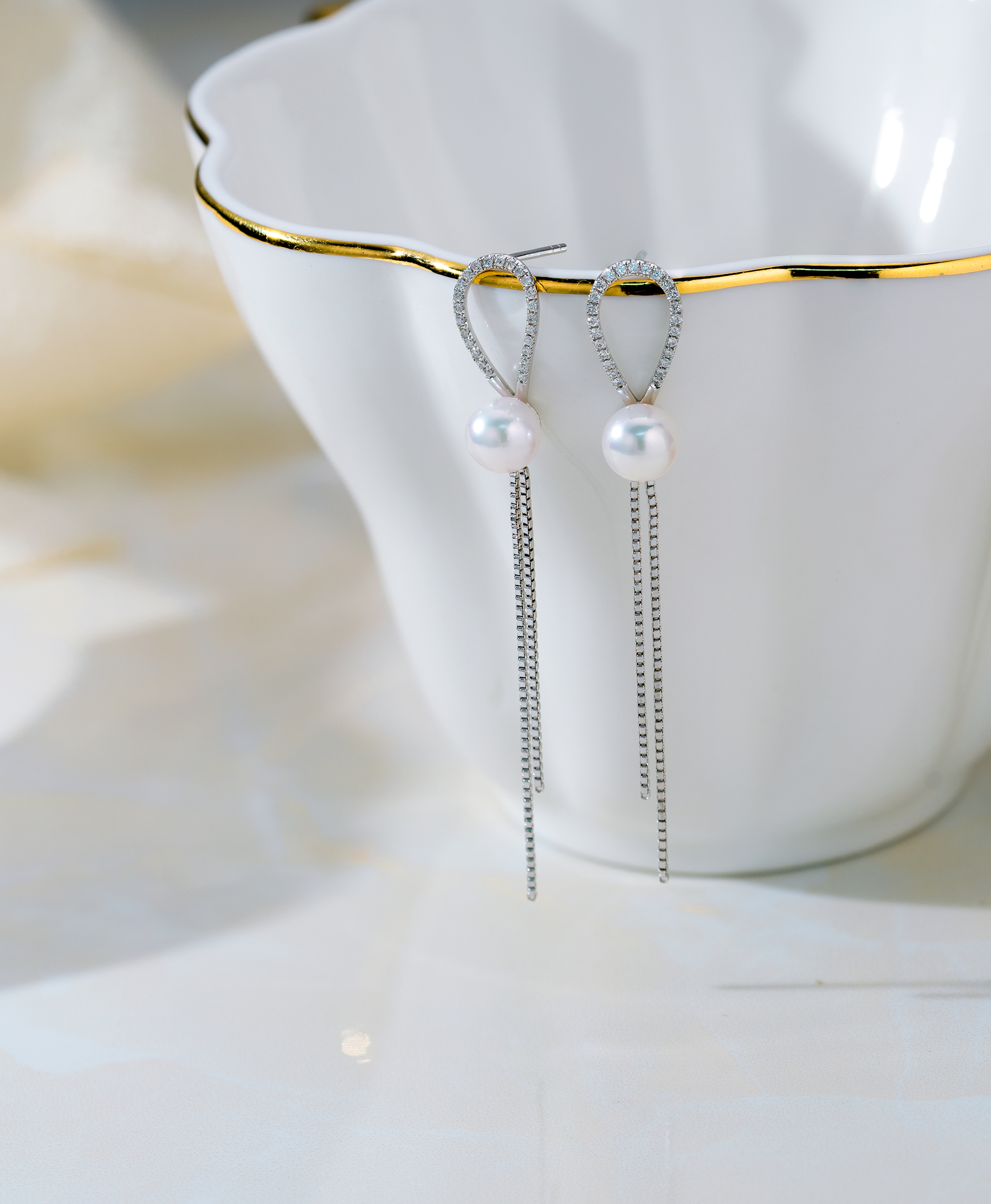 The unique tassel design is tied up with a luxurious Akoya pearl that emits top-grade luster. Two white gold diamond tassels dangle from the pearl, creating a stunning movement as the wearer moves. The earrings shine in different angles, creating a brilliant and enchanting effect.