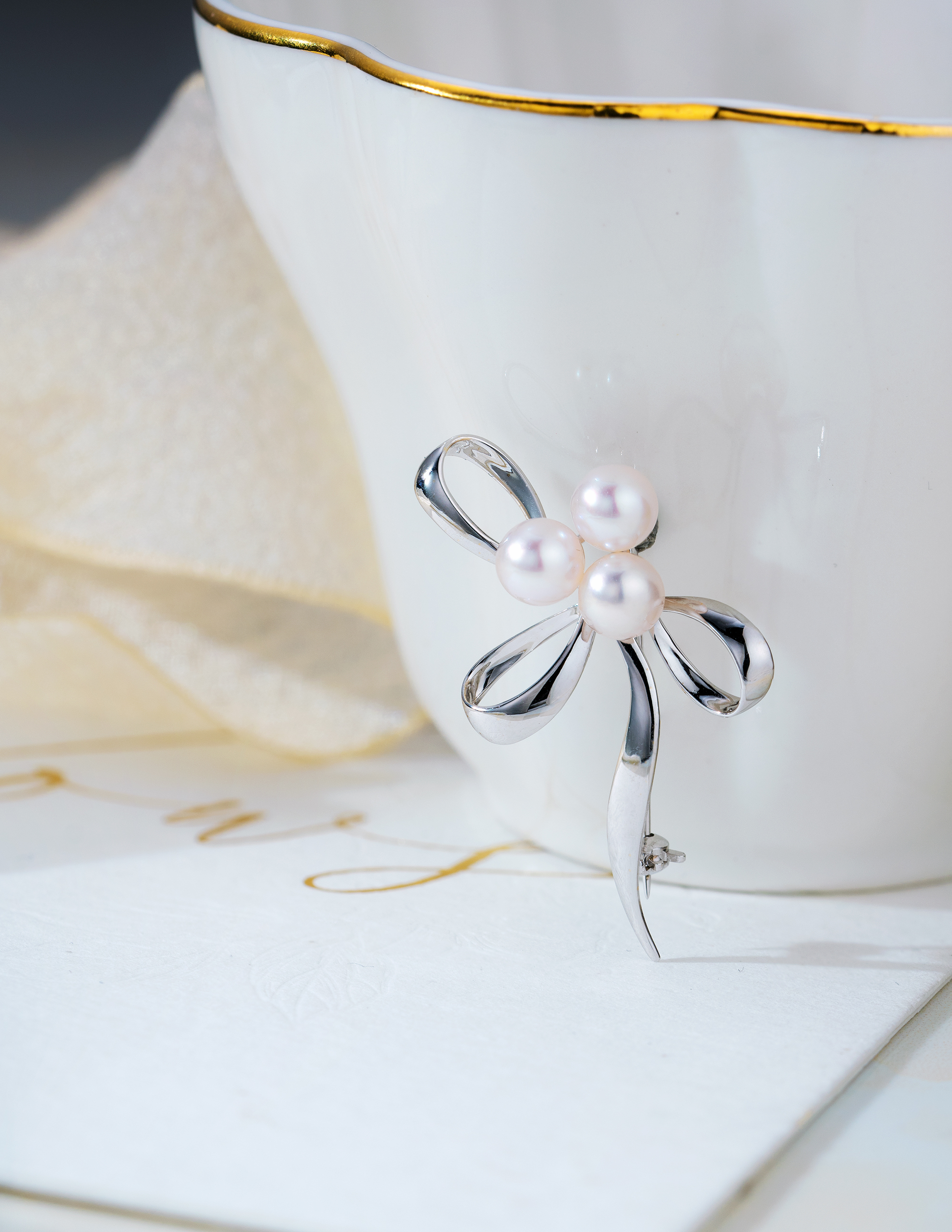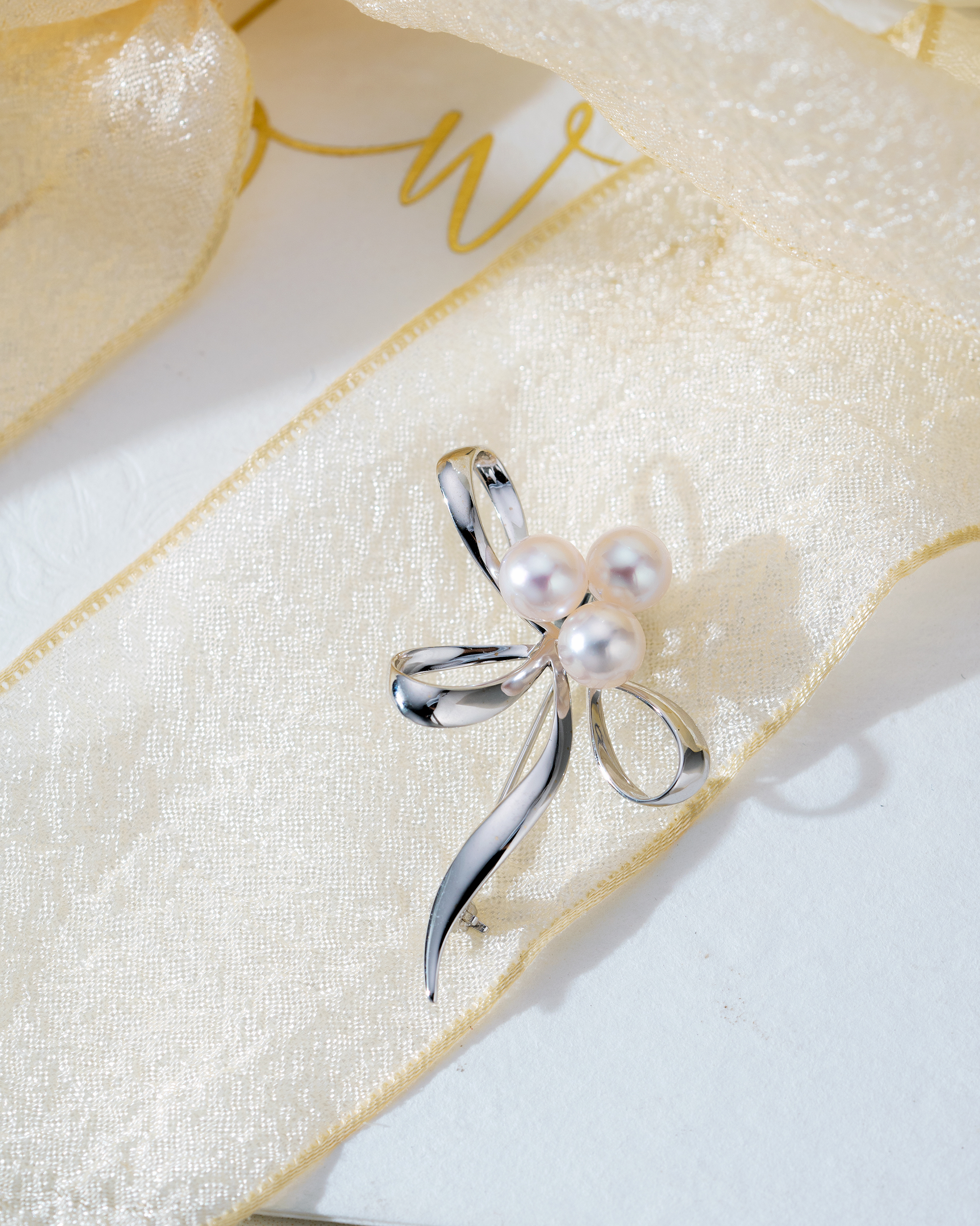 The exquisite and cute butterfly-shaped design of this brooch, and the streamlined design in 18K white gold adds an extra touch of elegance and uniqueness. Three perfect 6-6.5mm Akoya pearls are like being tied to the butterfly bow. By using the small trick of a brooch, it can highlight your look.